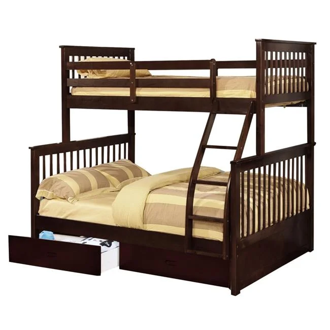 Mission Style Wooden Twin Over Full Bunk Bed with 2 Drawers, Dark Brown