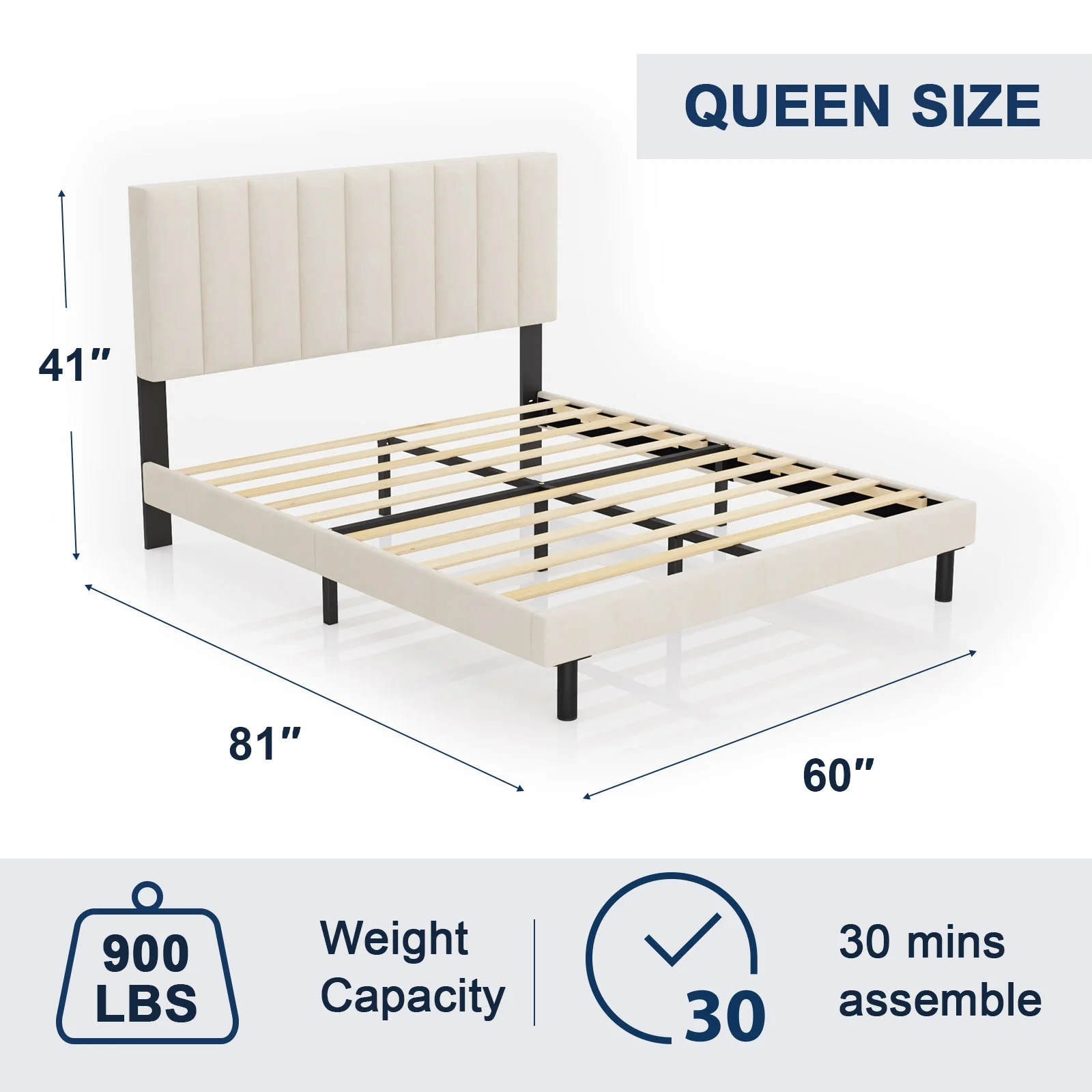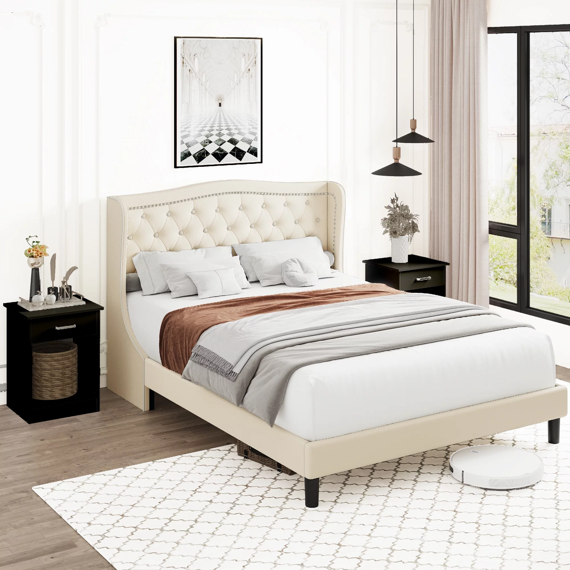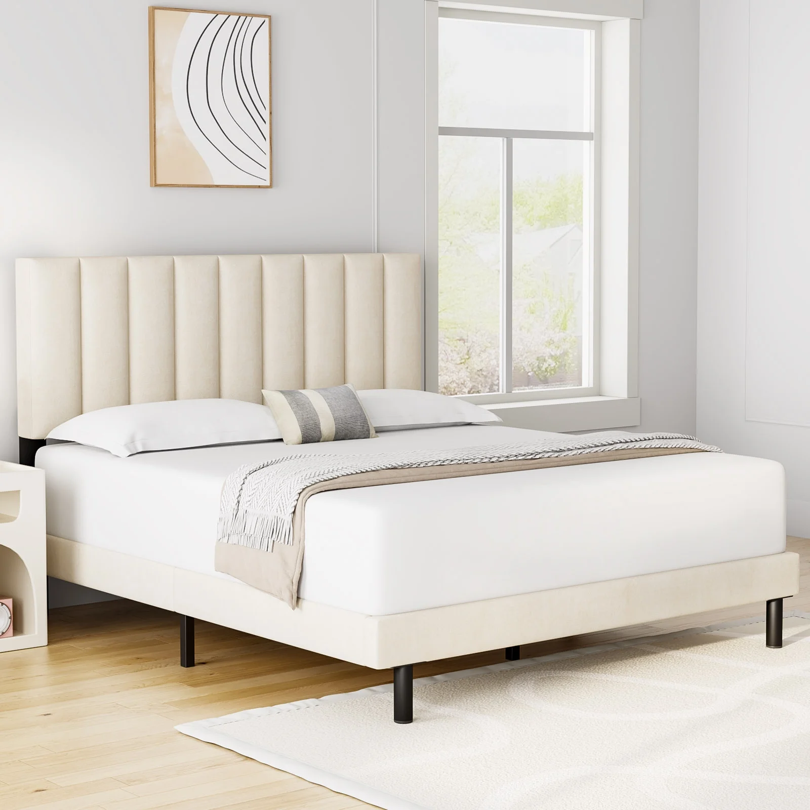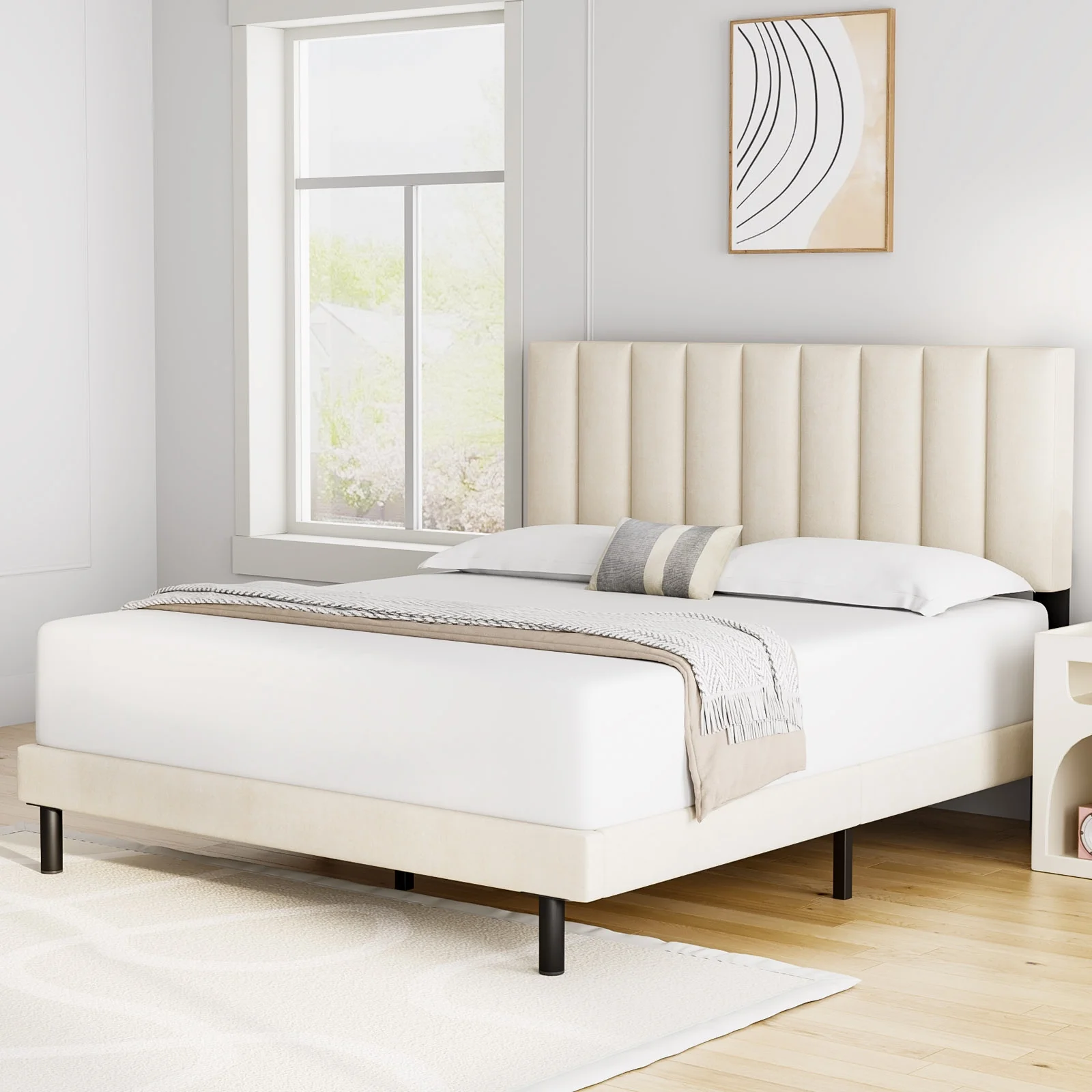 HAIIDE Queen Bed, Queen Platform Bed Frame with Upholstered Headboard, Beige