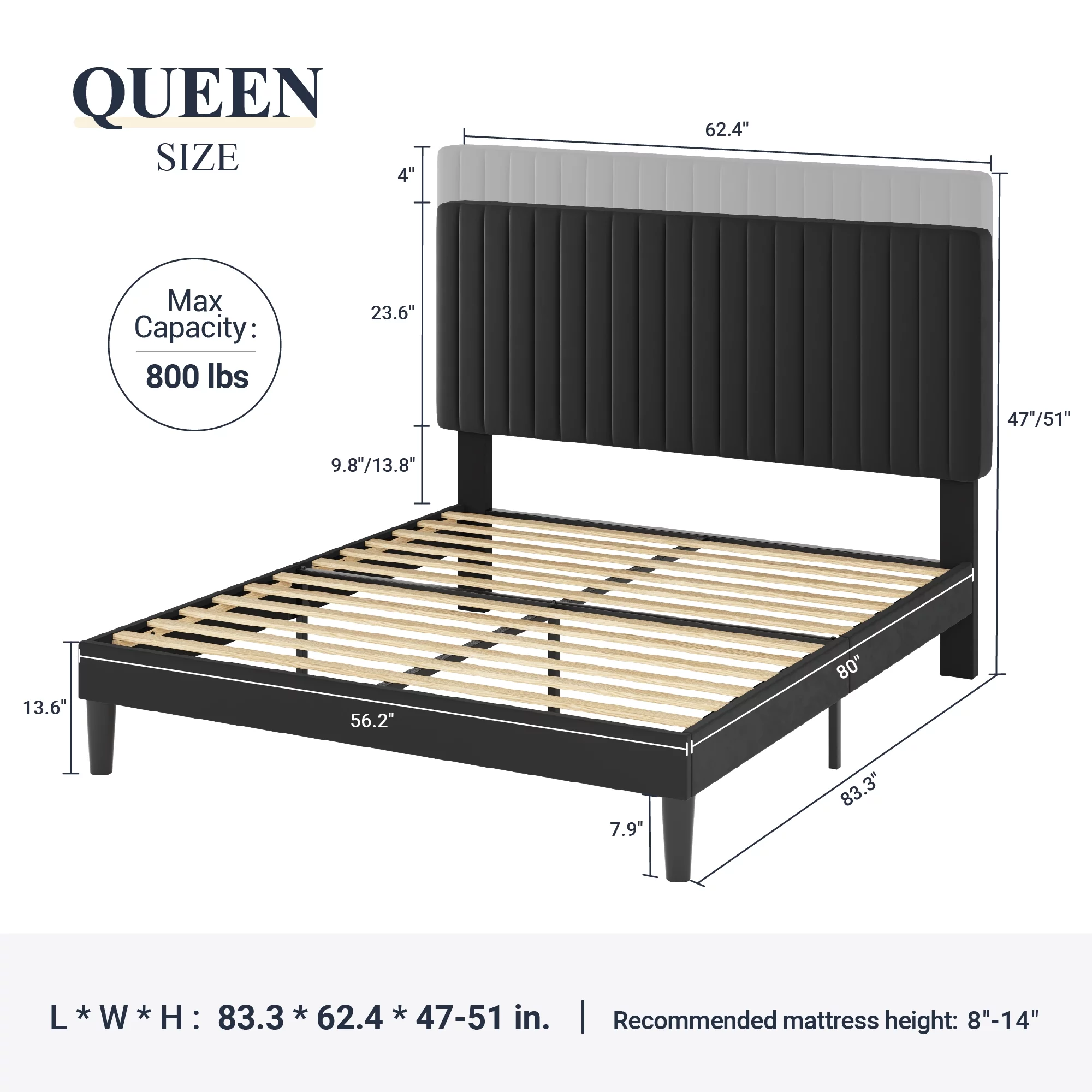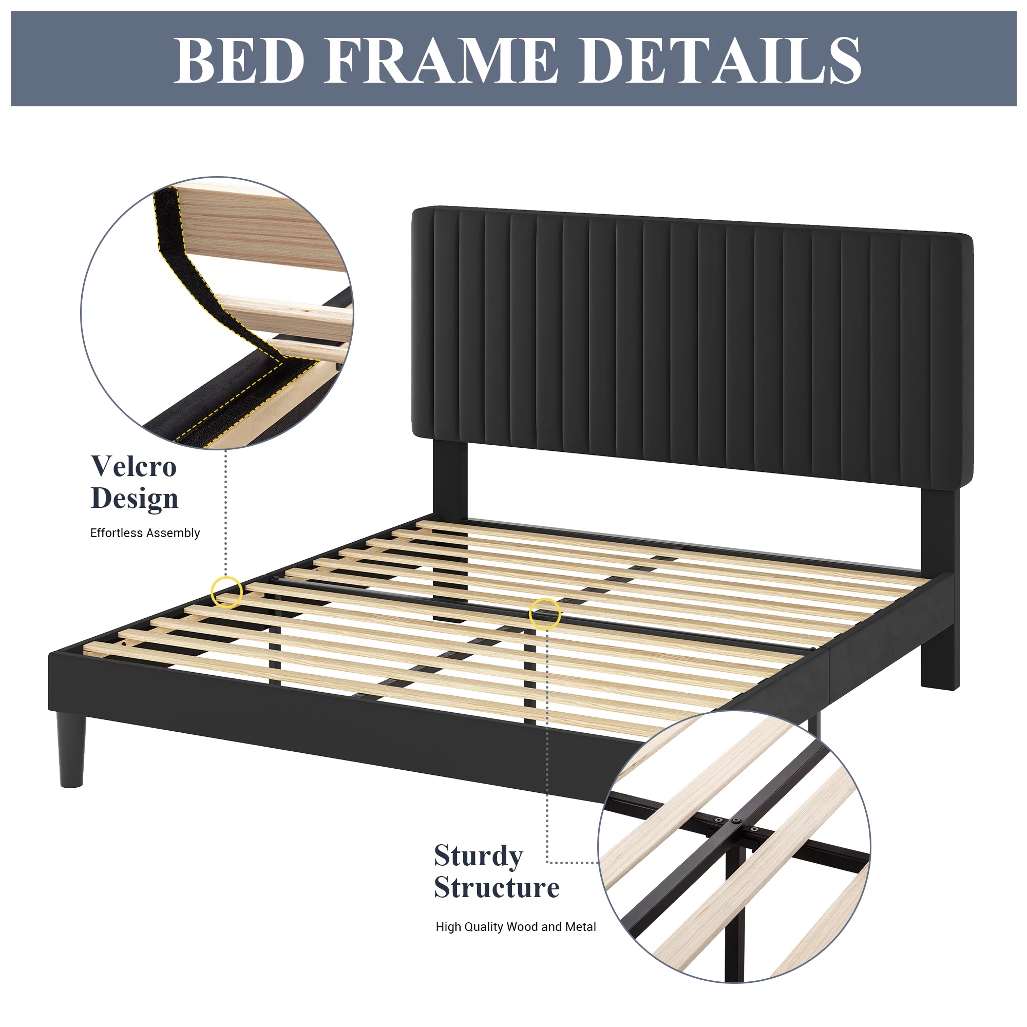Flolinda Queen Bed Frame Upholstered Bed Frame with Vertical Channel Tufted Complete High Headboard, Black
