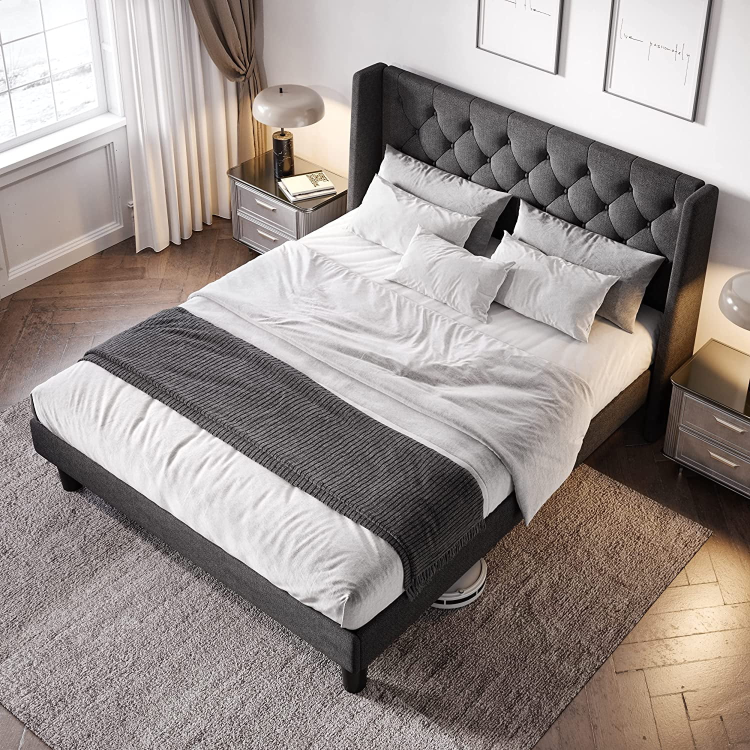 Allewie Queen Size Upholstered Platform Bed Frame with Wingback and Button Tufted Headboard, Dark Grey