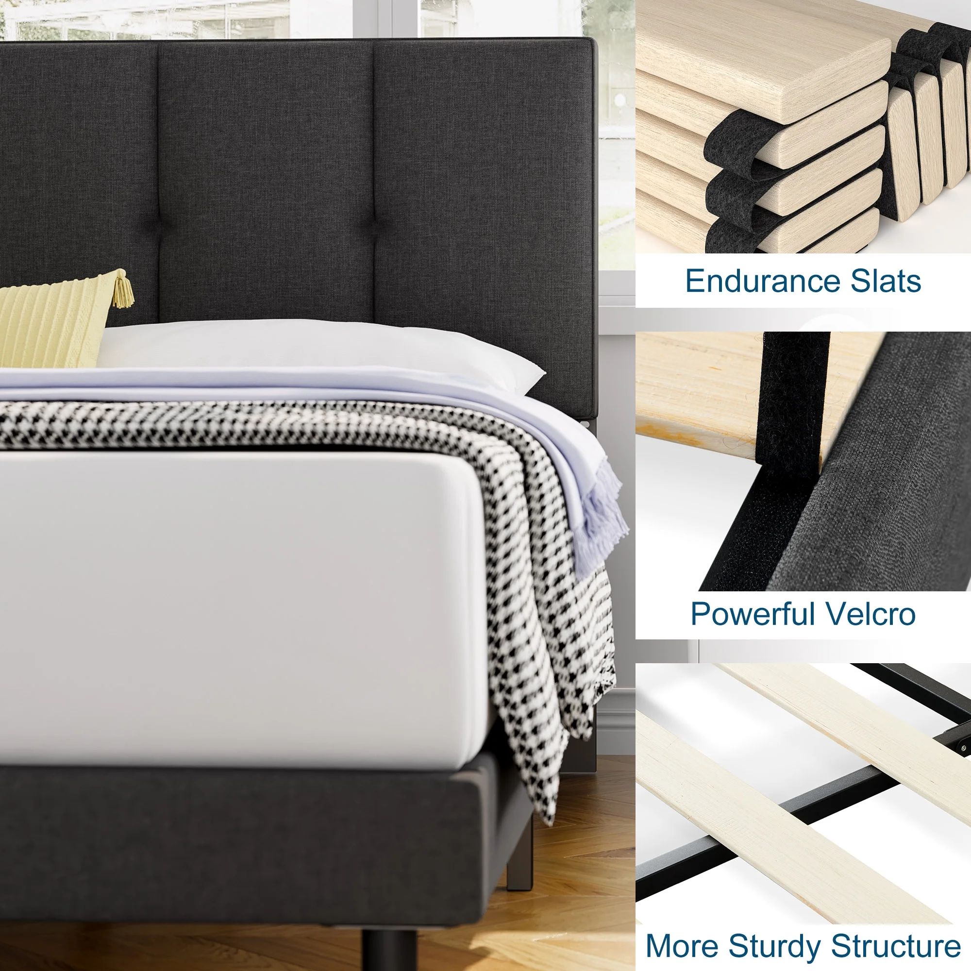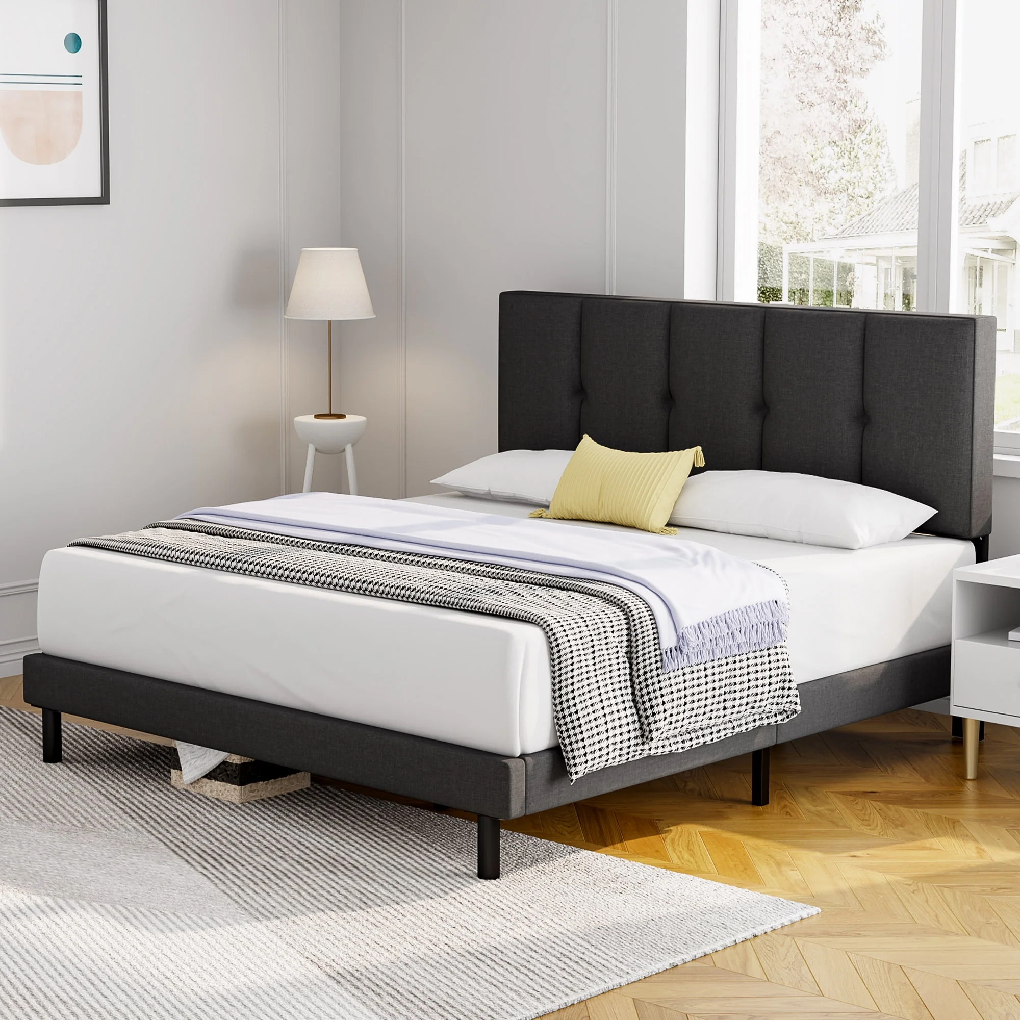 Queen Bed Frame, HAIIDE Queen Size Platform Bed With Fabric Upholstered Headboard, Dark Grey