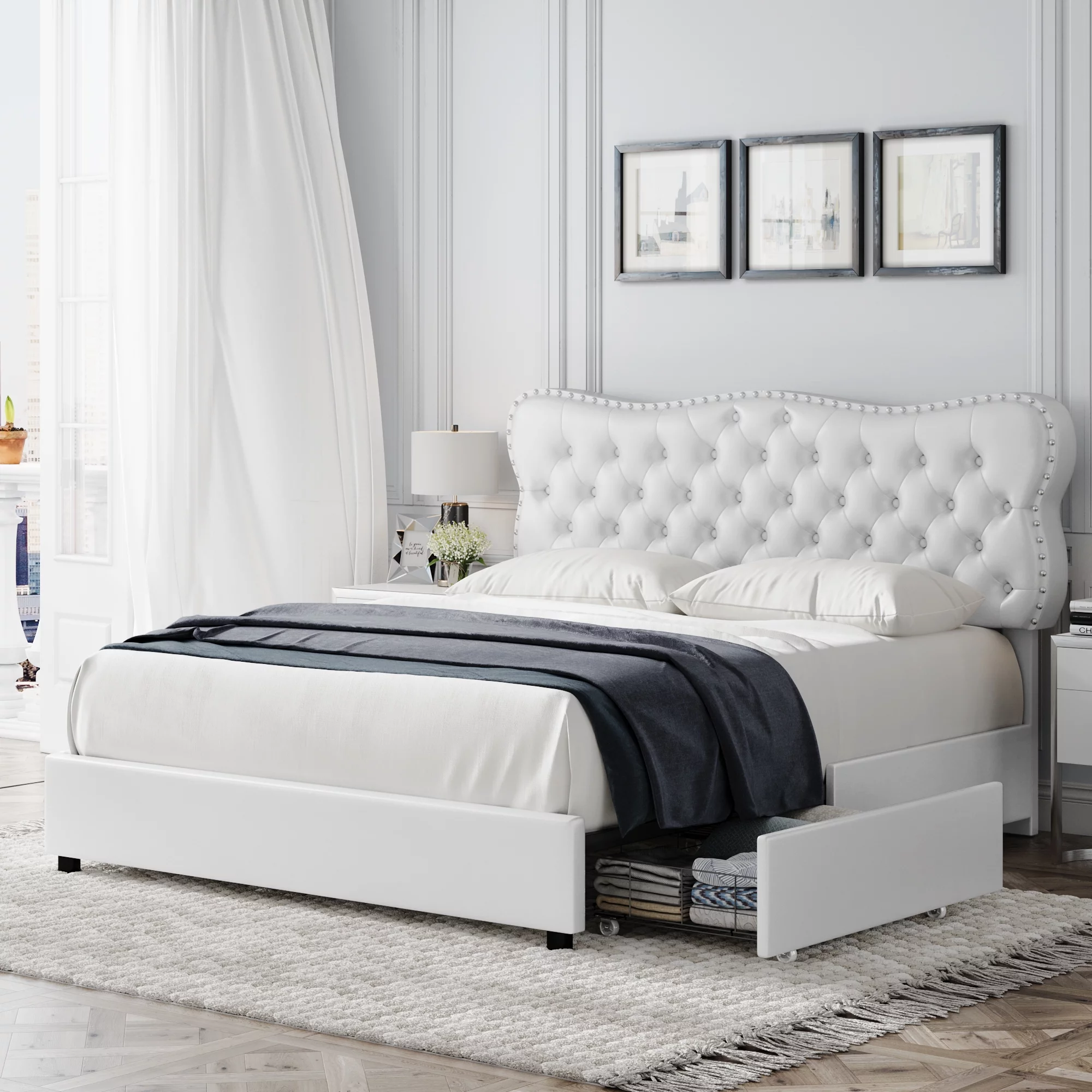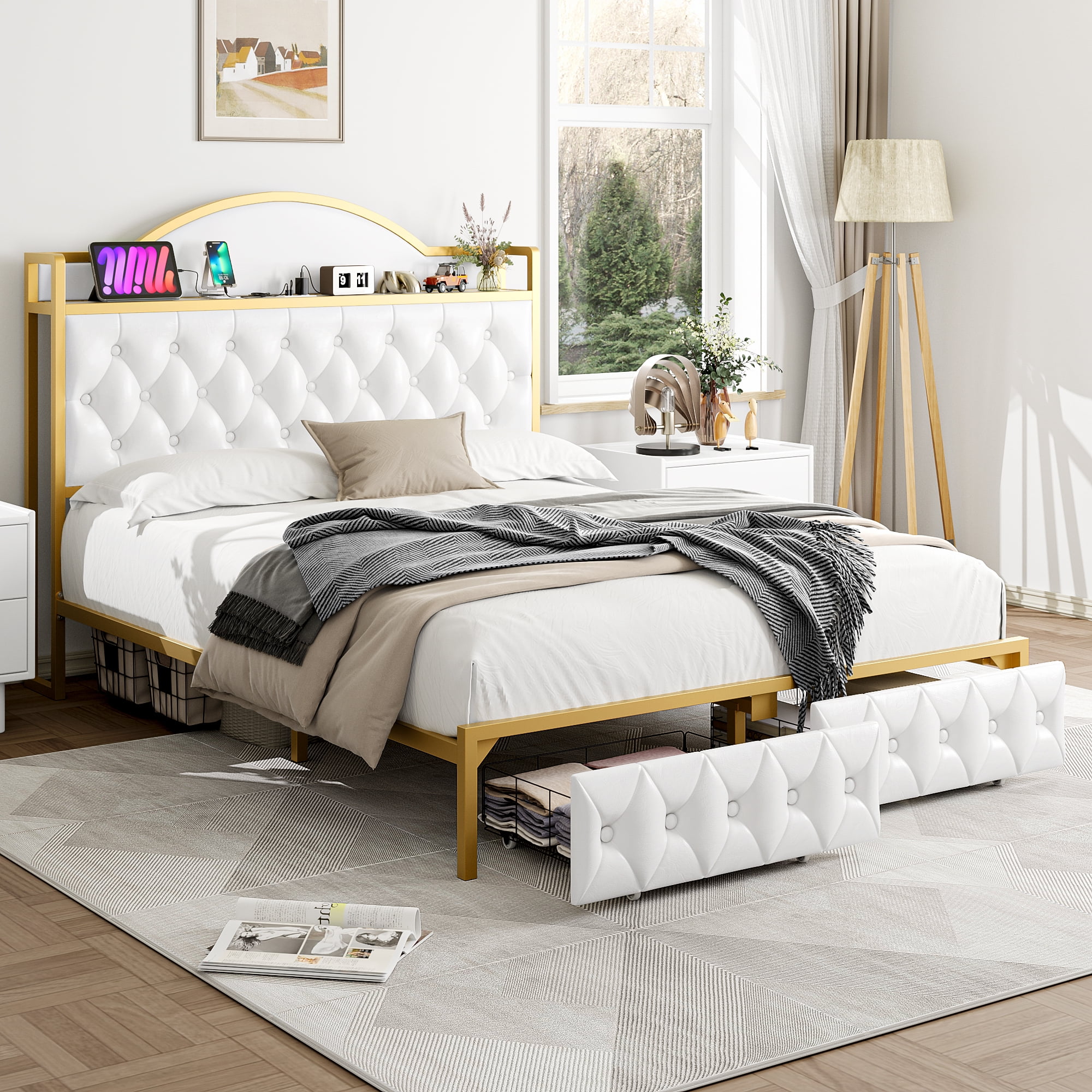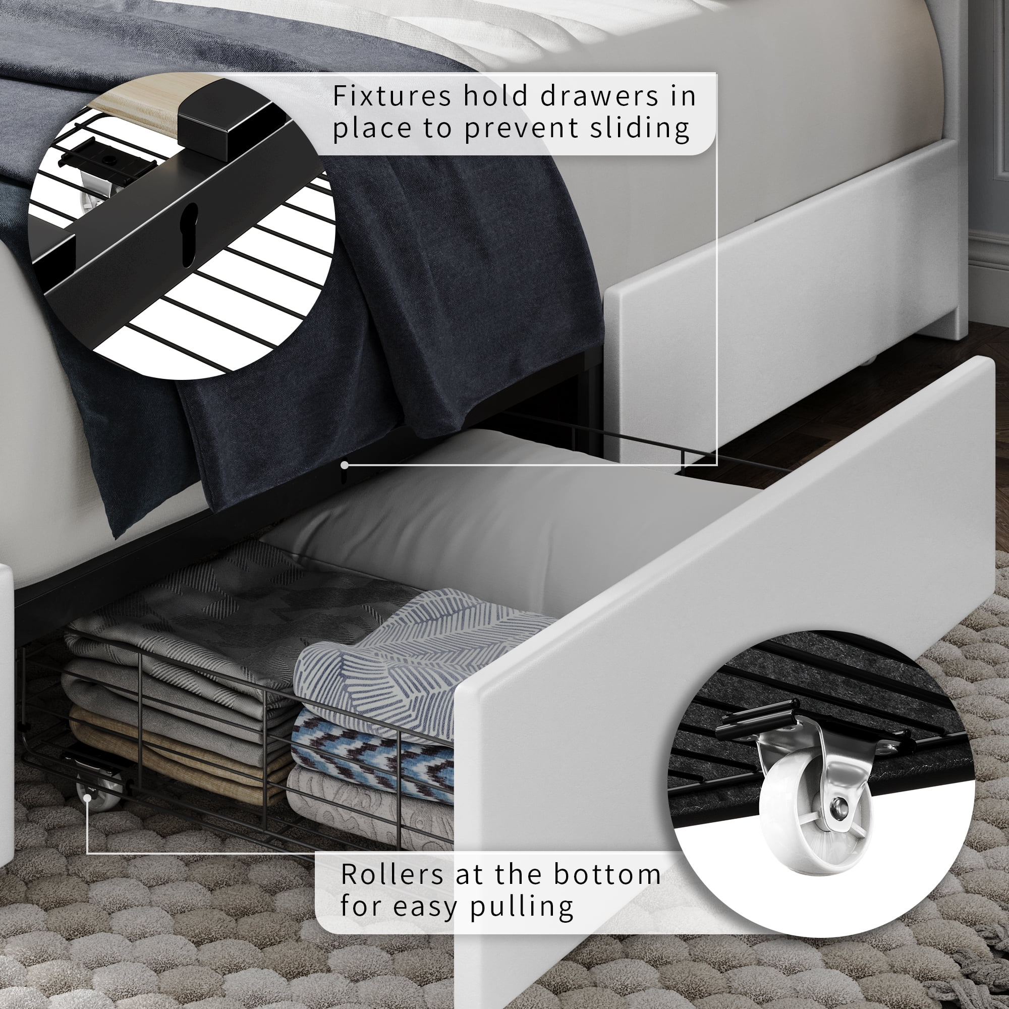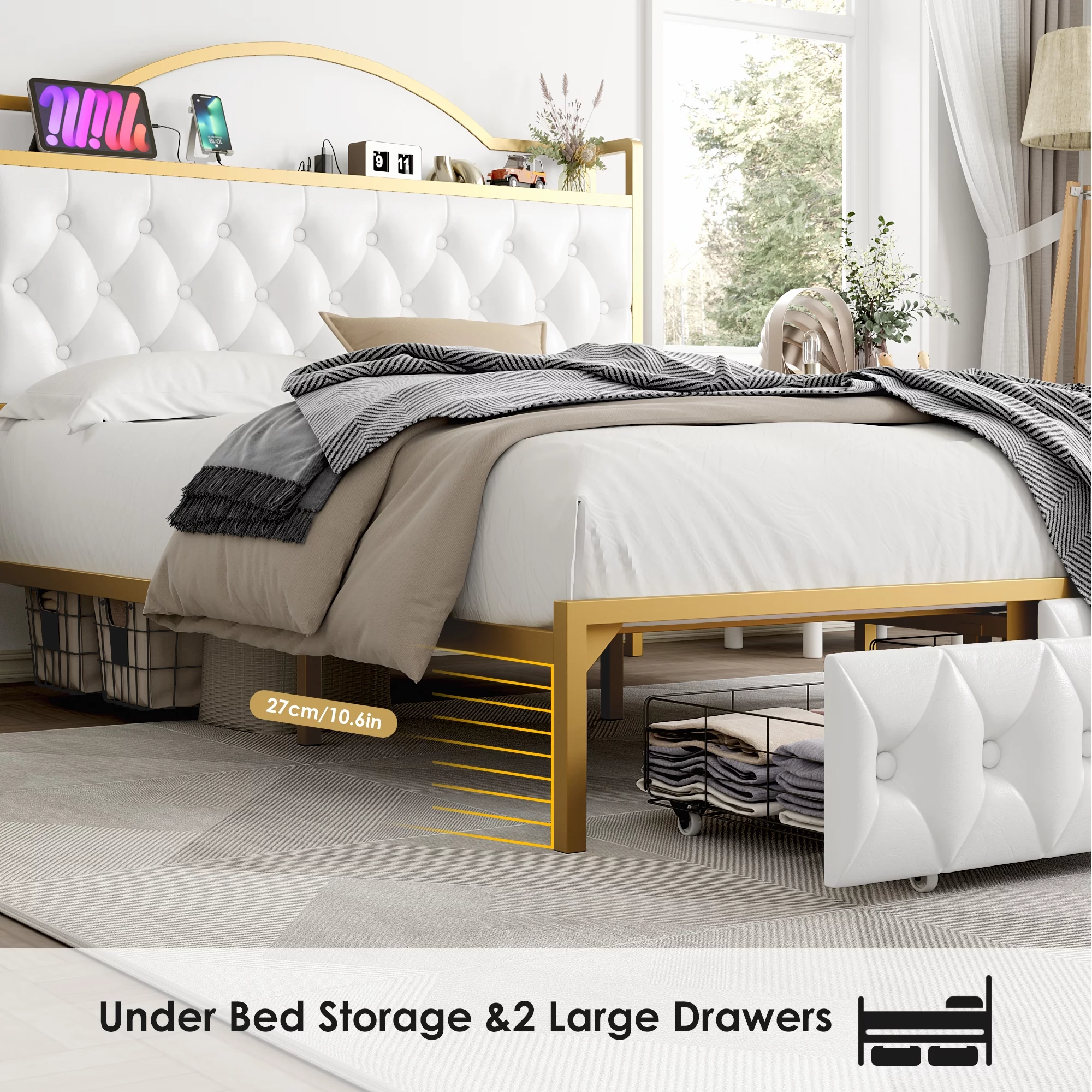 Homfa Full Size Tall Bed with Shelving and Charging, PU Leather Upholstered Storage Bed with 2 Drawers, White