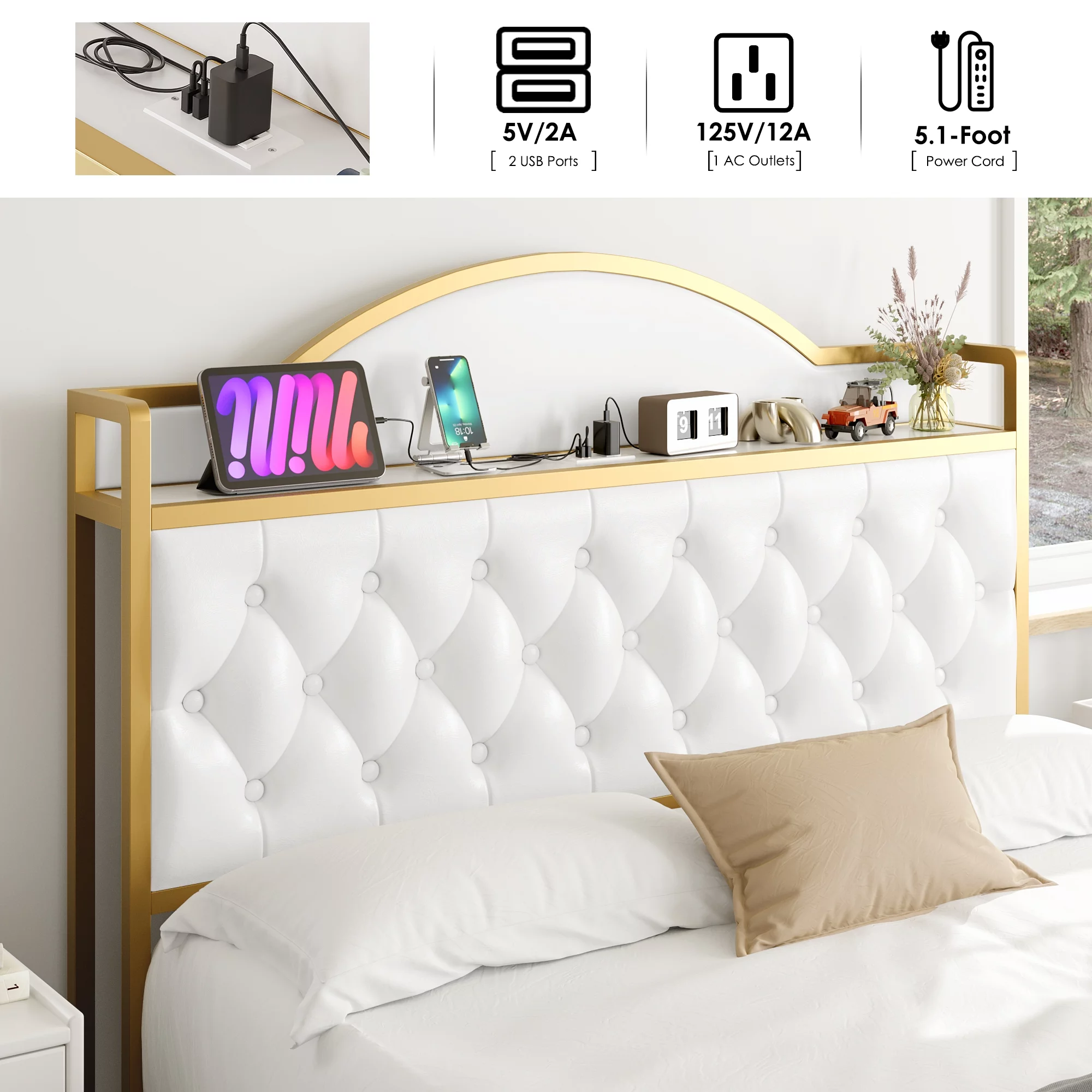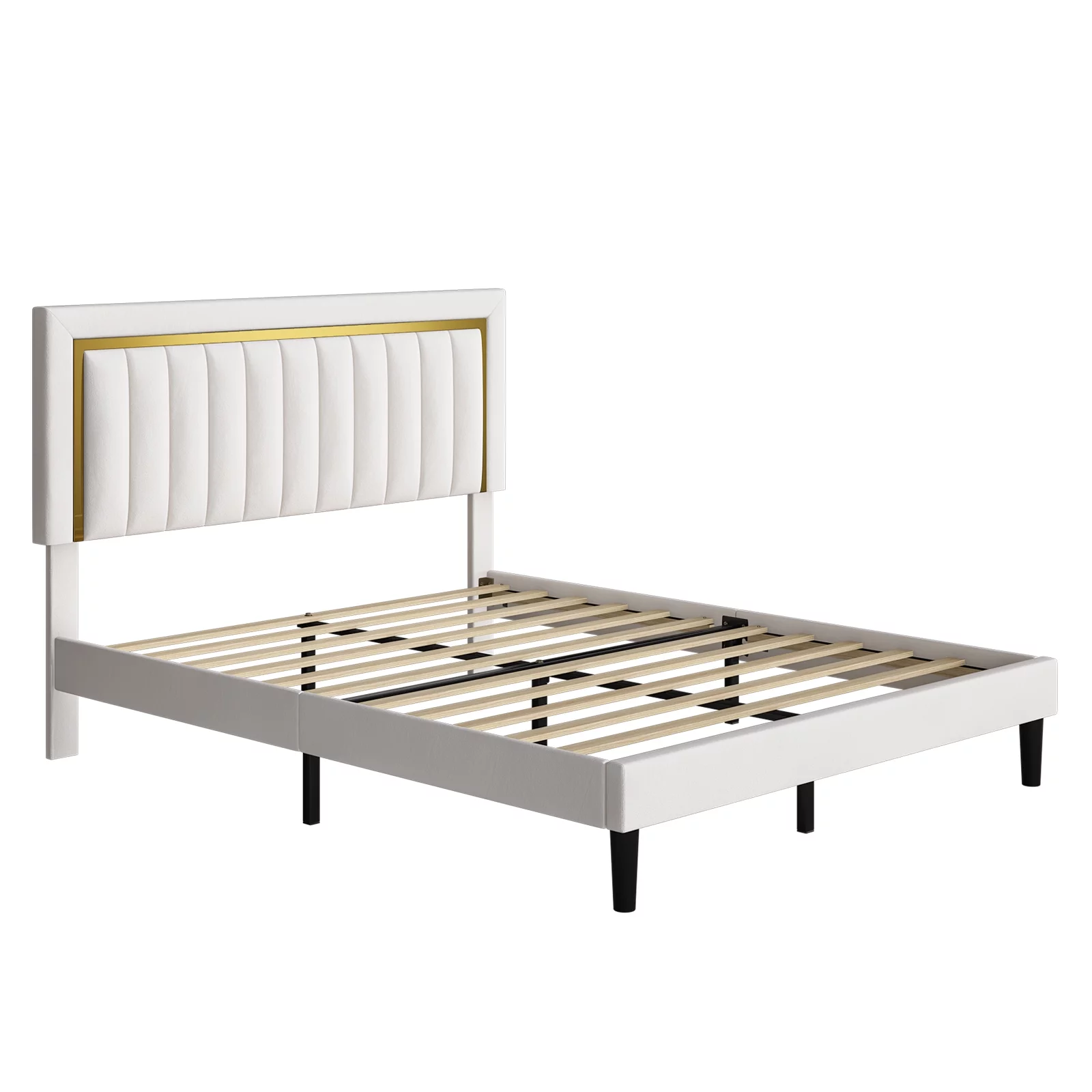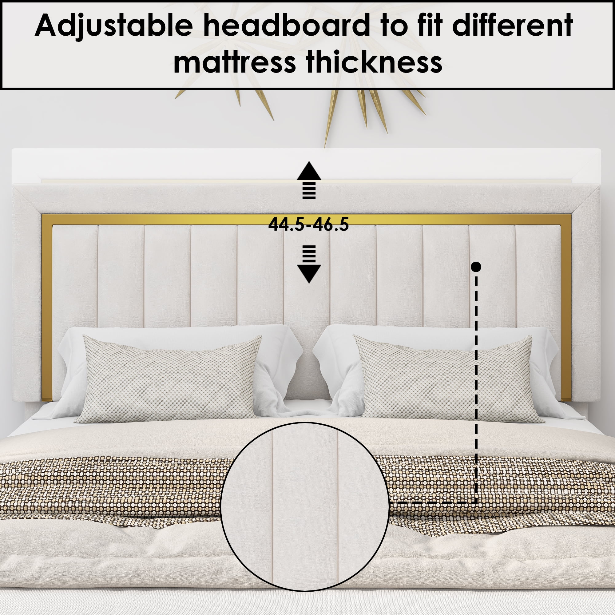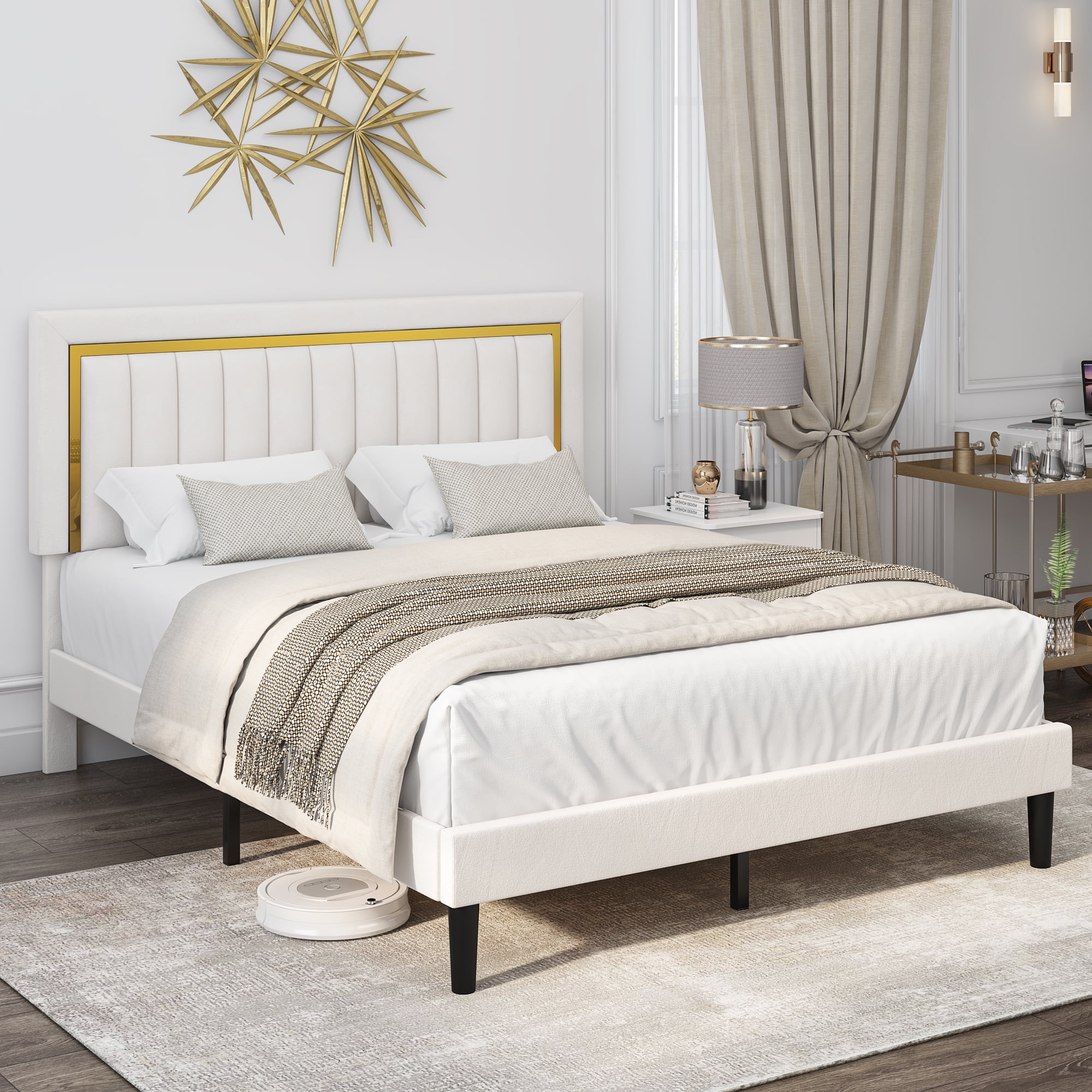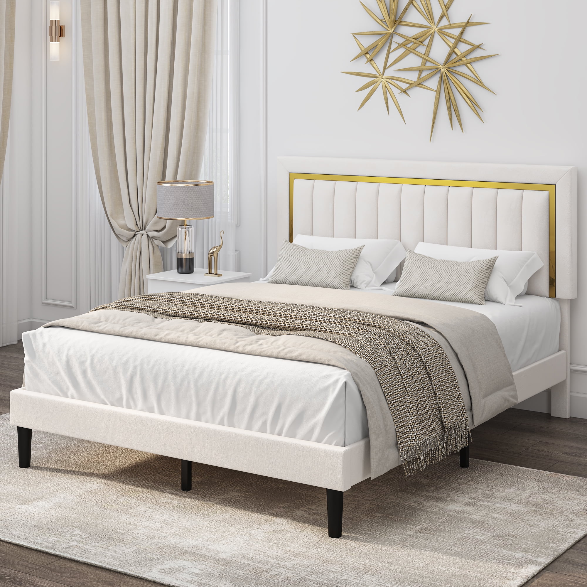 Homfa Full Bed Frame, Velvet Tufted Upholstered Platform Bed with Adjustable Gold Trim Headboard, Beige