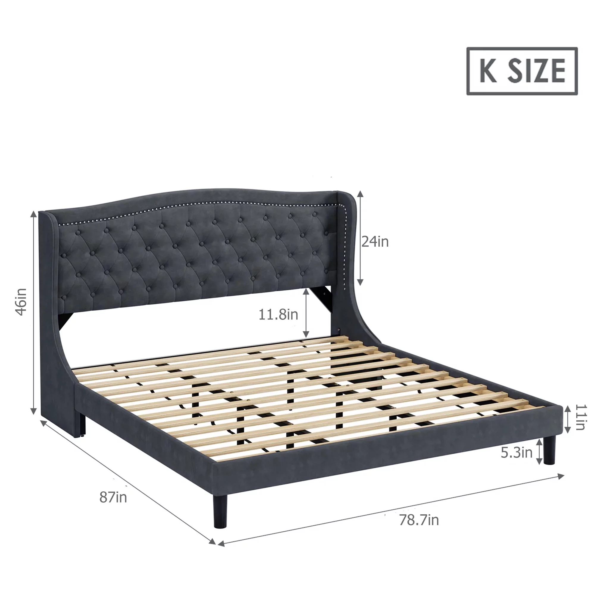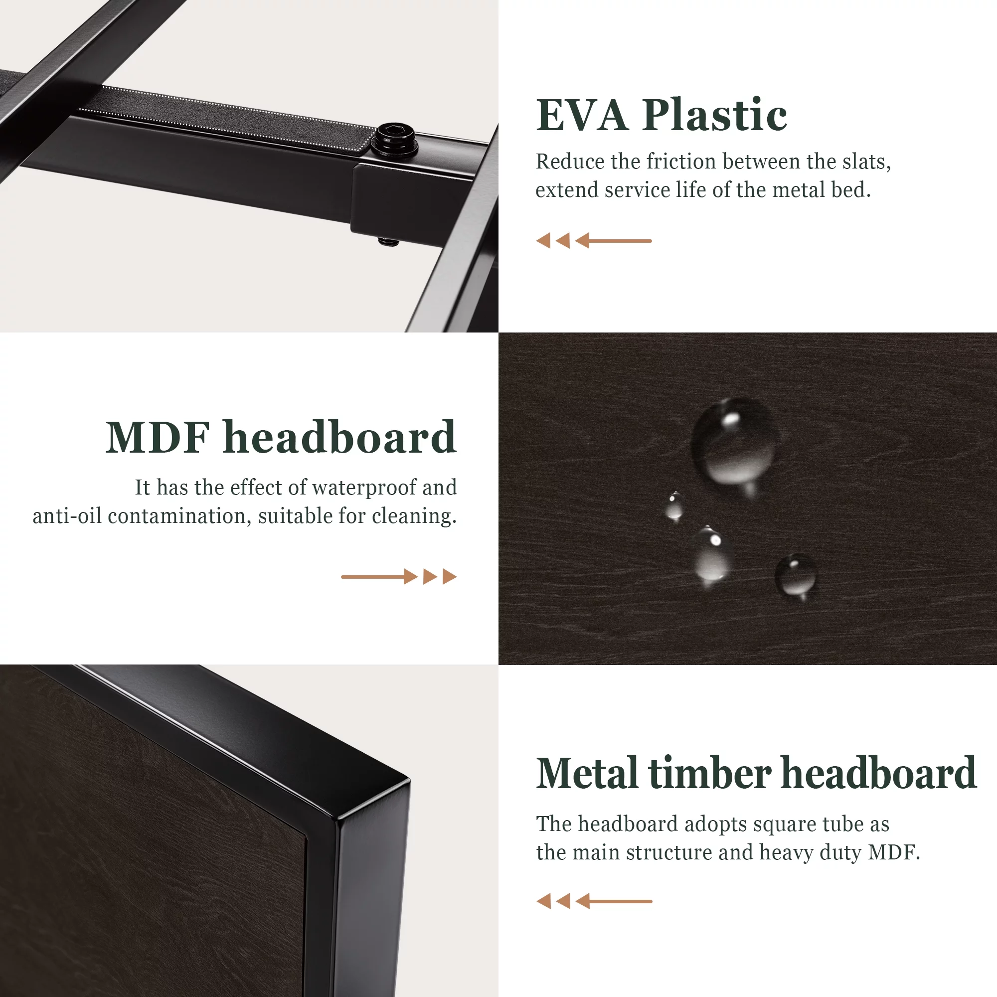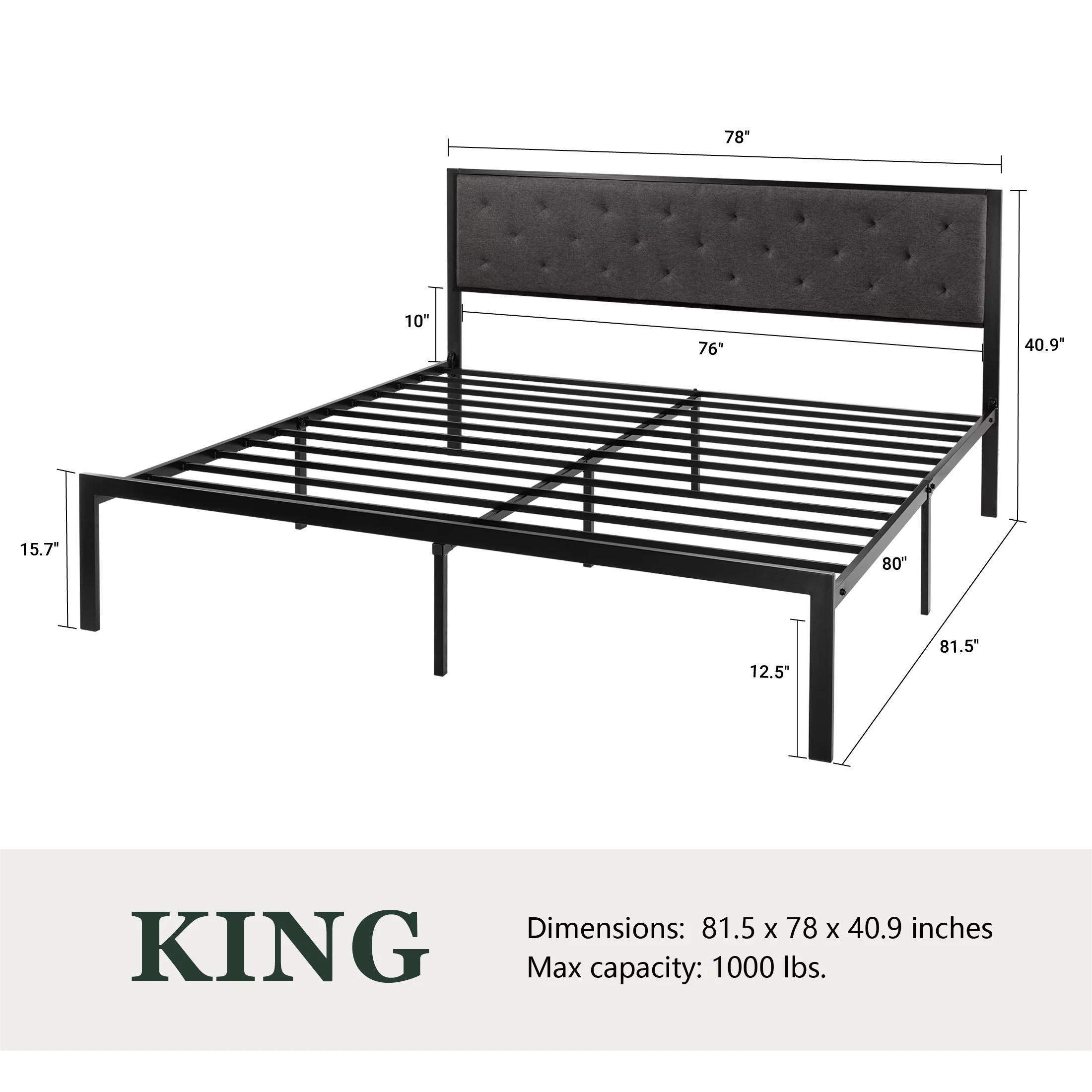 Amolife King Size Metal Bed Frame with Upholstered Headboard, Dark Grey
