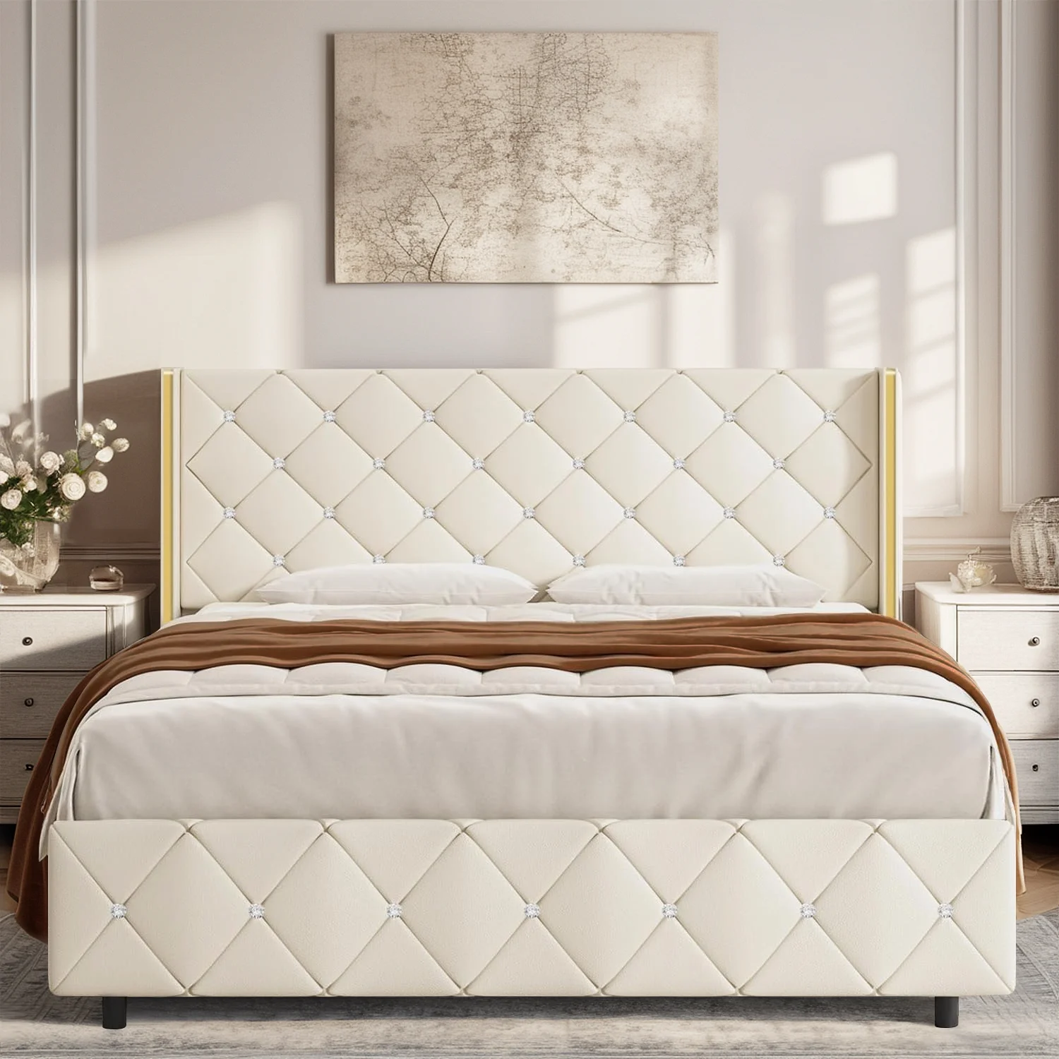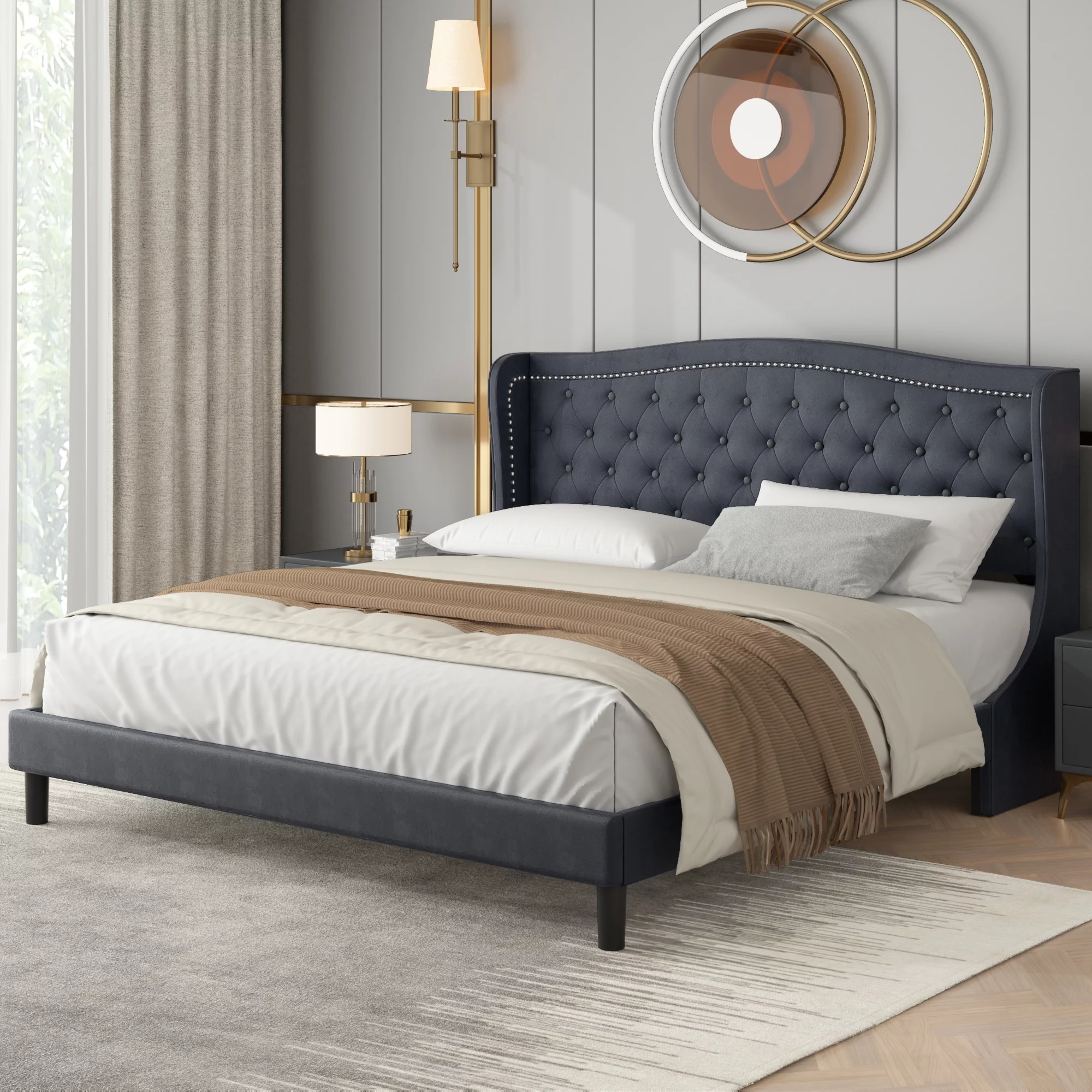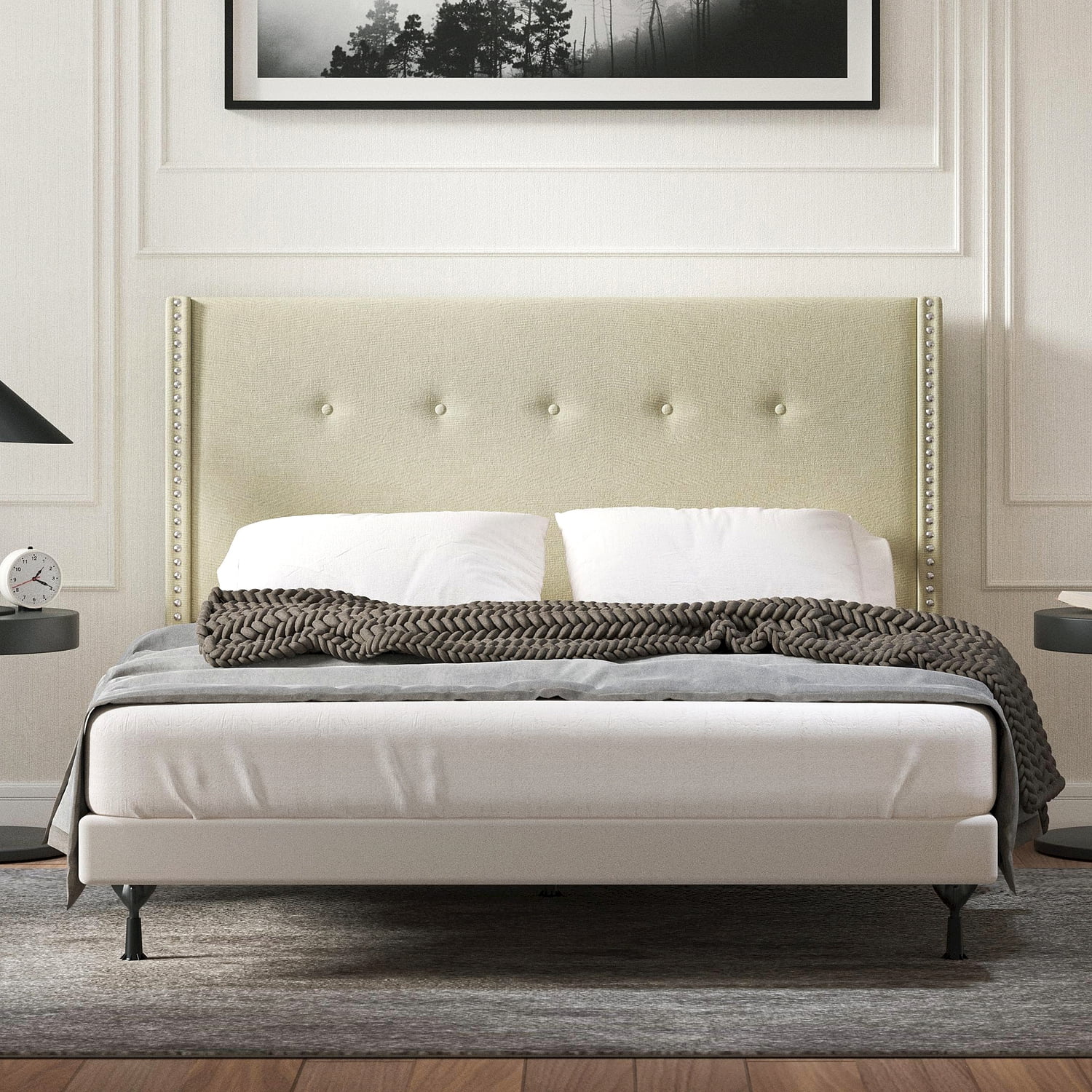 Catrimown Full Size Bed Frame, Upholstered Platform Bed Frame with Wingback Headboard, Beige