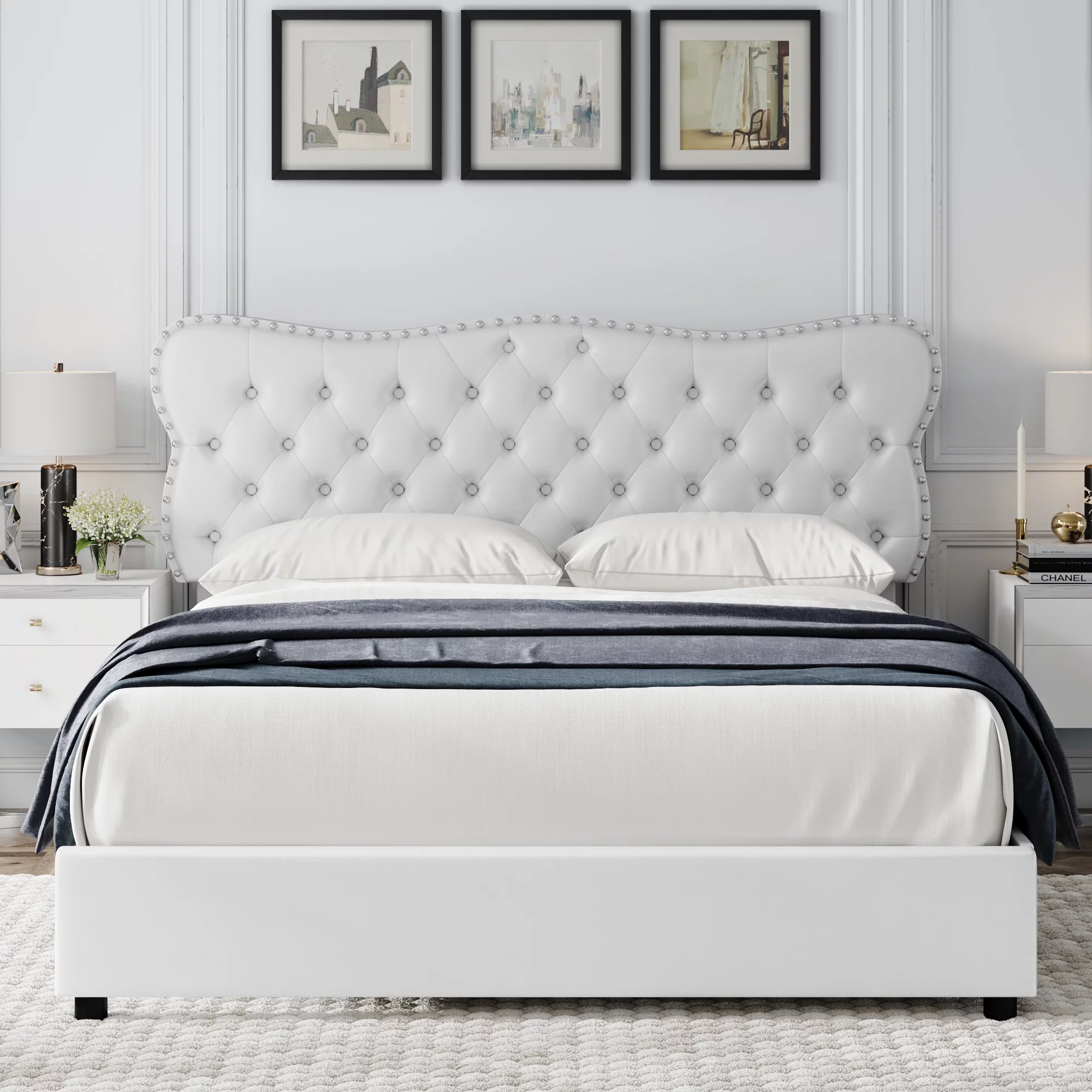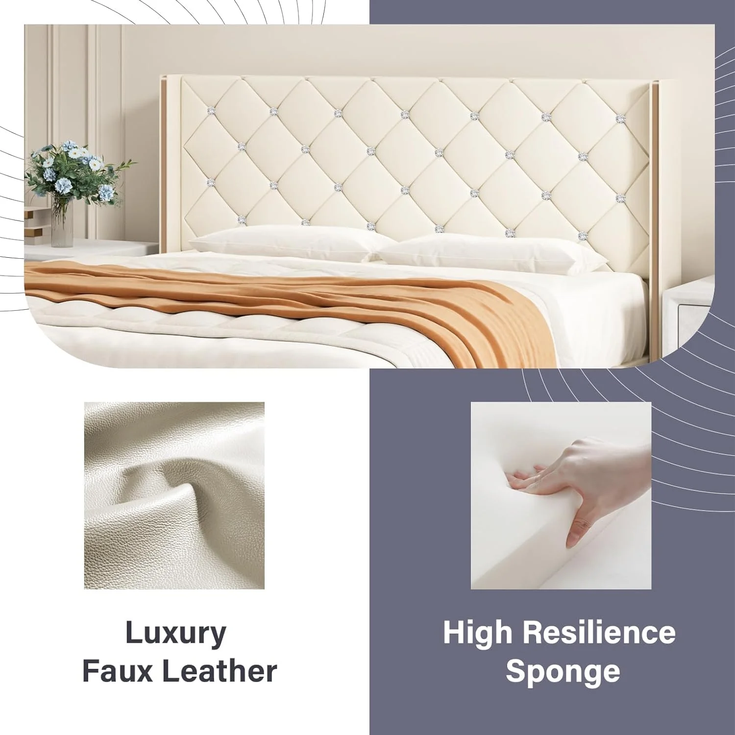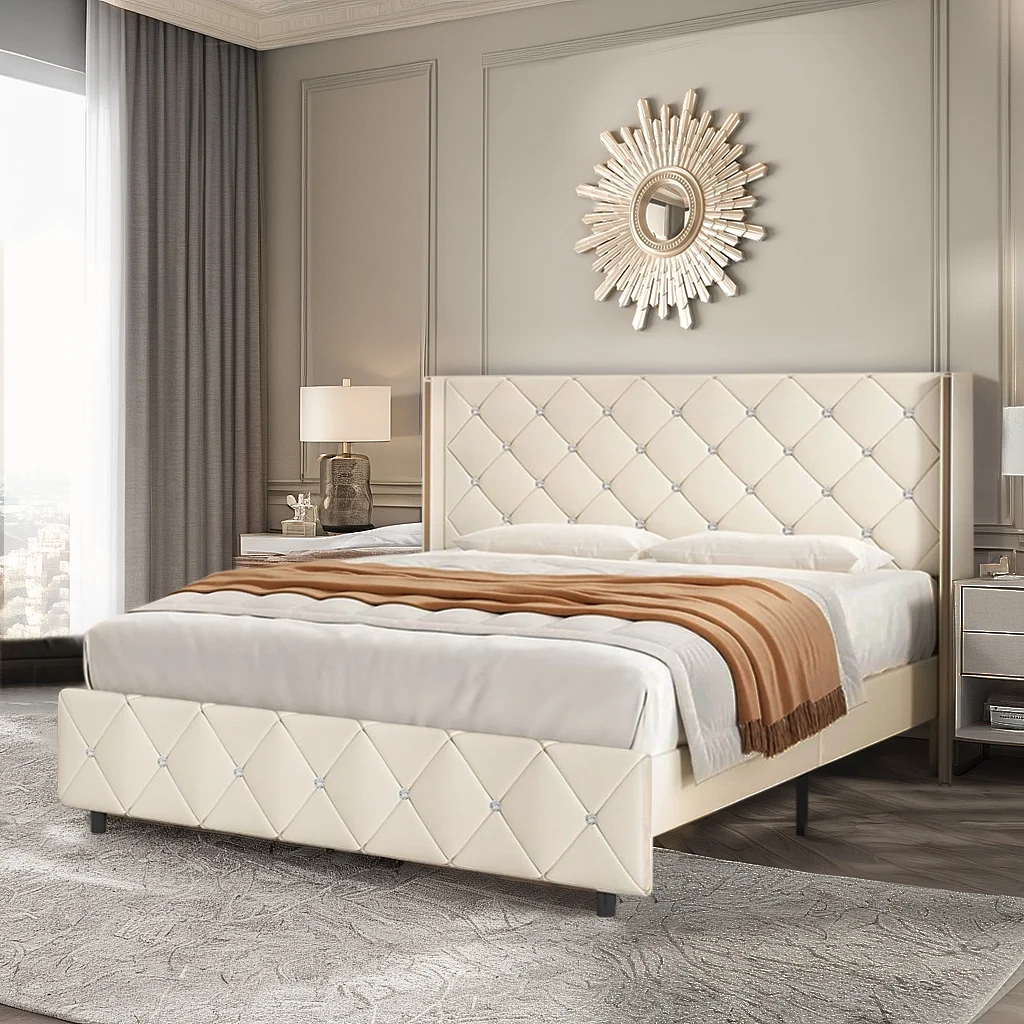 Catrimown Full Size Bed Frame, Upholstered Platform Bed Frame with Wingback Headboard, Beige