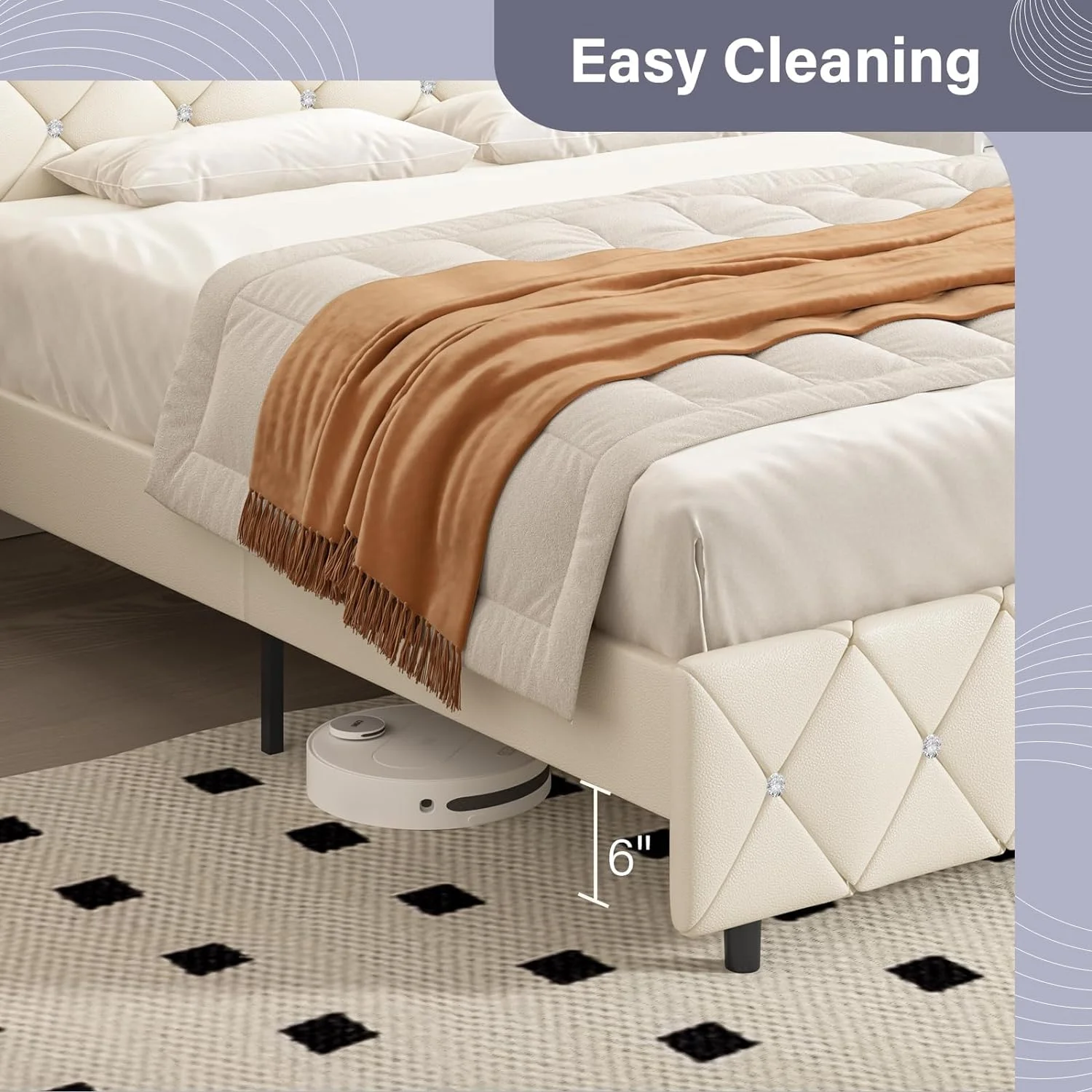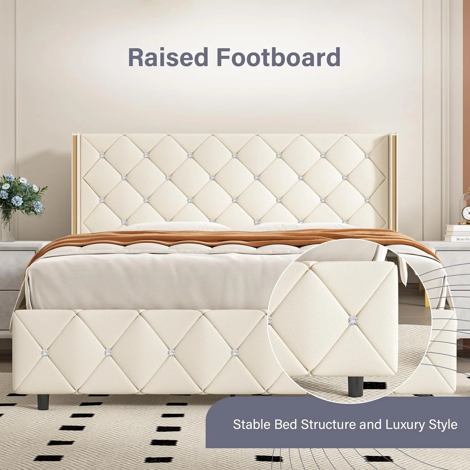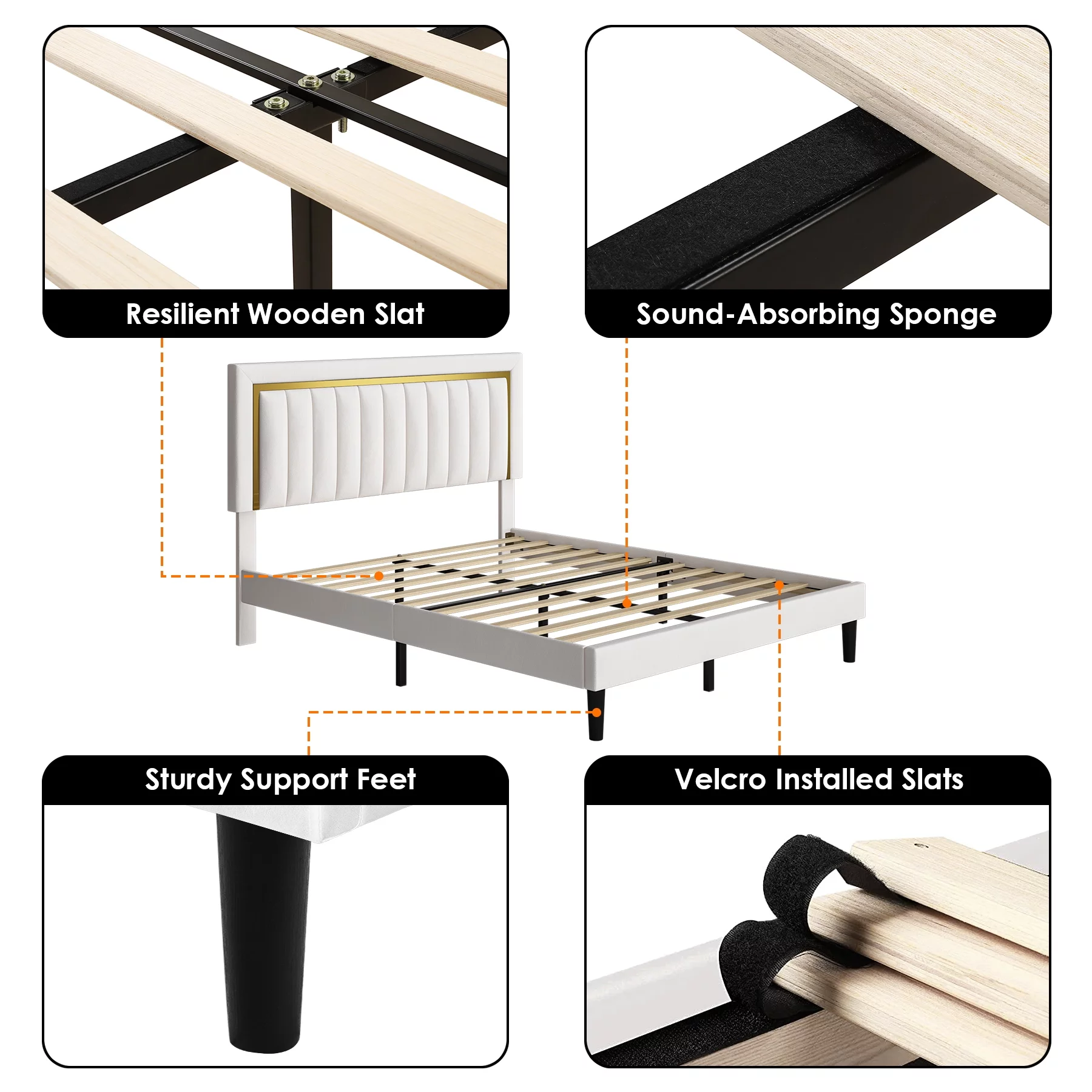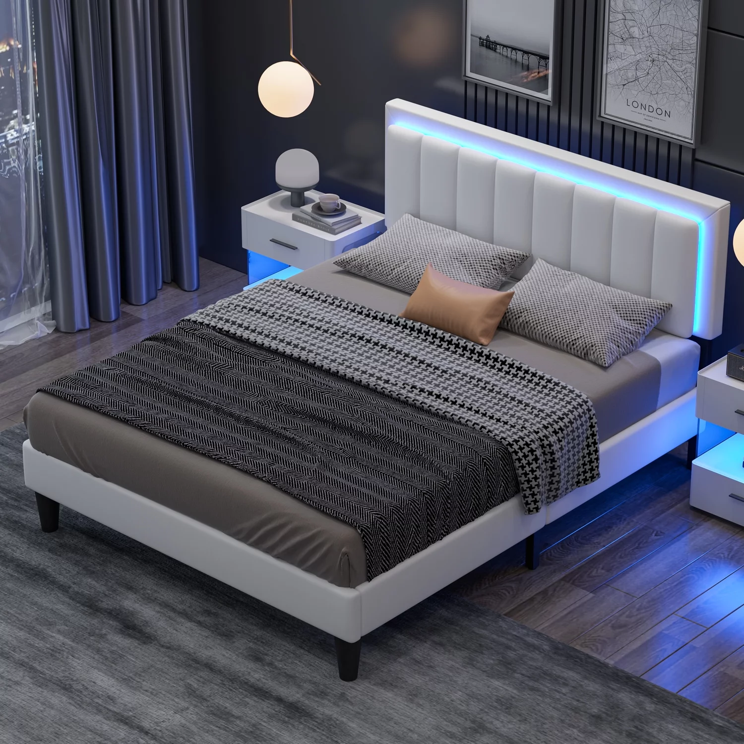 4 EVER WINNER Full Size Led Bed Frame, Upholstered Platform Bed Frame with PU Faux Leather Headboard, White