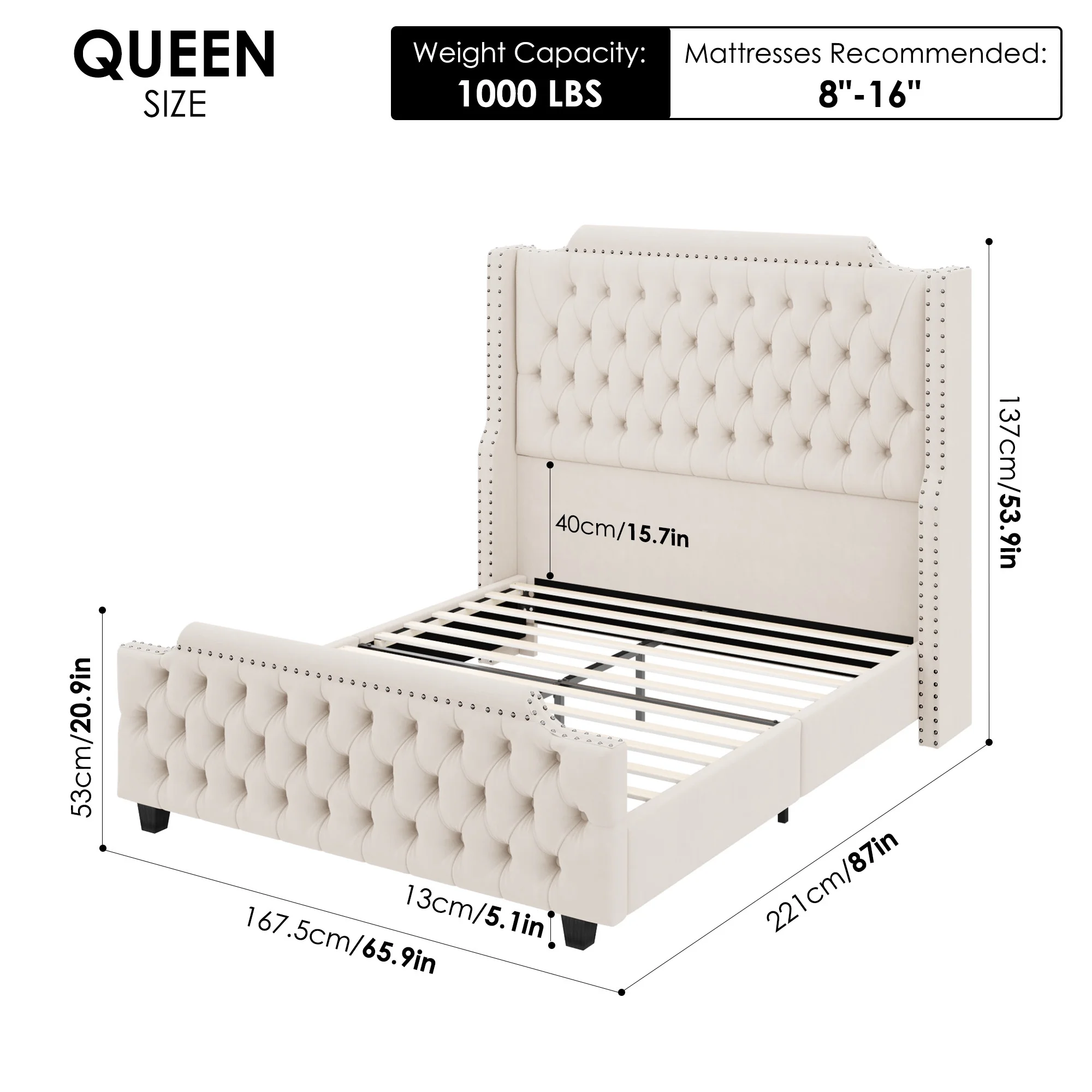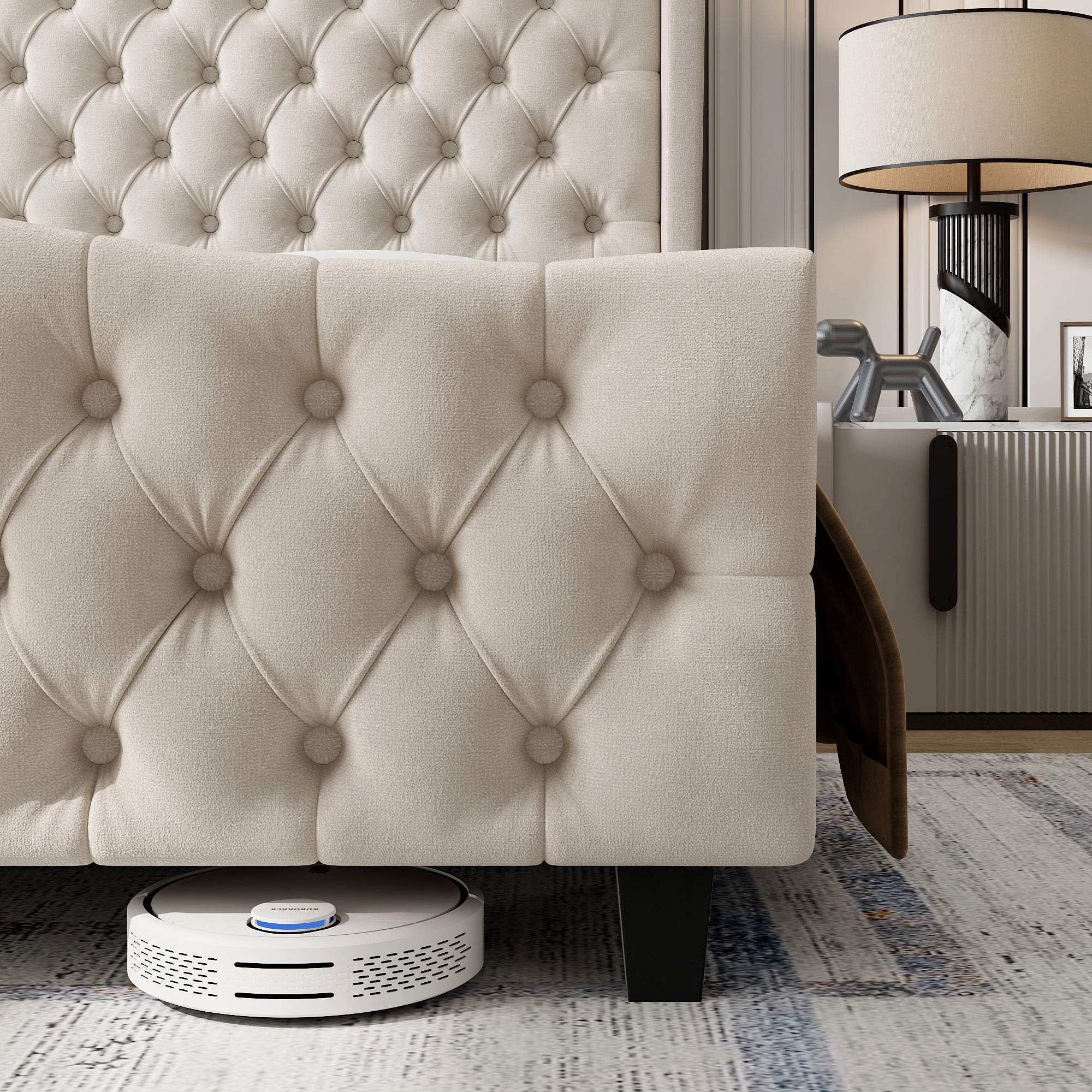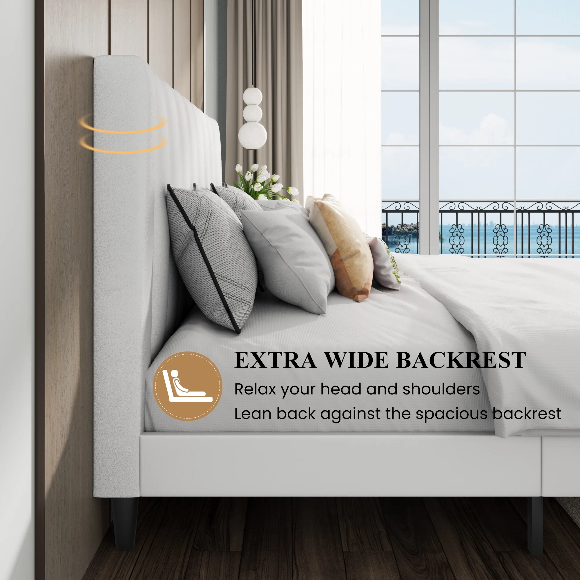 Flolinda Queen Size Bed Frame with Complete High Headboard, Fabric Upholstered Platform Bed Frame, Beige