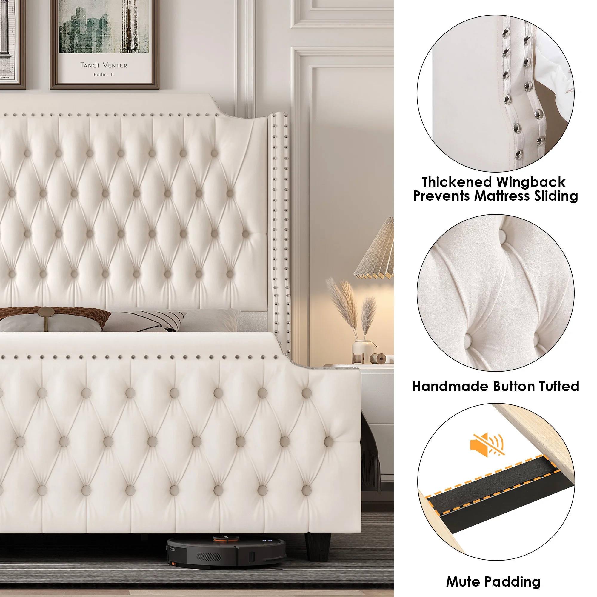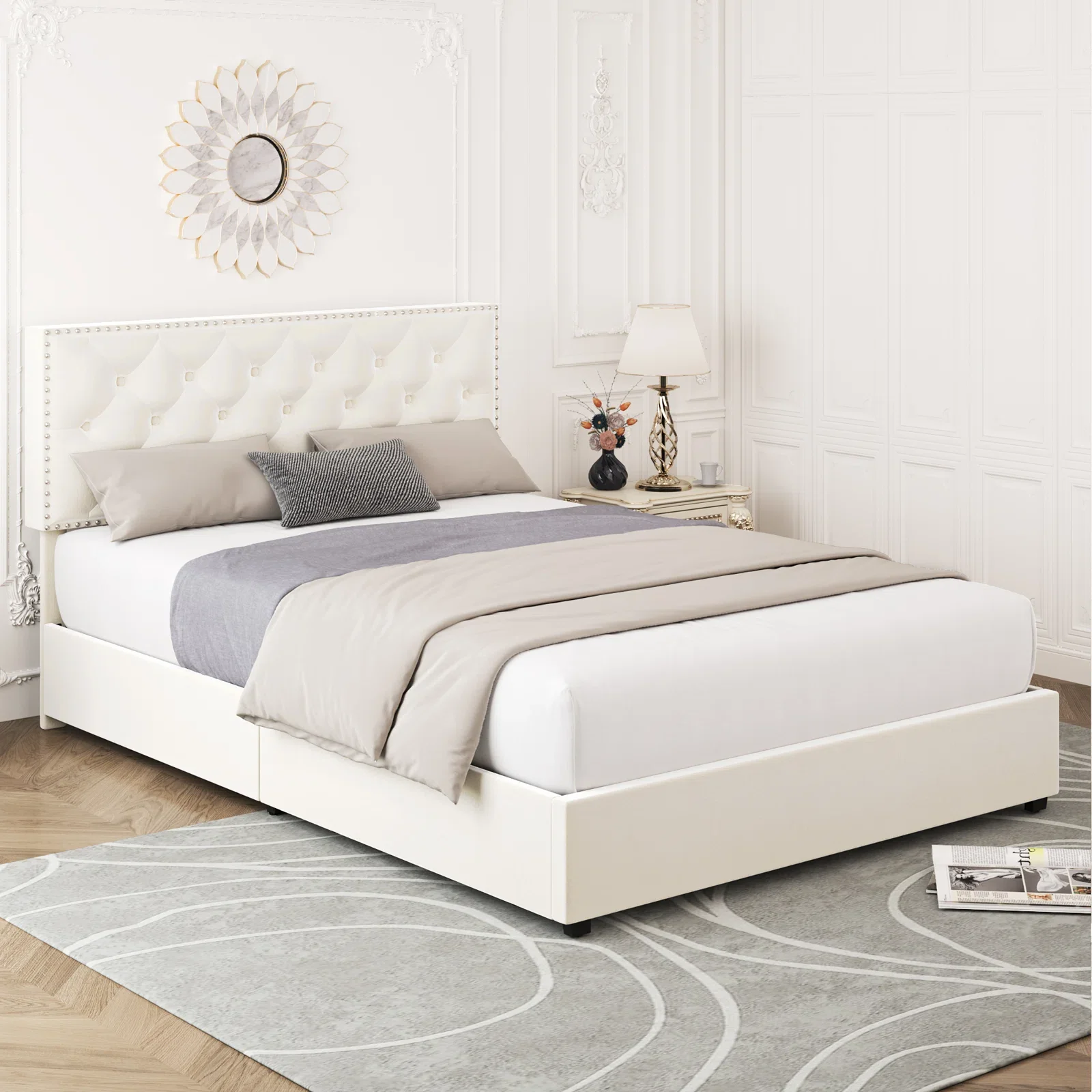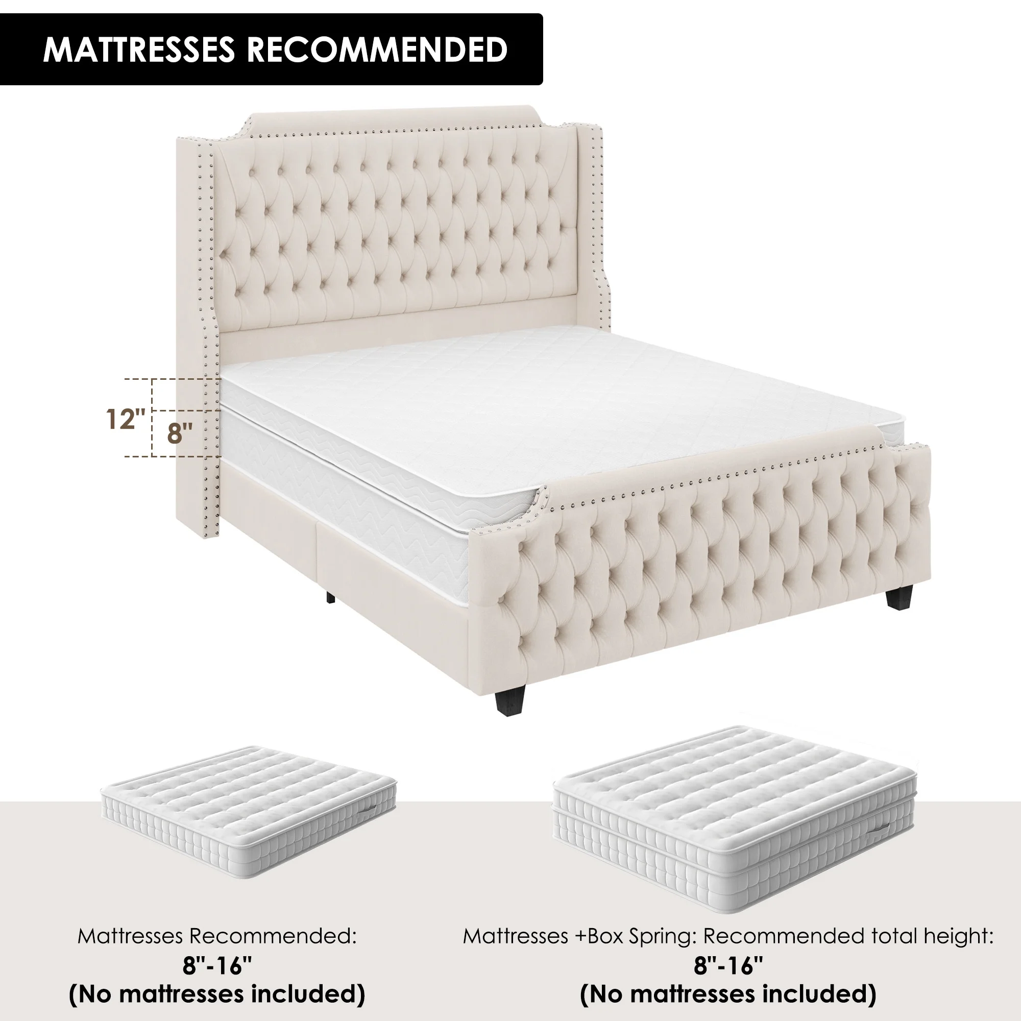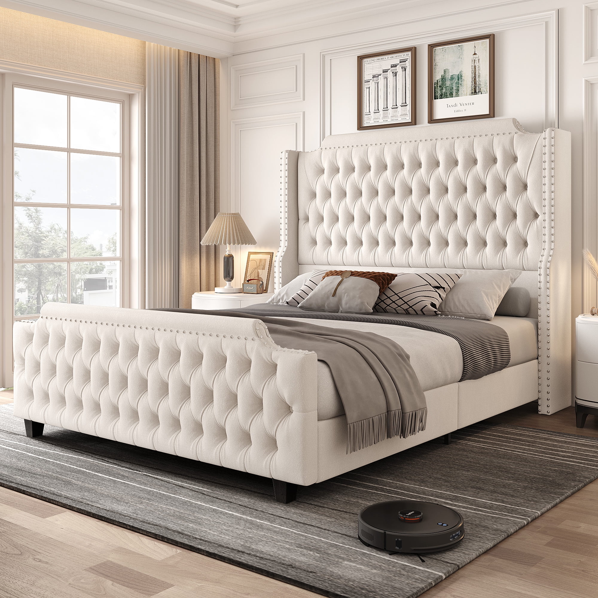 Flolinda Queen Size Bed Frame with Complete High Headboard, Fabric Upholstered Platform Bed Frame, Beige