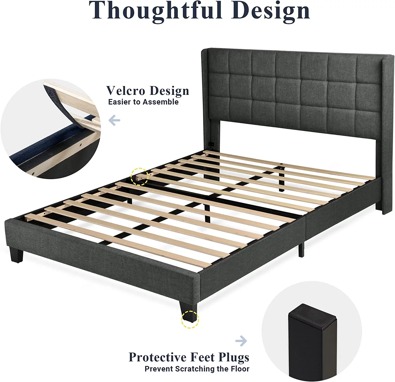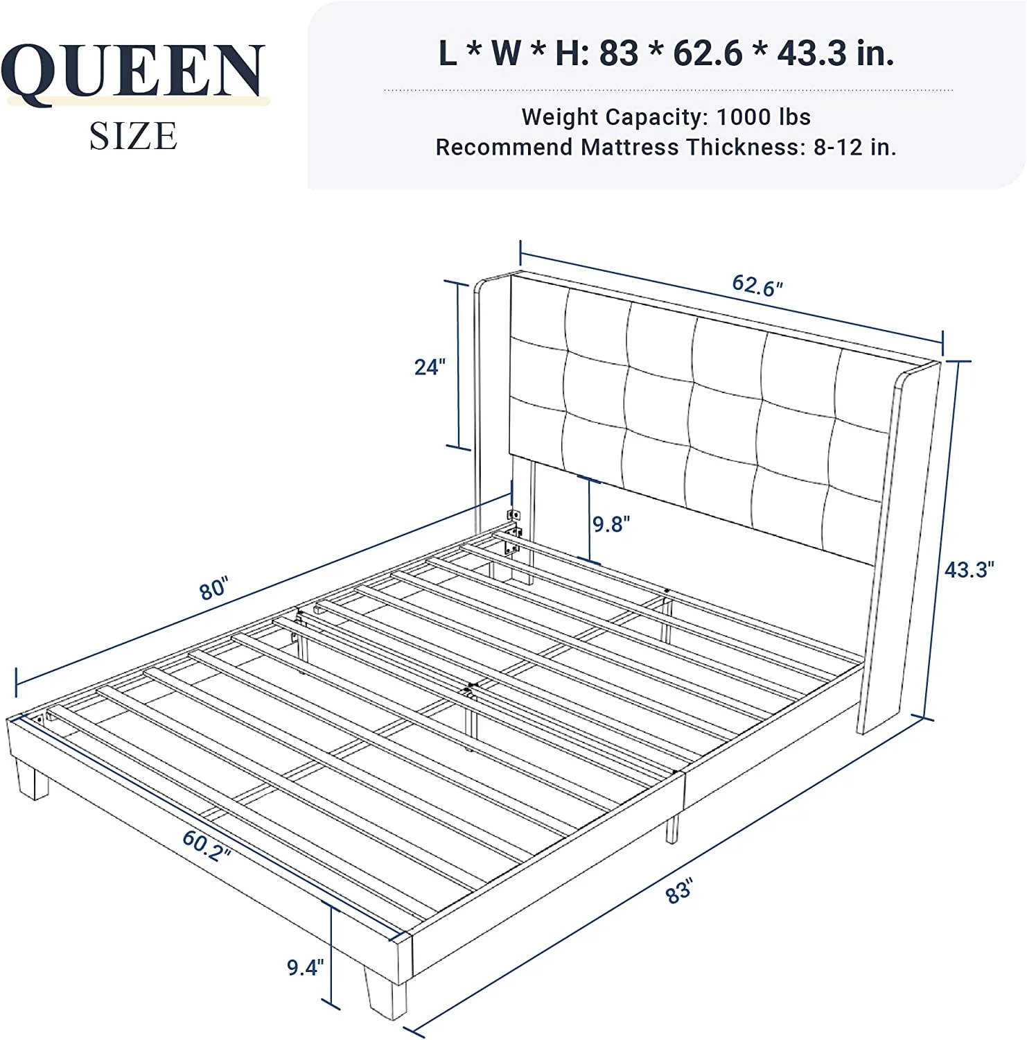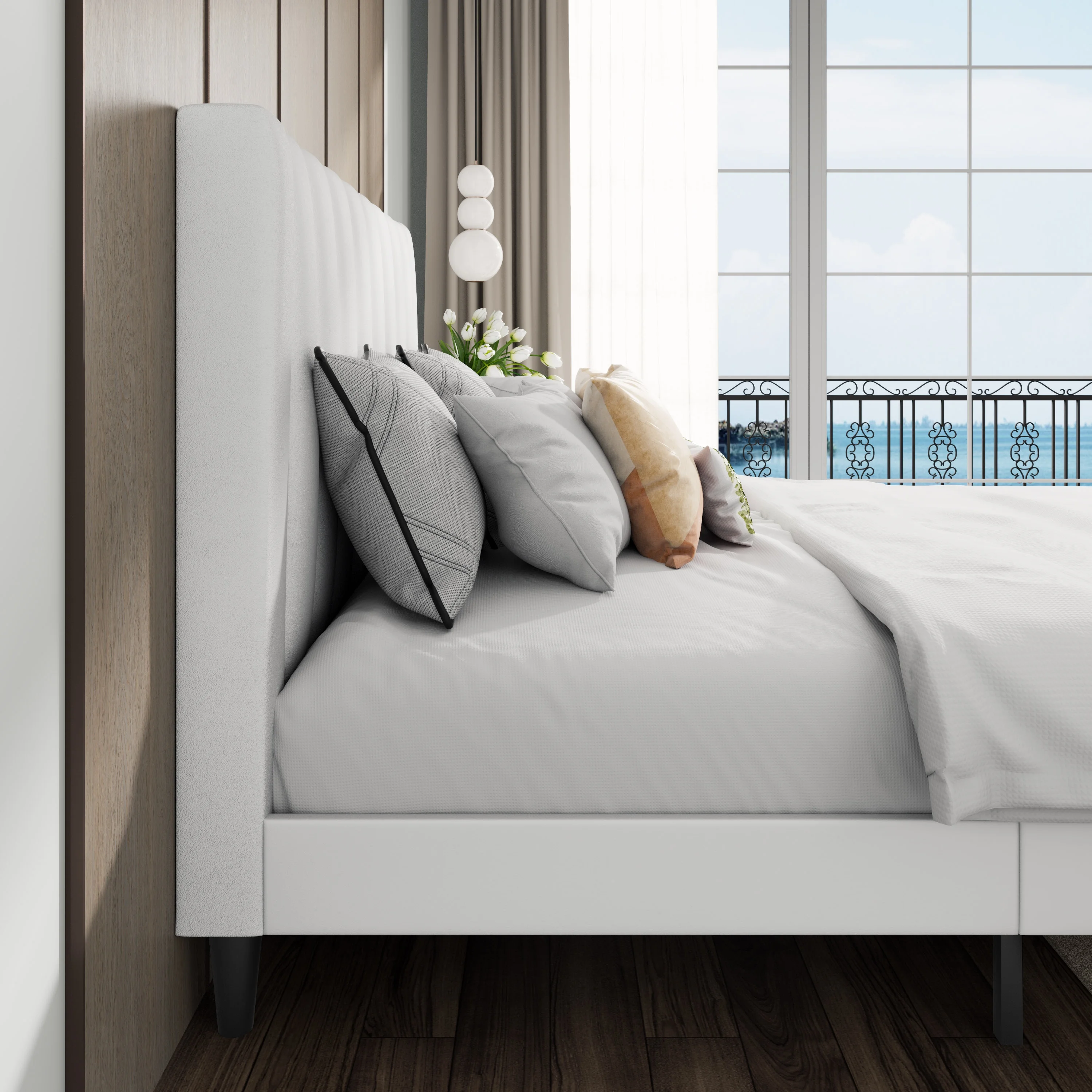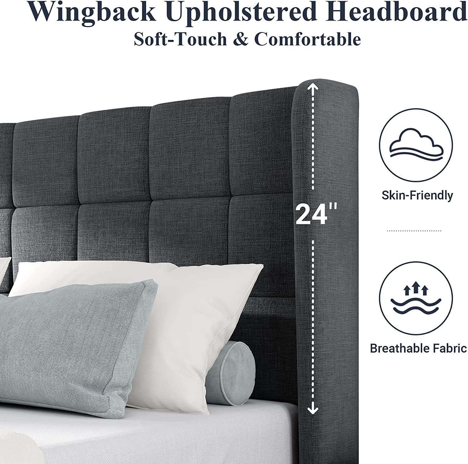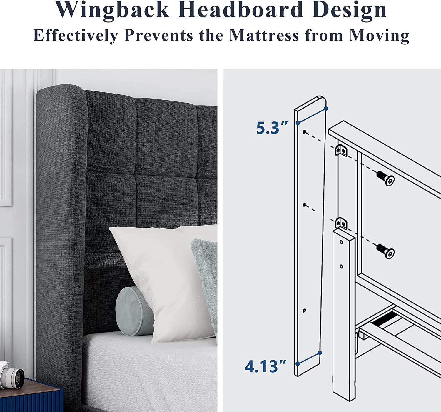 Allewie Queen Size Platform Bed with Wingback Fabric Upholstered Square Stitched Headboard and Wooden Slats, Grey