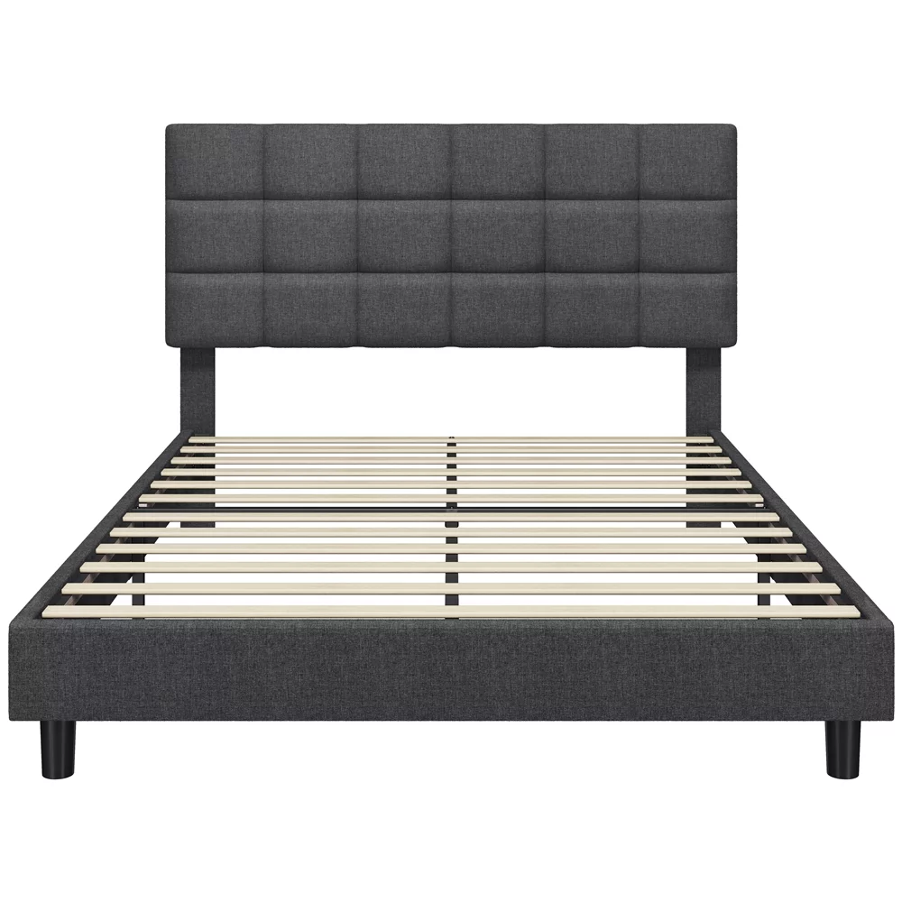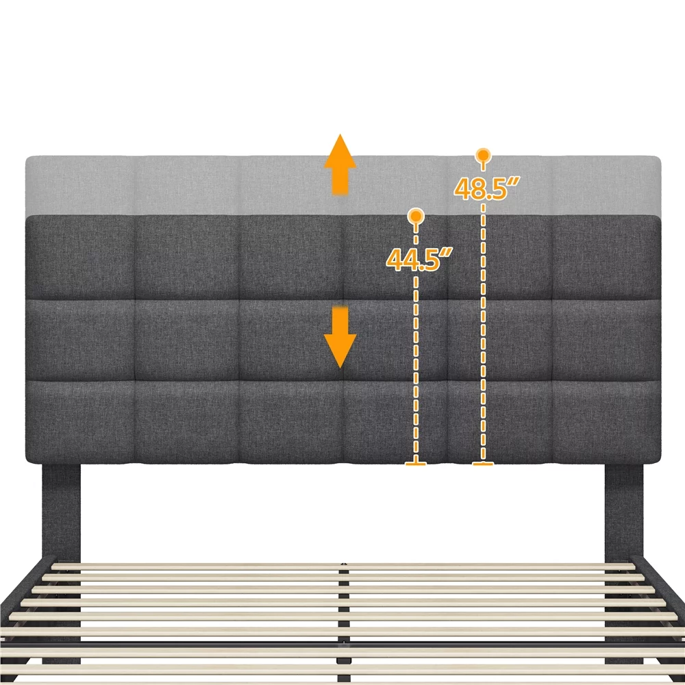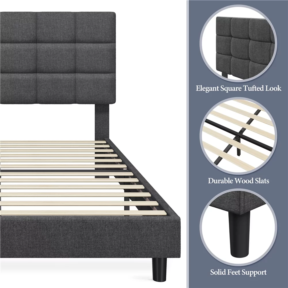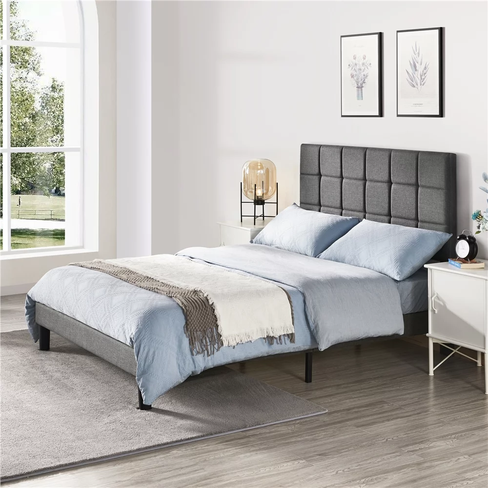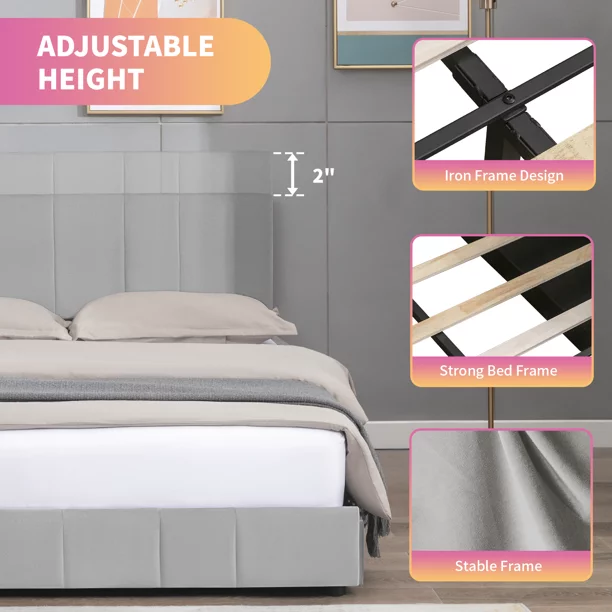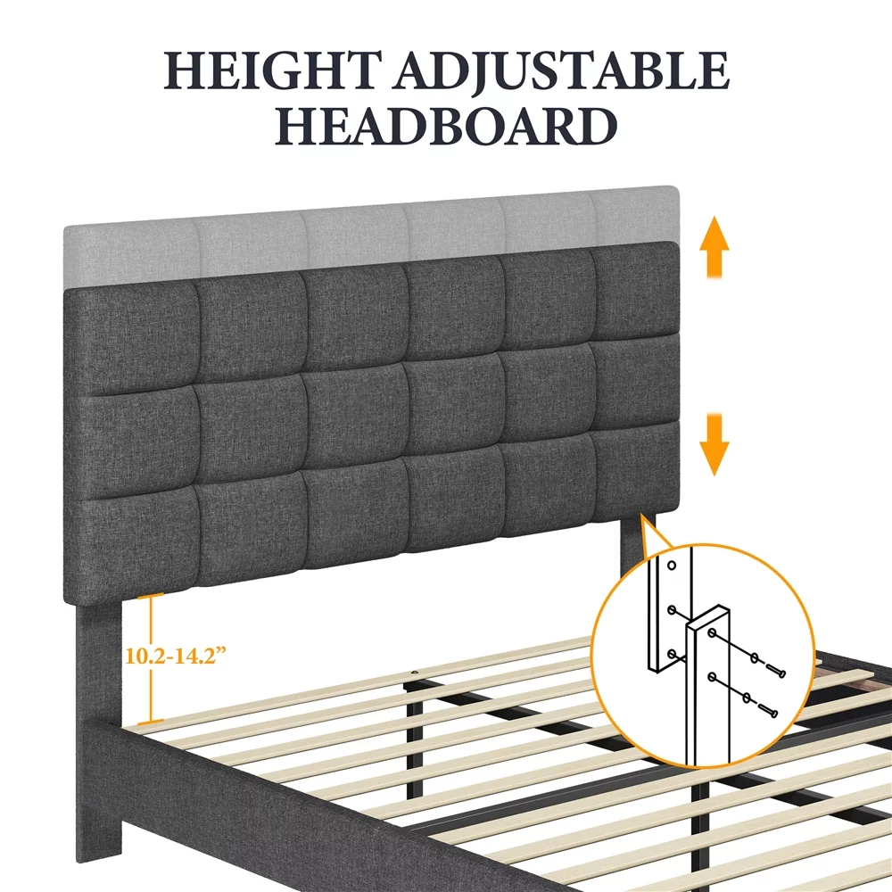 Allewie Queen Size Platform Bed with Wingback Fabric Upholstered Square Stitched Headboard and Wooden Slats, Grey