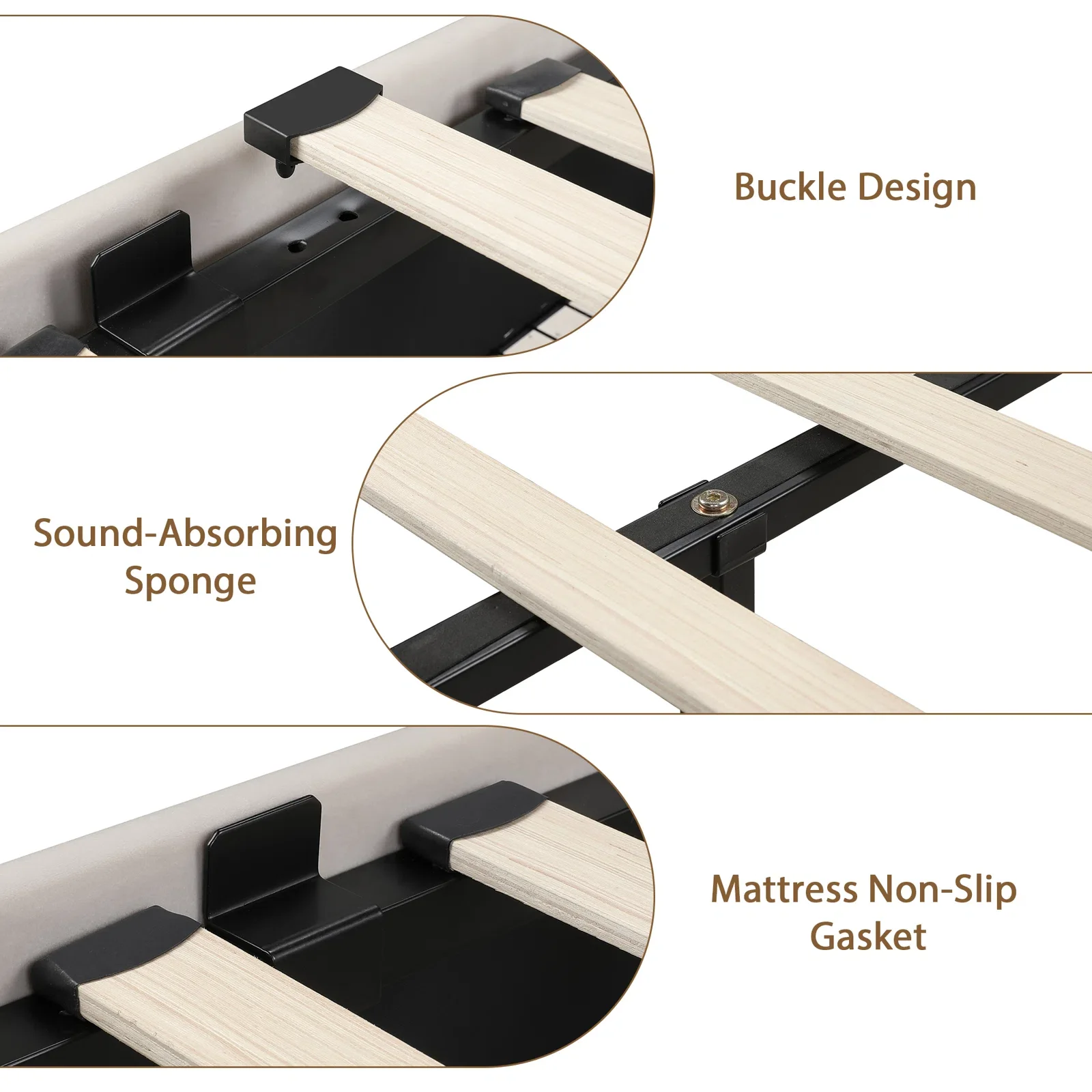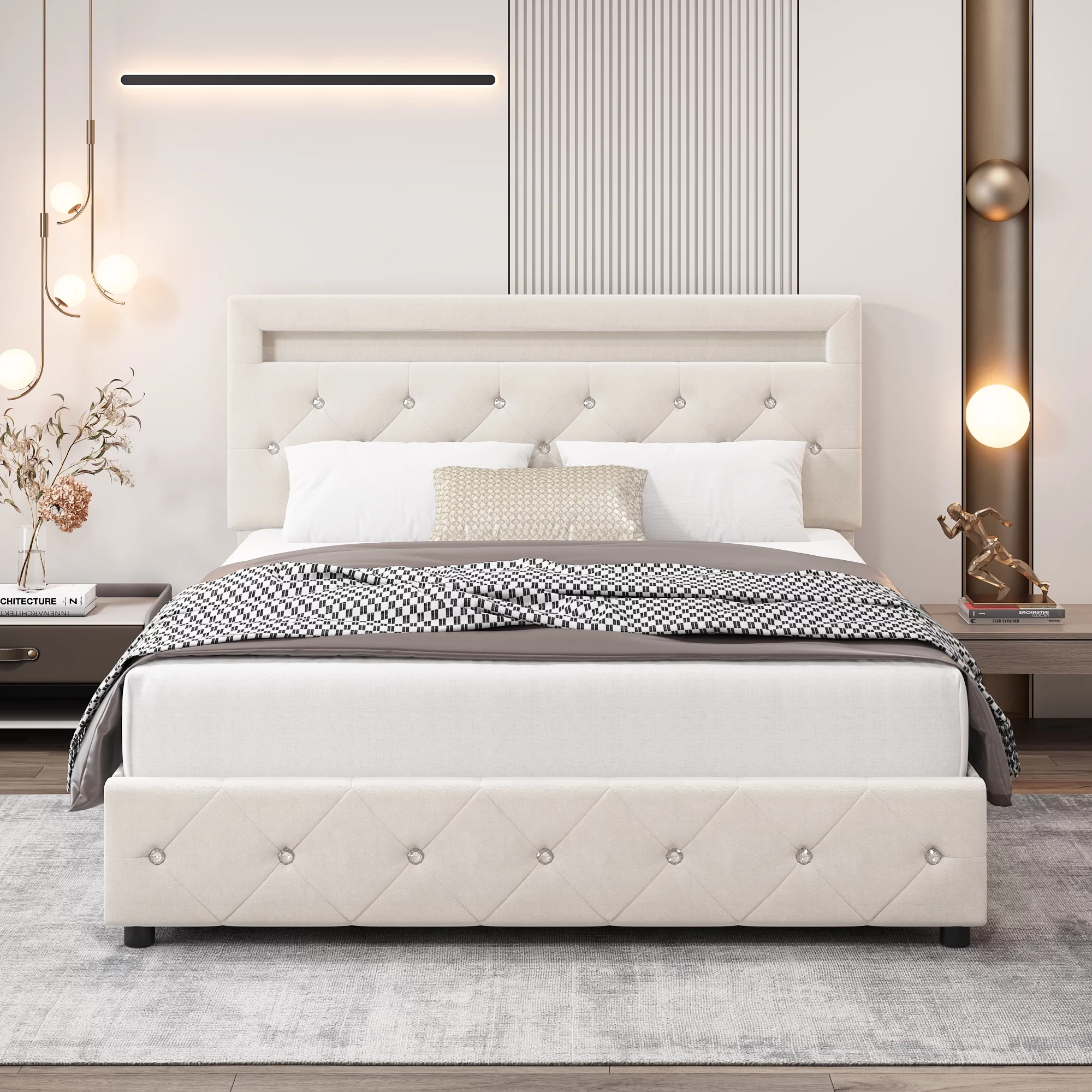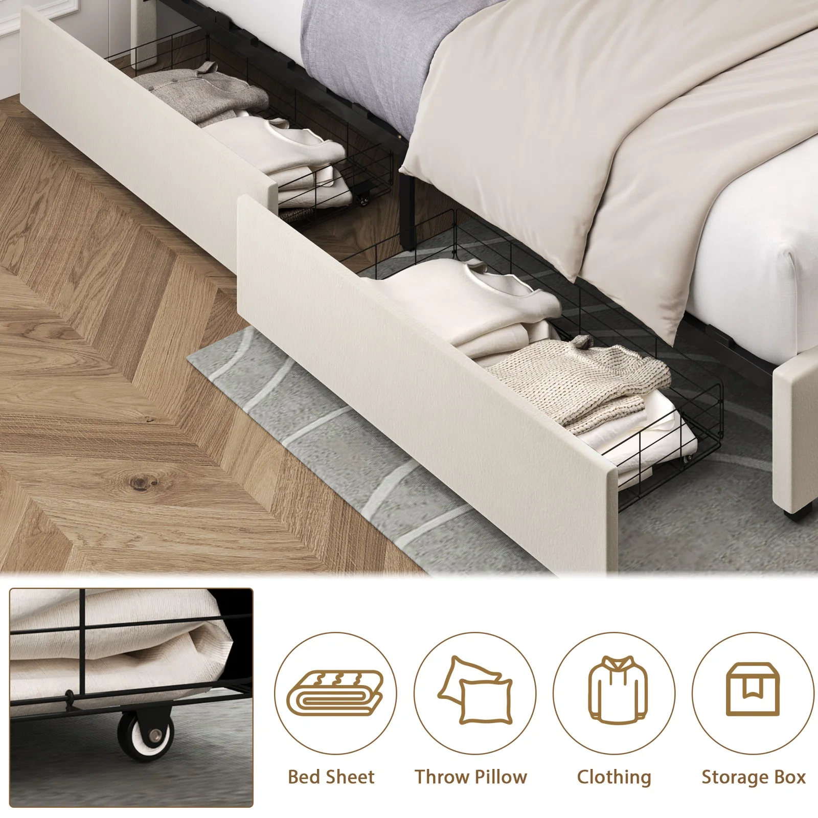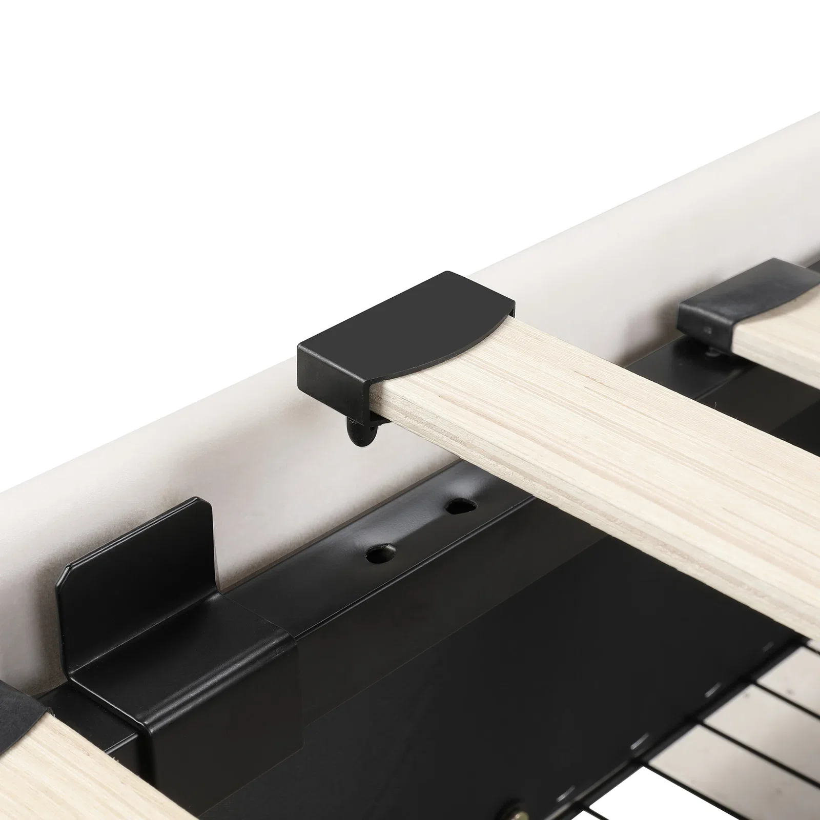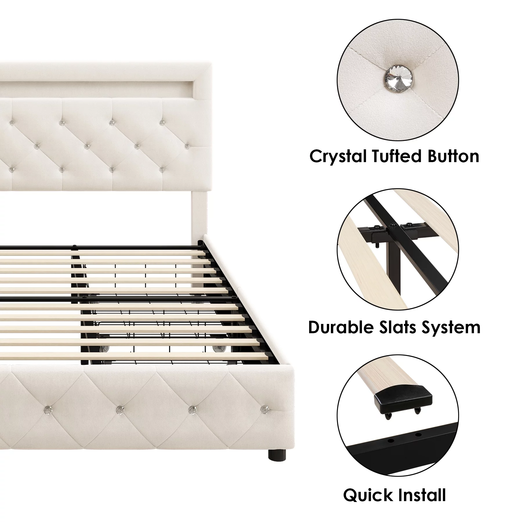 Dextrus Queen Size Bed Frame with Charging Station Footboard Metal Slats, and Storage Headboard, Beige