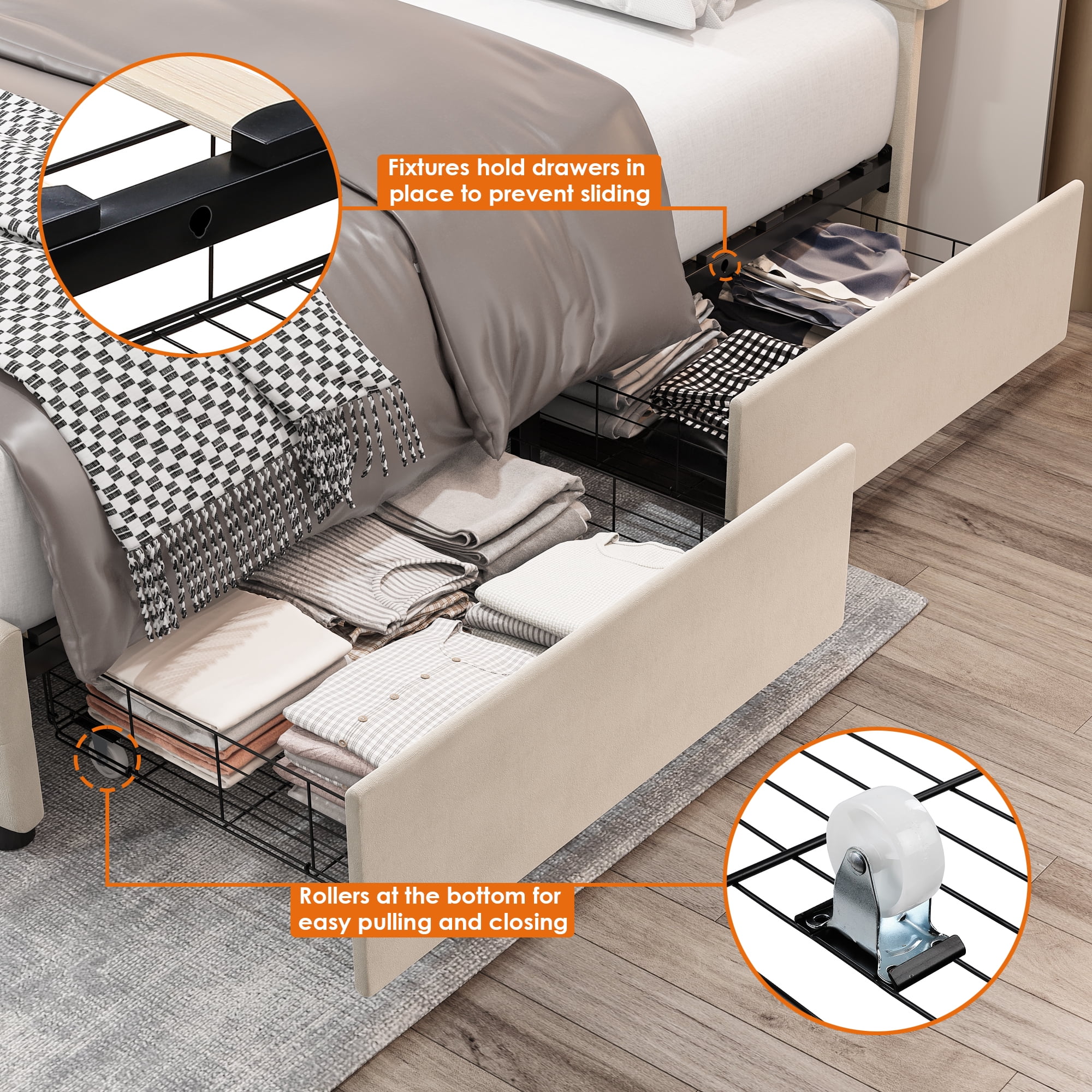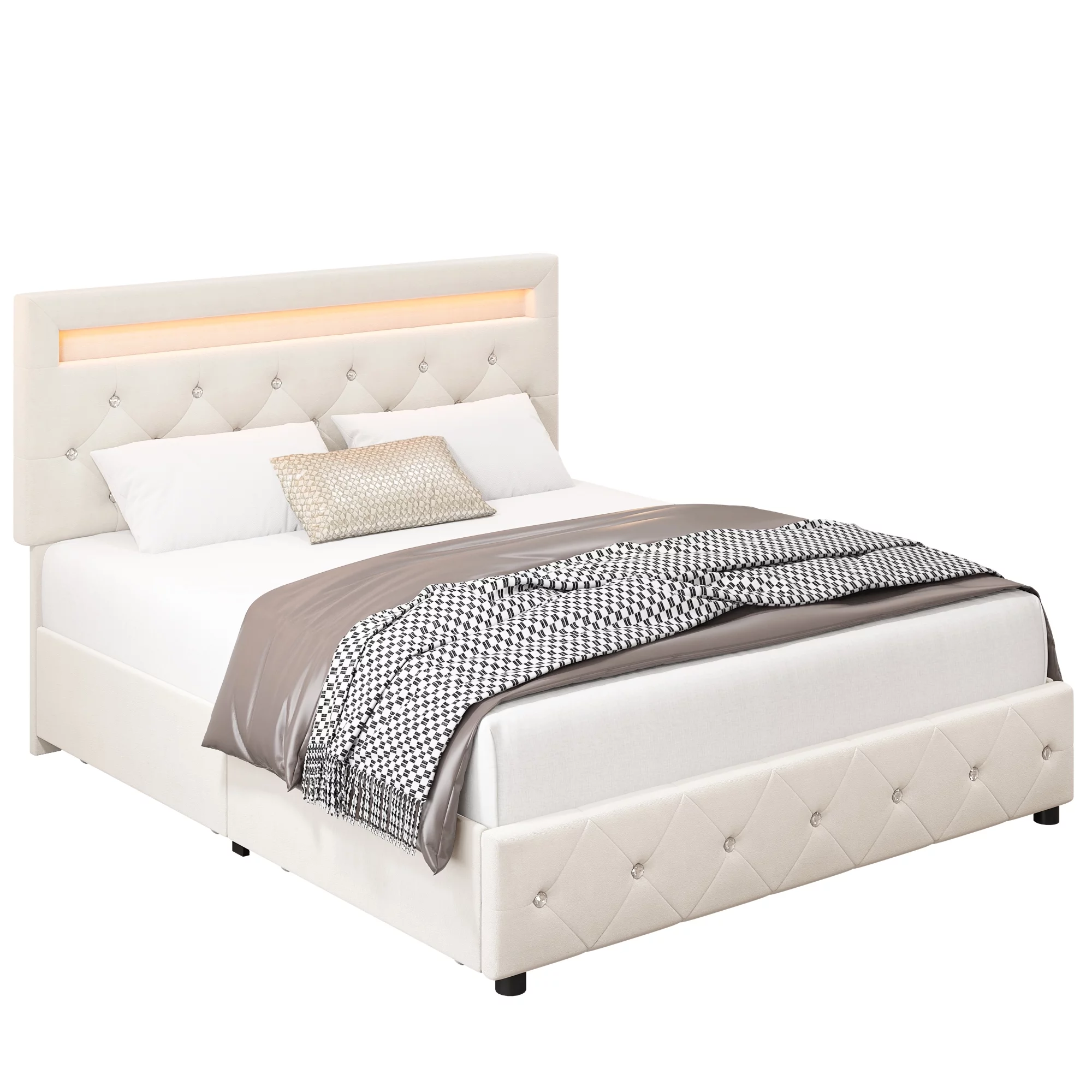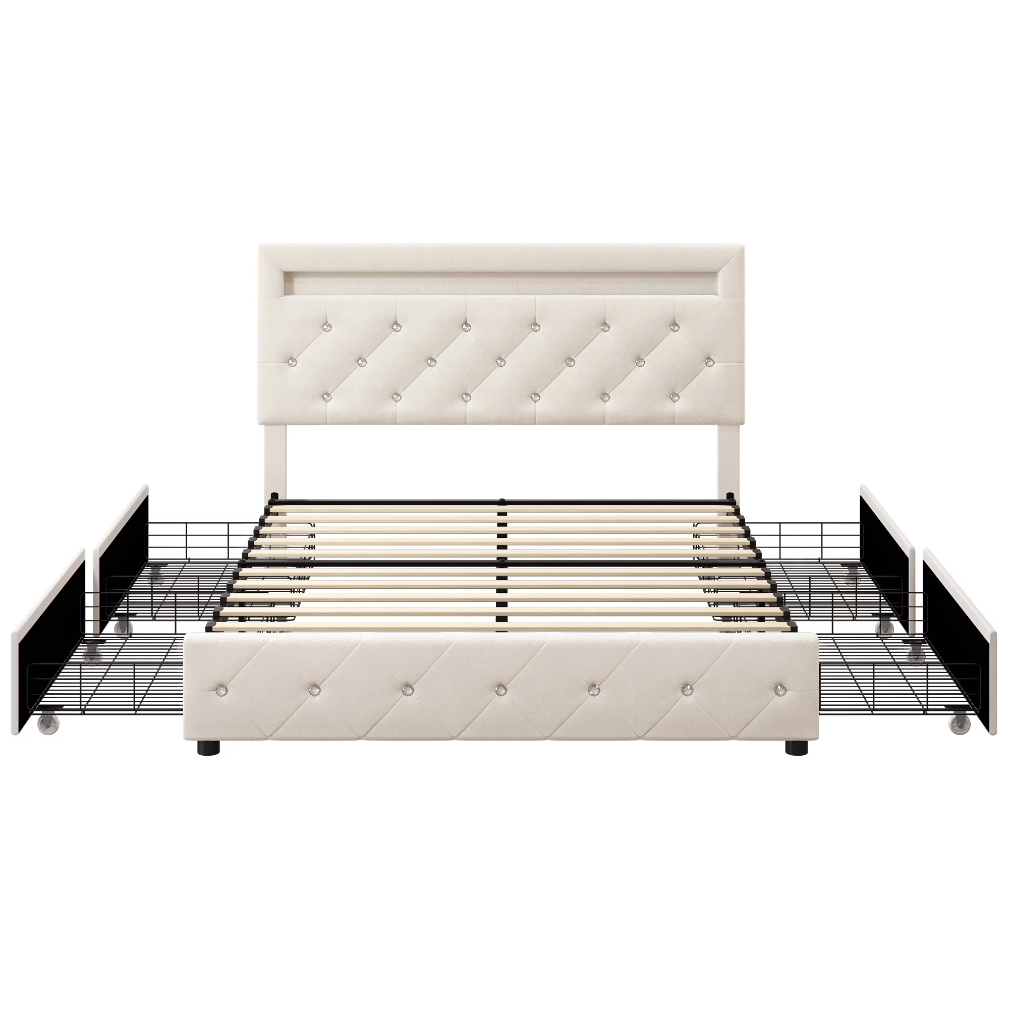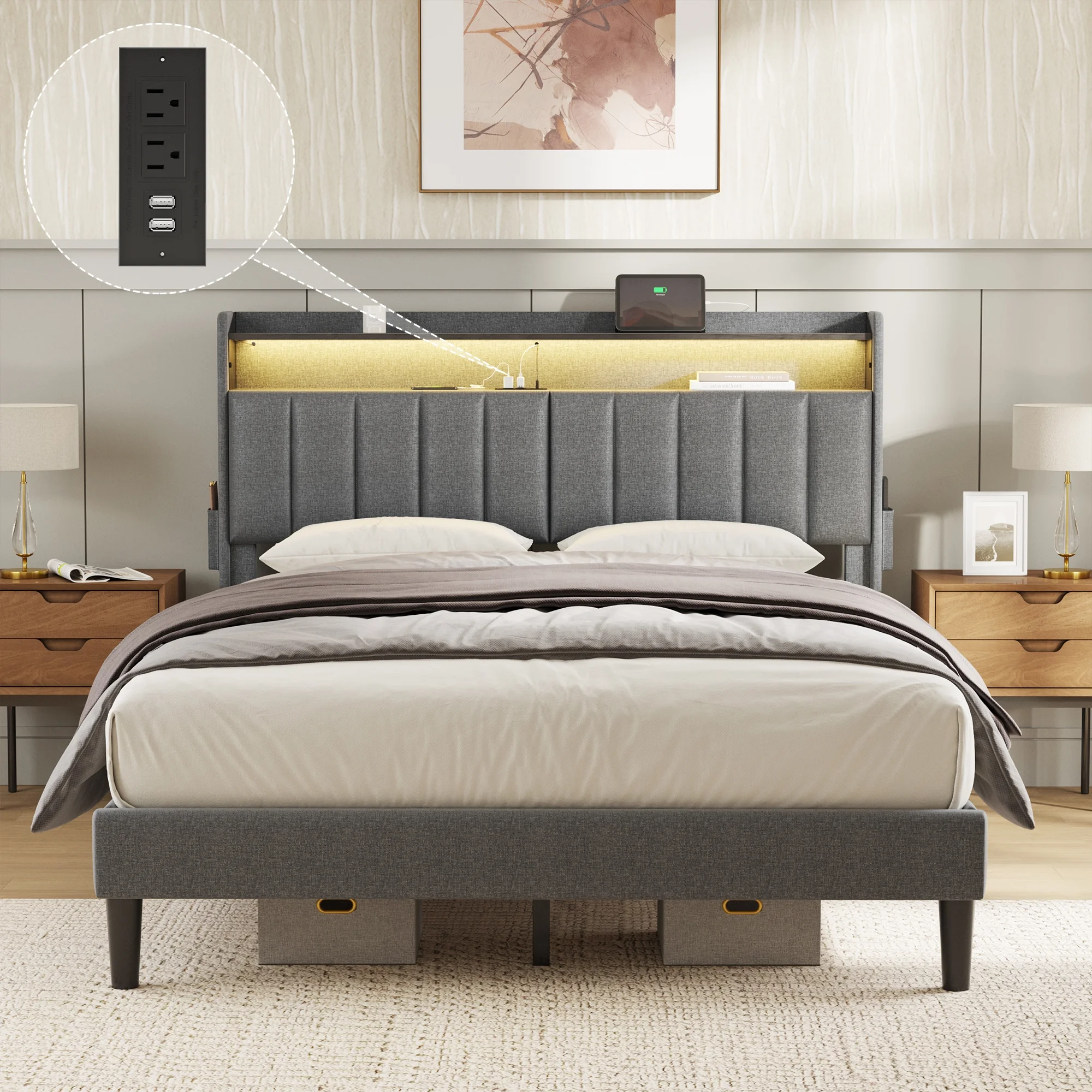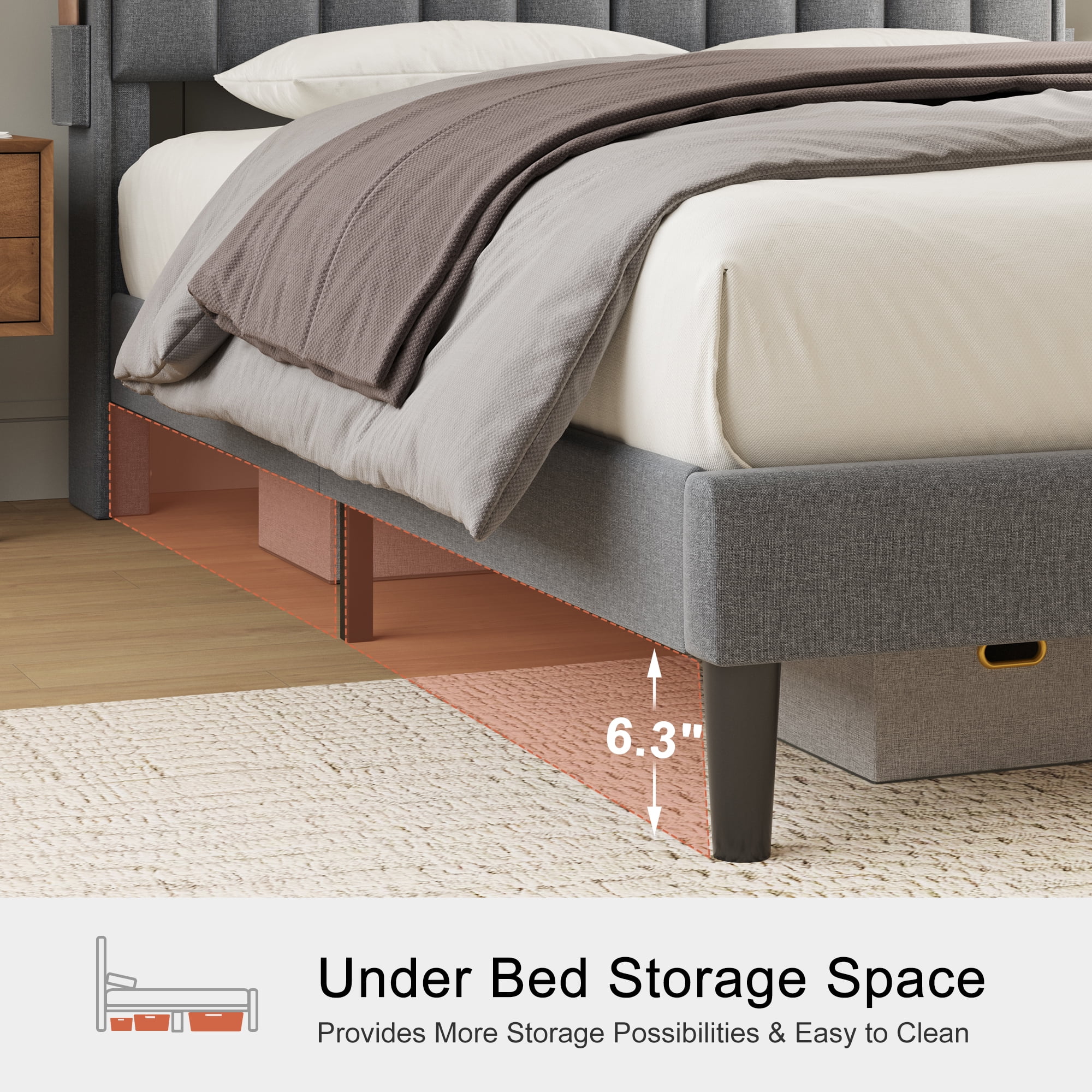 Dextrus Queen Size Bed Frame with Charging Station Footboard Metal Slats, and Storage Headboard, Beige
