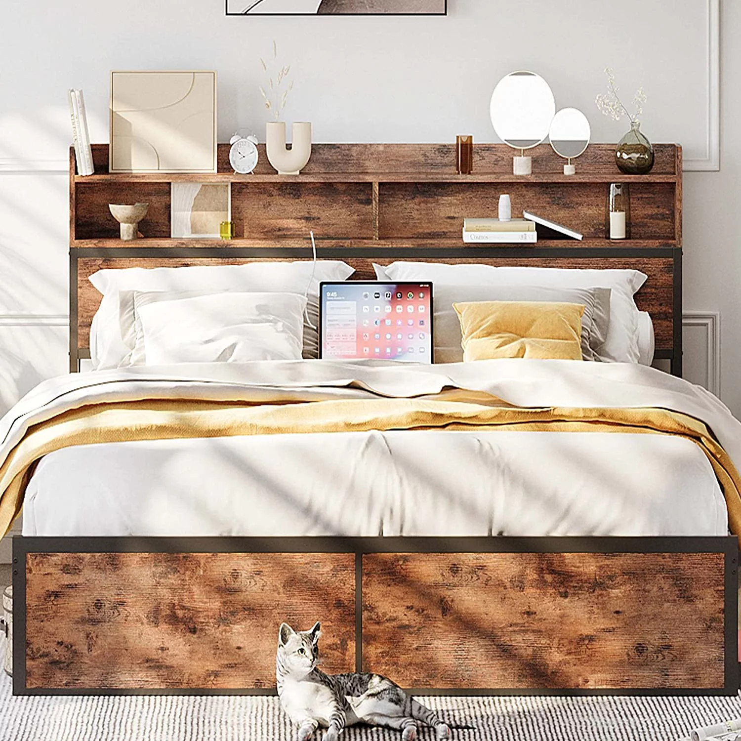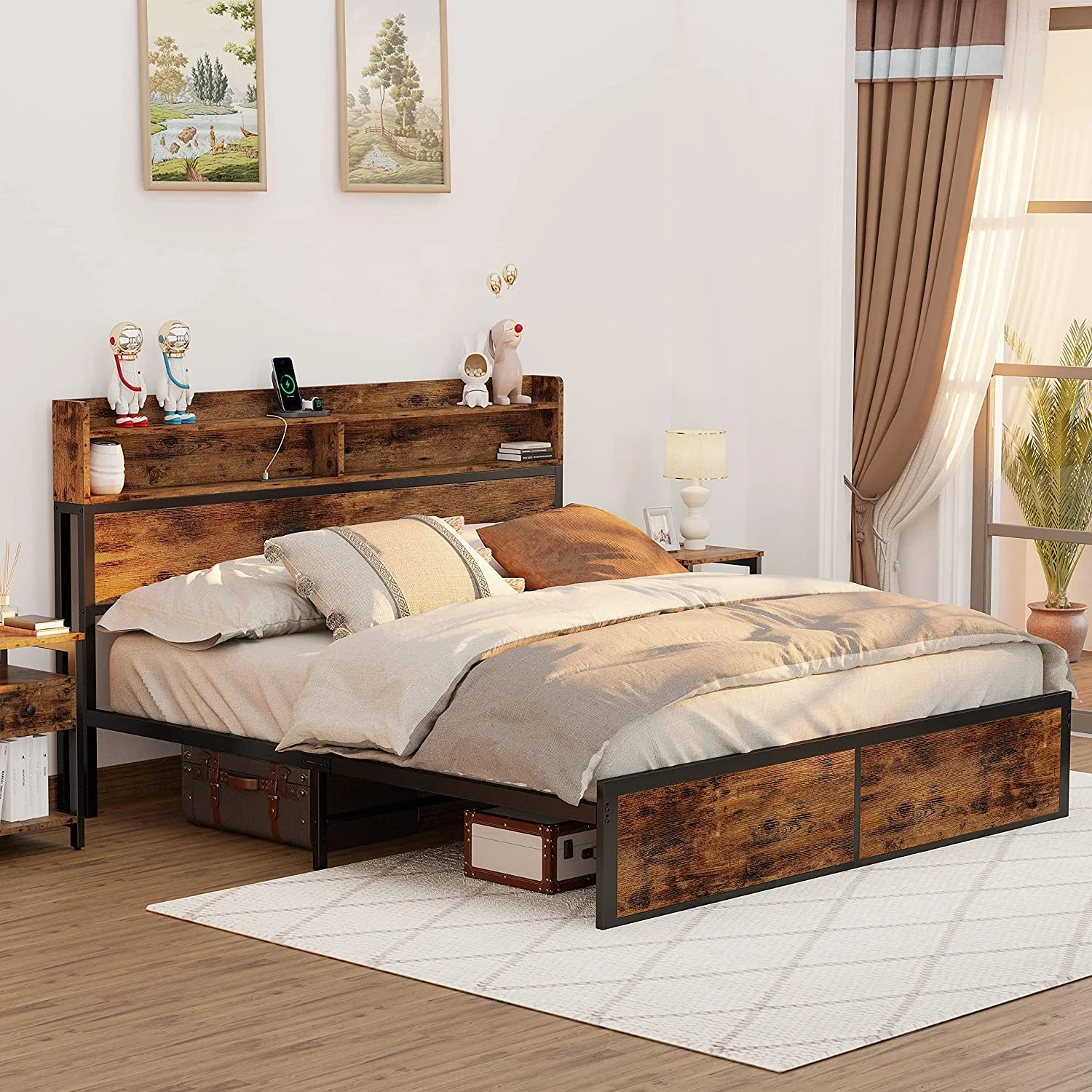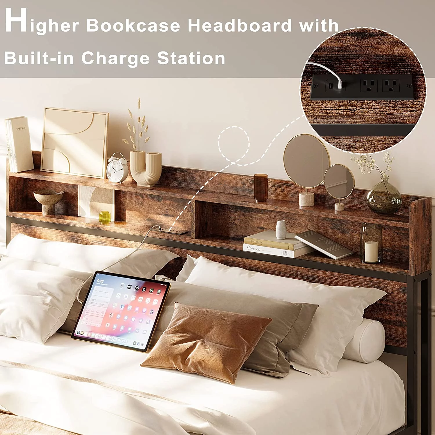 IRONCK Queen Size Bed Frame, Bookcase Headboard with Charging Station, Platform Storage Bed Vintage Brown