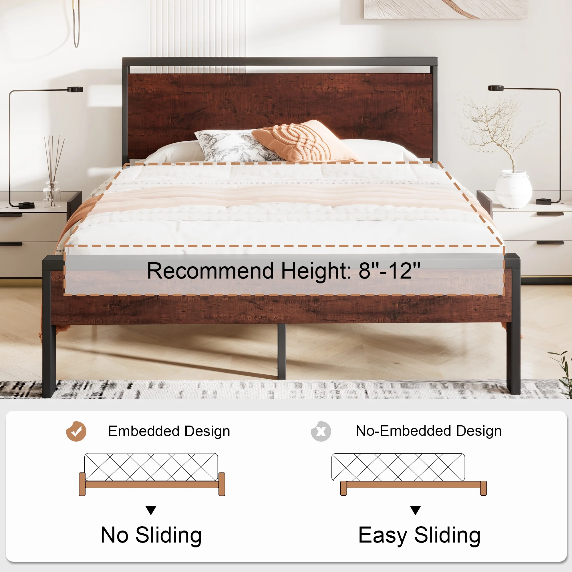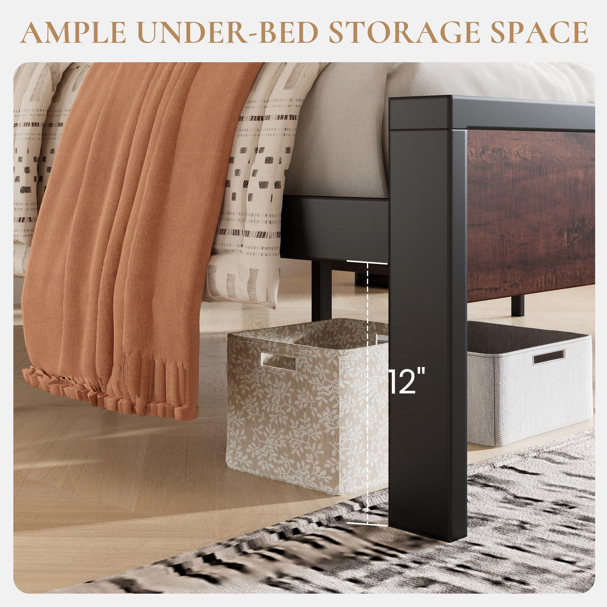 Sha Cerlin Walnut Queen Size Metal Platform Bed Frame with Wooden Headboard & Underbed Storage, Adult