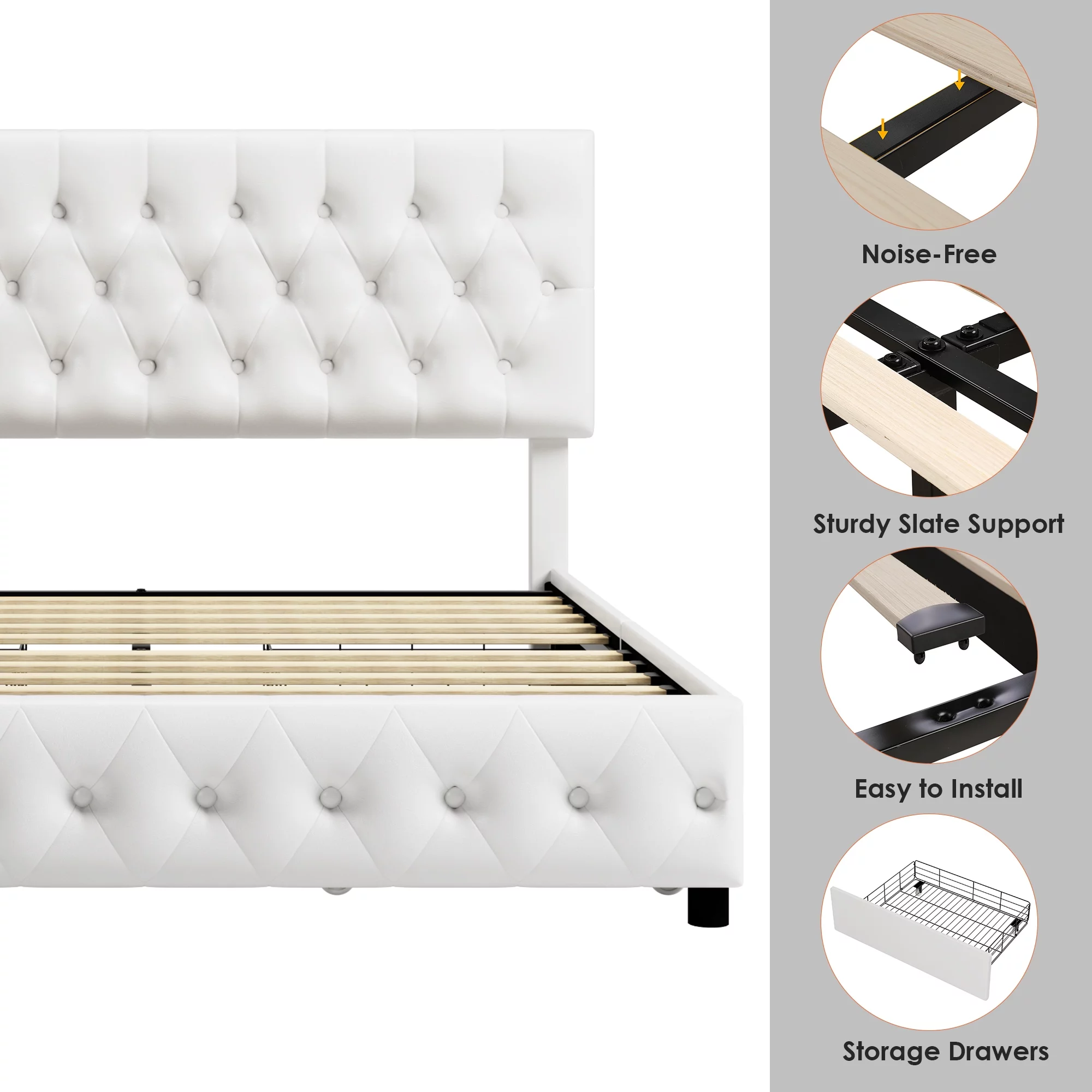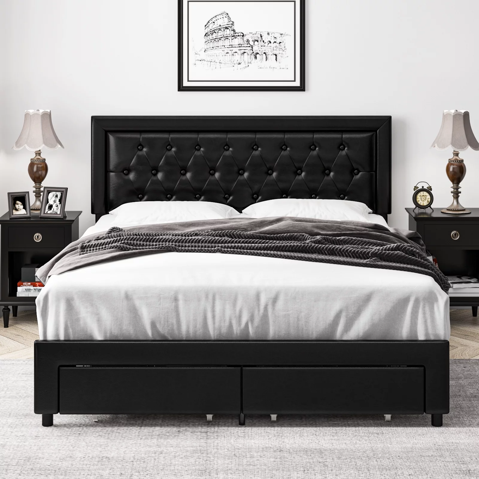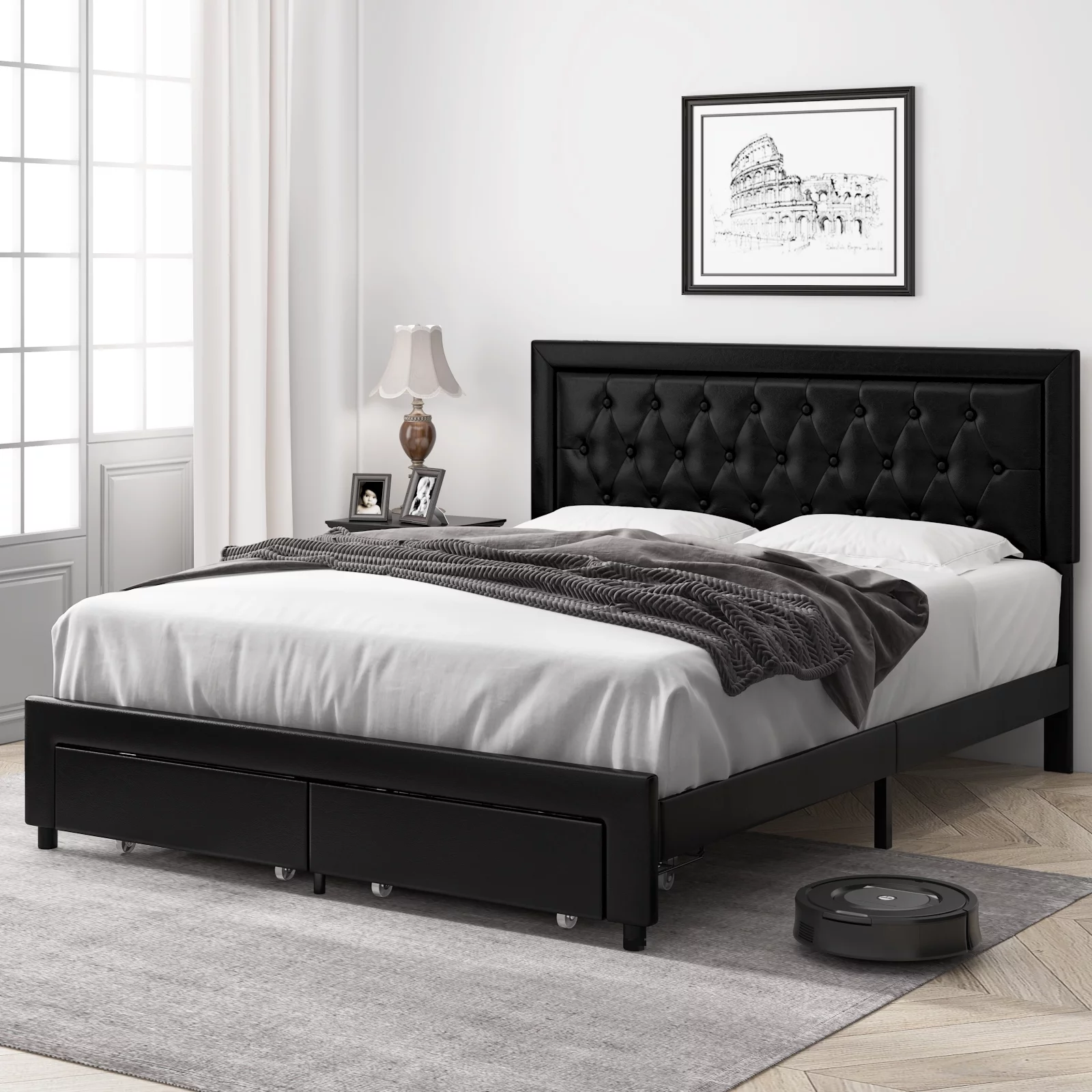 Homfa Queen Size 2 Drawers Bed Frame, PU Leather Upholstered Platform Bed with Adjustable Button Headboard, Black