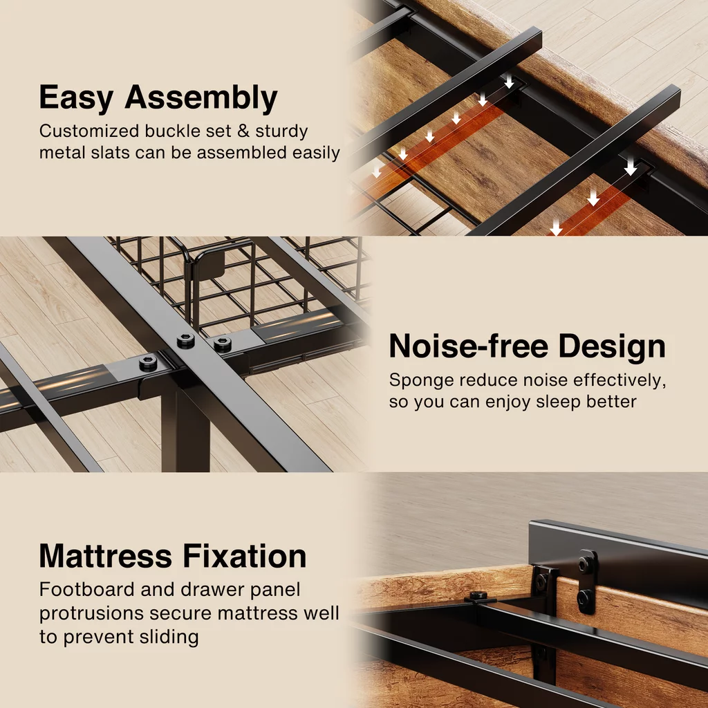 Aiho Queen Size Metal Bed Frame with Drawers and Headboard for Bedroom - Brown
