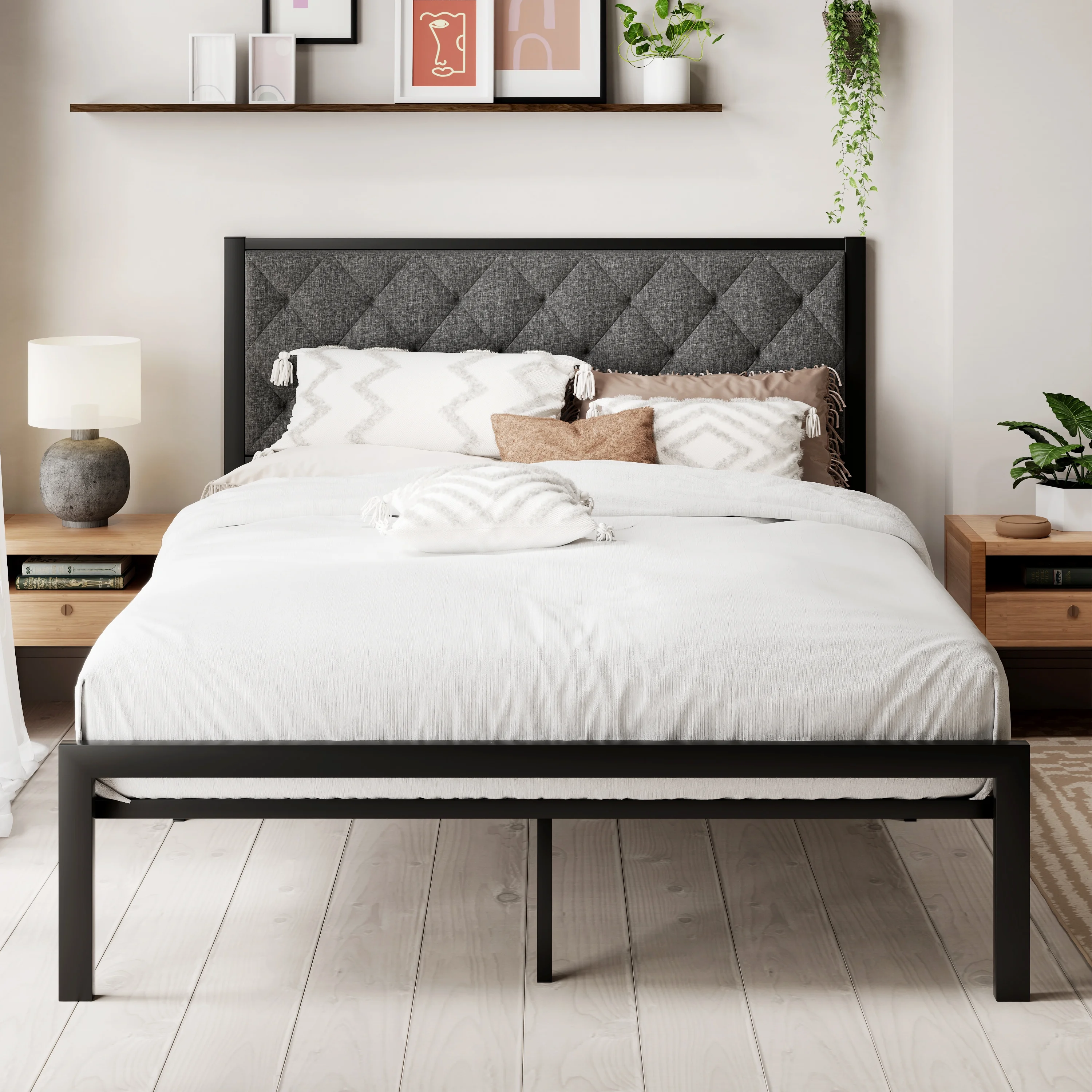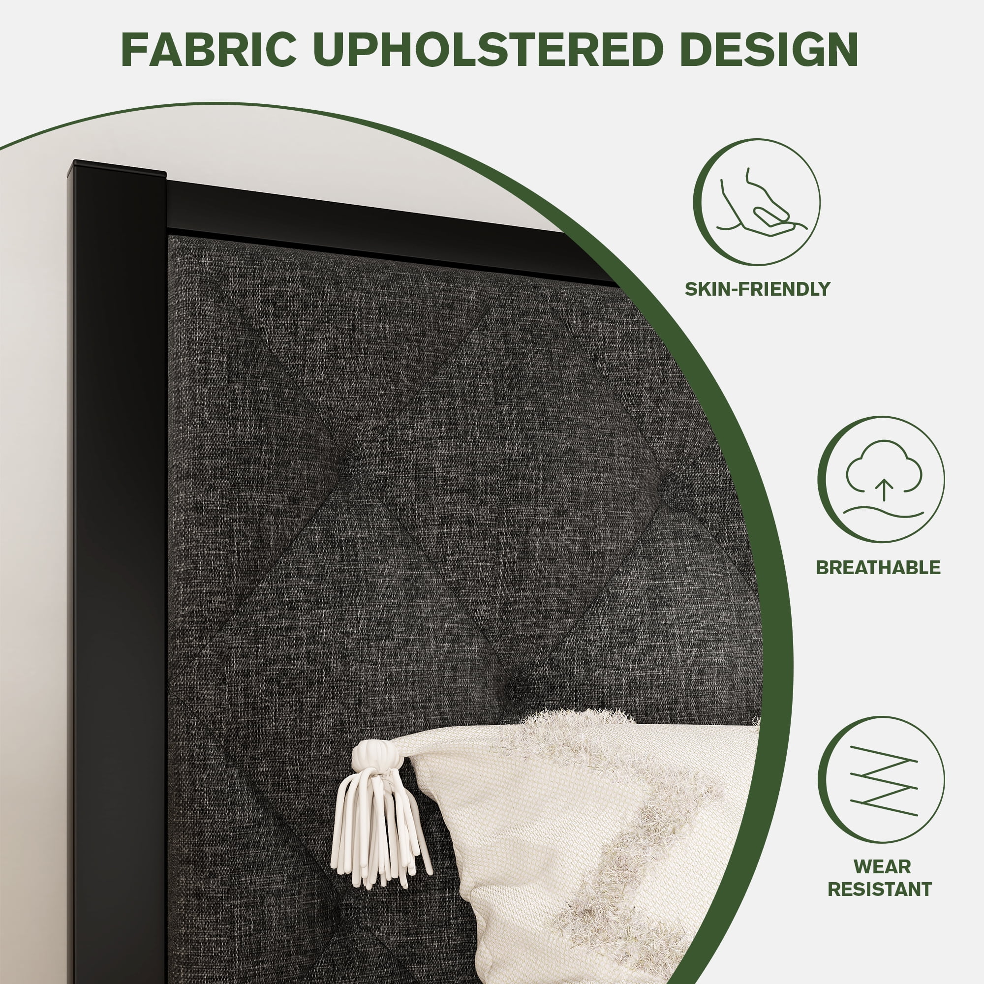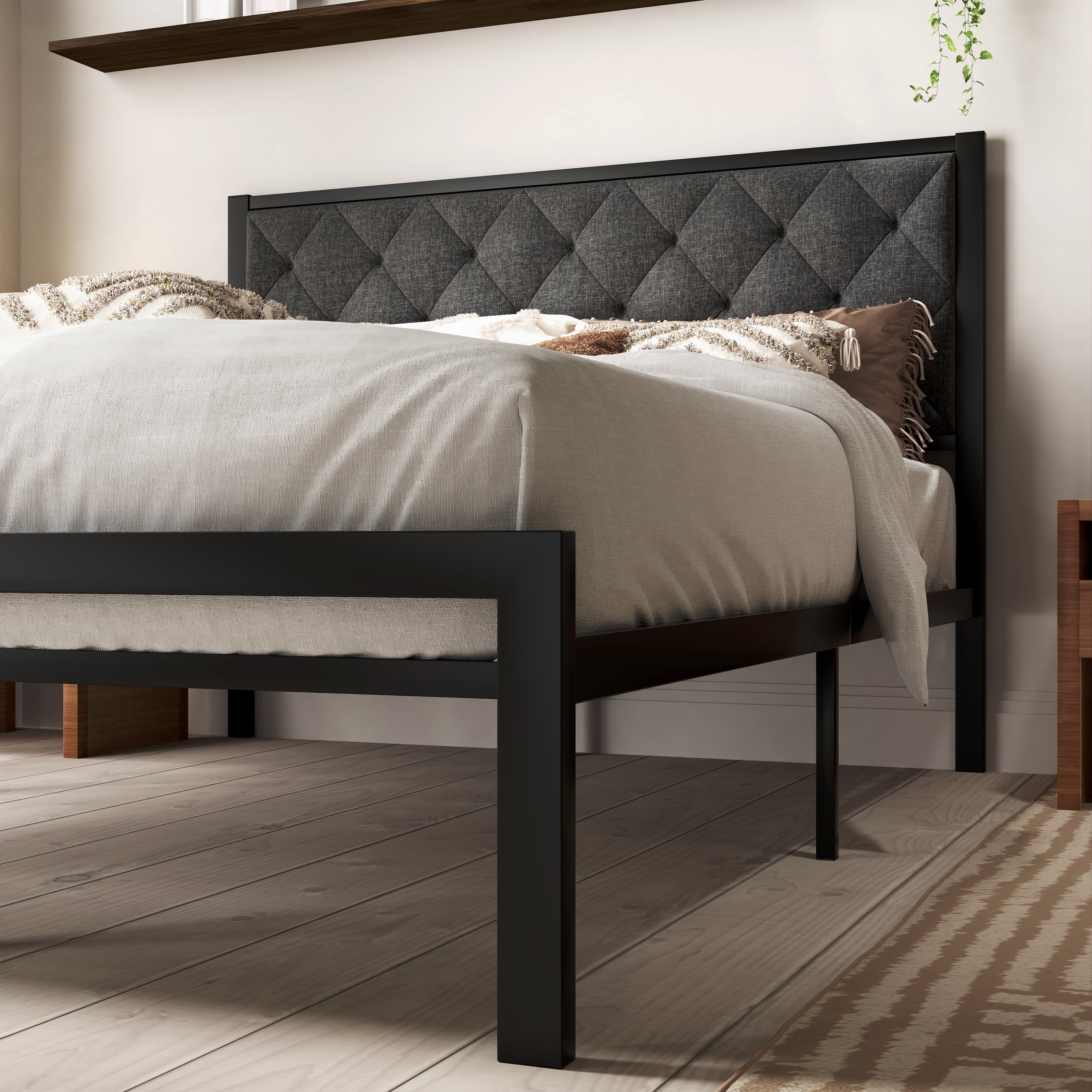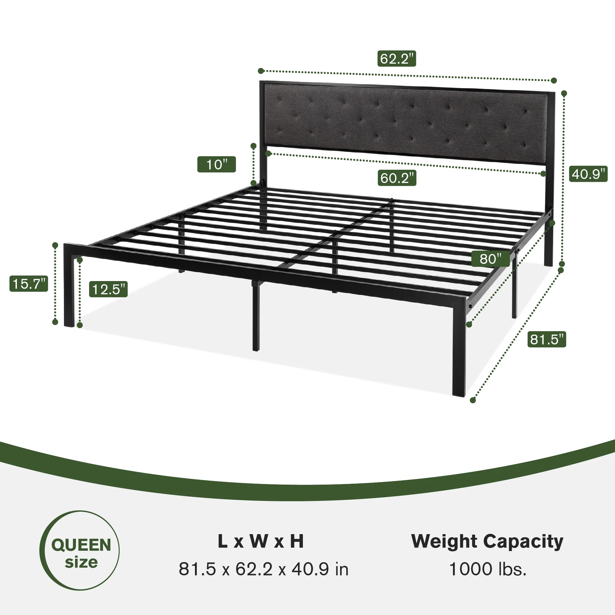 Sha Cerlin Queen Size Metal Platform Bed Frame with Tufted Headboard & Underbed Storage, Dark Gray