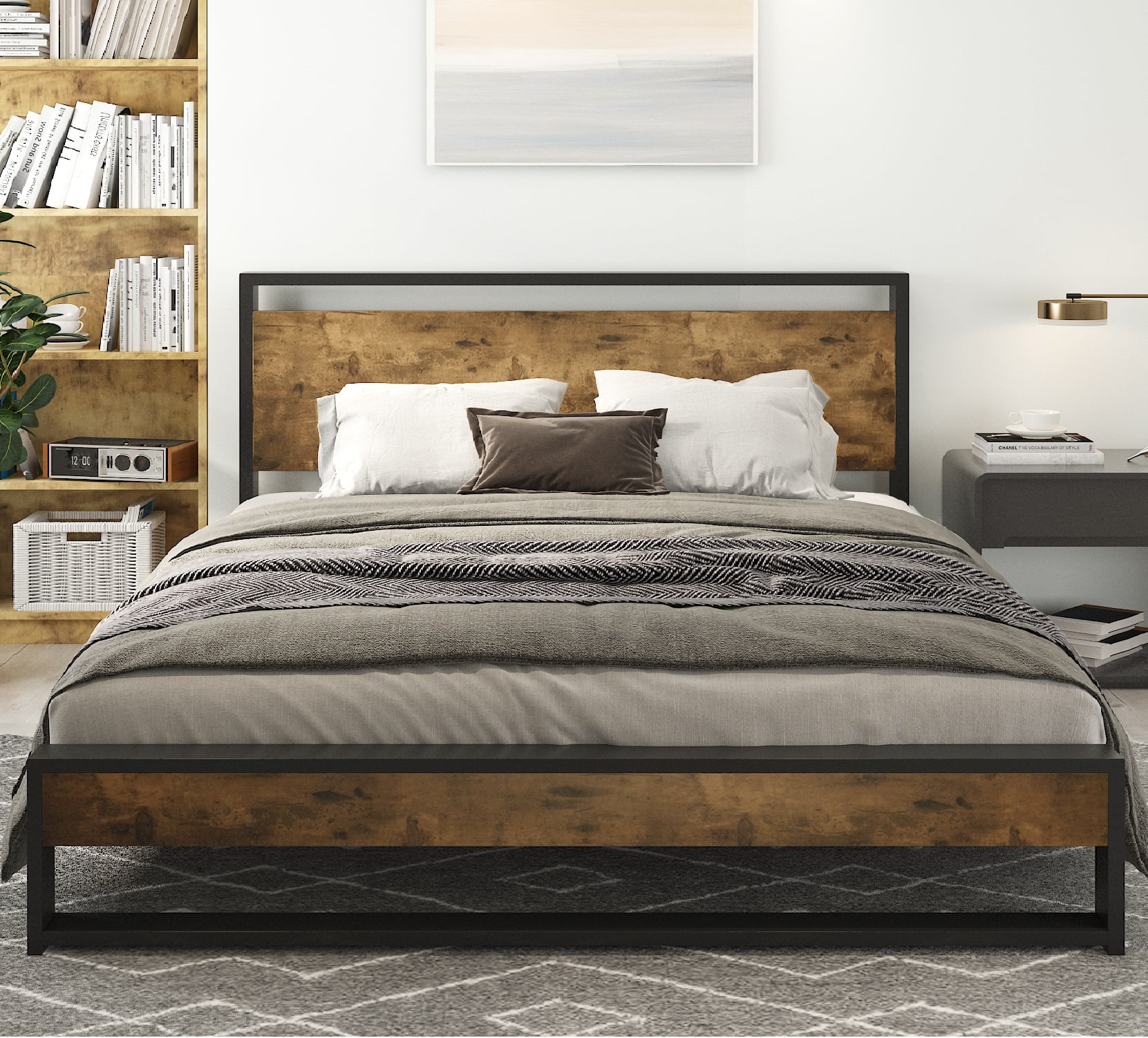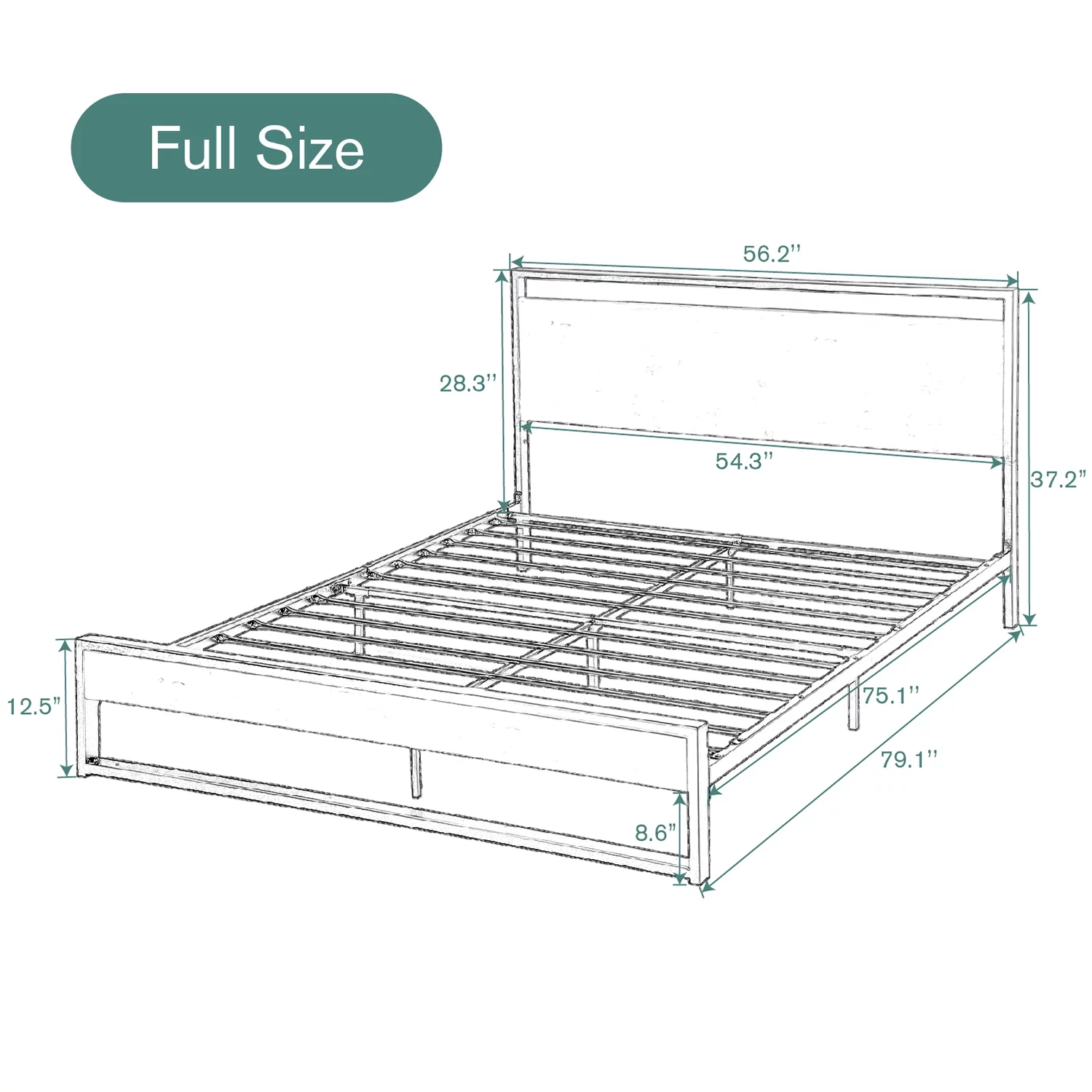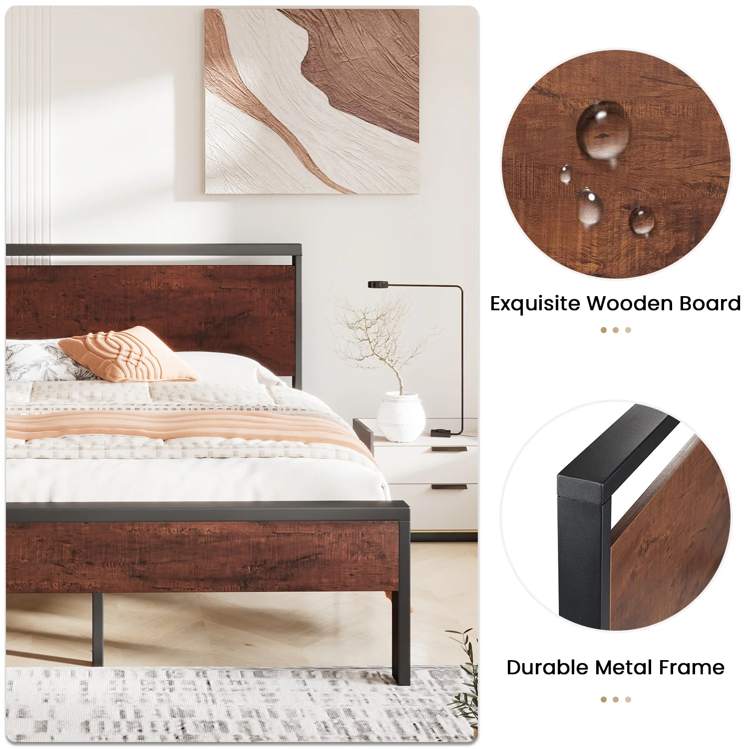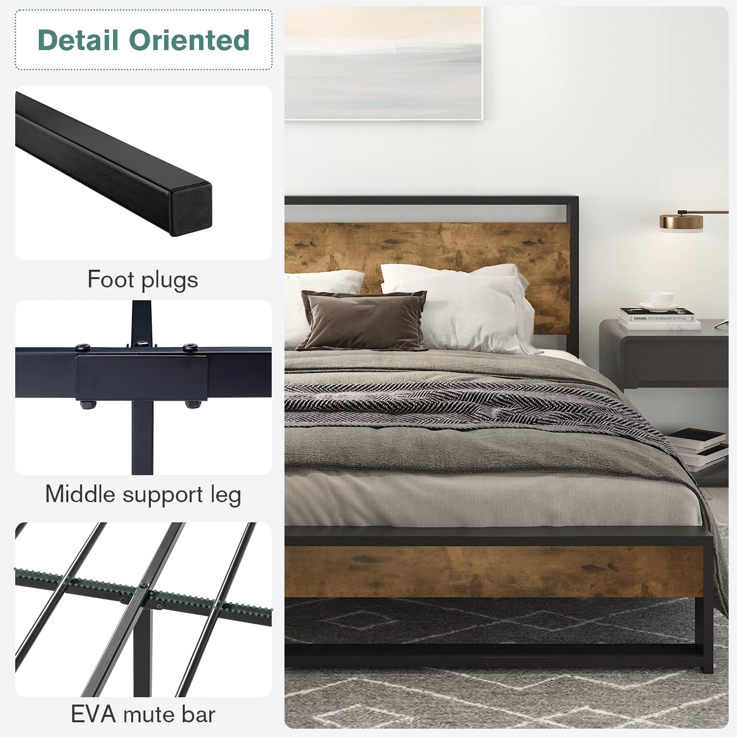 Allewie Brown Full Size Metal Platform Bed with Wooden Headboard & No Box Spring Needed