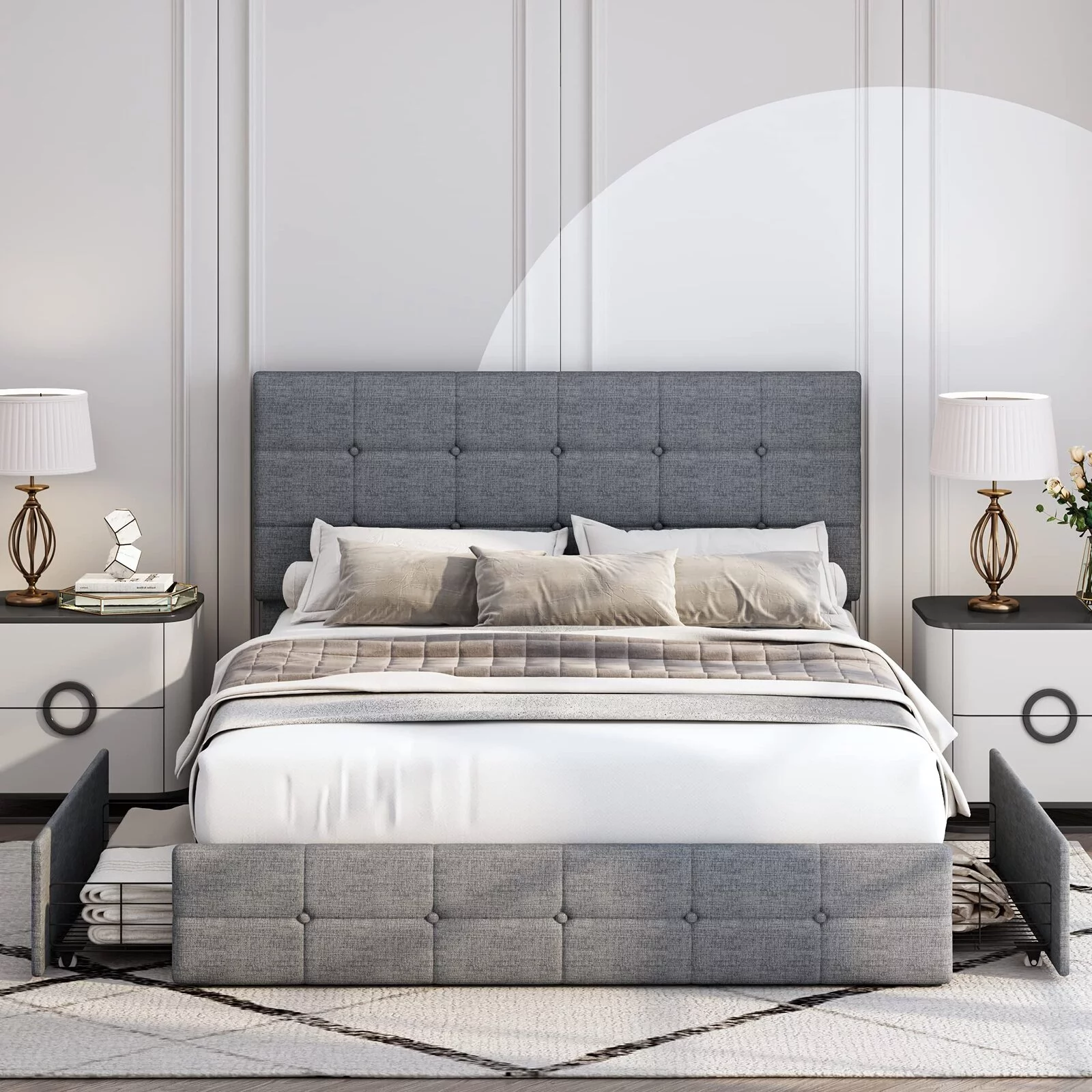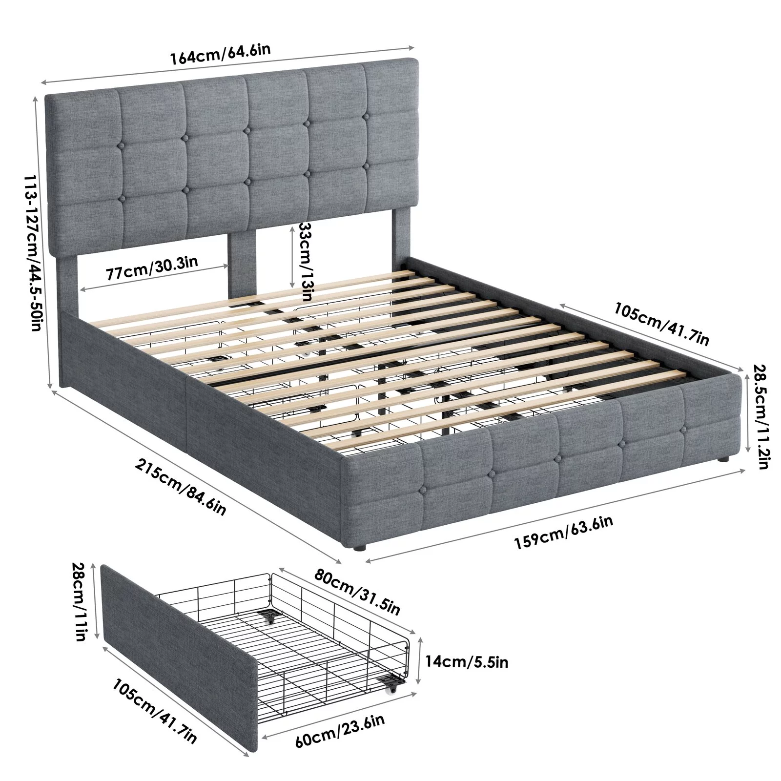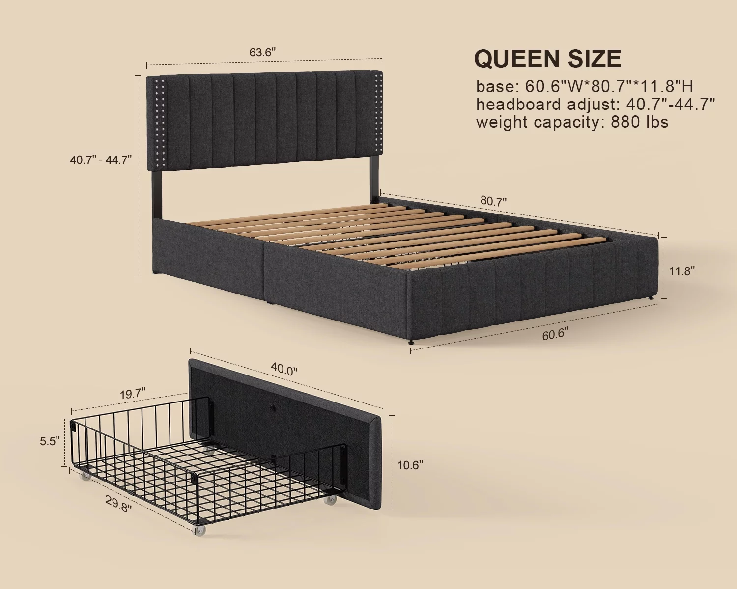 Lofka Queen Bed Frame with Adjustable Headboard and 4 Storage Drawers, 880lbs No Box Spring Dark Gray