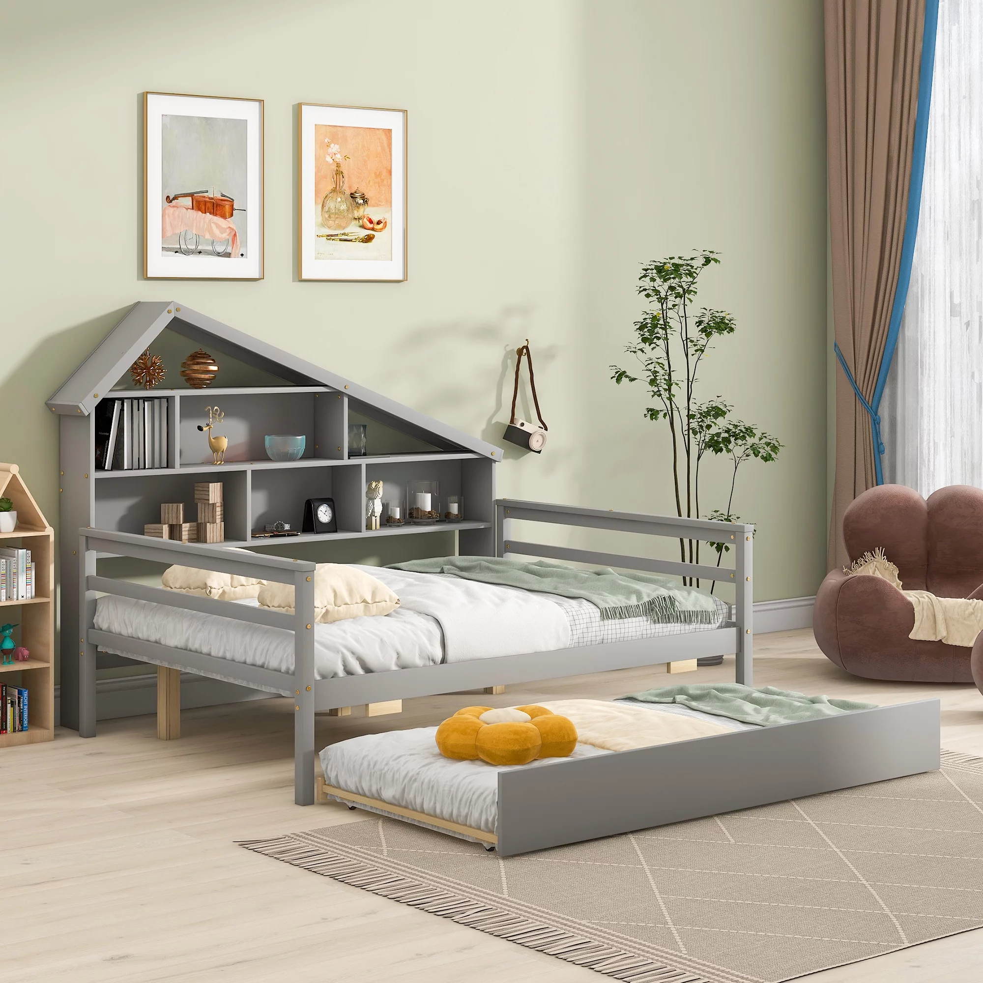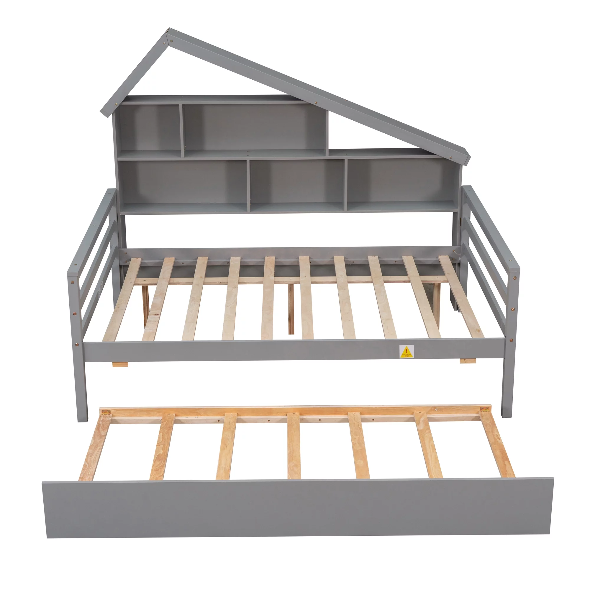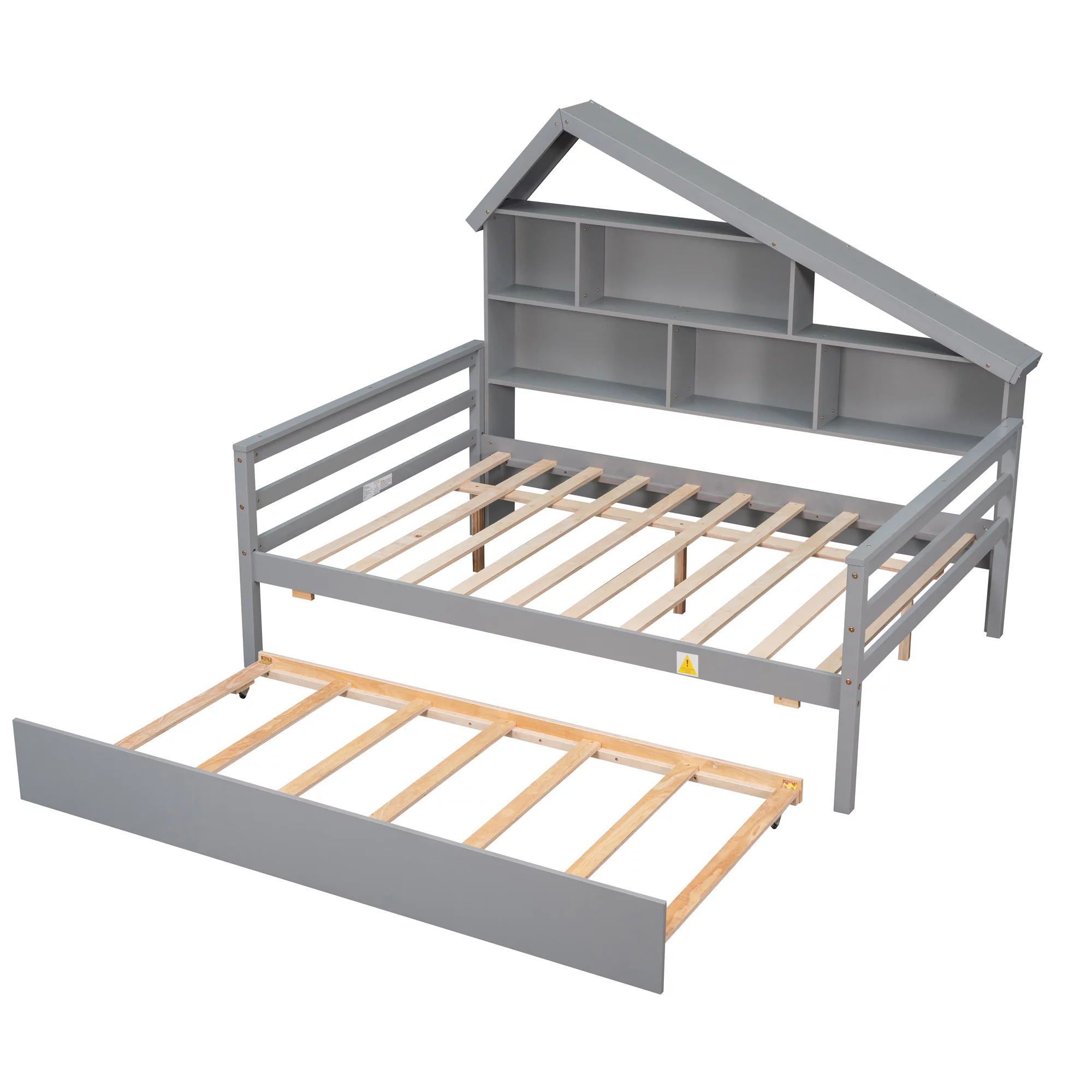 Euroco Wood Full Size House Daybed with Storage Shelf and Trundle for Bedroom, Gray
