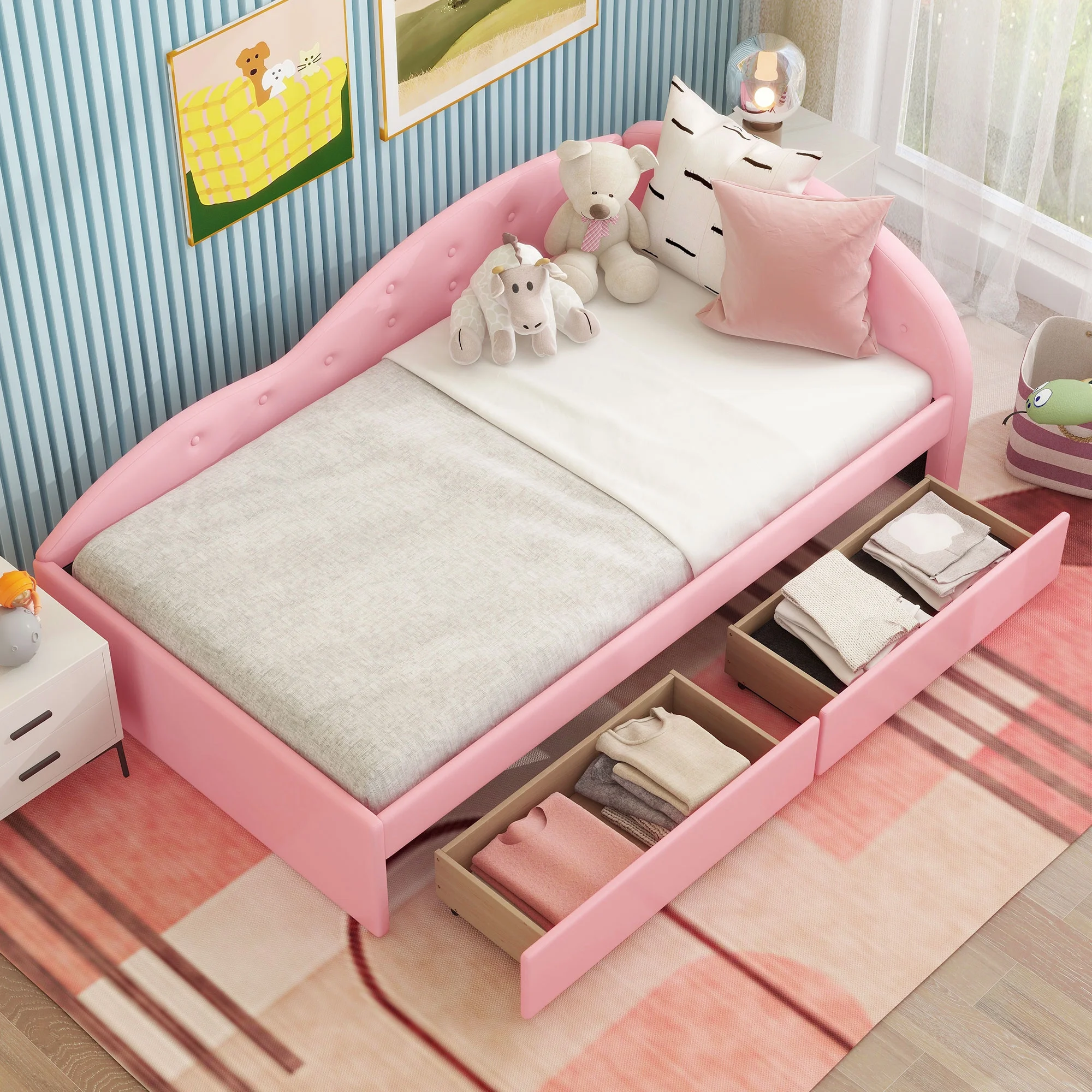 Euroco Twin Size PU Upholstery Daybed, Tufted Sofa Bed with 2 Drawers for Kids Room, Pink