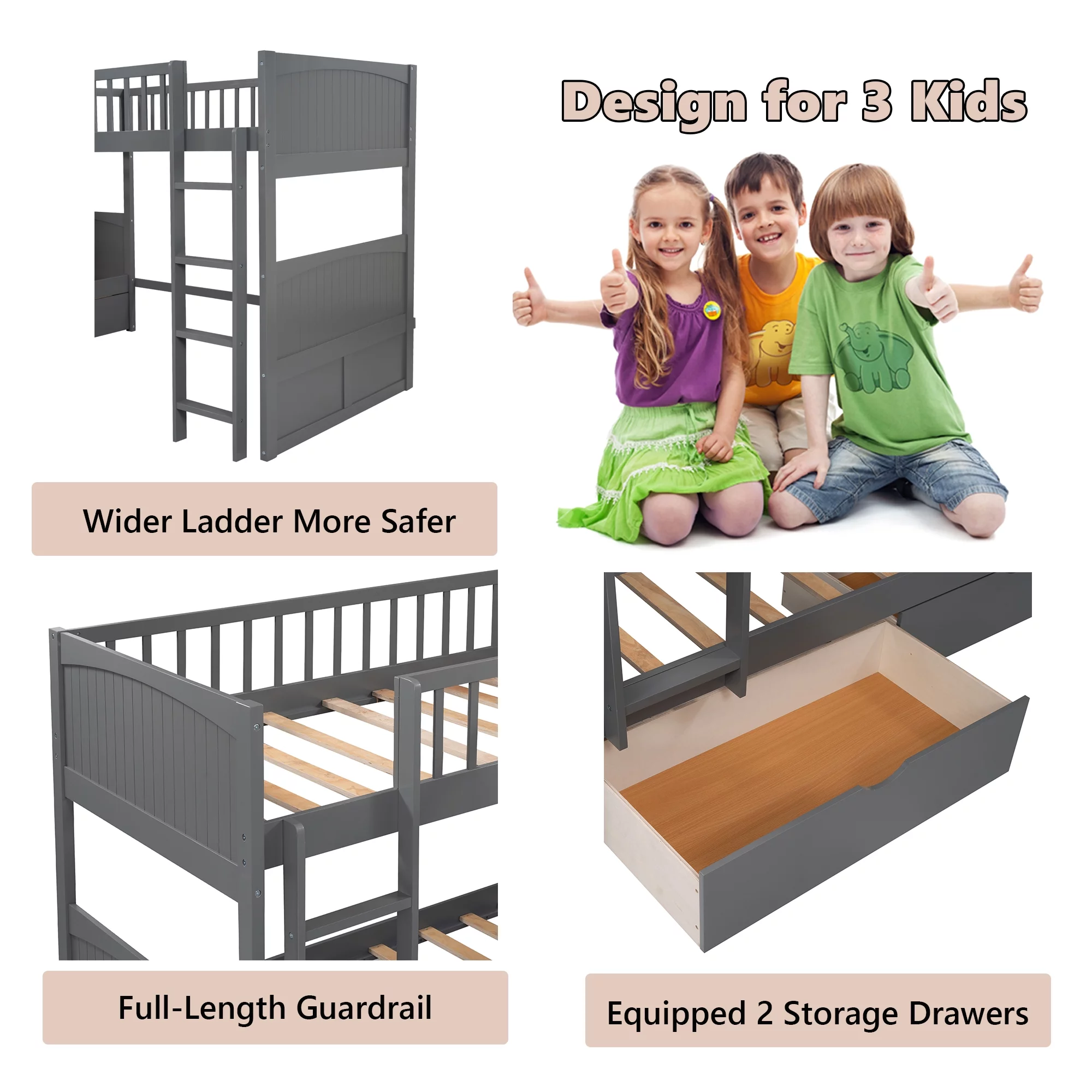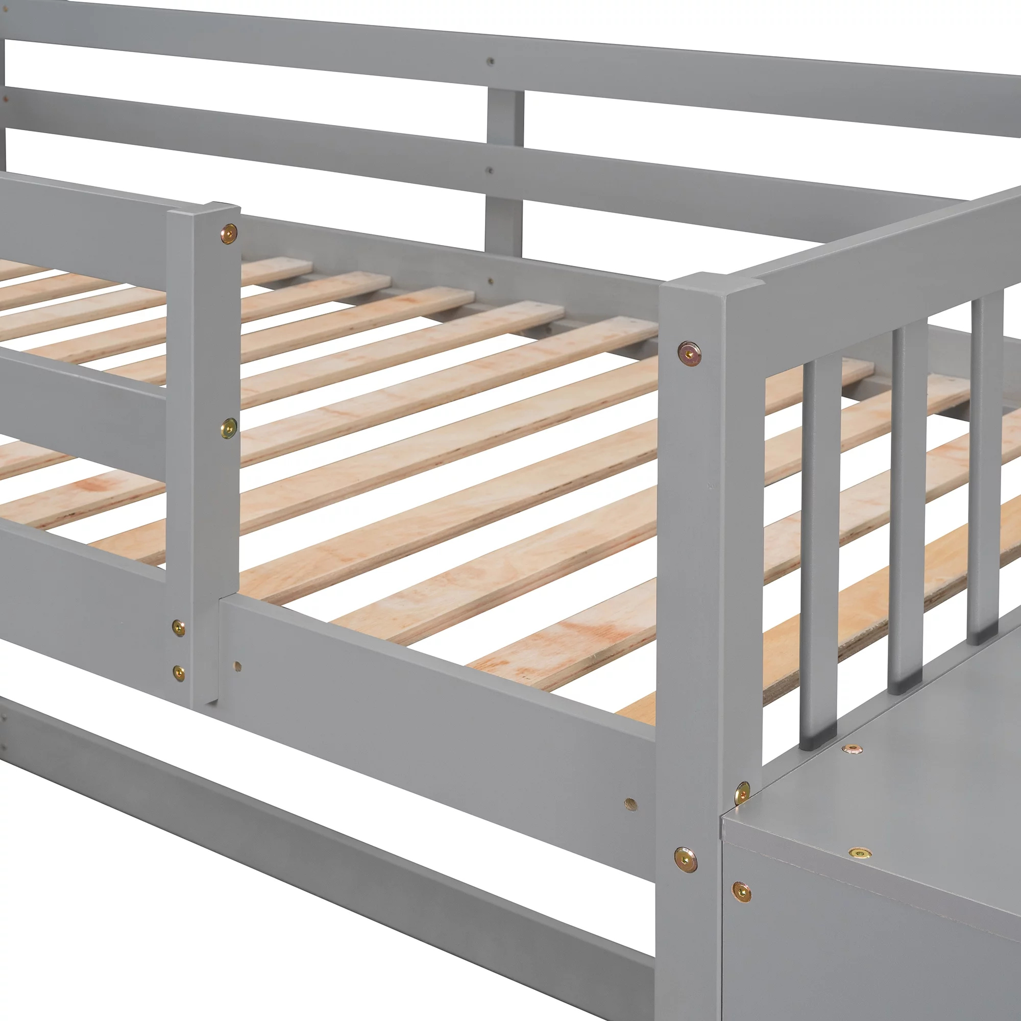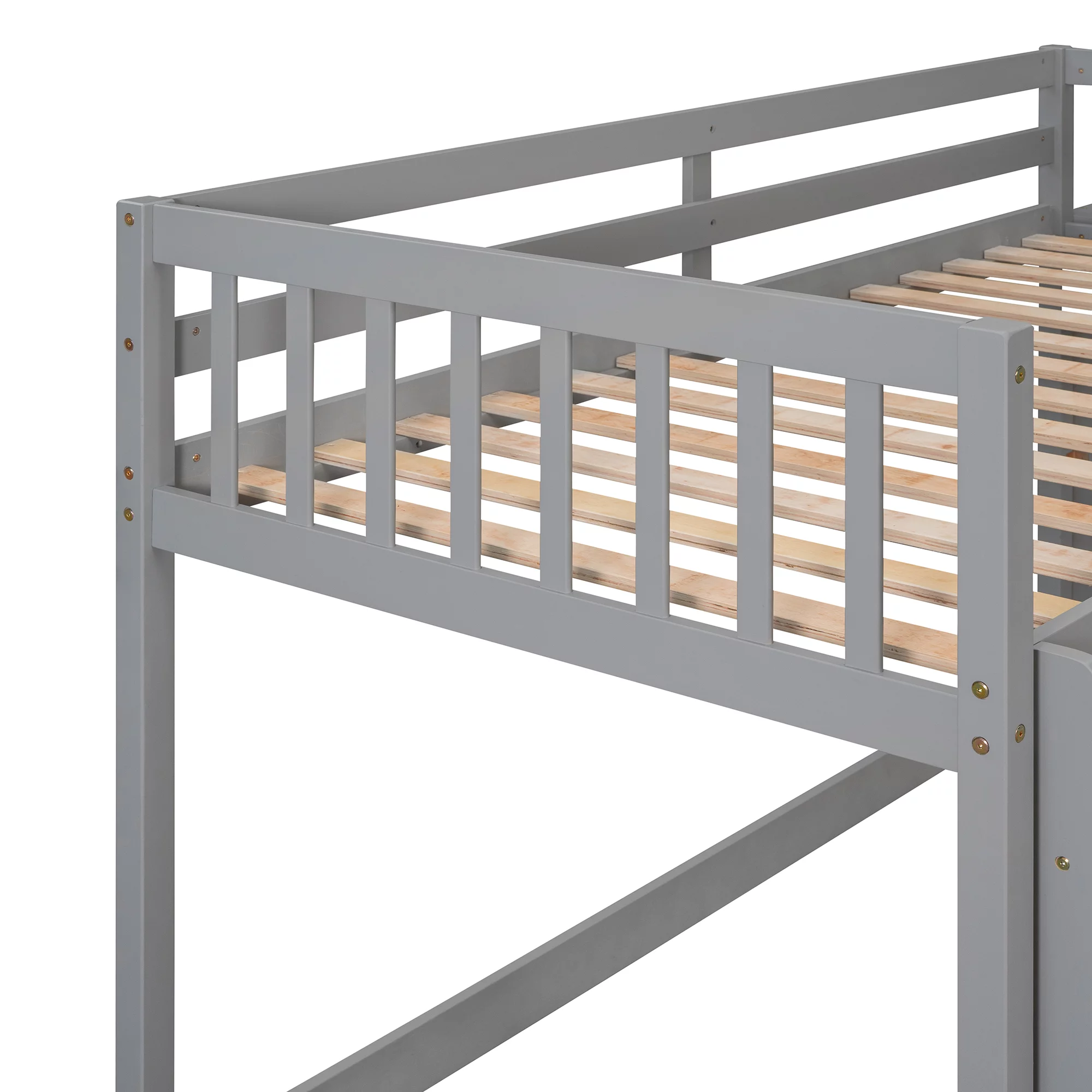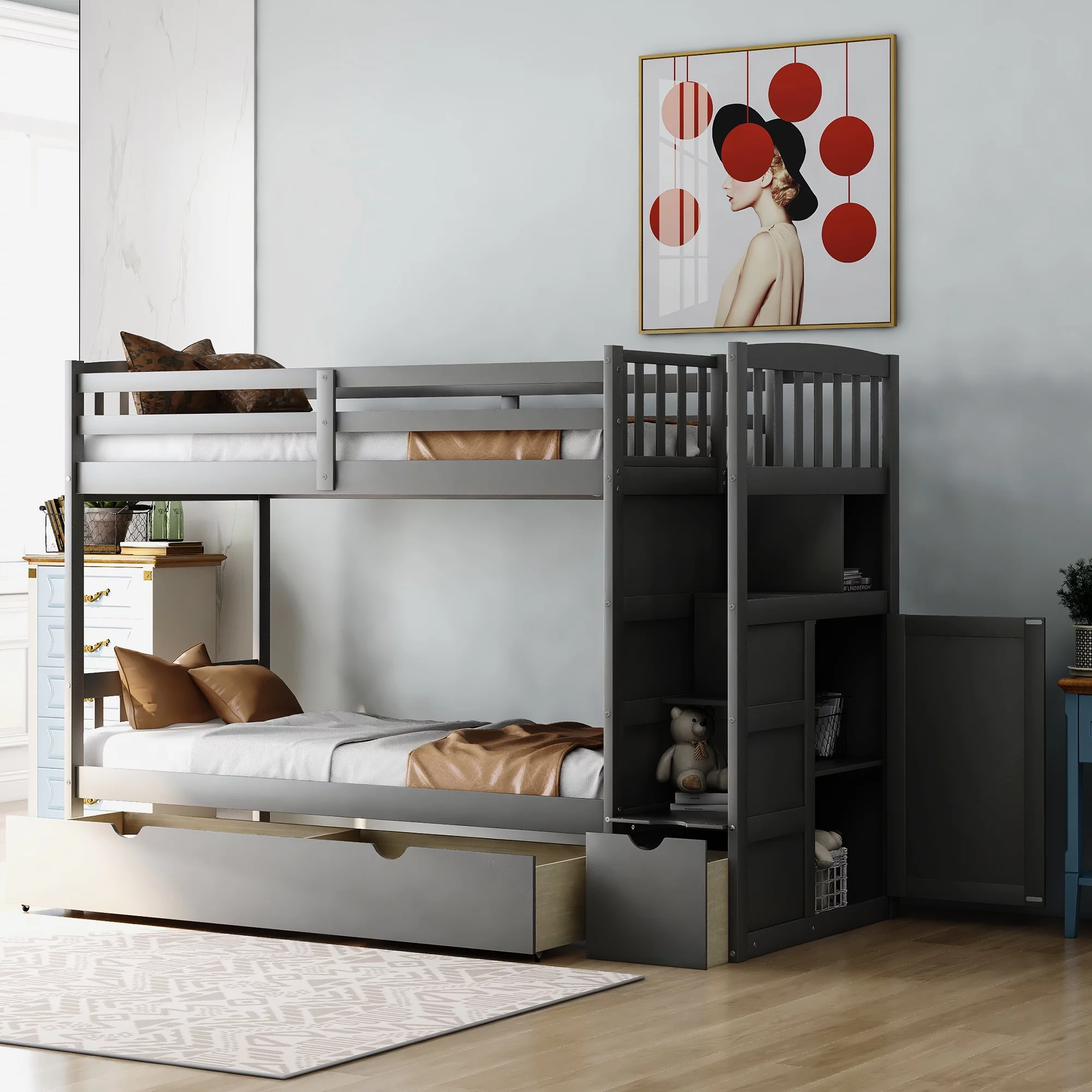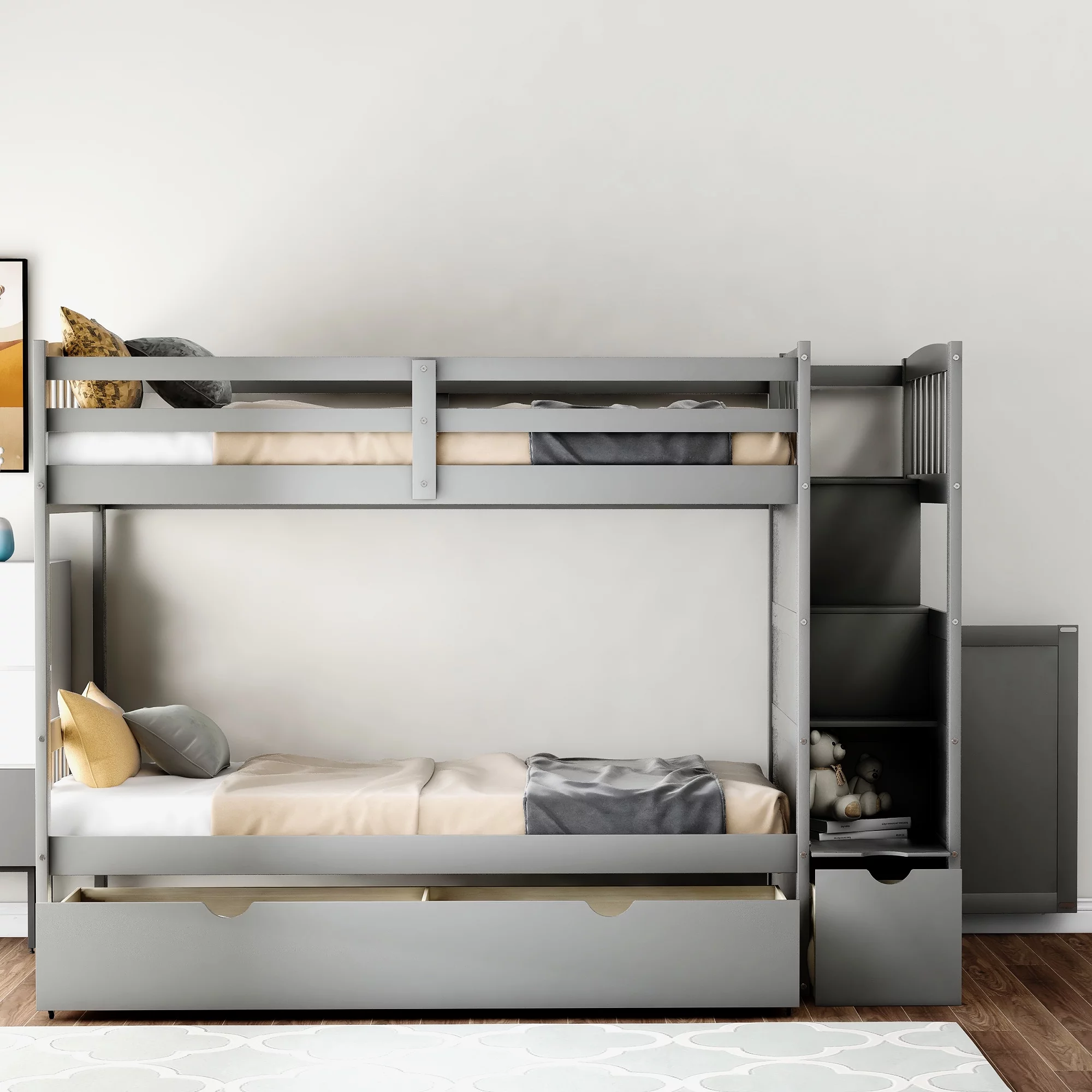 Euroco Wood Twin over Full Bunk Bed with 2 Drawers and Slide, Storage Staircase for Bedroom, Gray