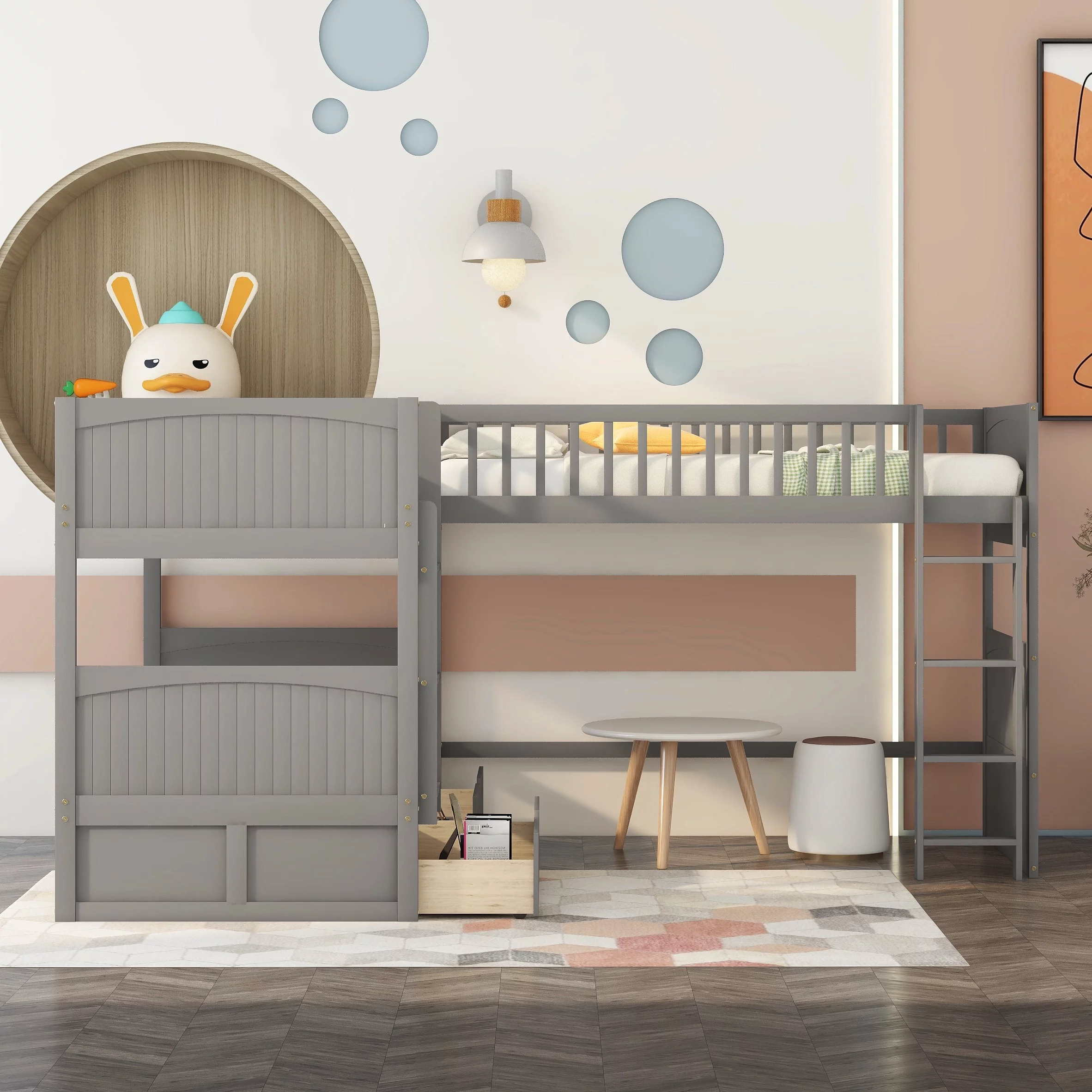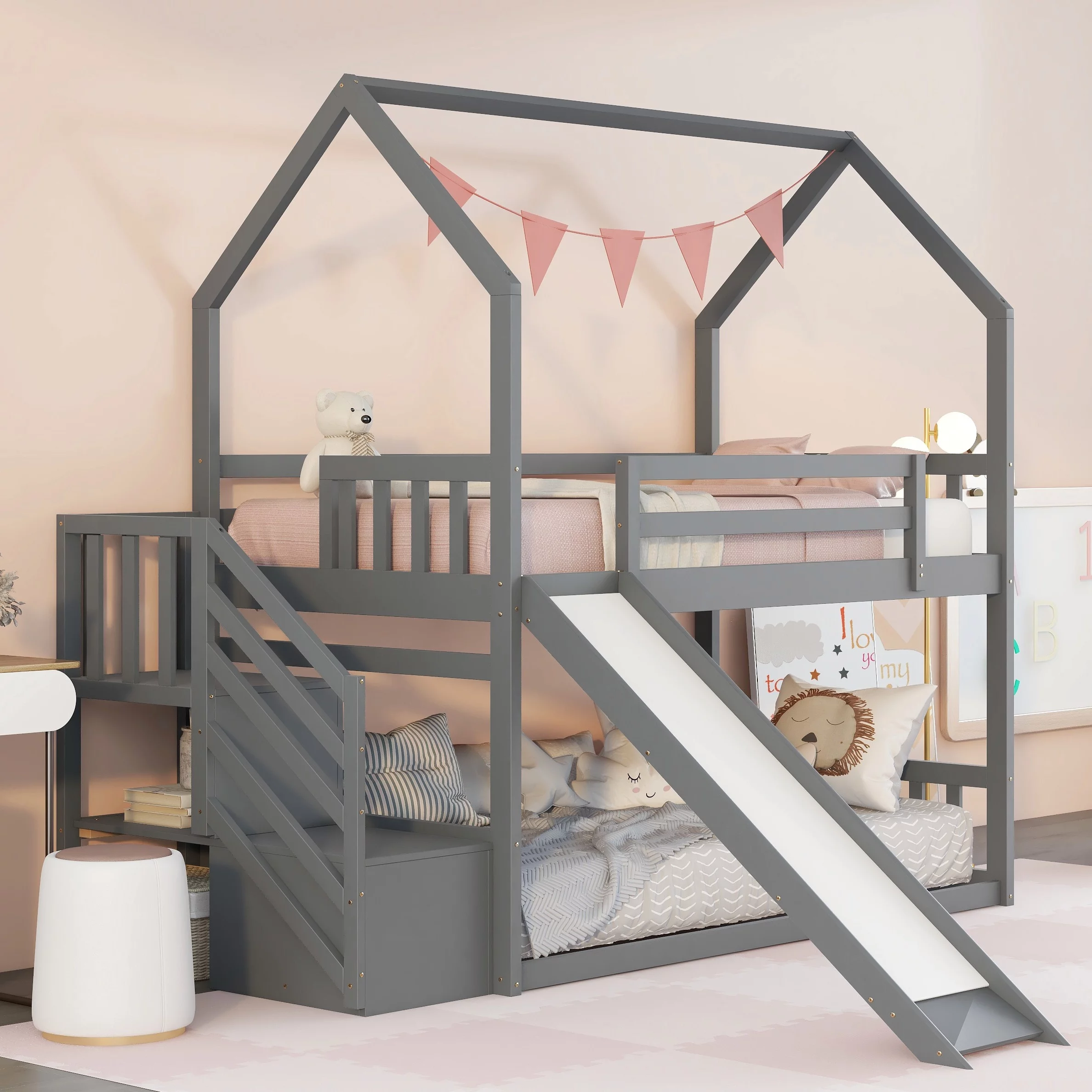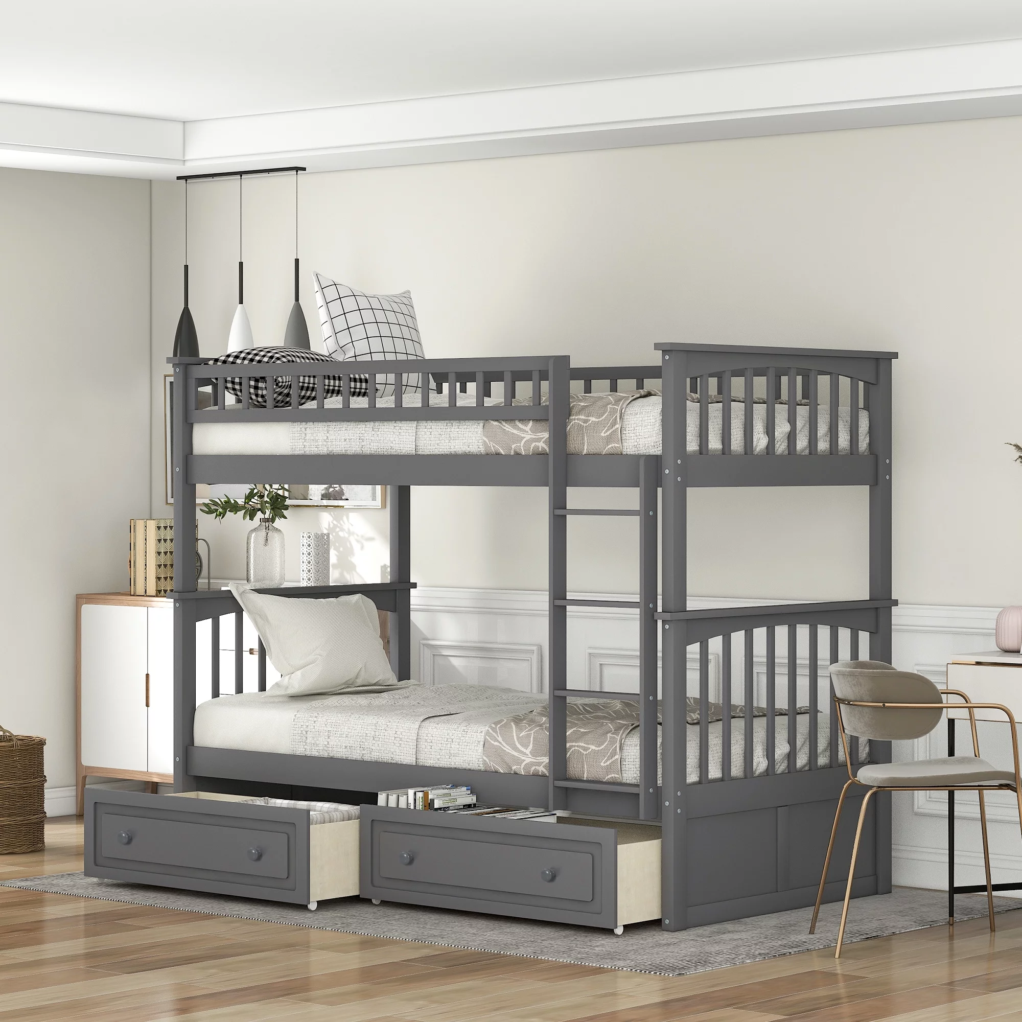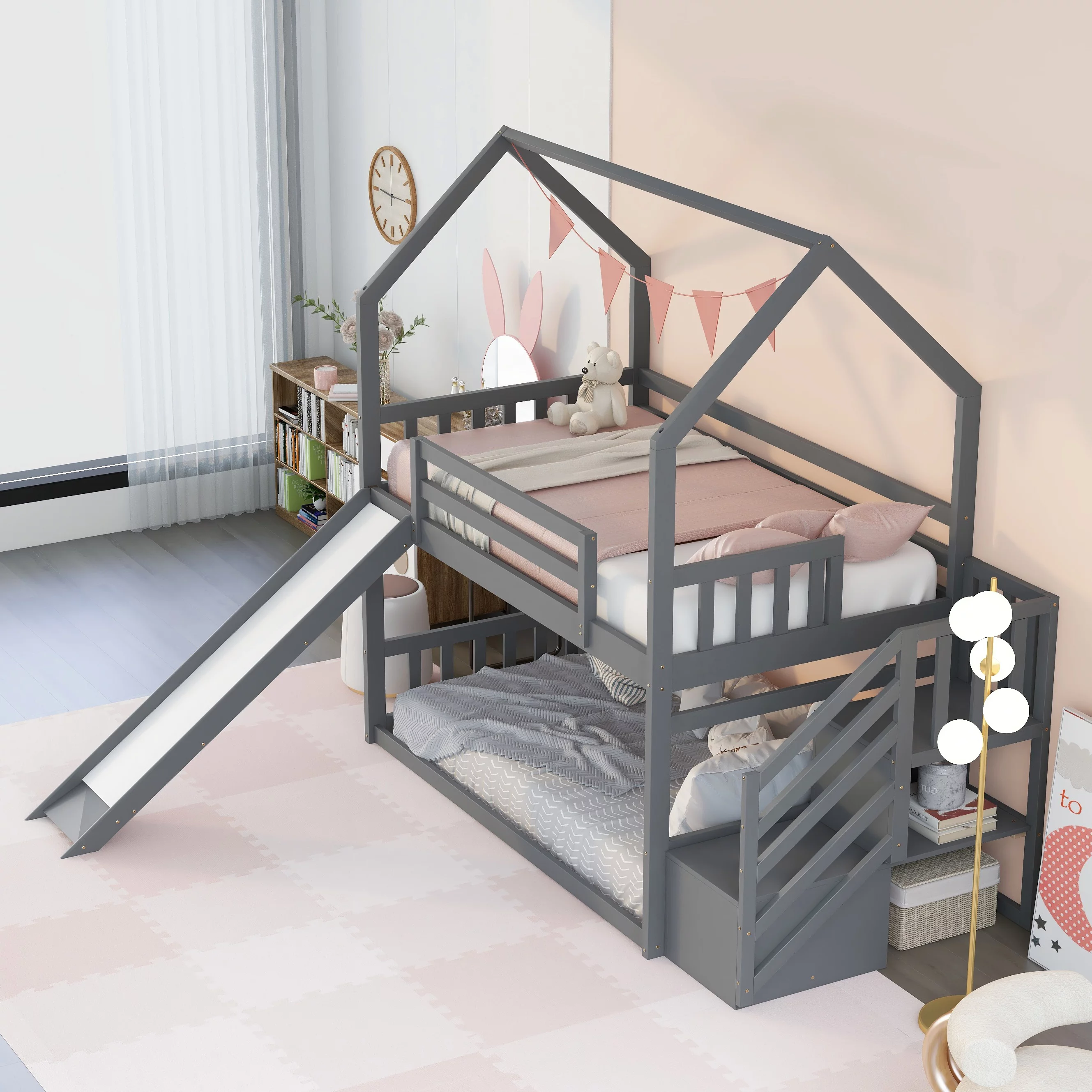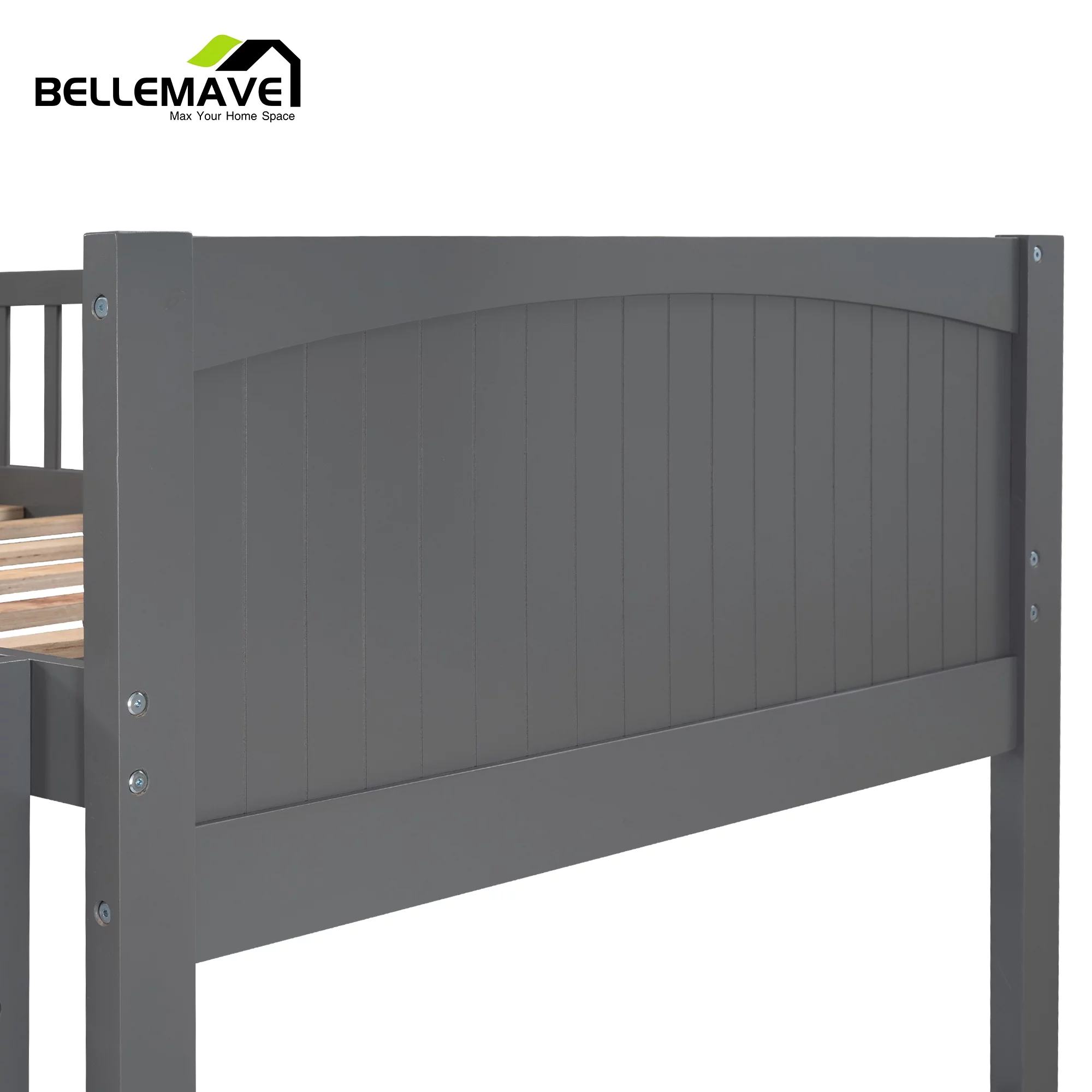 Euroco Wood Twin over Full Bunk Bed with 2 Drawers and Slide, Storage Staircase for Bedroom, Gray