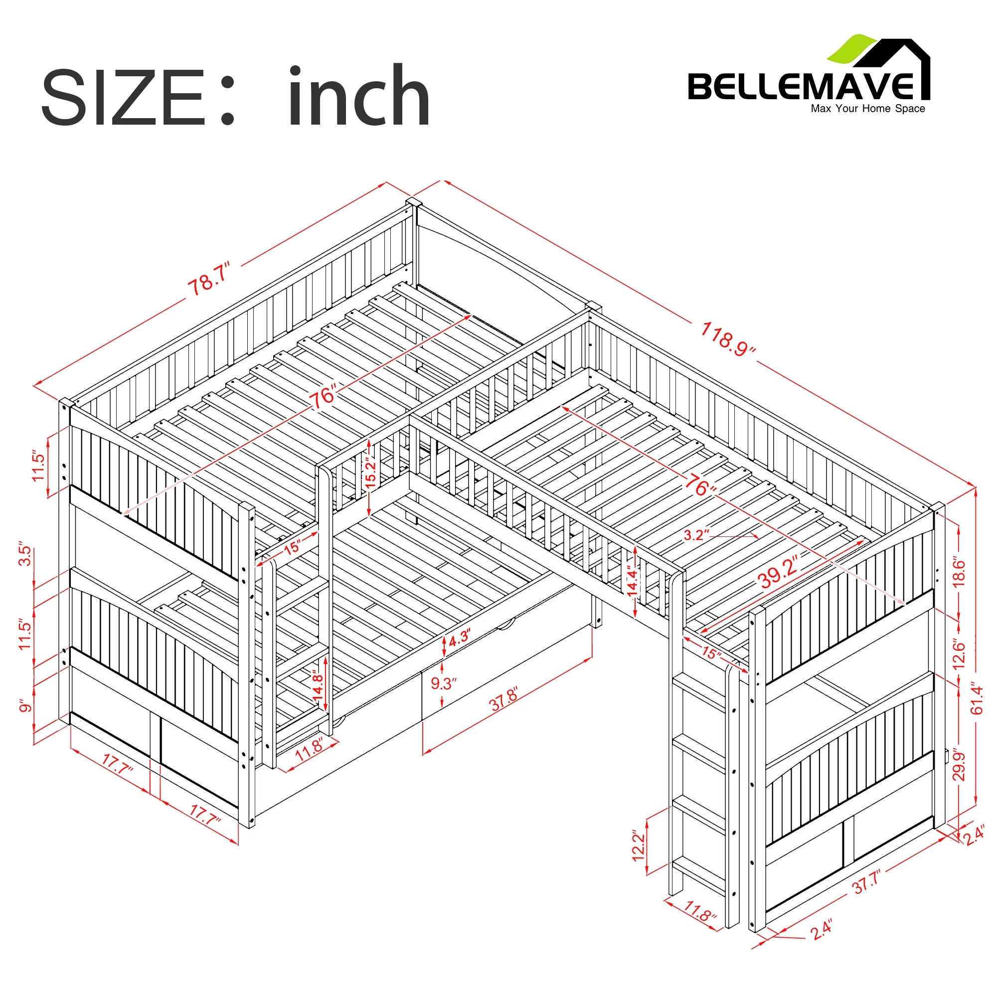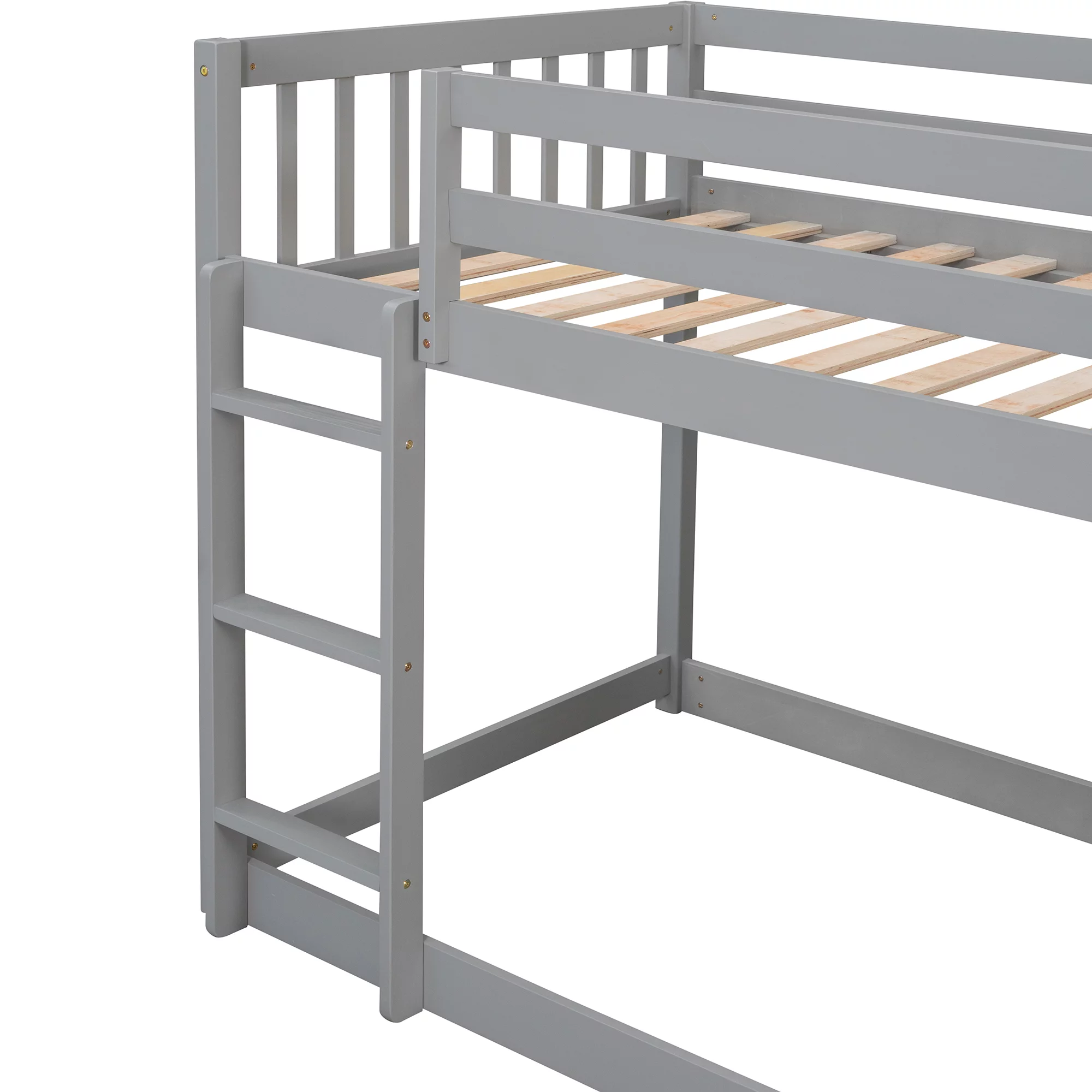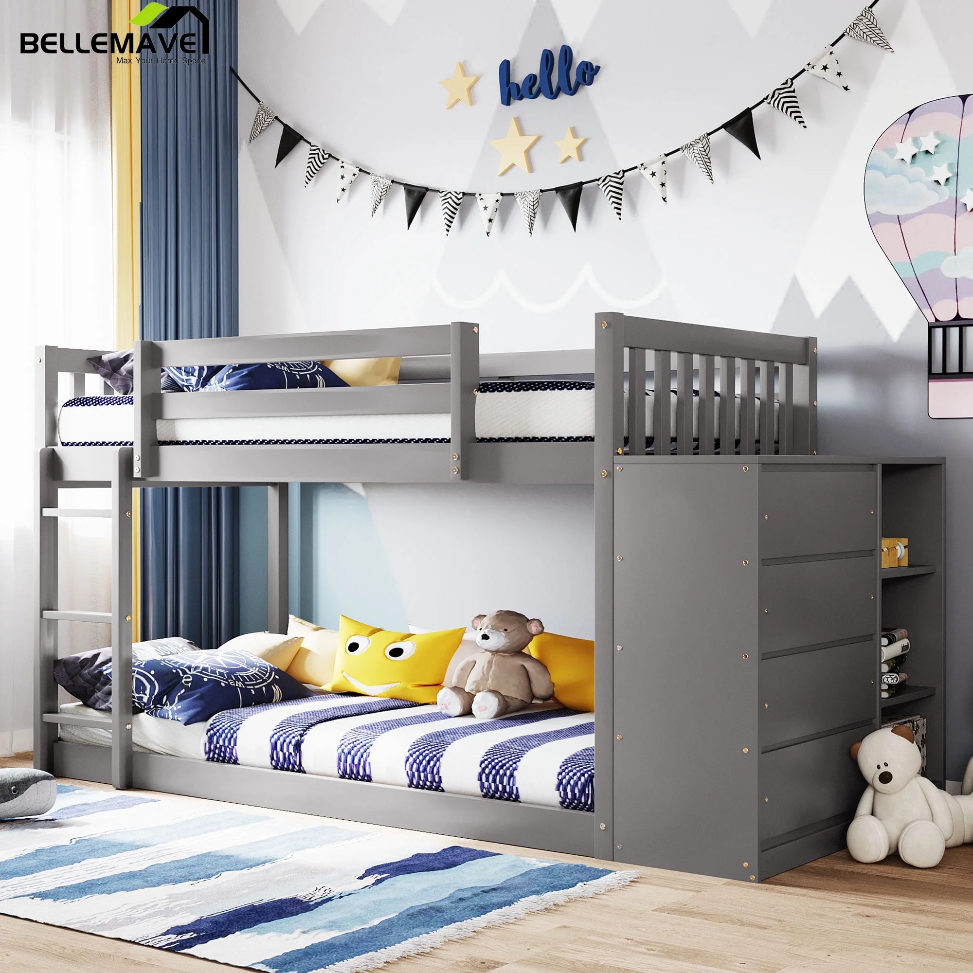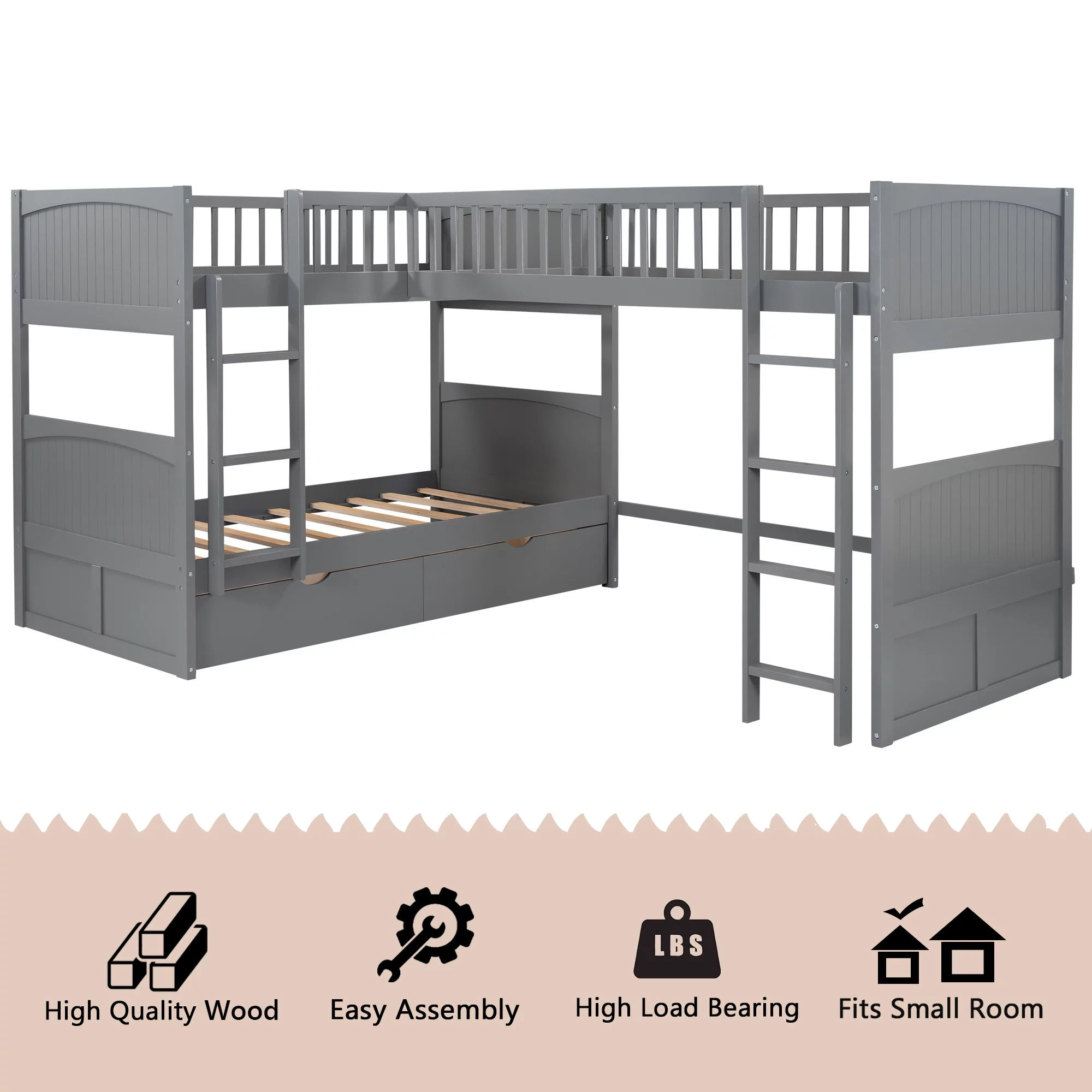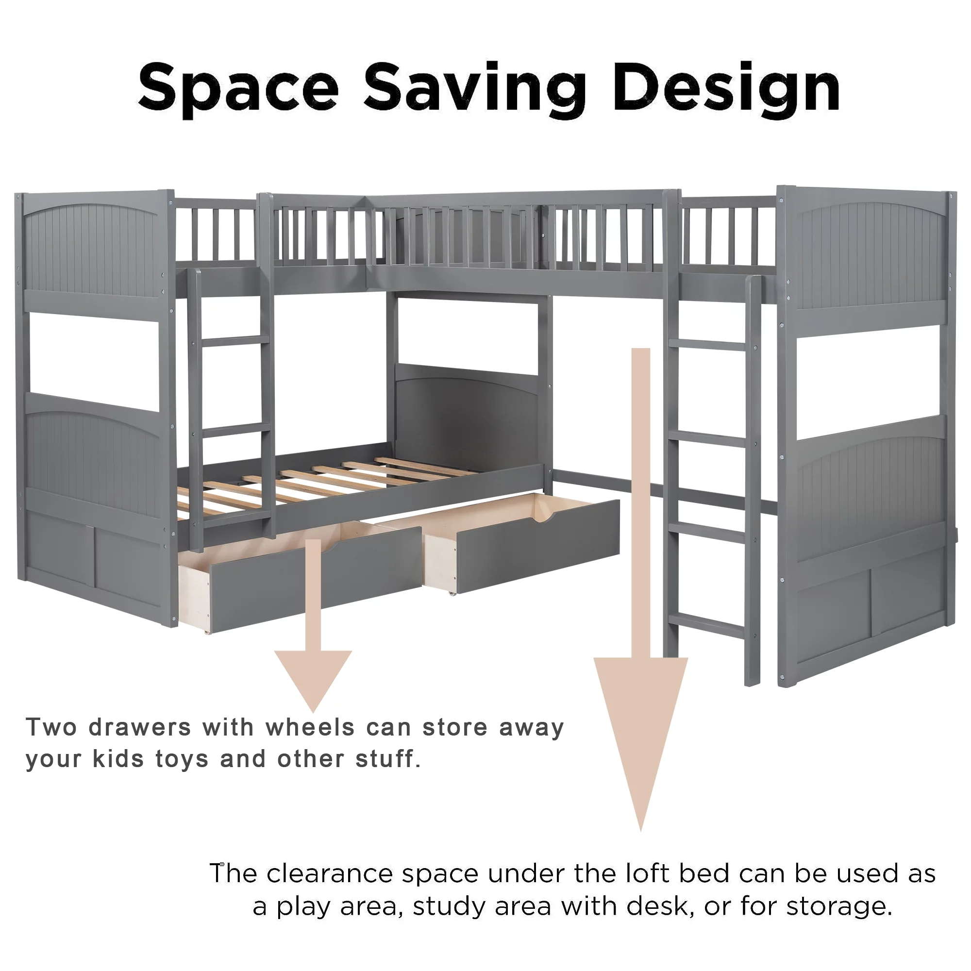 Euroco Wood Twin over Full Bunk Bed with 2 Drawers and Slide, Storage Staircase for Bedroom, Gray