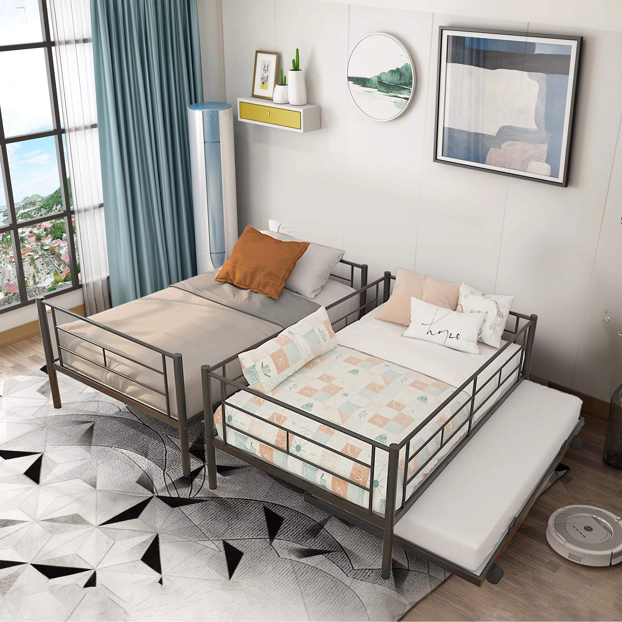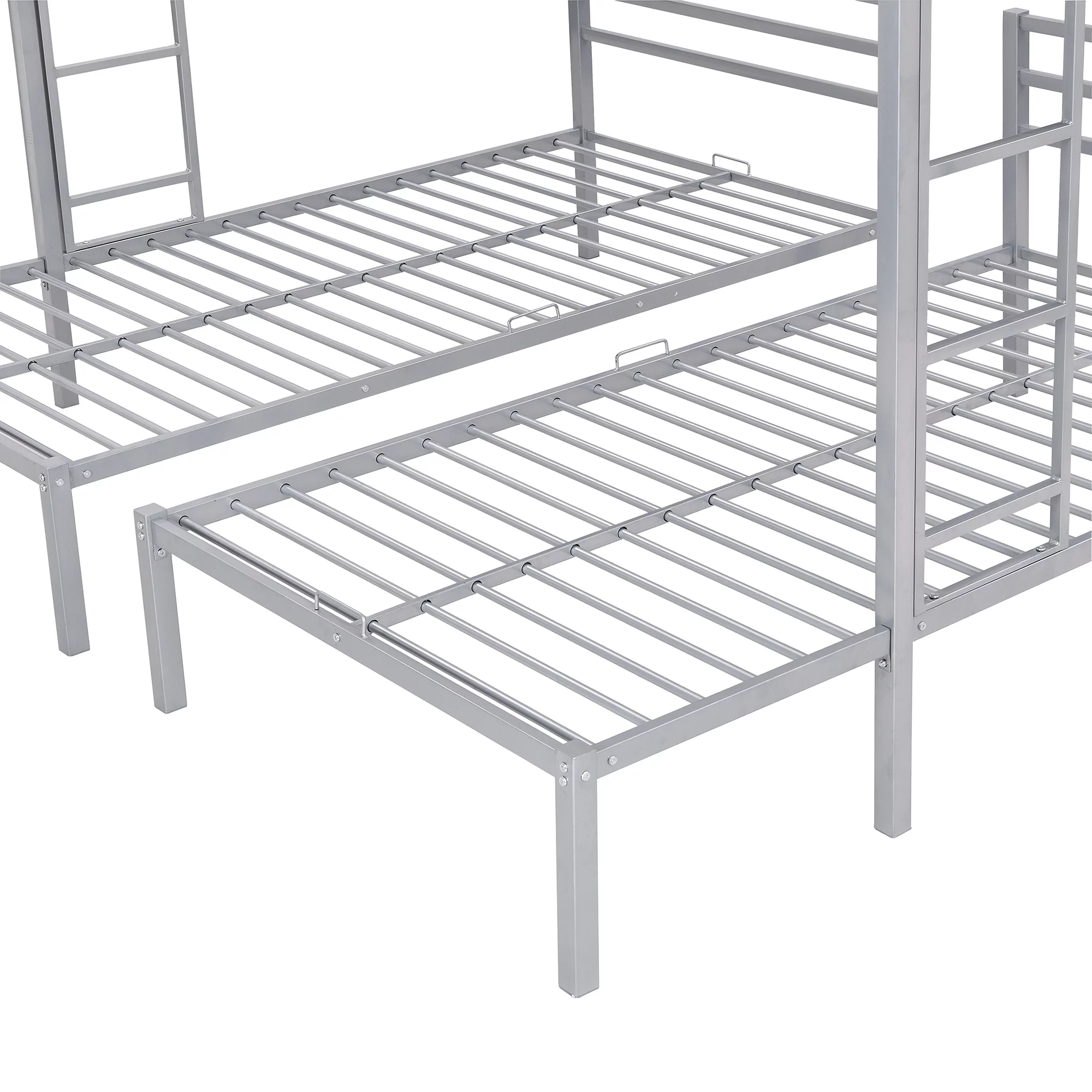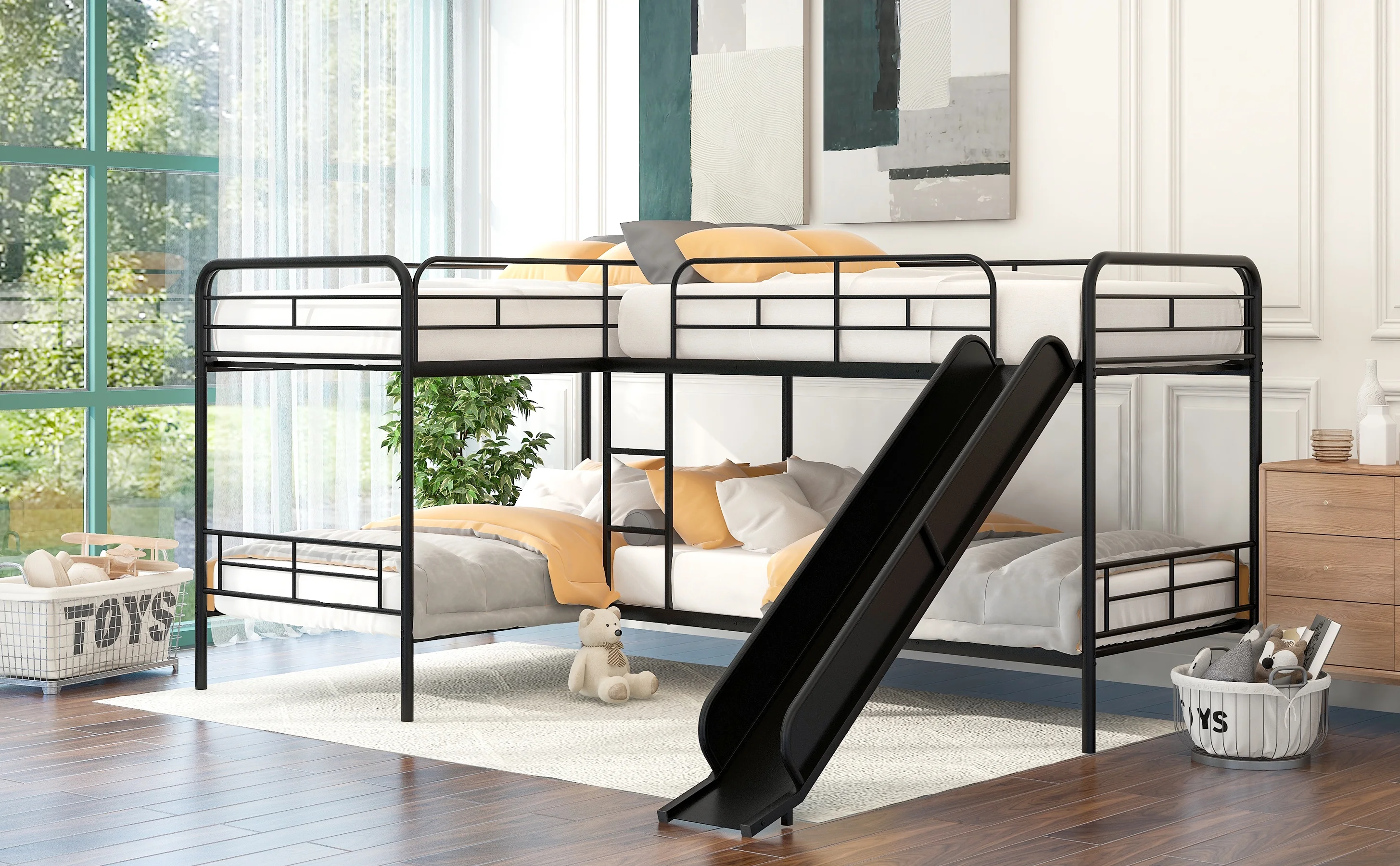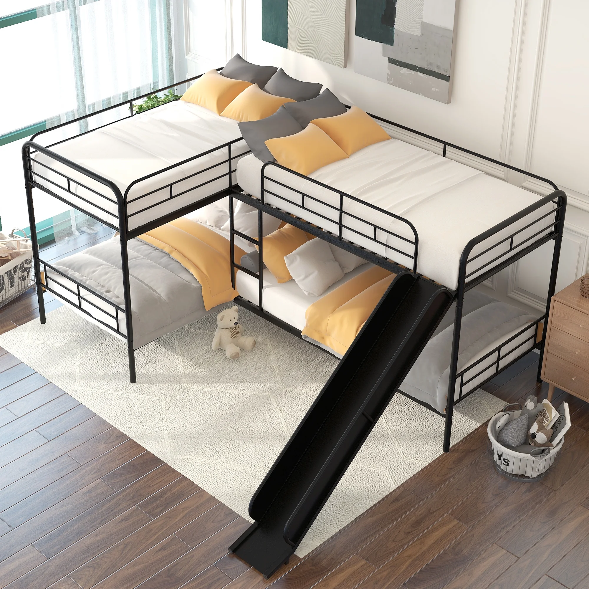 Euroco Modern Metal Twin L-Shaped Quadruple Bunk Bed for Kids Bedroom, 4-in-1 Beds with Slide, 4 Twin Beds, Black