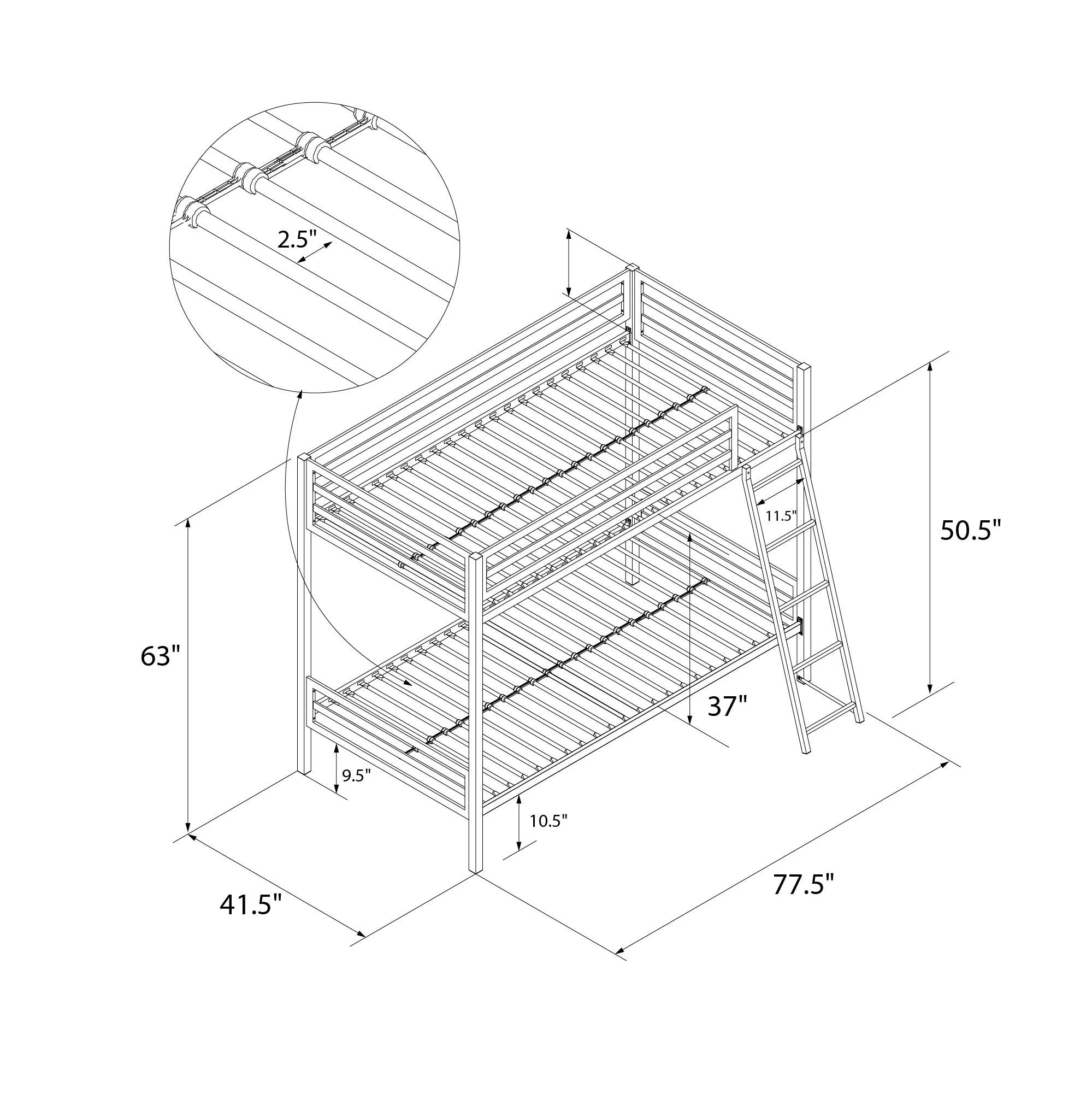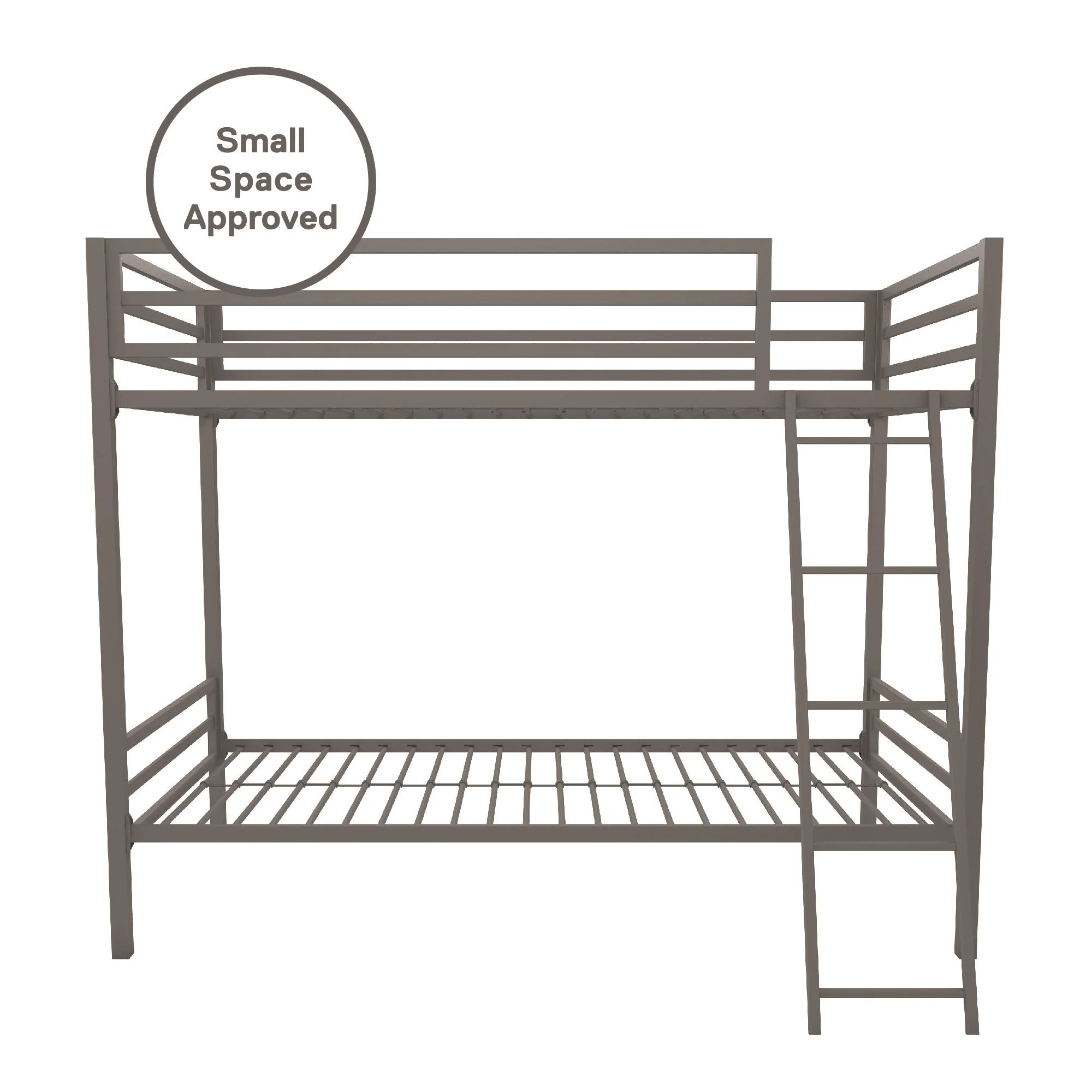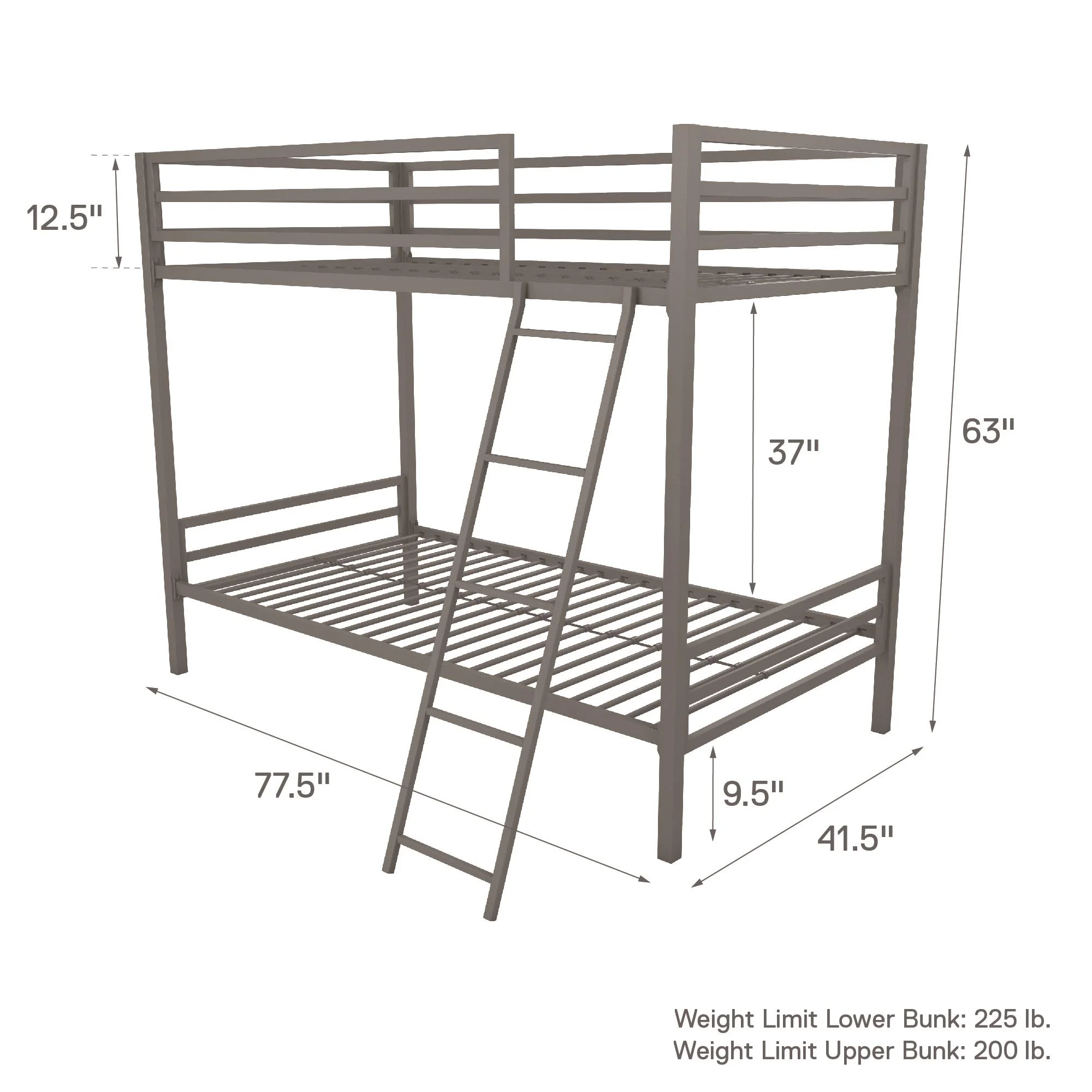 Novogratz Maxwell Twin-Over-Twin Metal Bunk Bed with Ladder and Guardrails, Easy Assembly, Grey