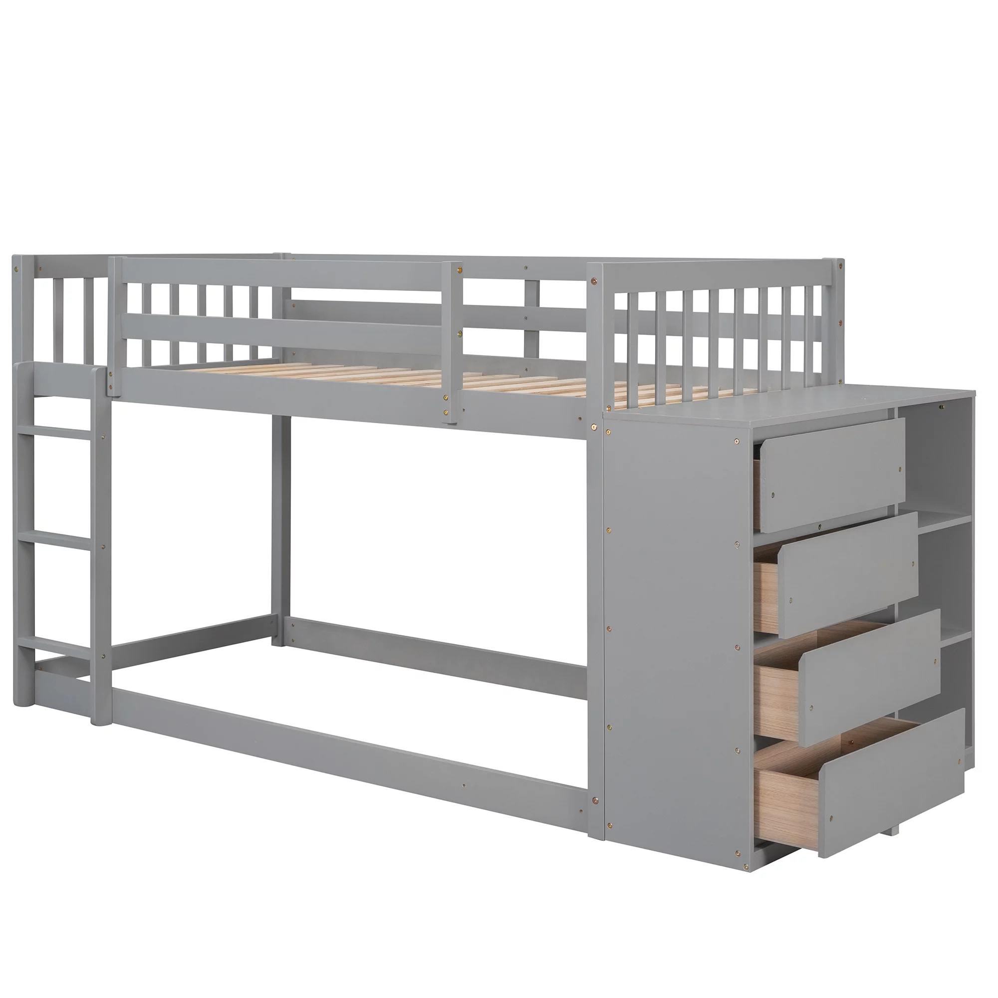 Euroco Wood Twin over Twin Bunk Bed with Desk and Slide, 4 Drawers and Shelf, Bookcase and Storage Staircase for Kids, Gray