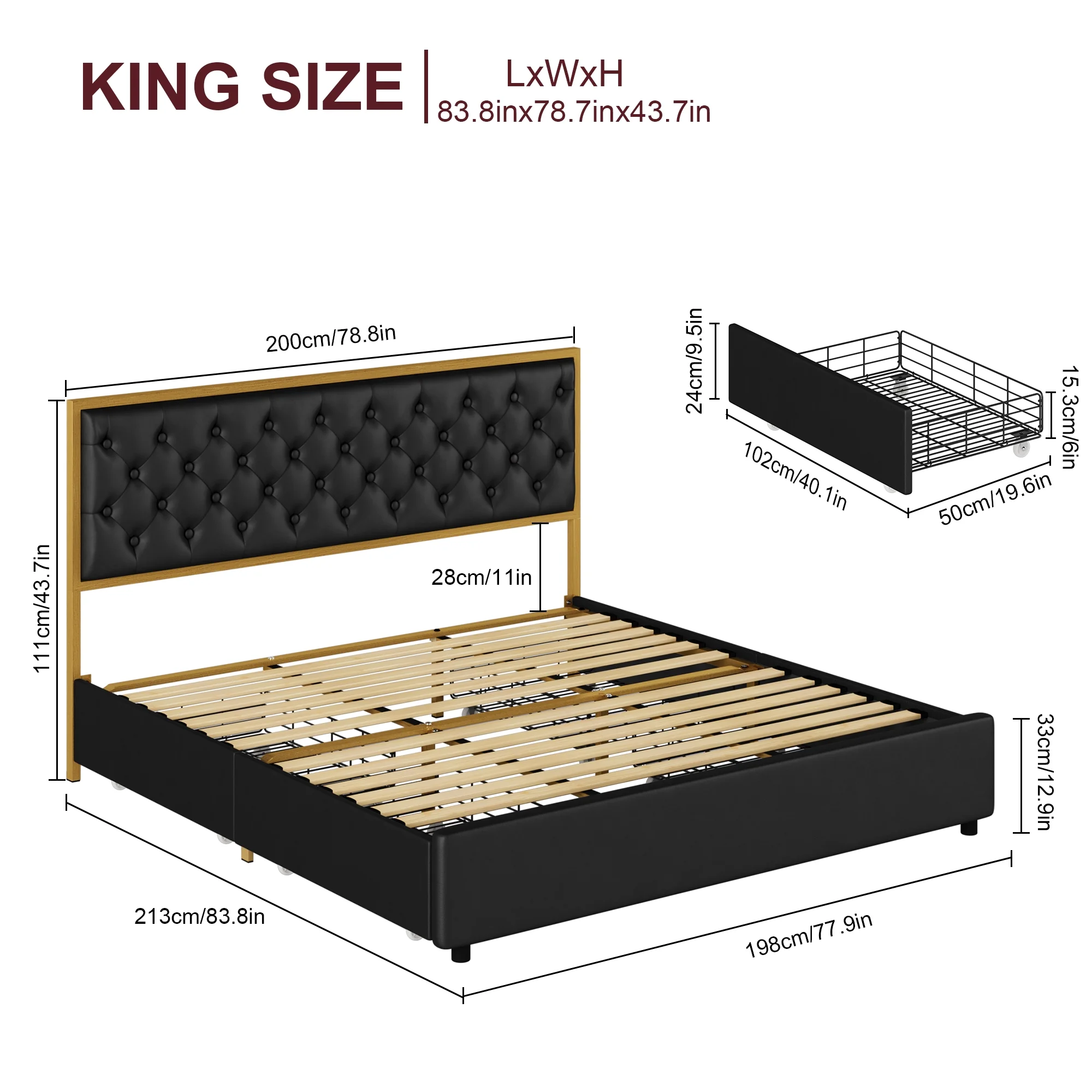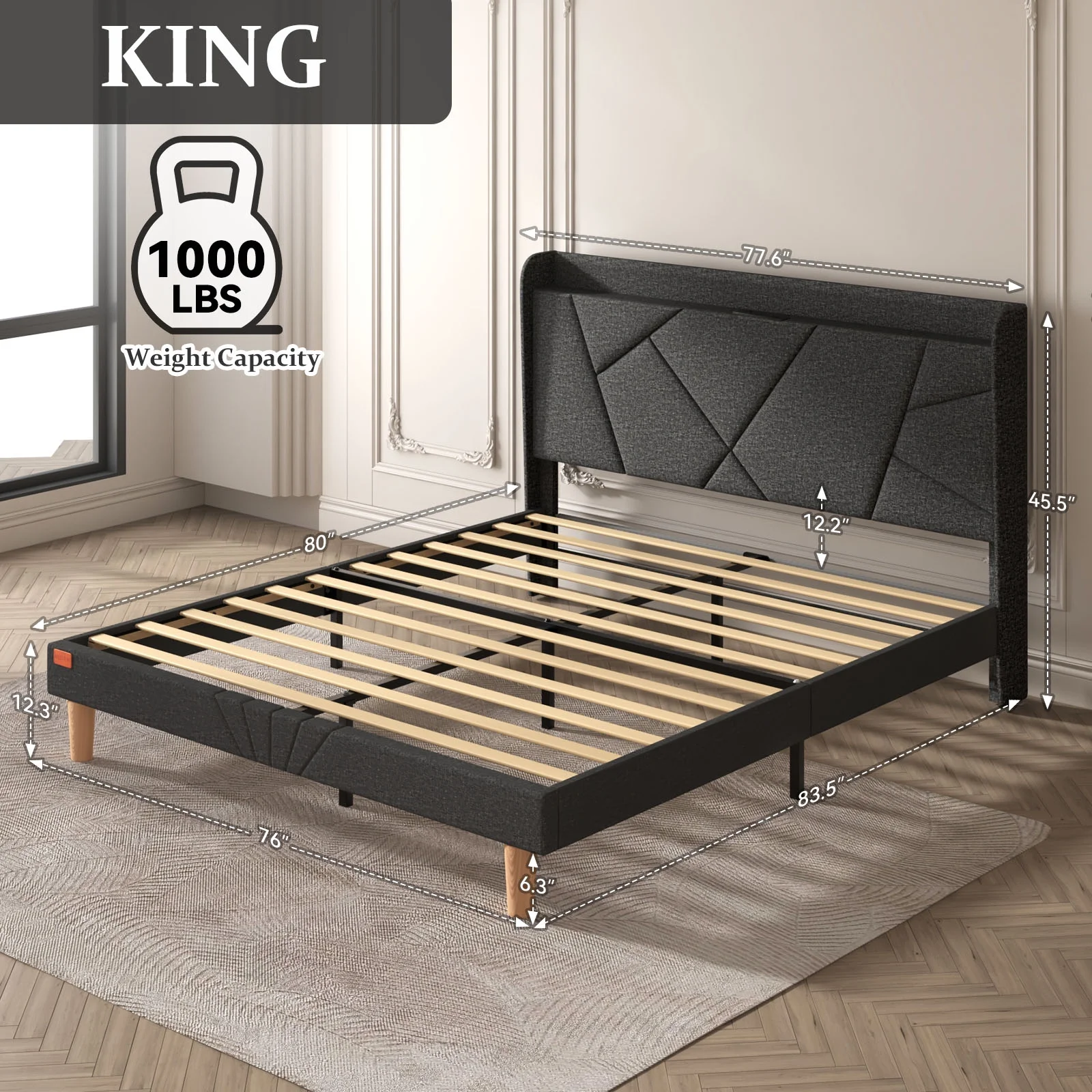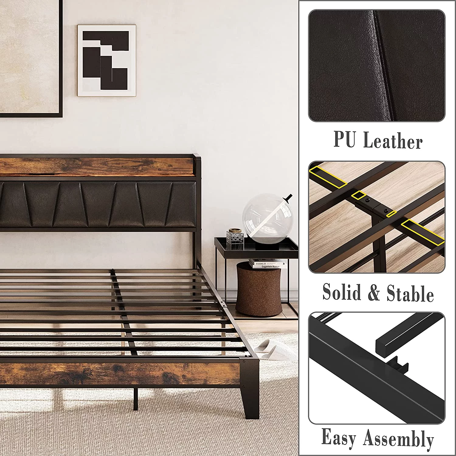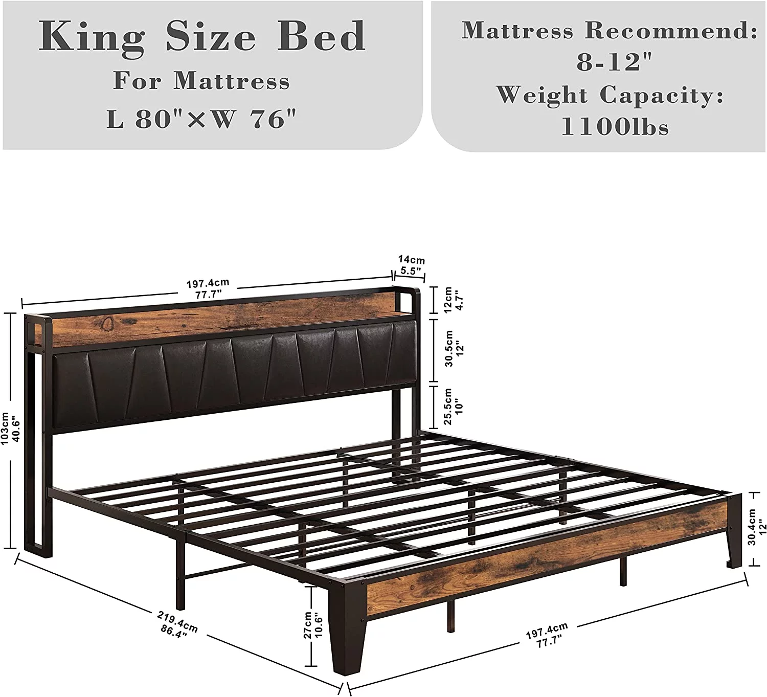 LIKIMIO King Metal Bed Frame with Black Storage Headboard for Adults, Retro Black
