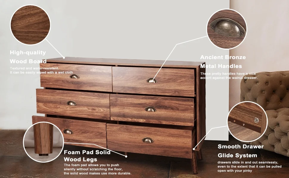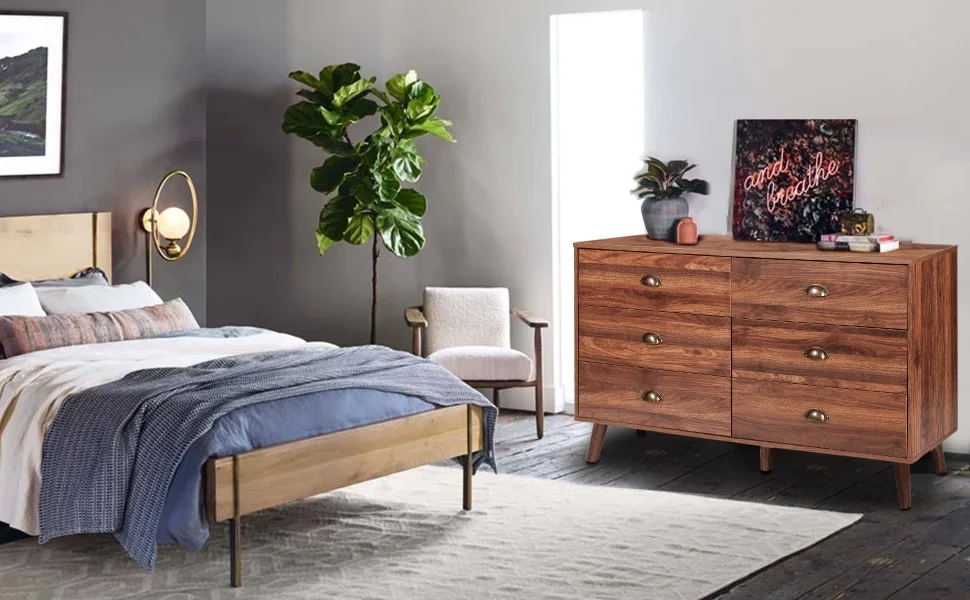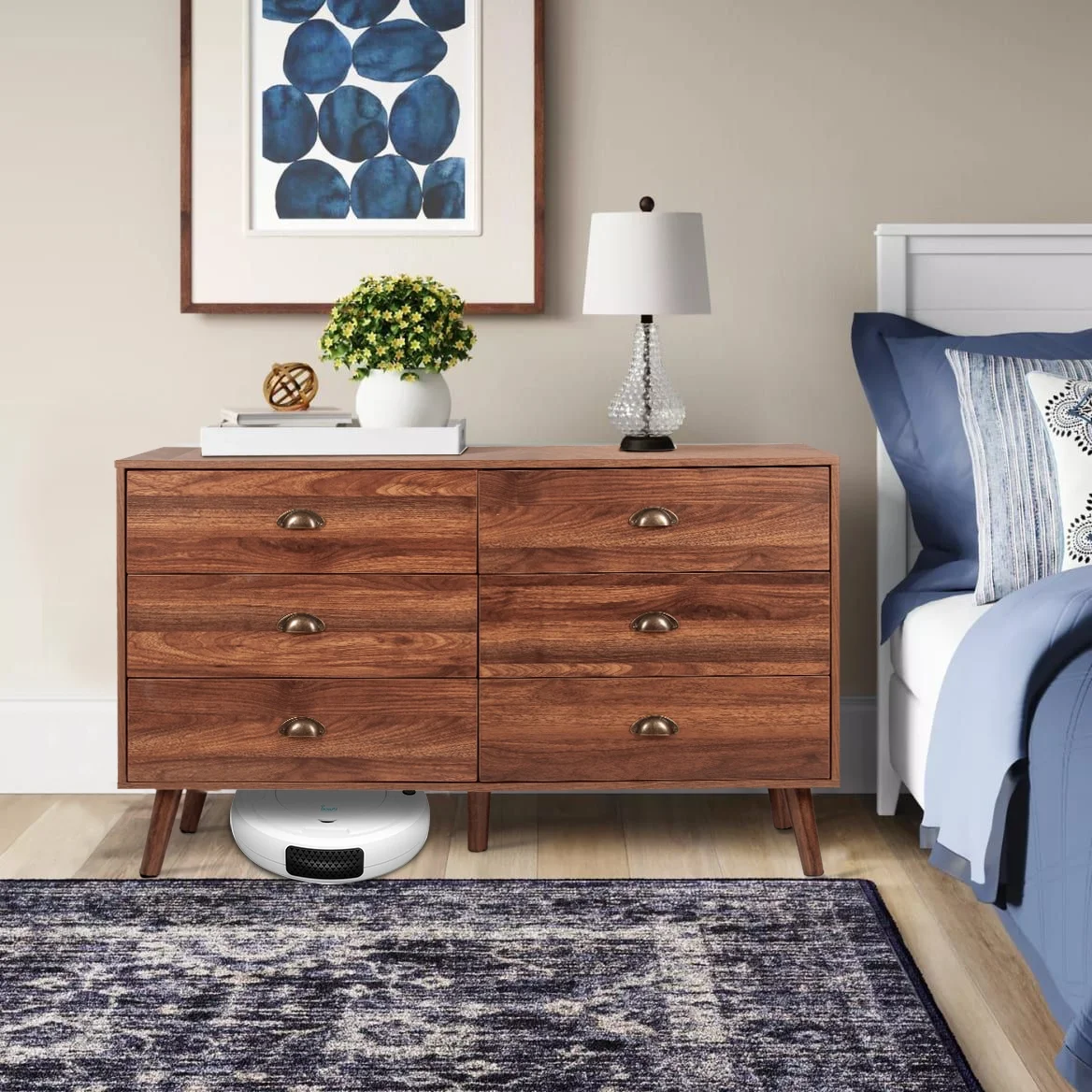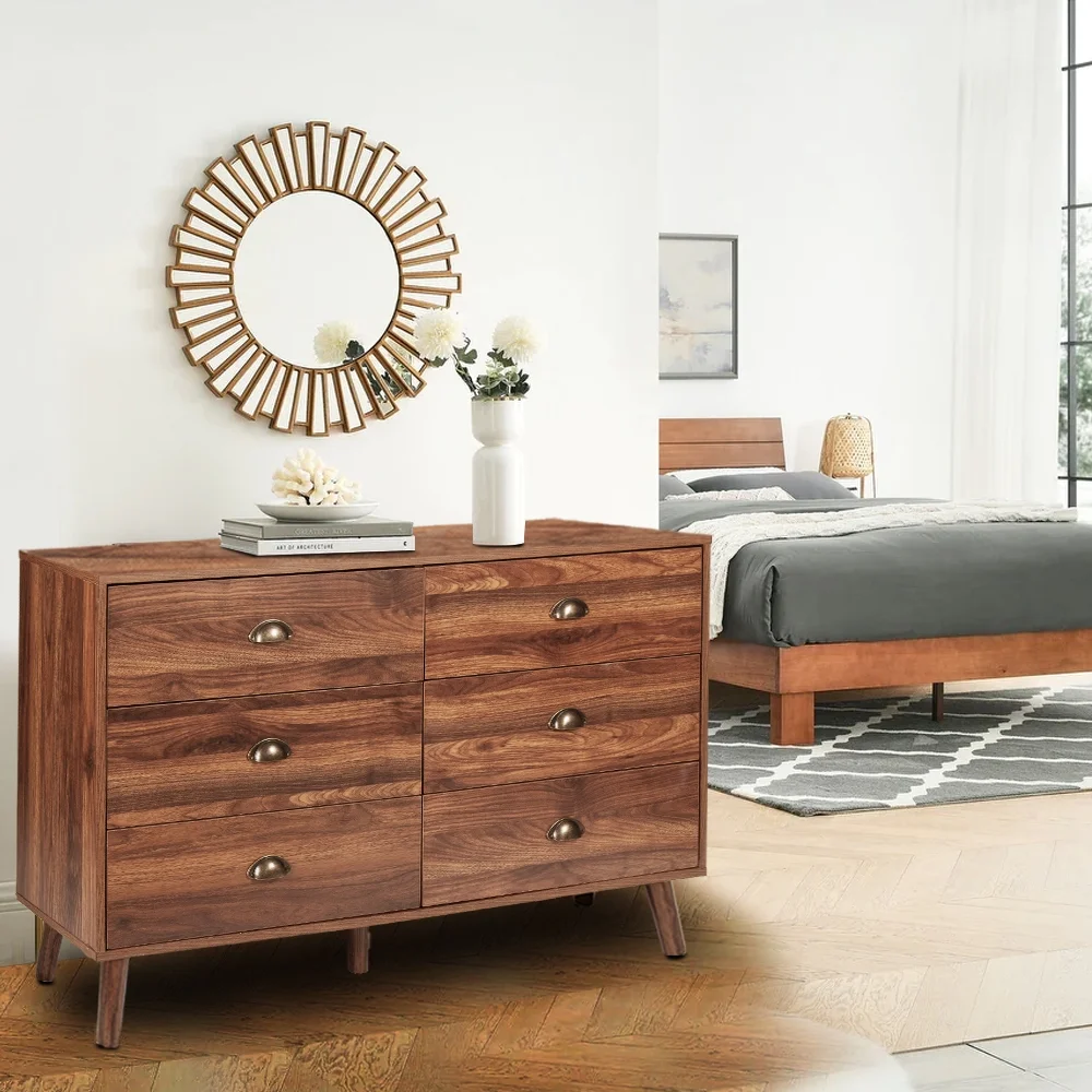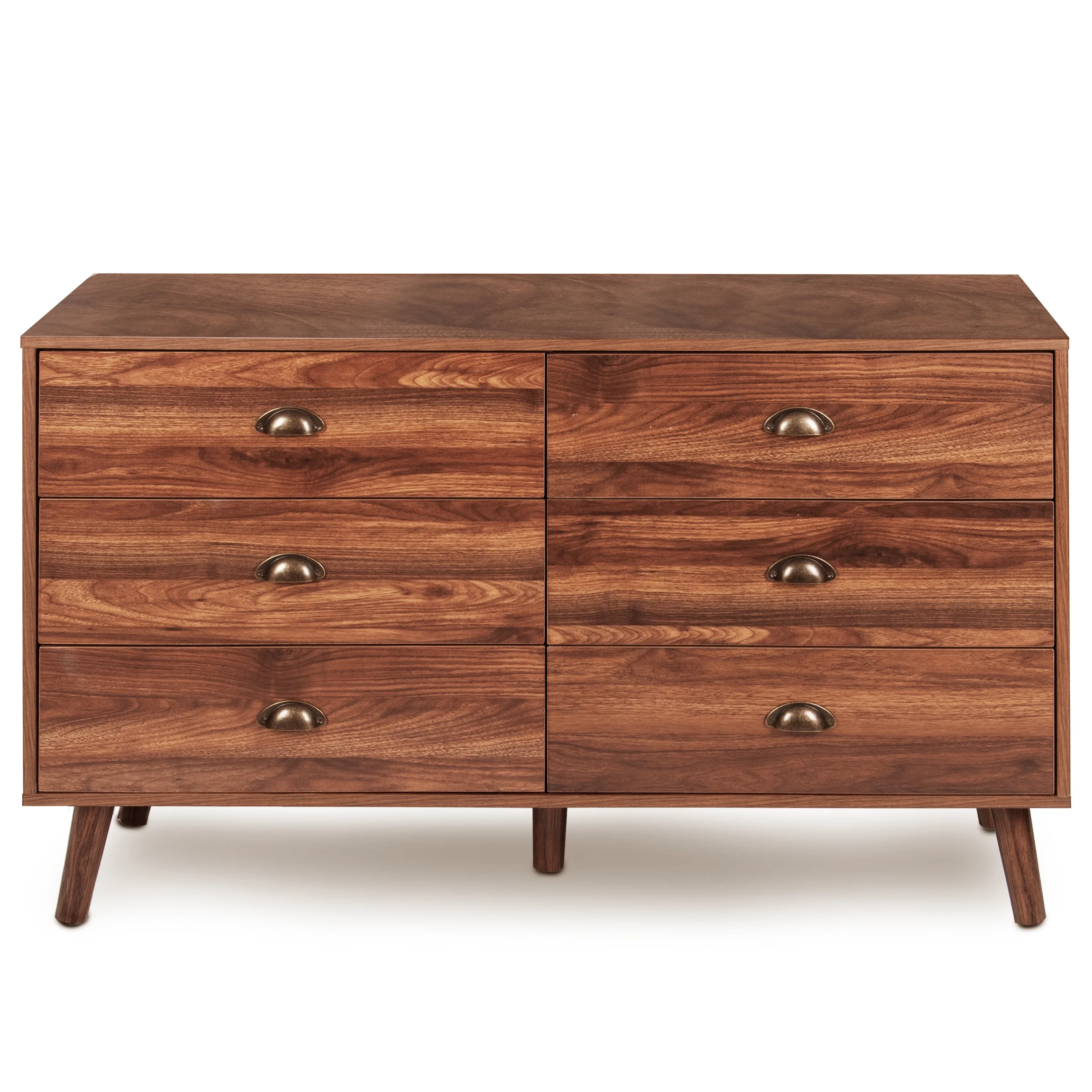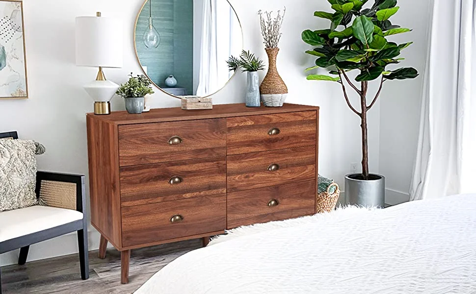 Polar Aurora Wood Dresser for Bedroom with 6 Drawers, Mid Century Modern Chests of Drawer with Metal Handles