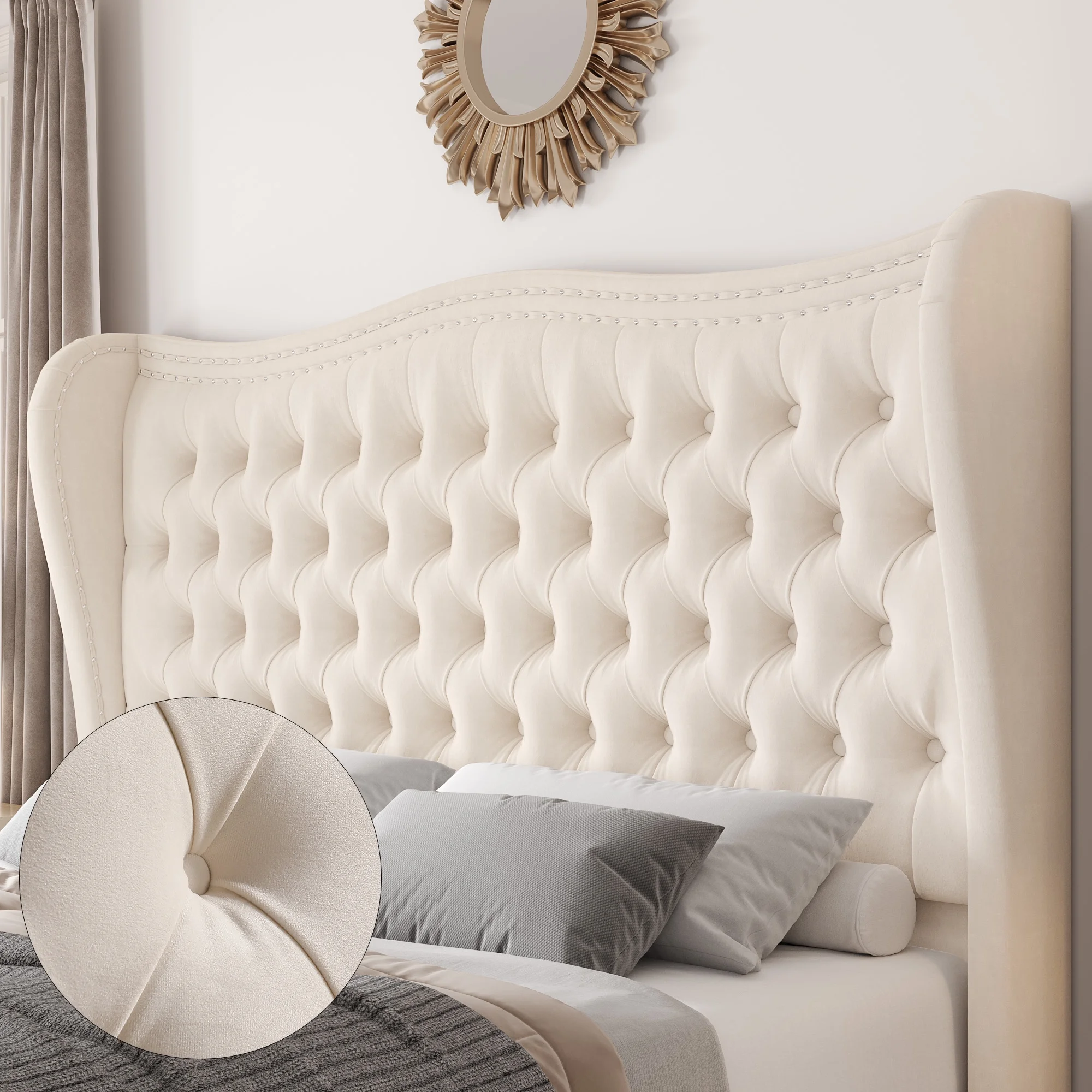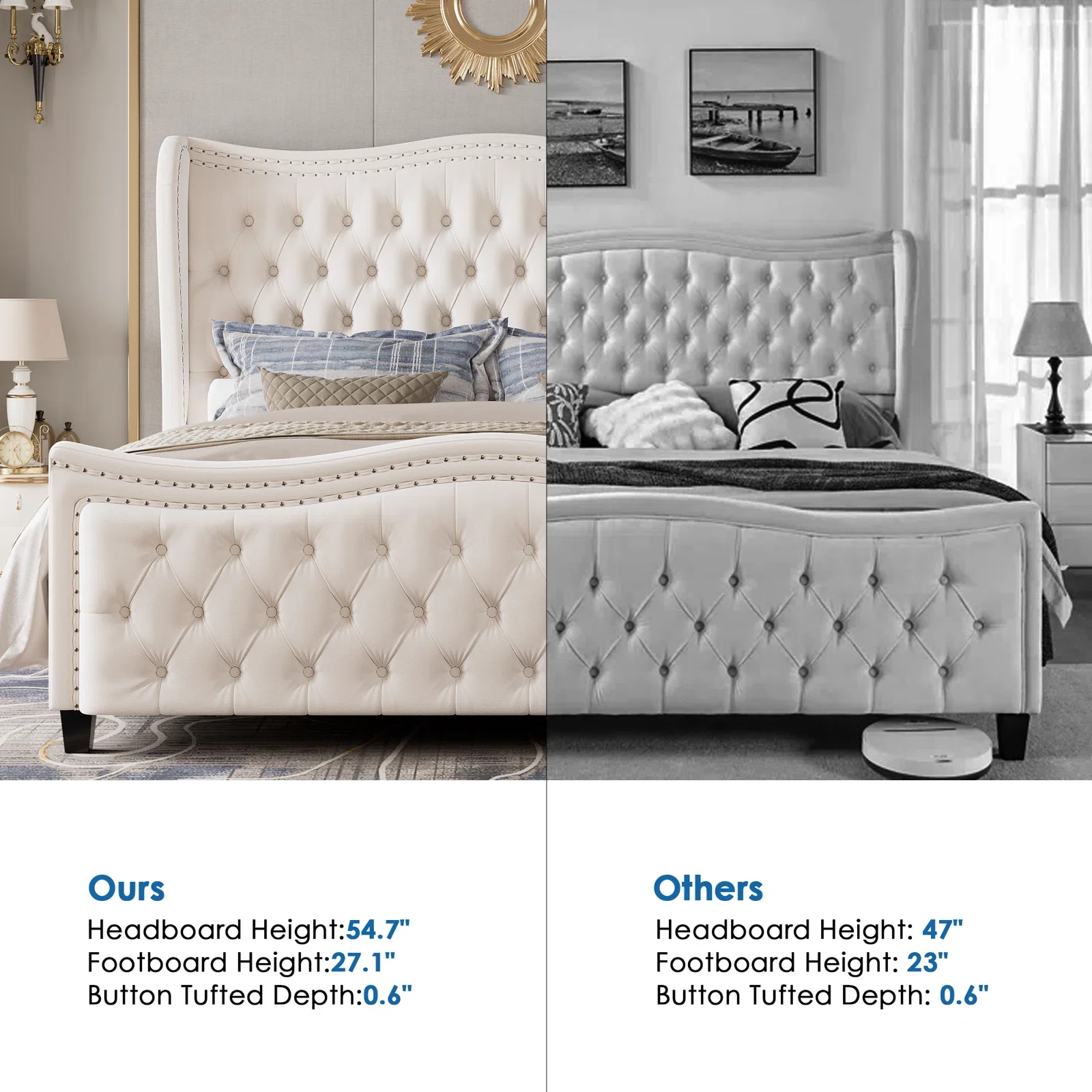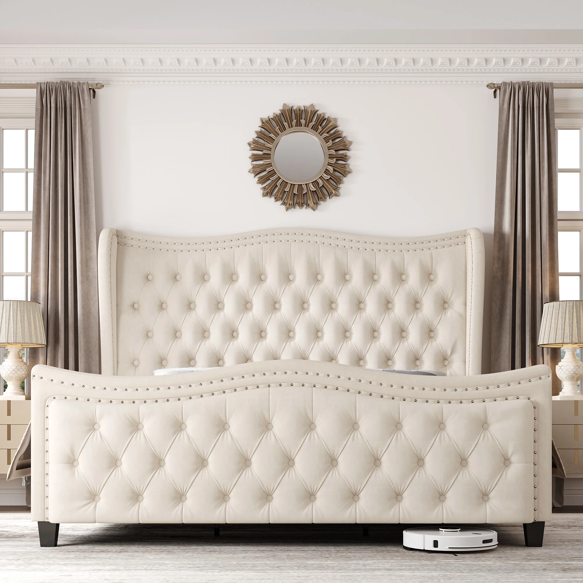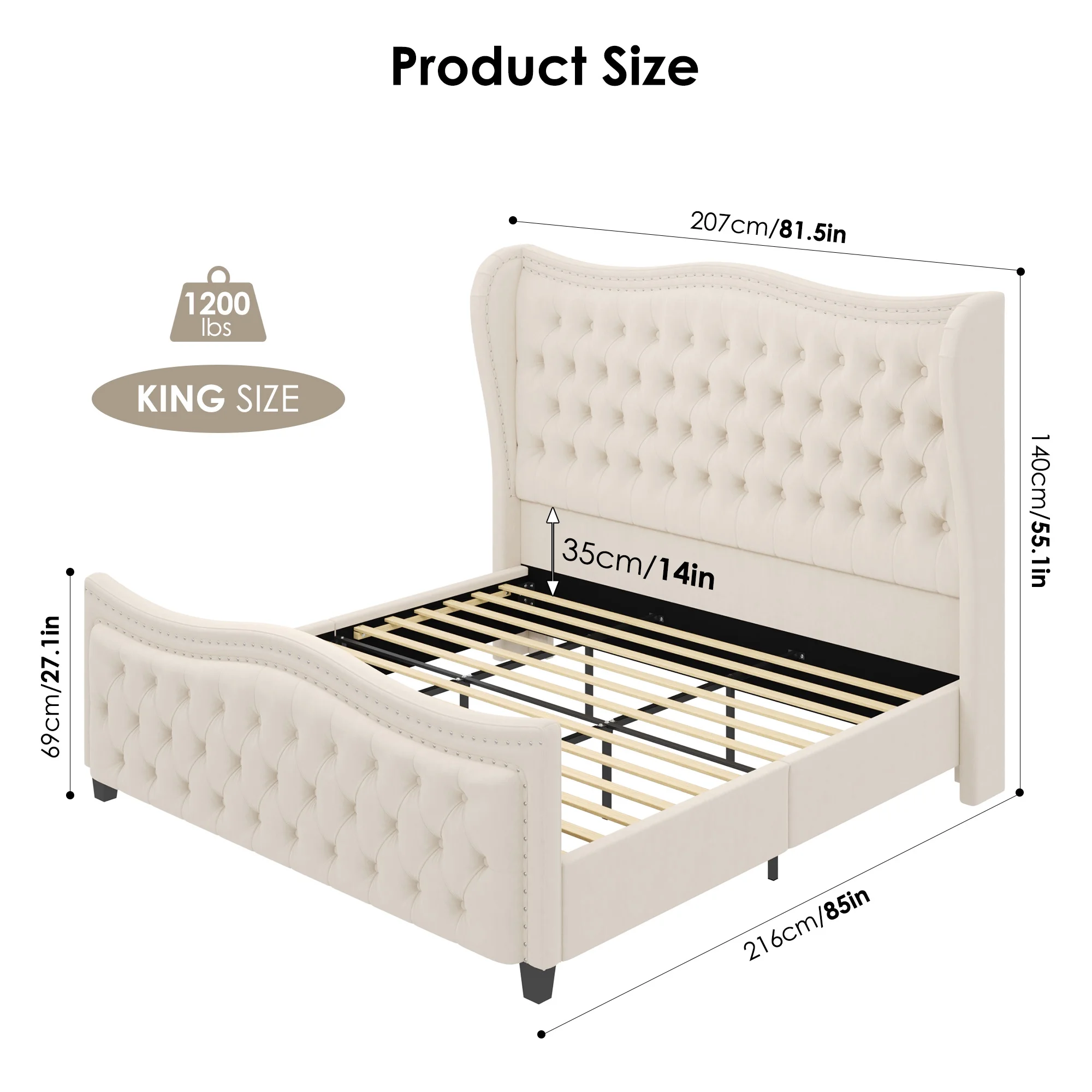 Homfa King Size Bed Frame, Modern Velvet Tufted Upholstered Platform Bed with Rivetts Button High Wingback Headboard, Beige