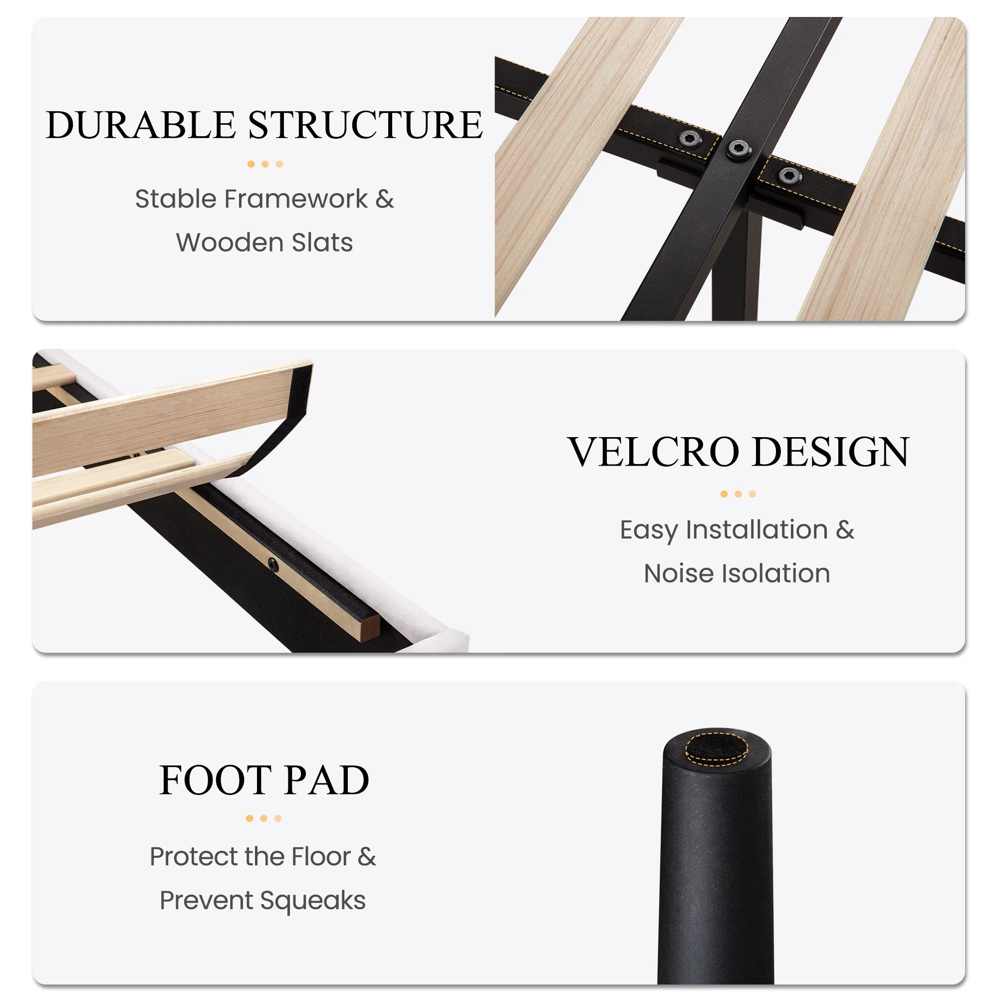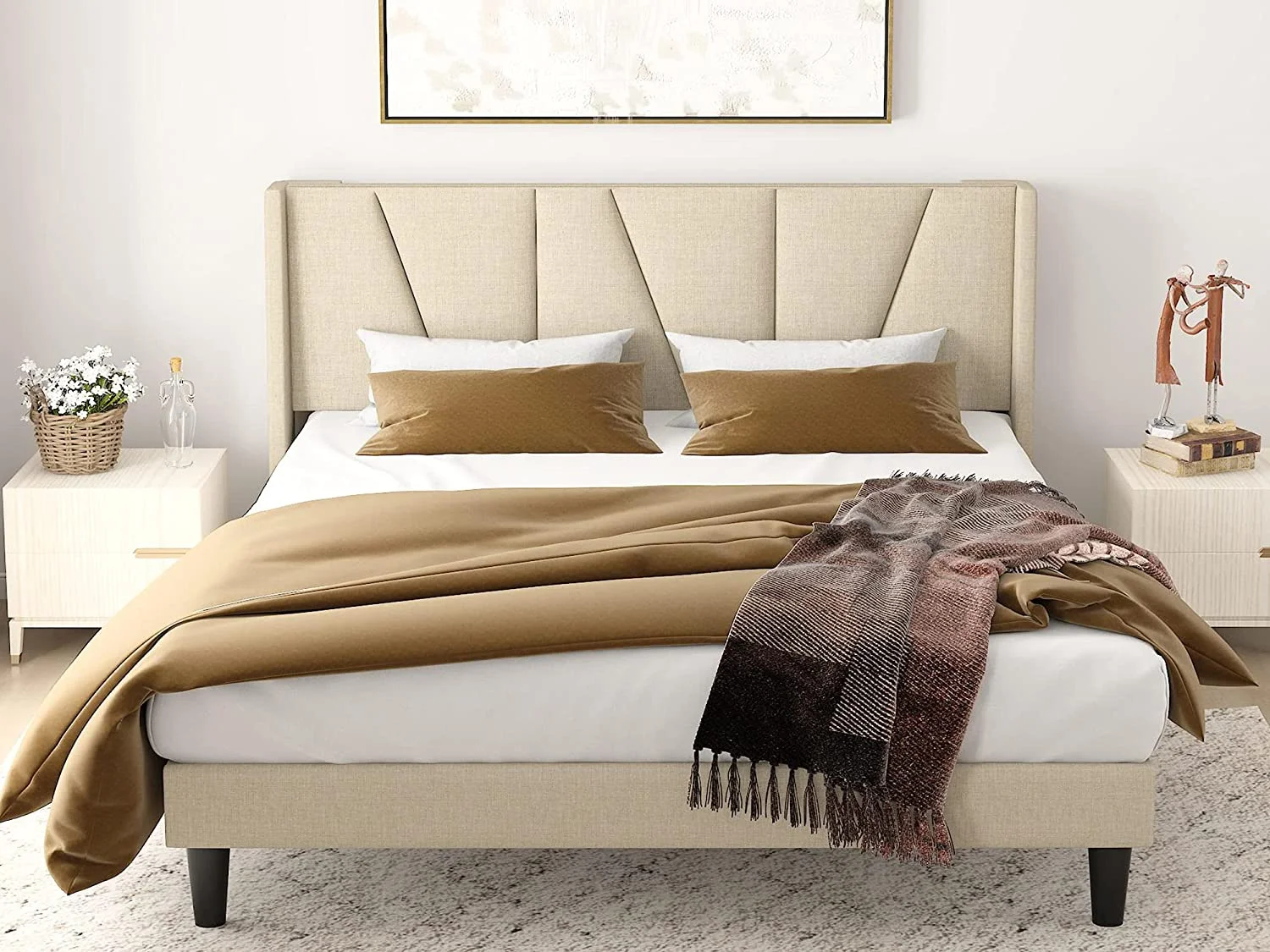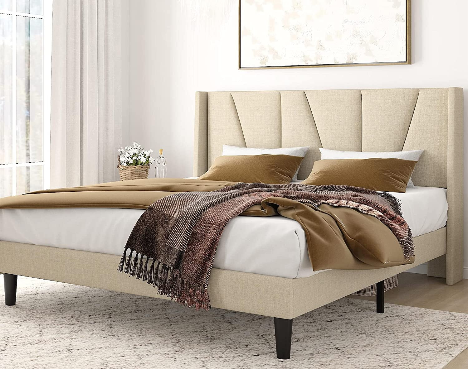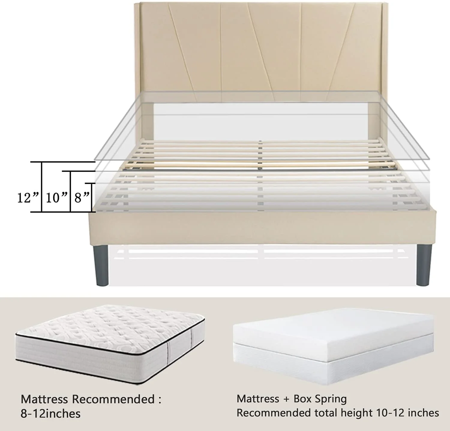 Amolife King Size Upholstered Platform Bed Frame with Wingback & Geometric Headboard, Light Beige