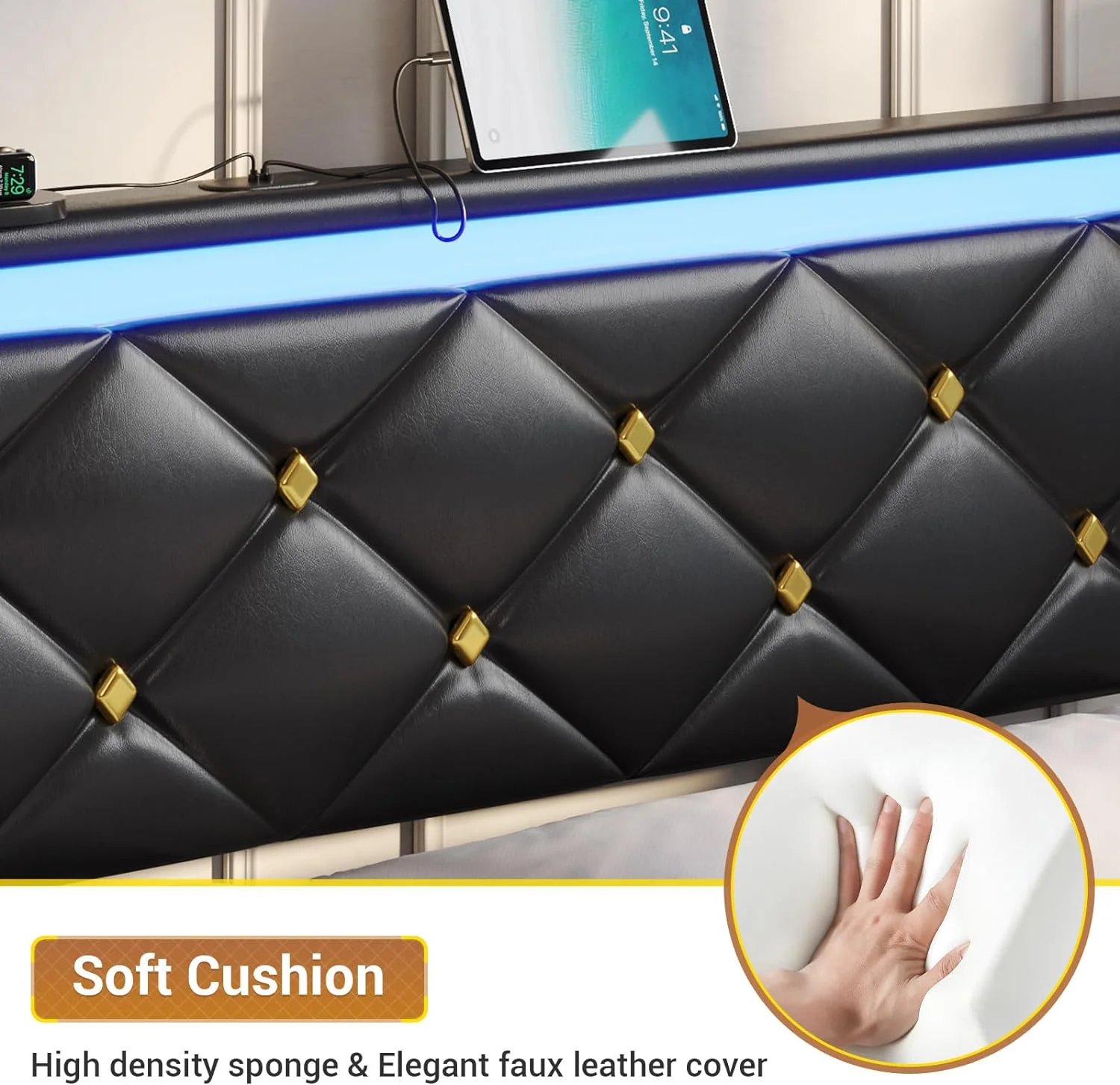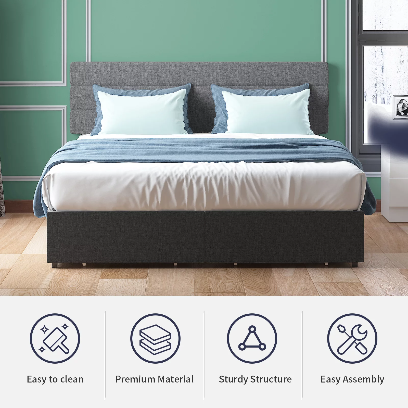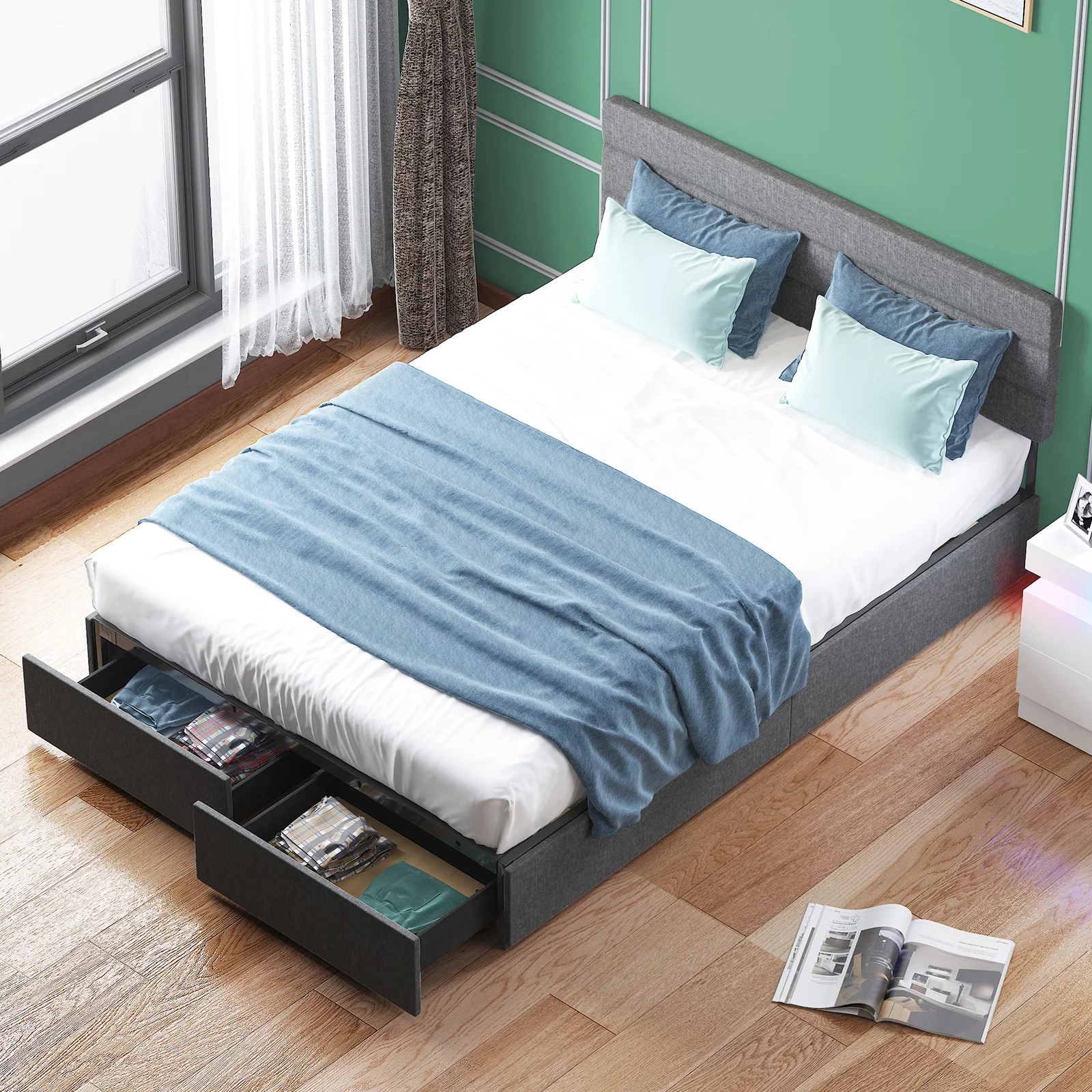 LED Bed Frame King Size Upholstered Platform Bed with 4 Drawers and LED Headboard and 2 USB Ports,Noise-Free, Dark Grey