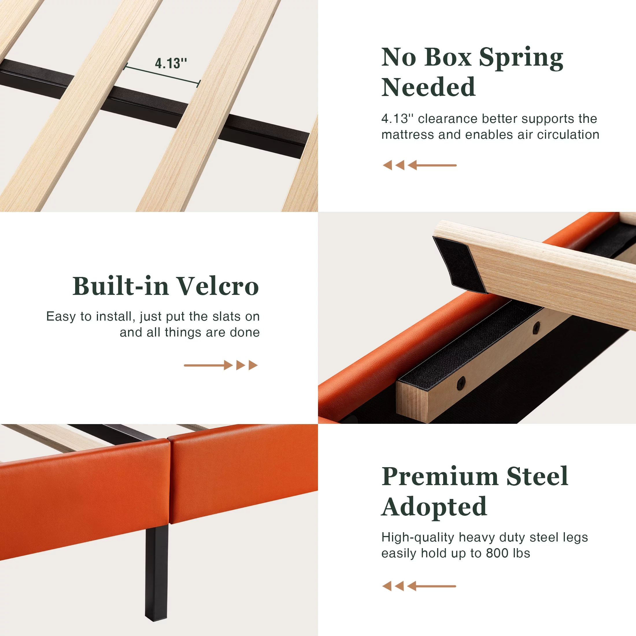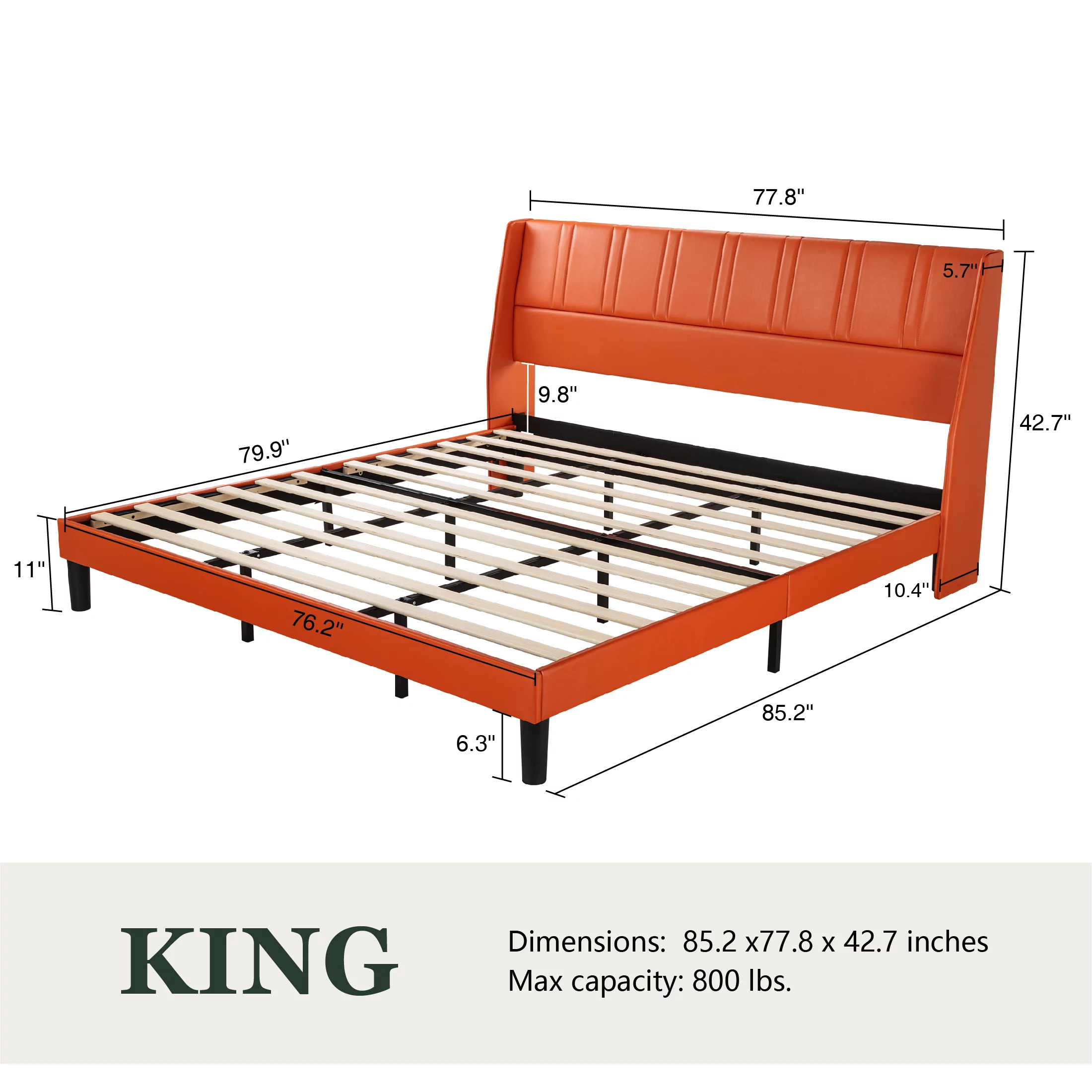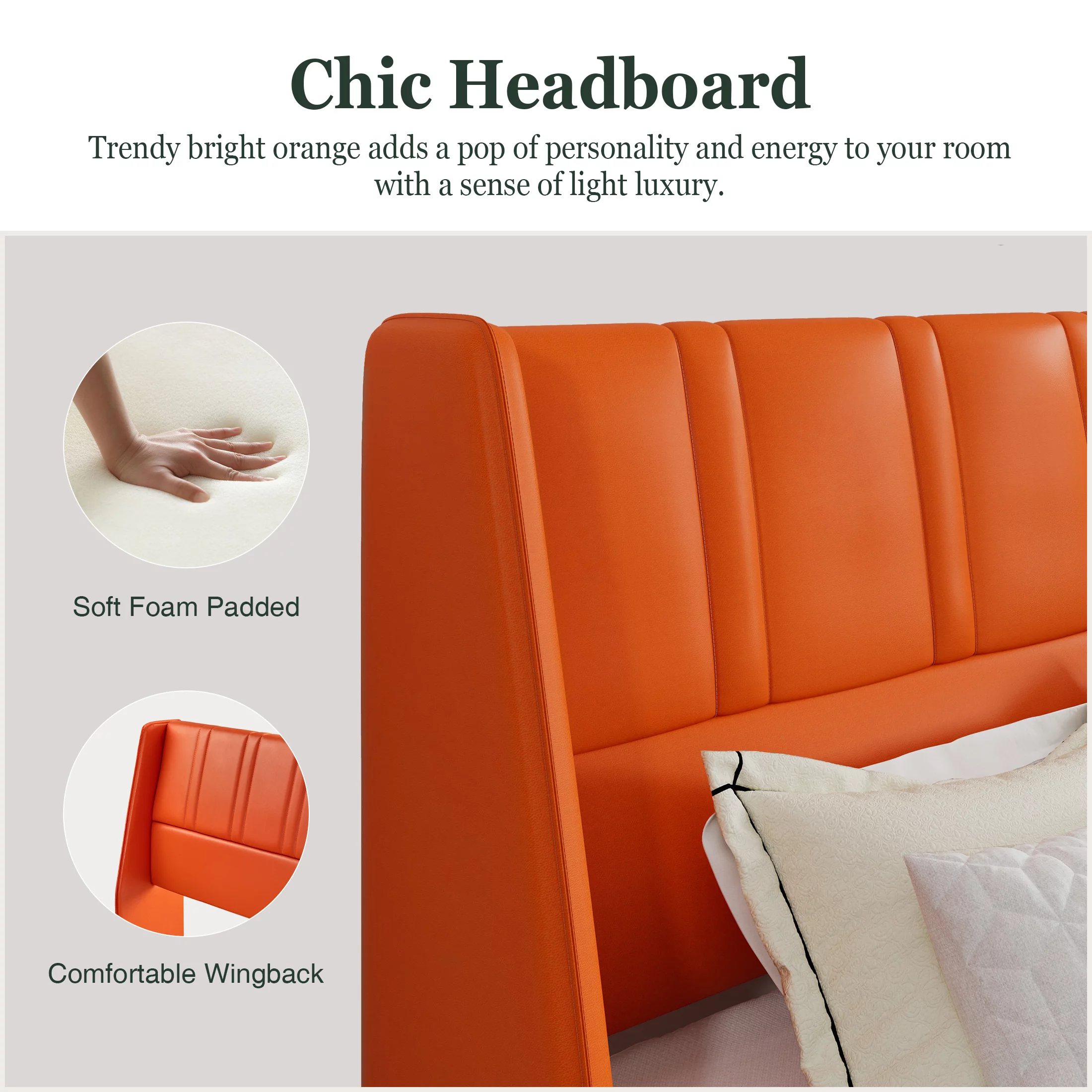 Amolife King Size Faux Leather Platform Bed Frame with Exquisite Wingback Headboard, Orange