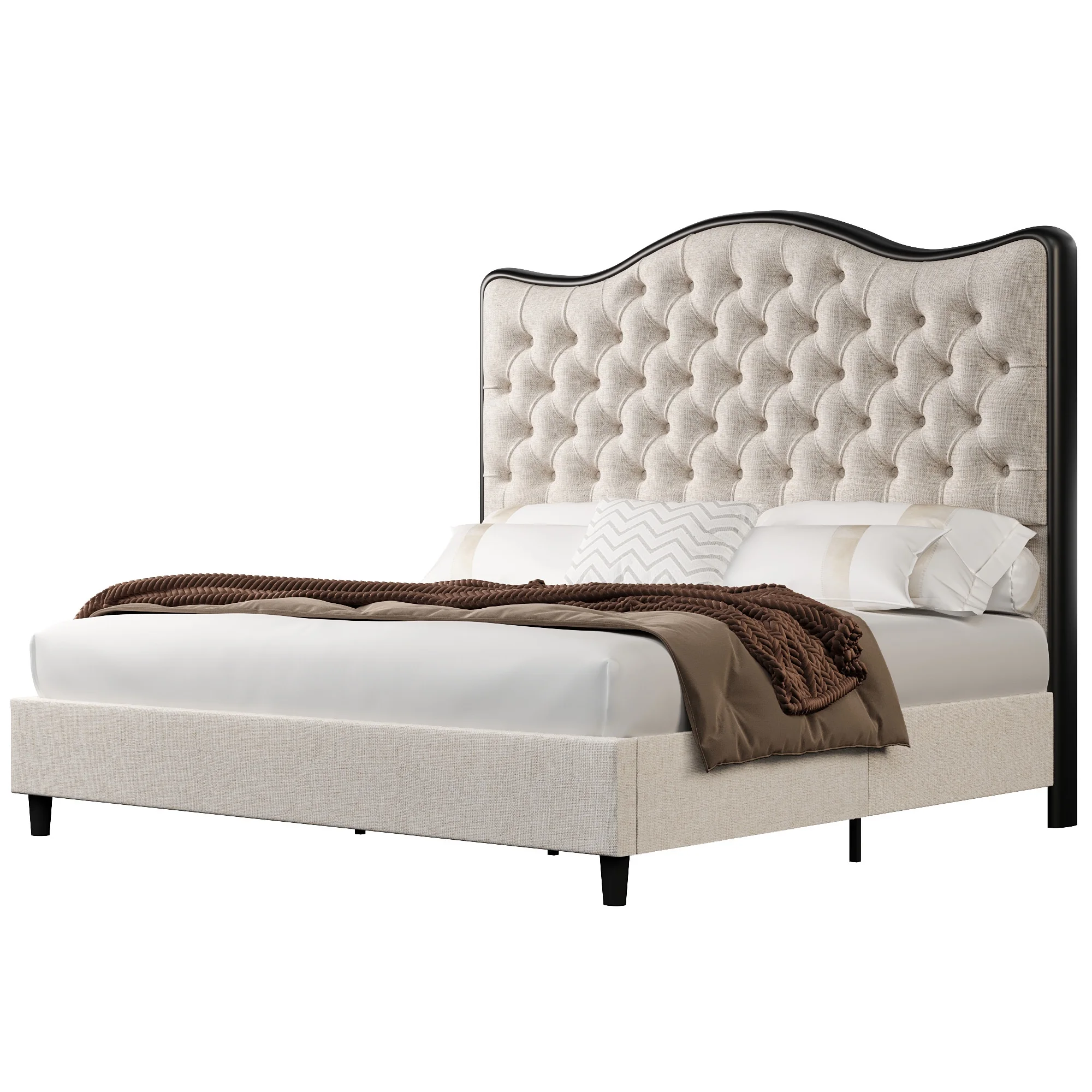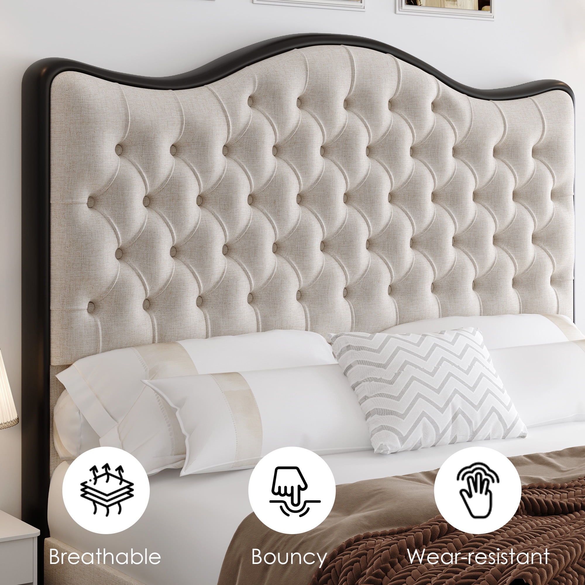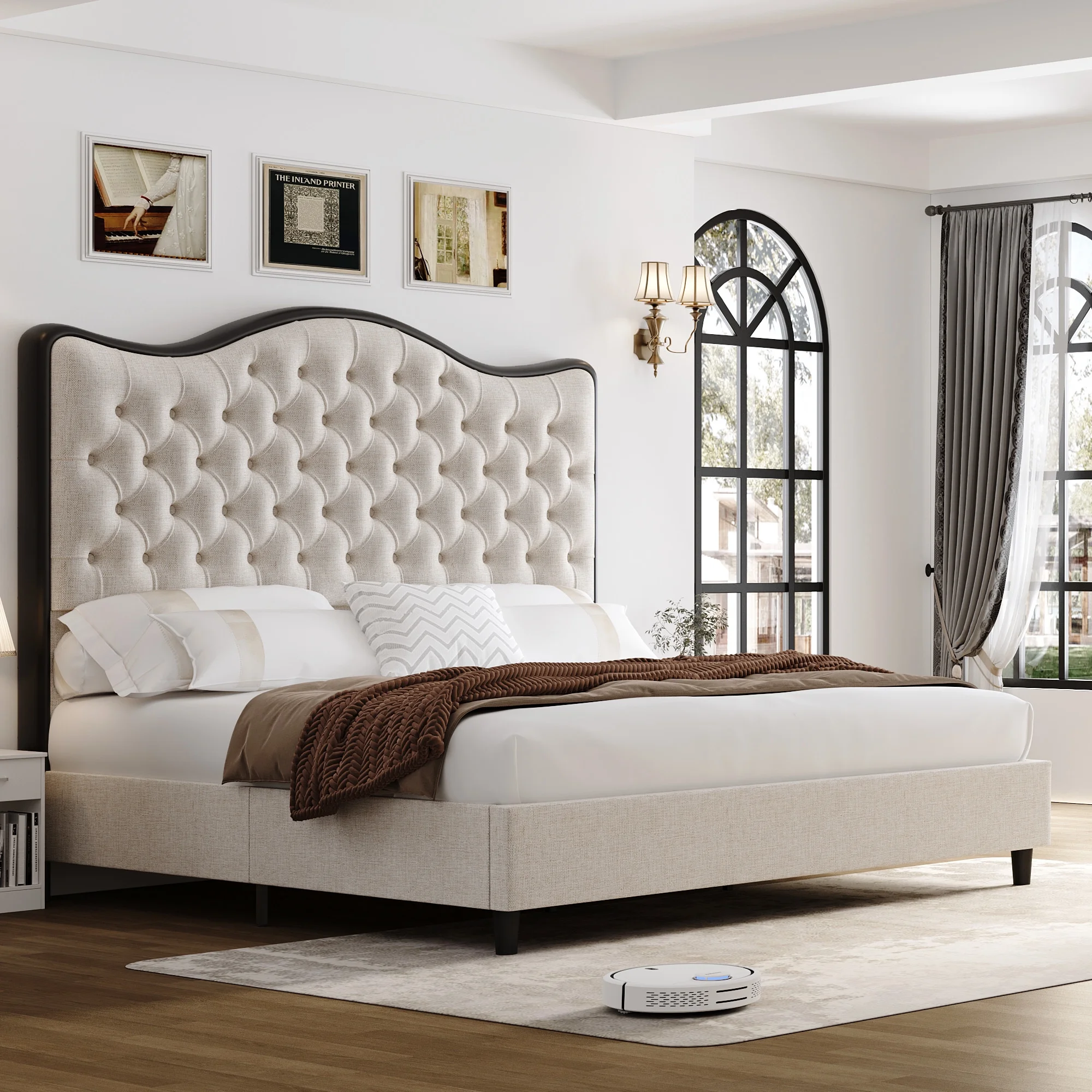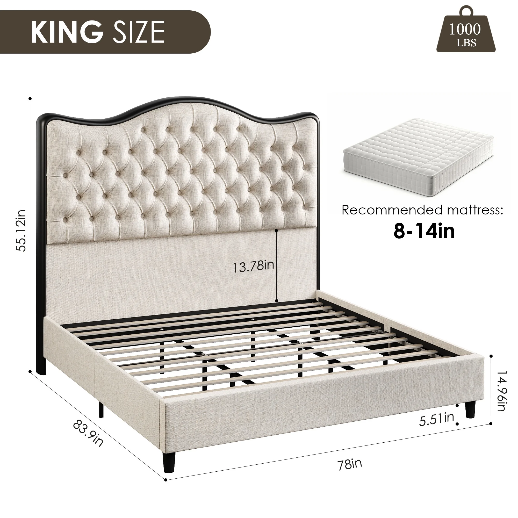Homfa King Size 54.5'' H Linen Upholstered Bed Frame, Modern Platform Bed with Deep Button Tufted Headboard, Beige/Black