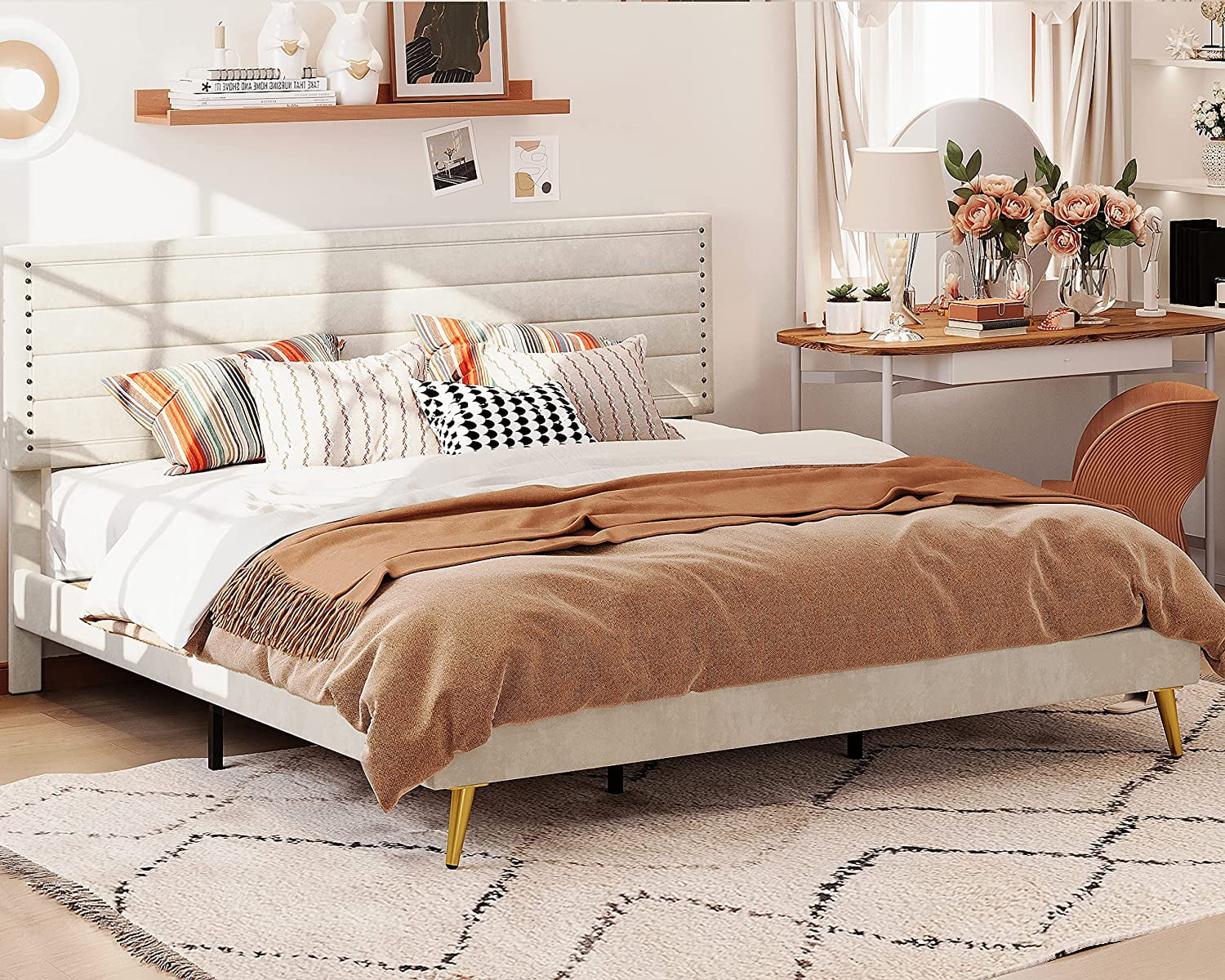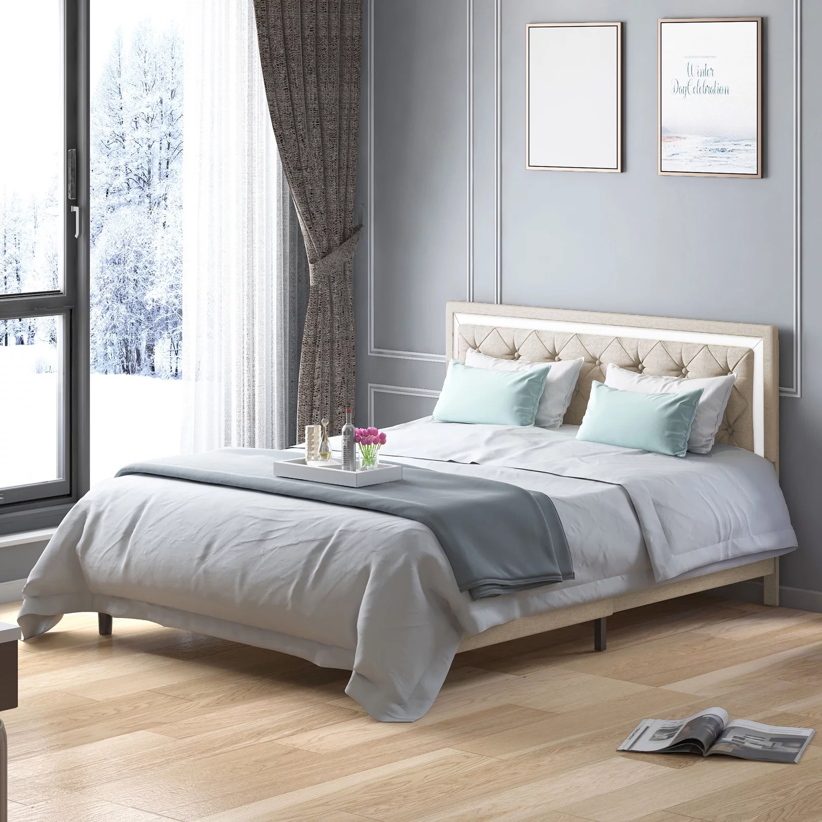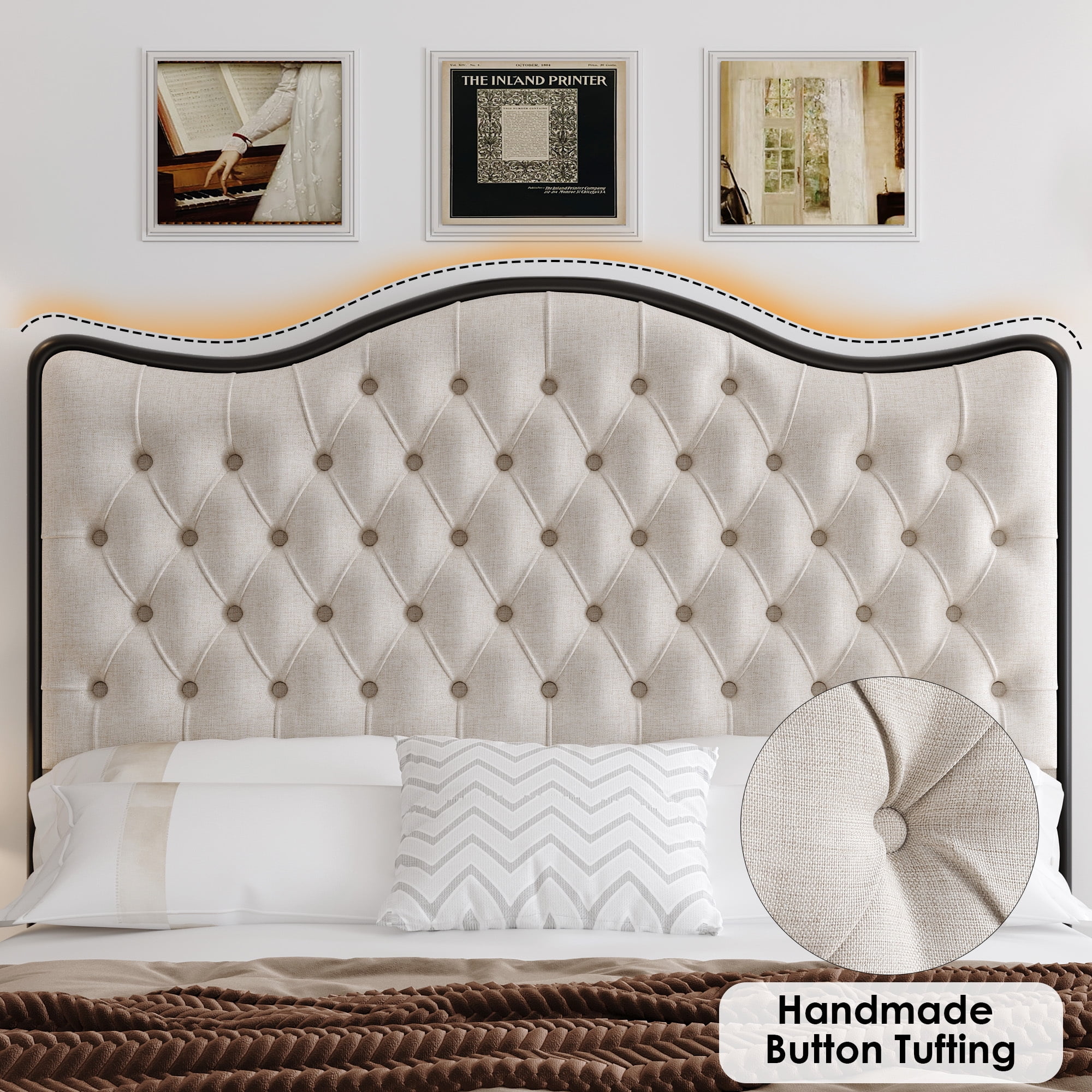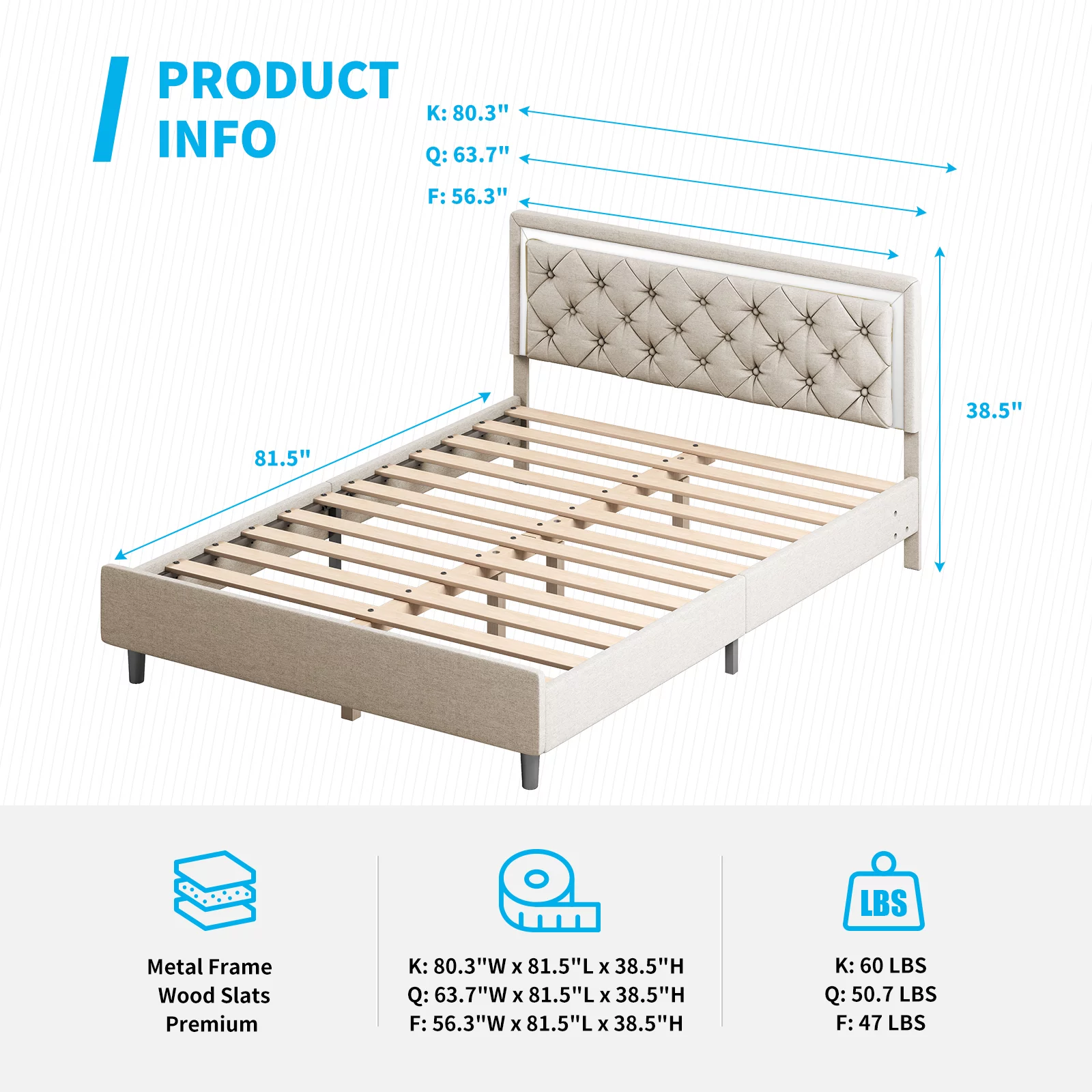 Homfa King Size 54.5'' H Linen Upholstered Bed Frame, Modern Platform Bed with Deep Button Tufted Headboard, Beige/Black