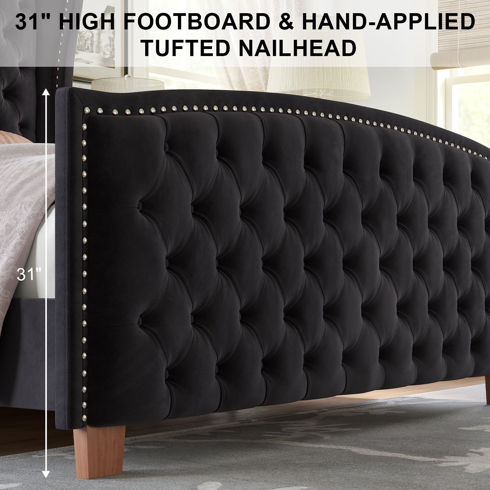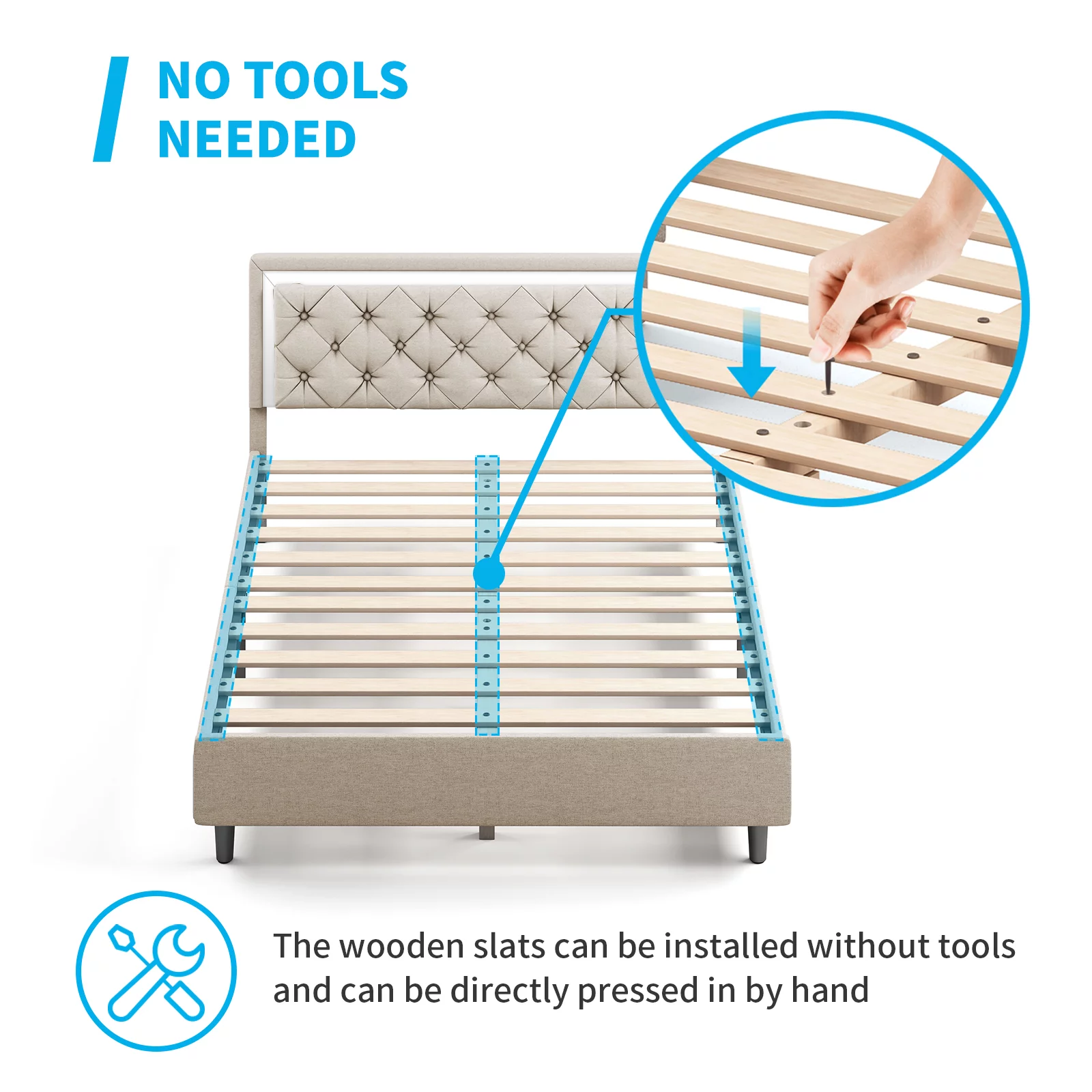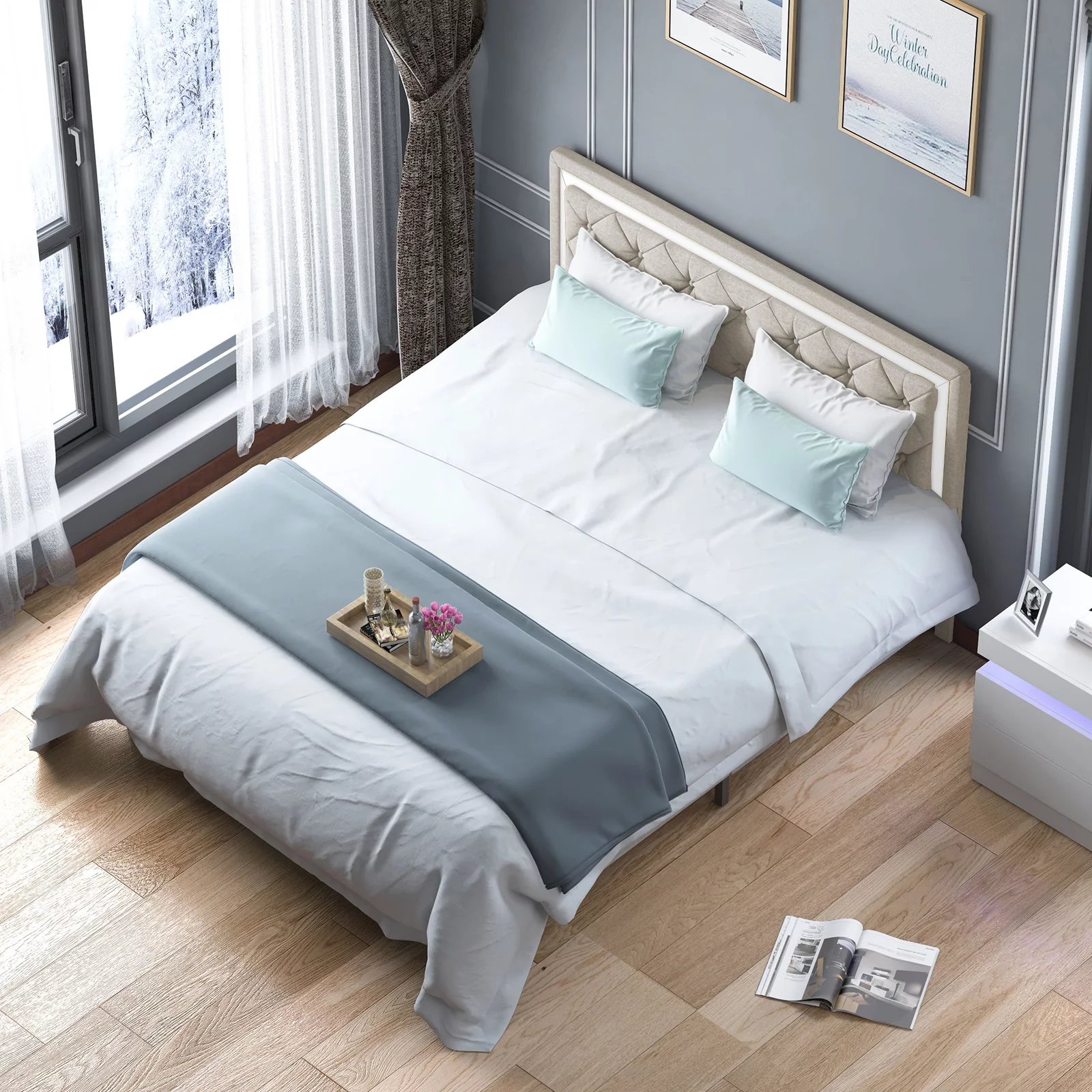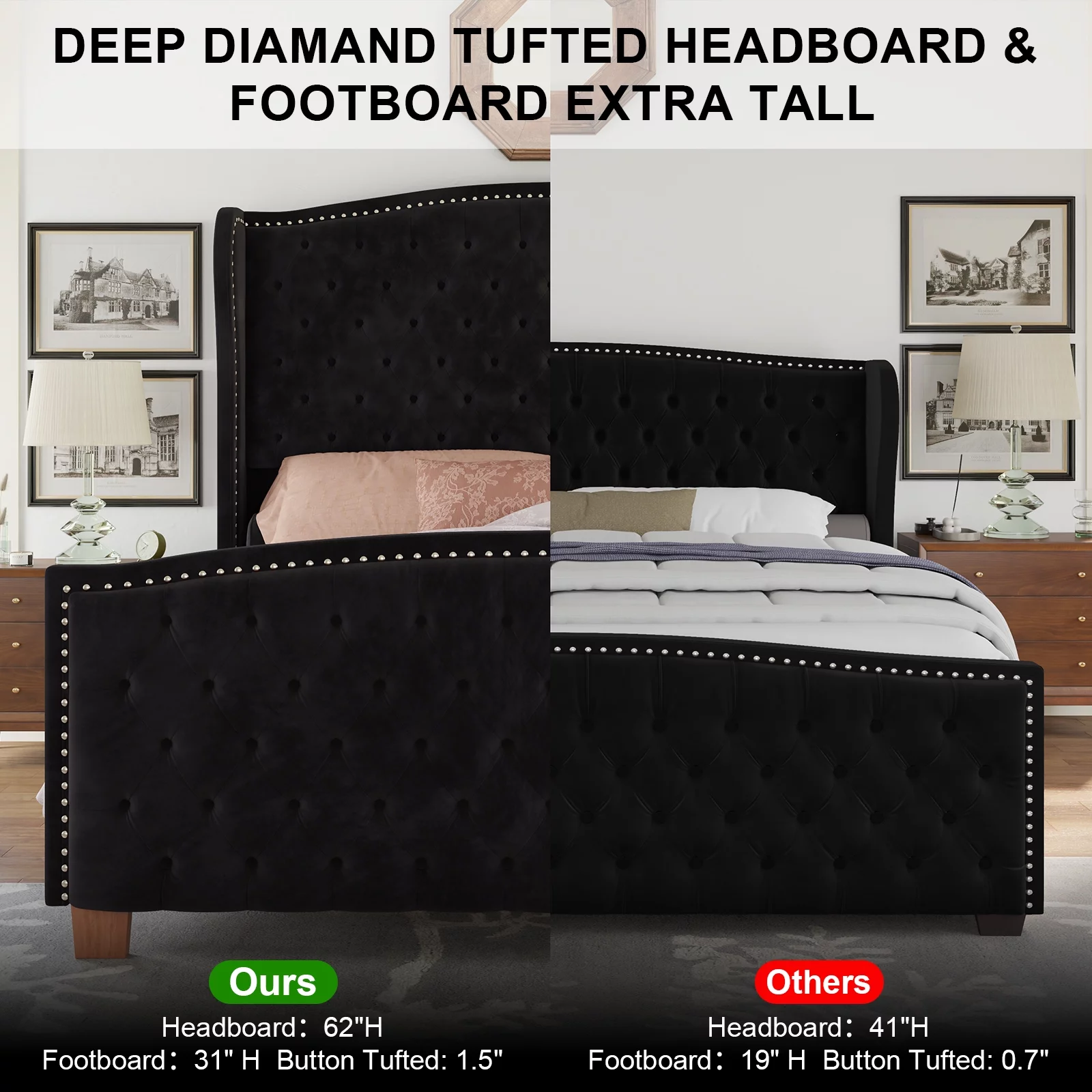 Homfa King Size 54.5'' H Linen Upholstered Bed Frame, Modern Platform Bed with Deep Button Tufted Headboard, Beige/Black