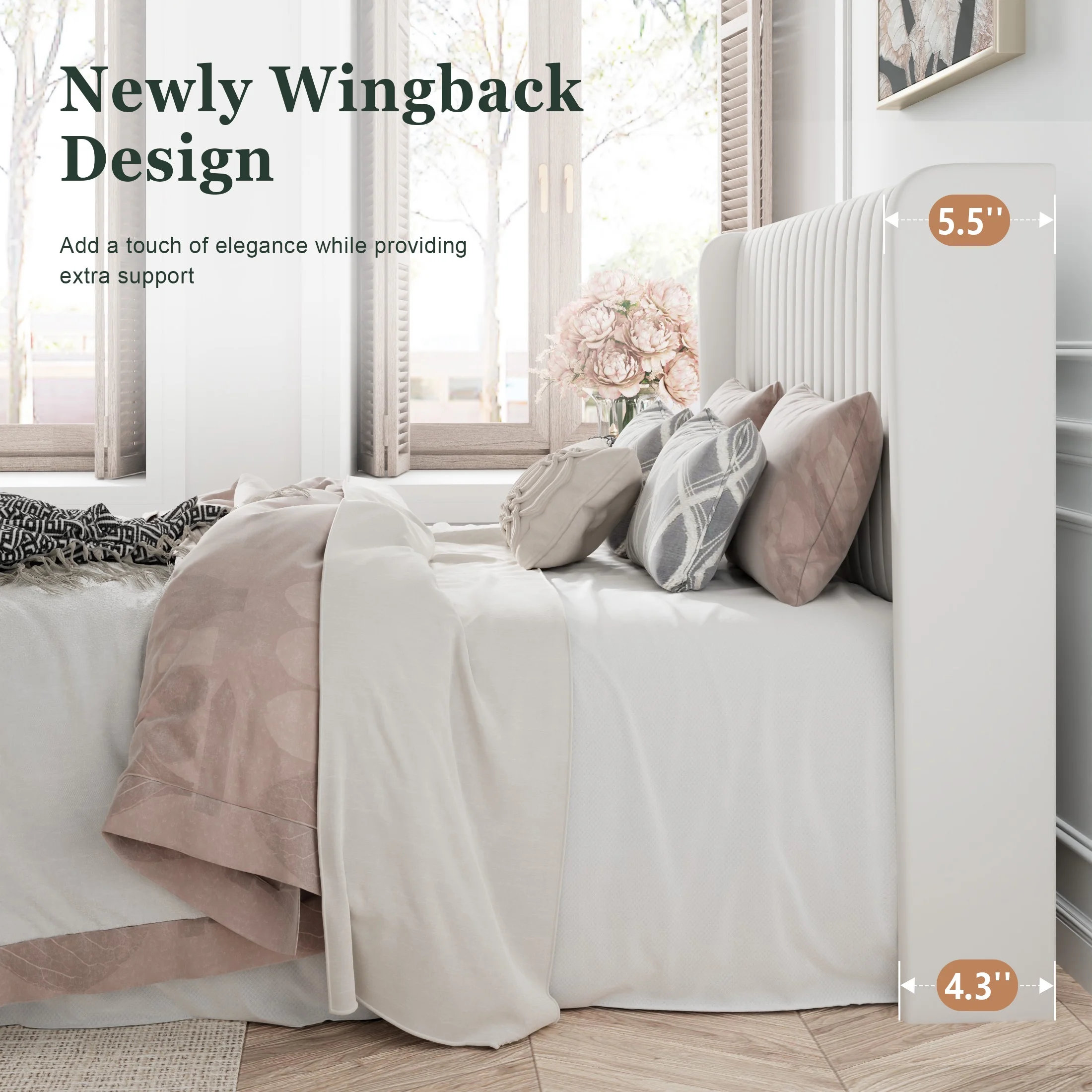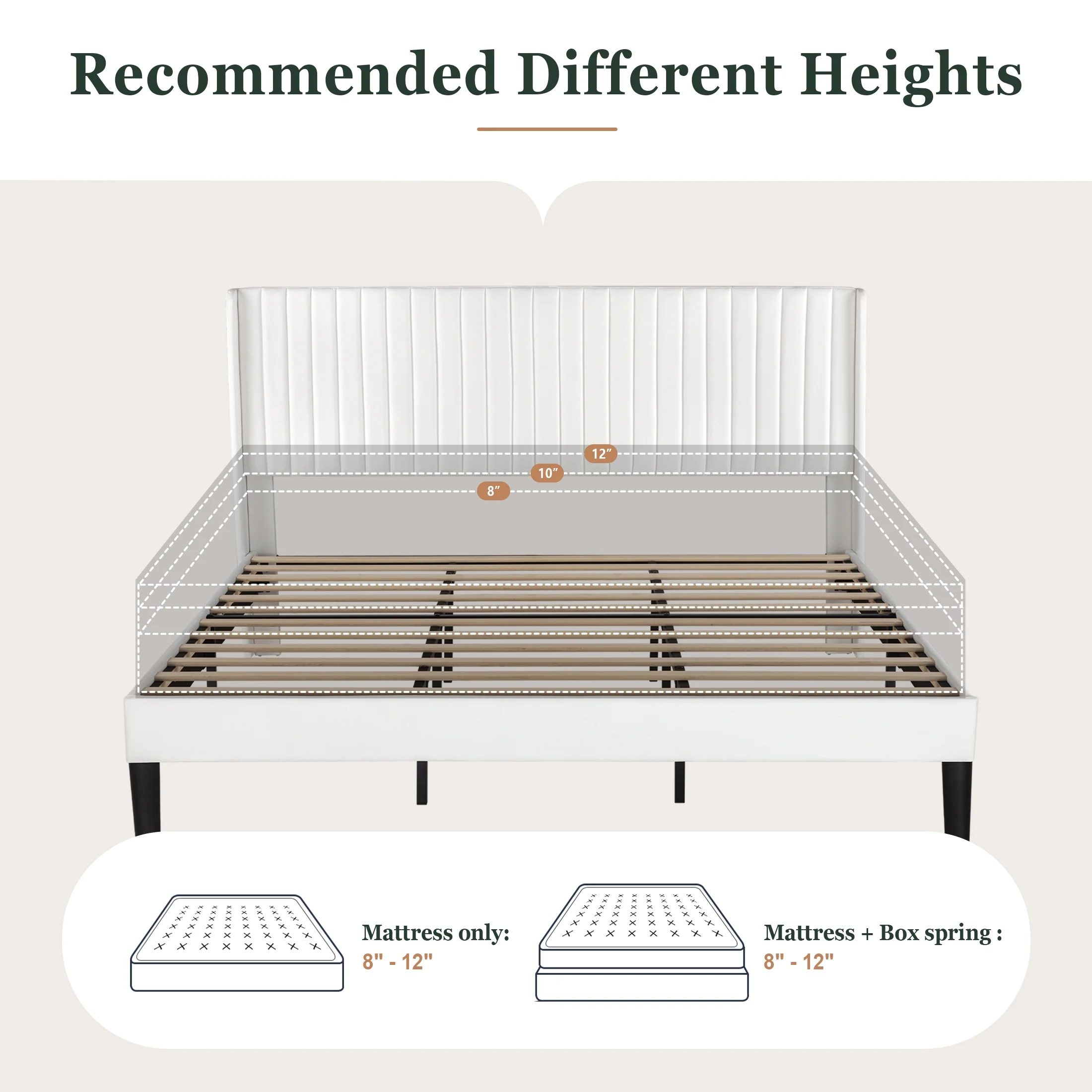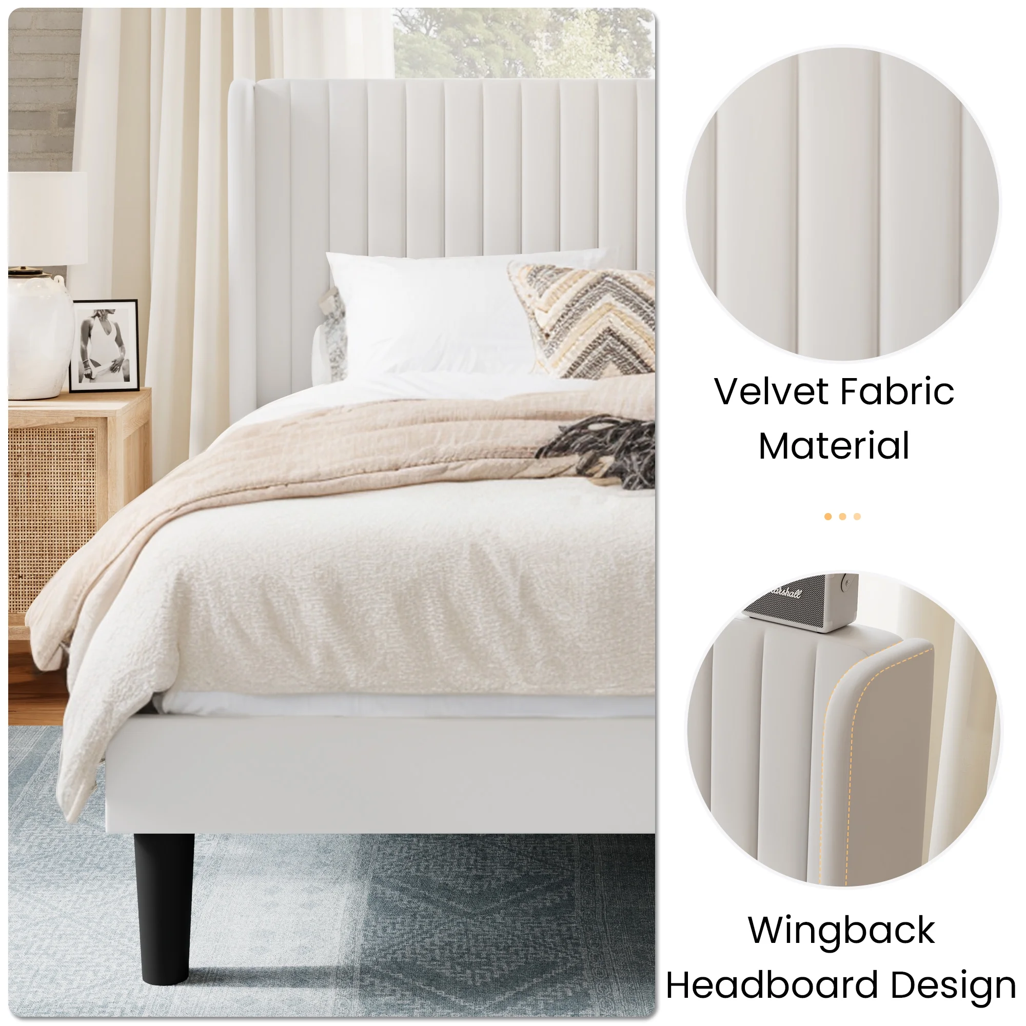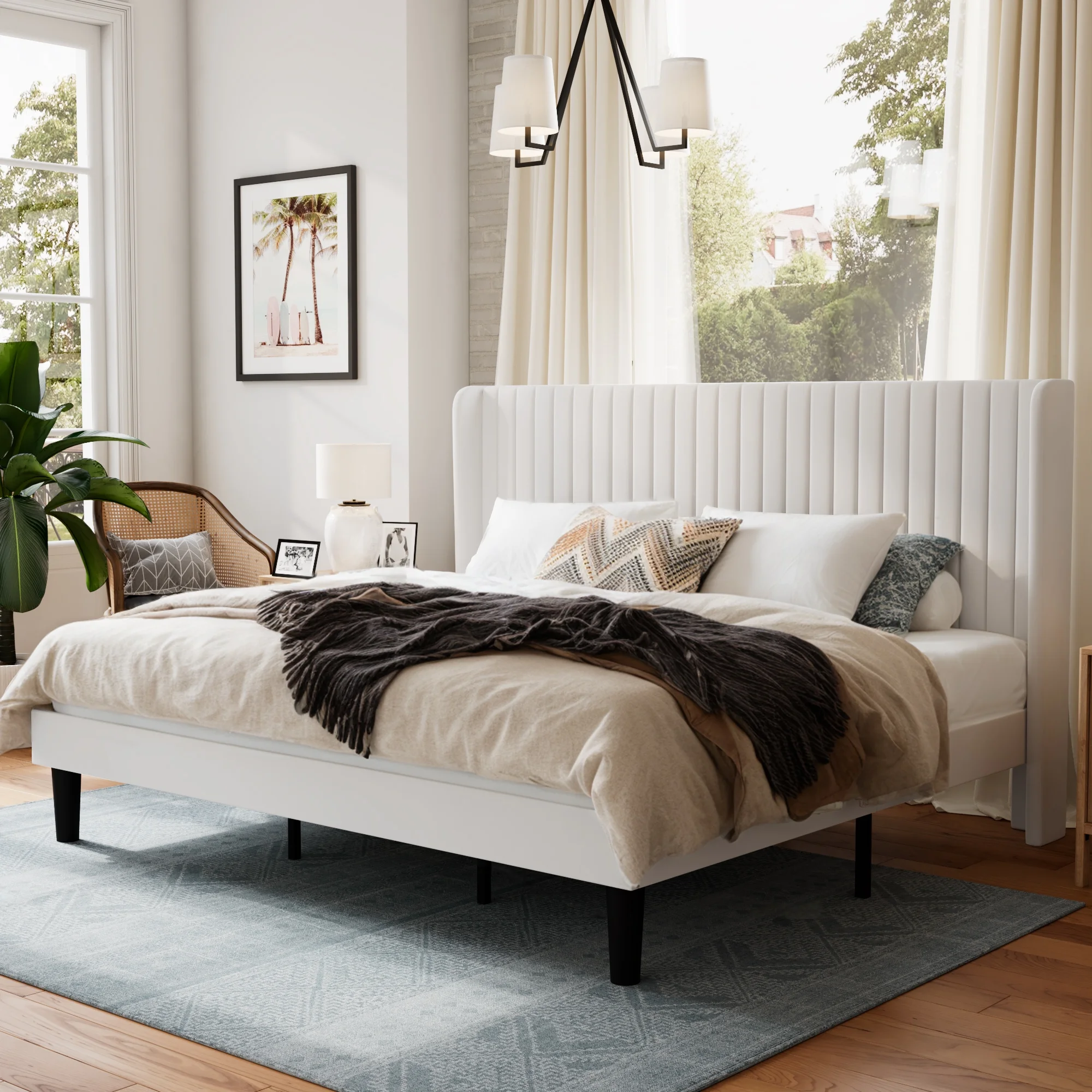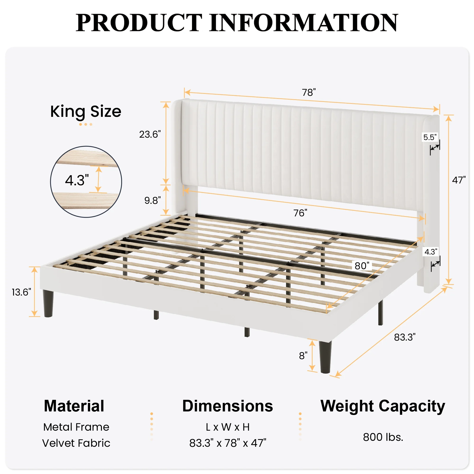 Sha Cerlin King Size Upholstered Platform Bed Frame with Velvet Channel Wingback Headboard, Off White