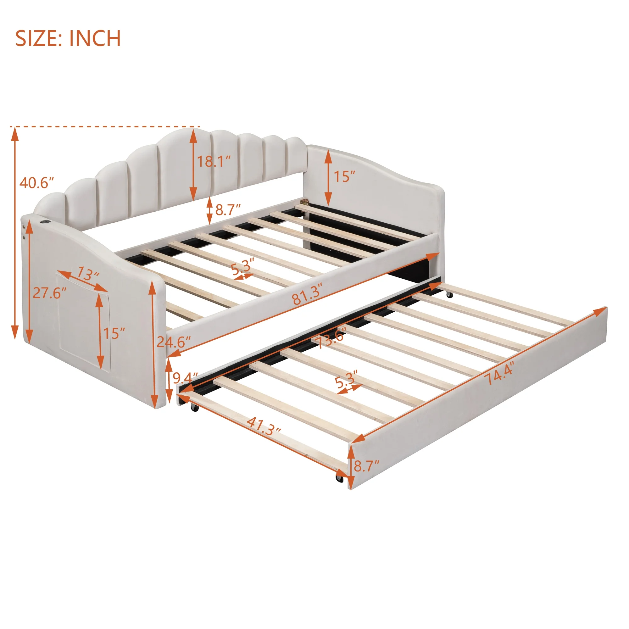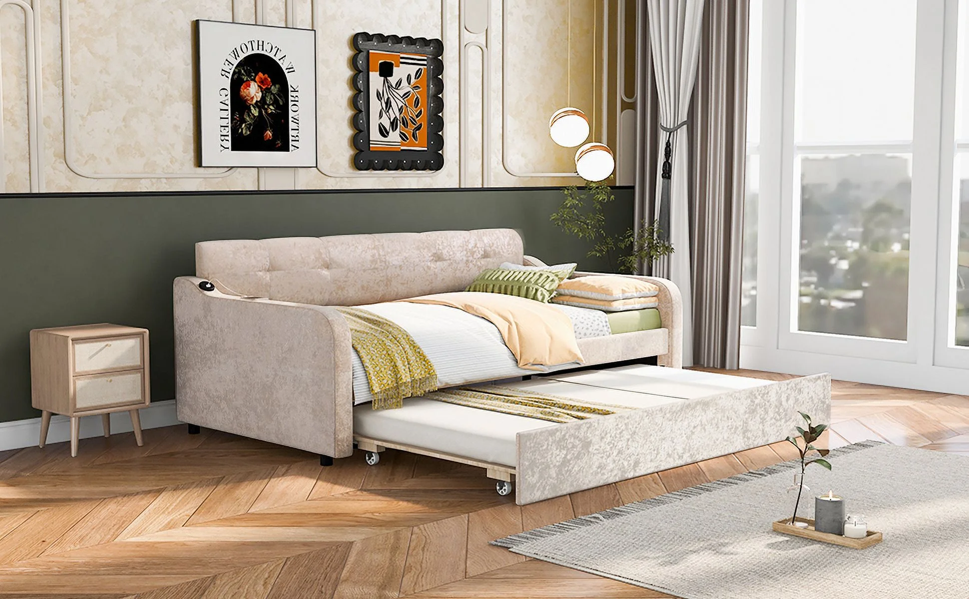CoSoTower Twin Size Upholstered Daybed with Trundle ,Velvet Sofabed with Usb Charging Ports,No Box-Spring Needed,Beige