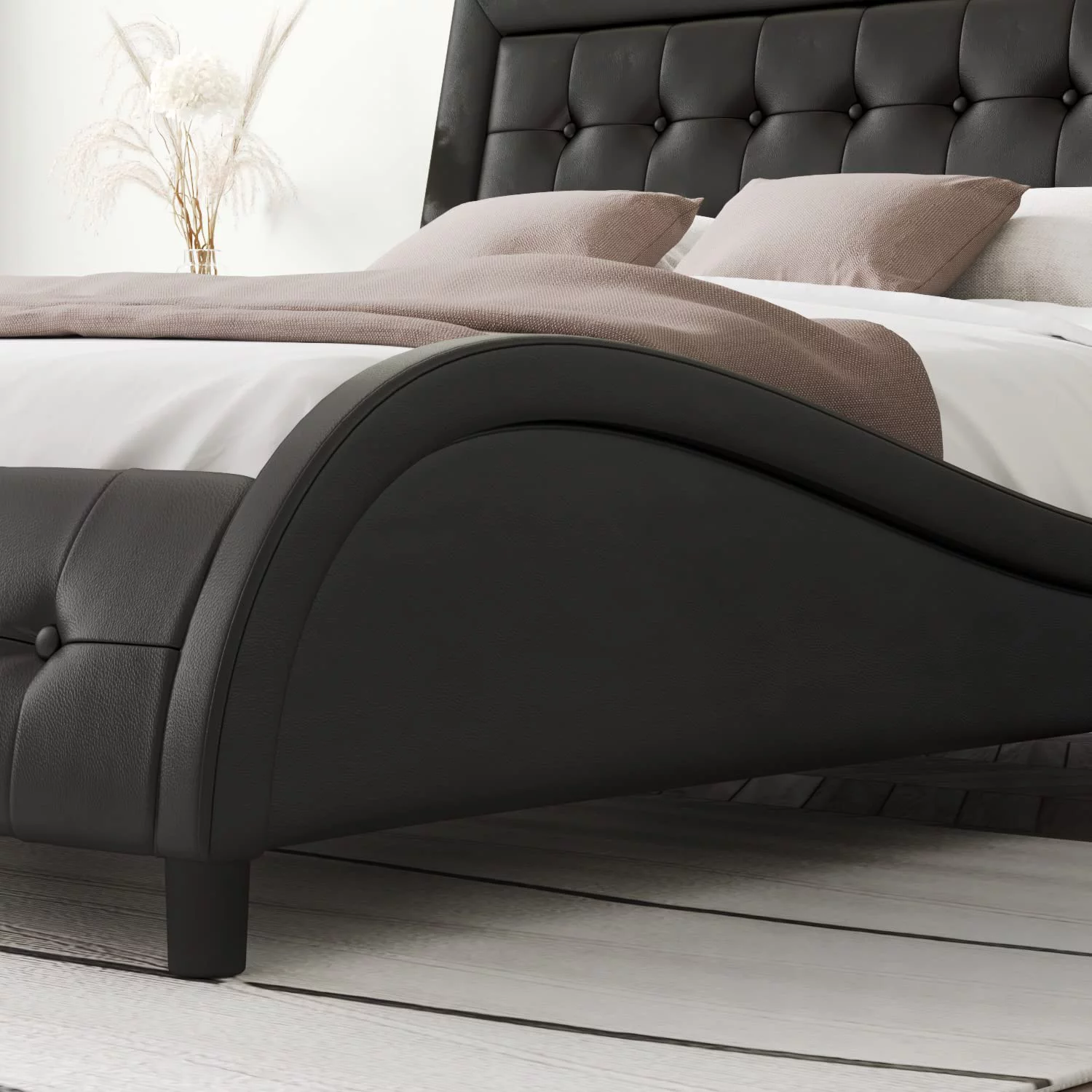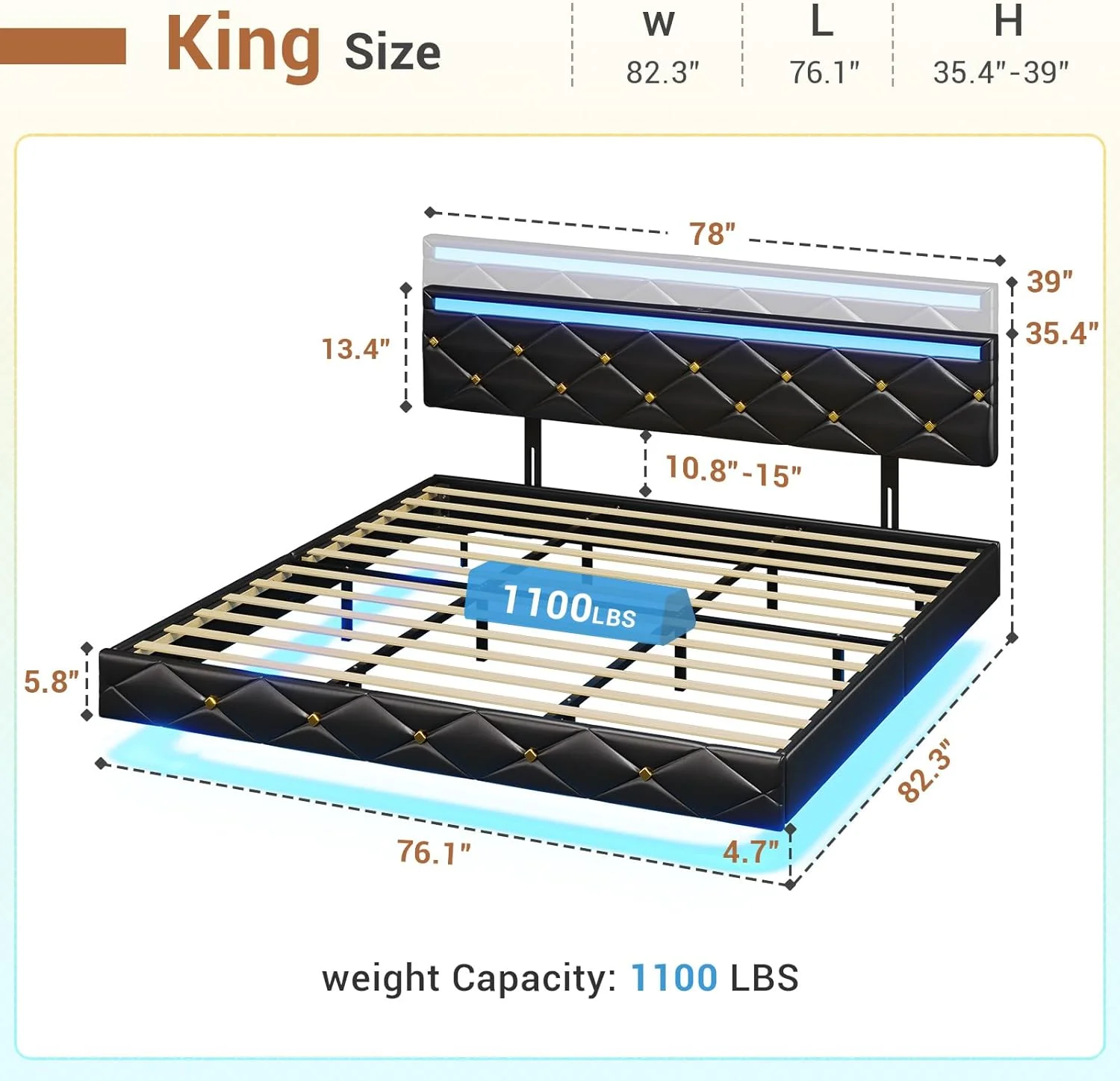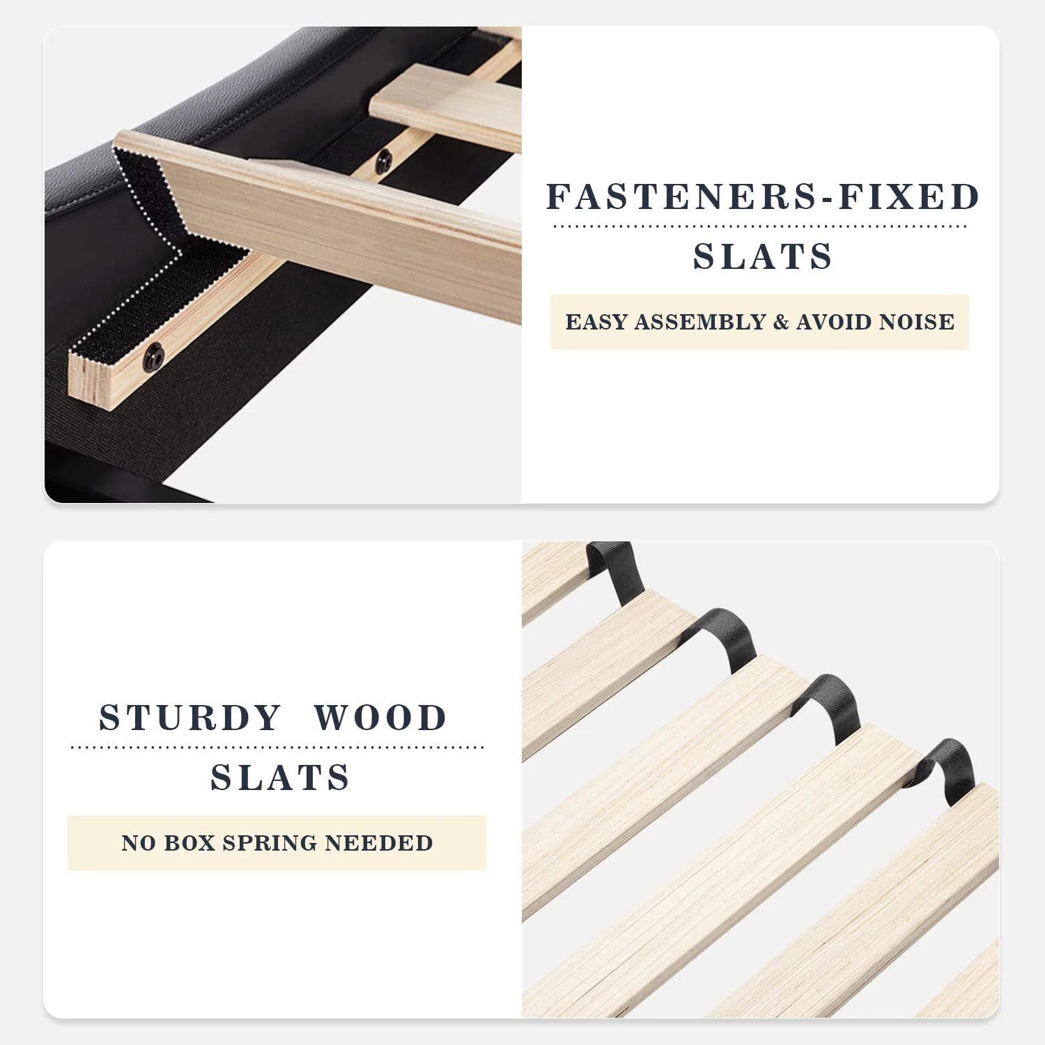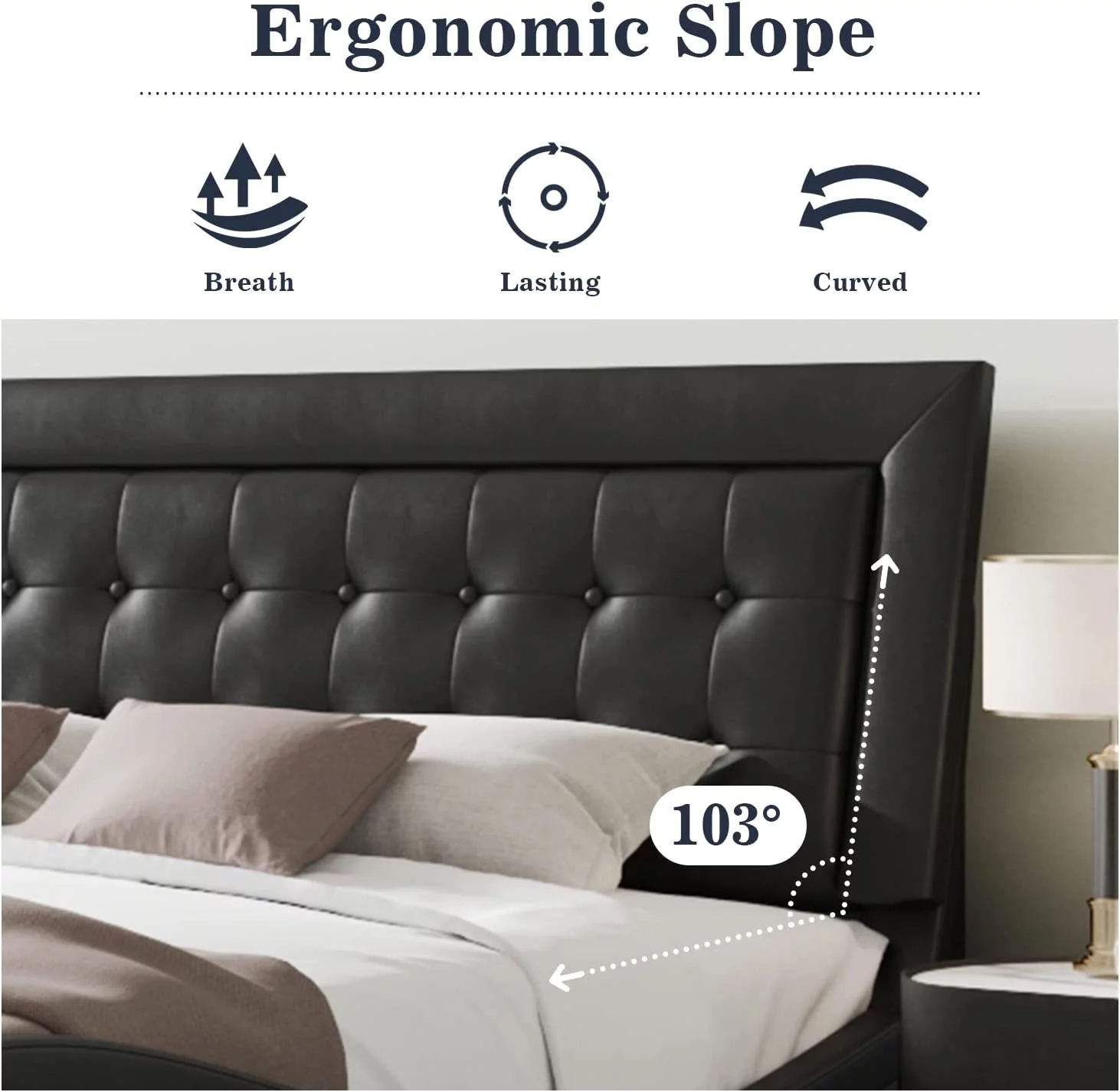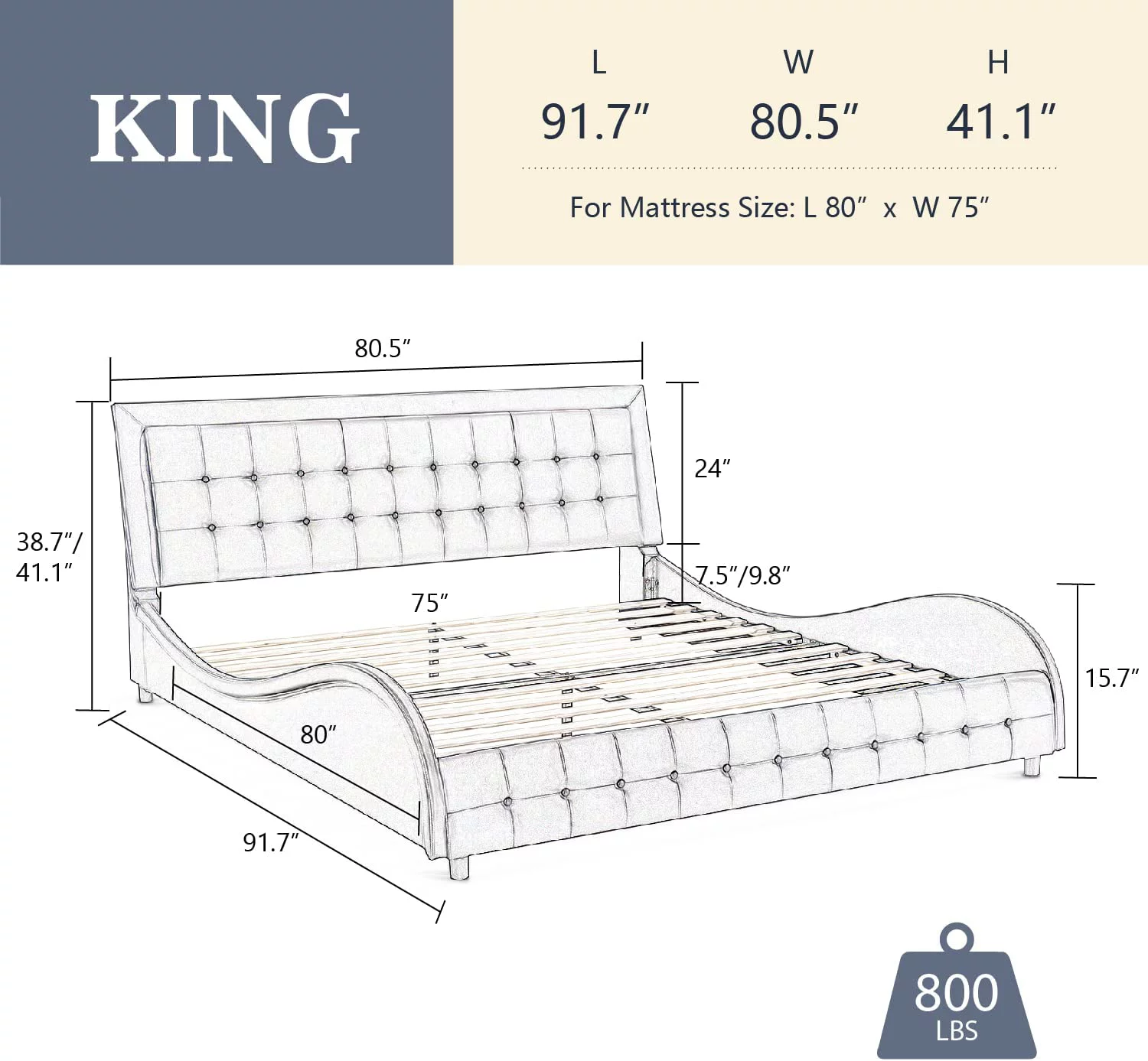 Allewie King Size Leather Platform Bed Frame with Modern Wavy Box-Tufted Adjustable Headboard, Black