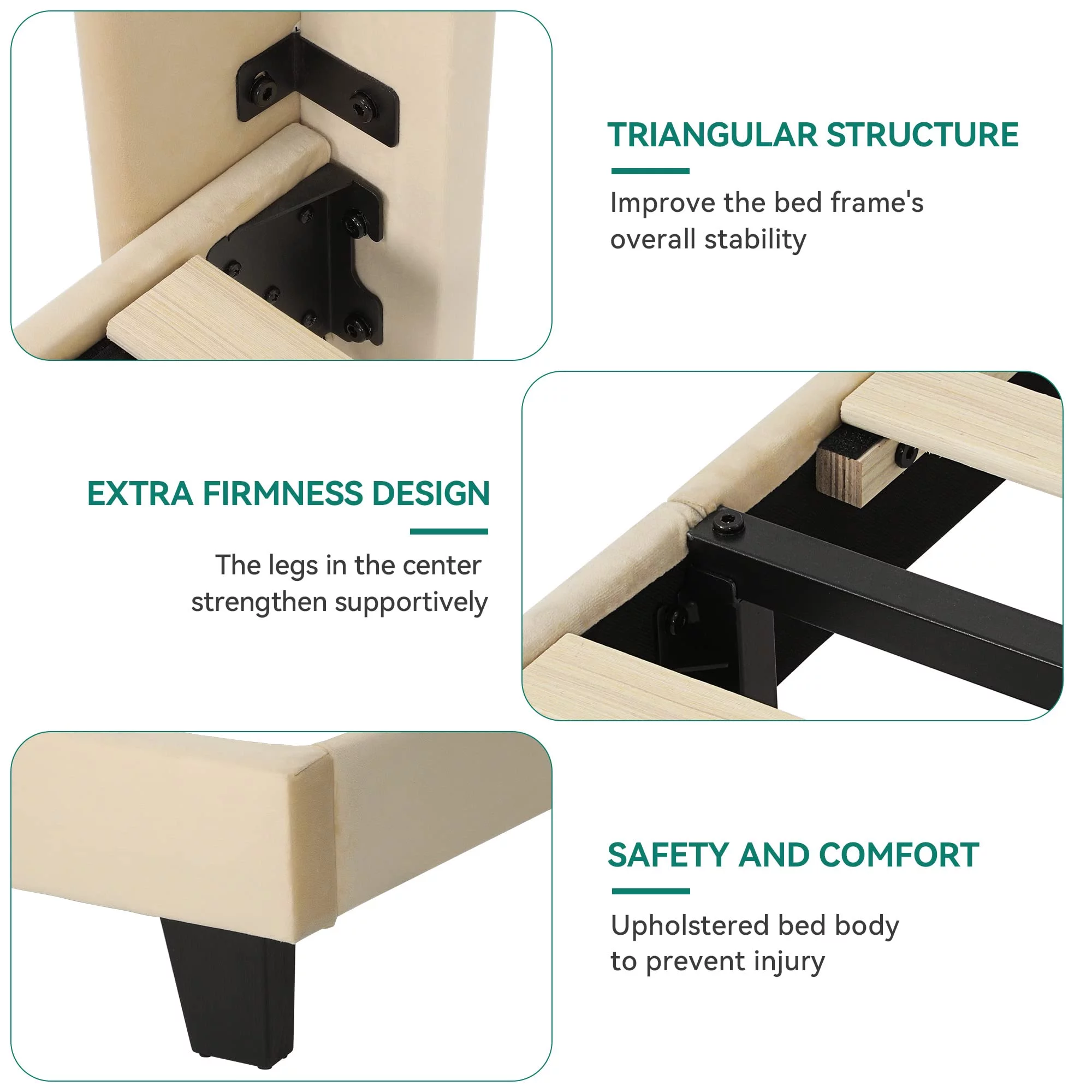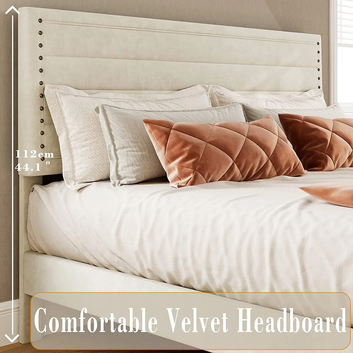 Amolife King Size Velvet Vertical Stripe Upholstered Bed Frame with Wingback Headboard, Off-White