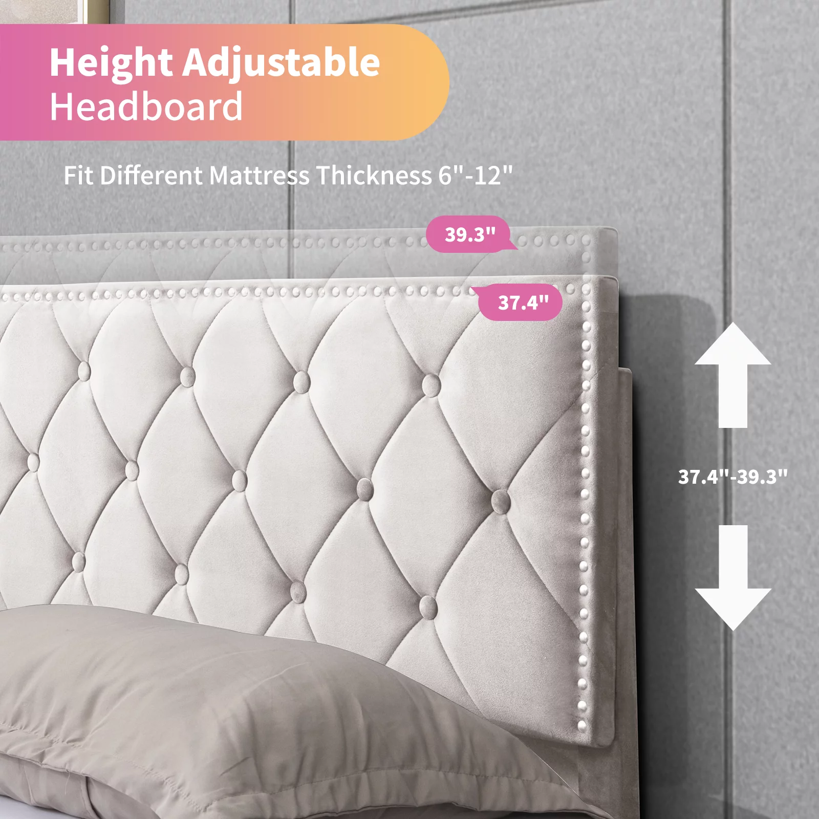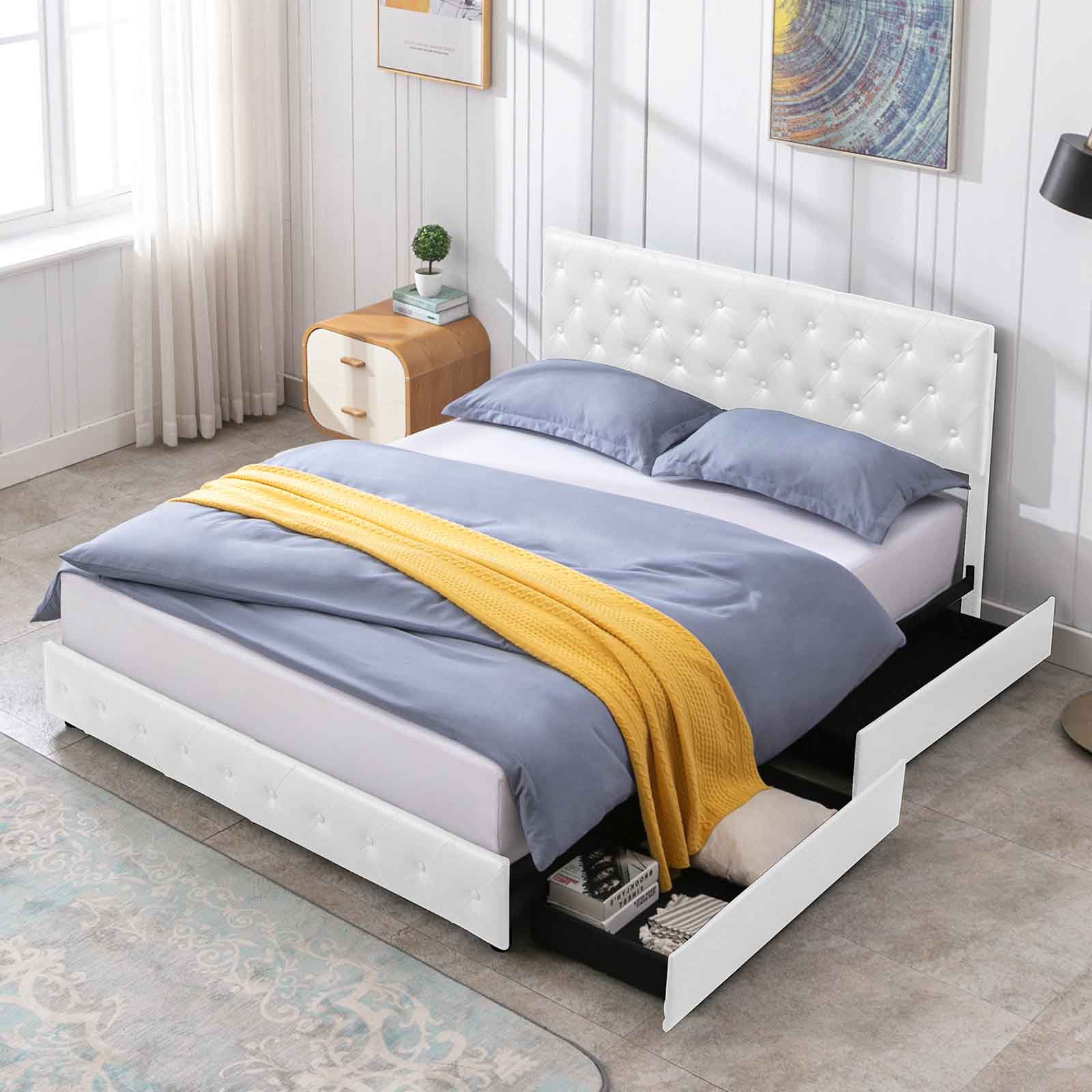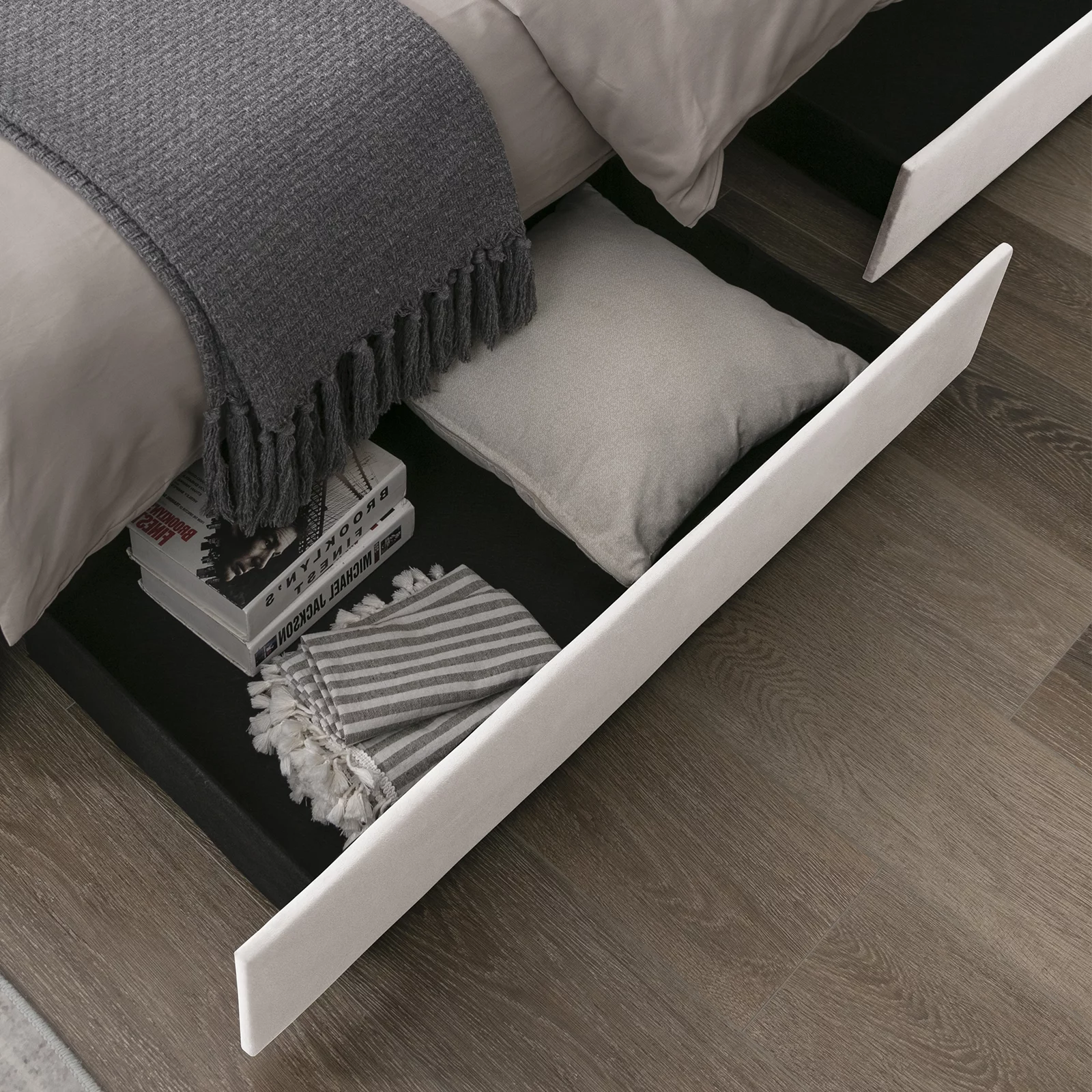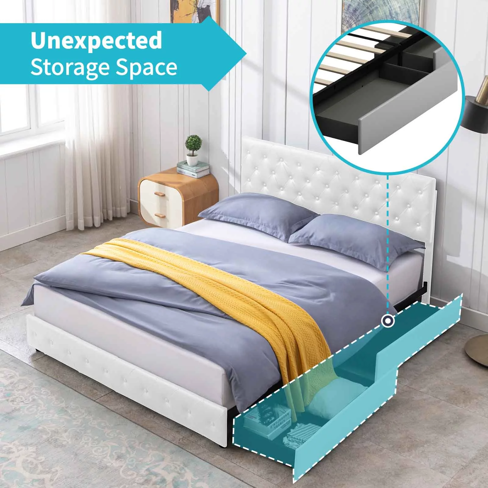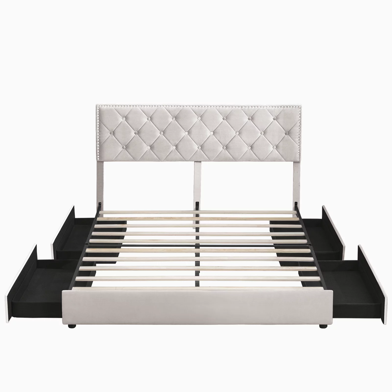 Mixoy Modern King Size Platform Bed Frame with 4 Large Drawers and Tufted Headboard, Wooden Slats Support(King,Beige)