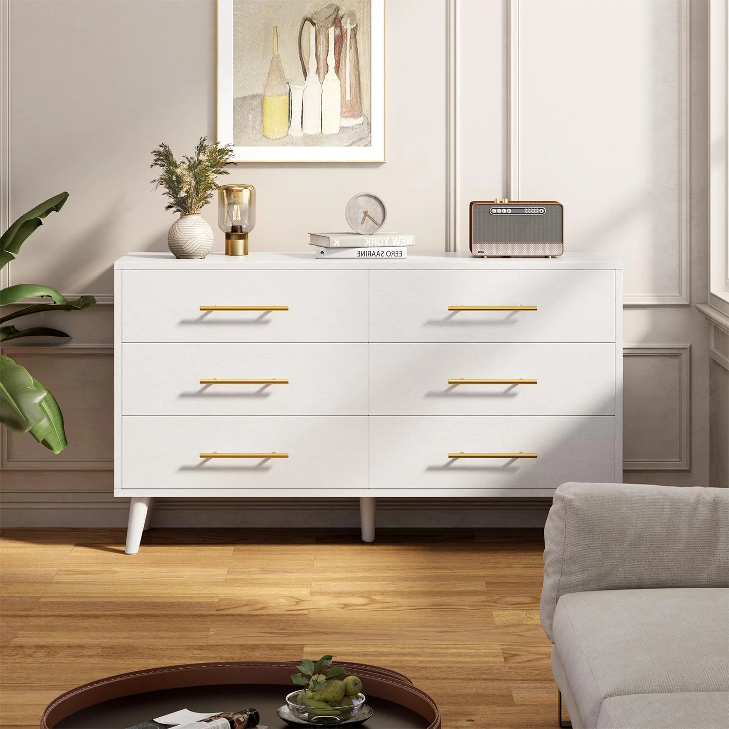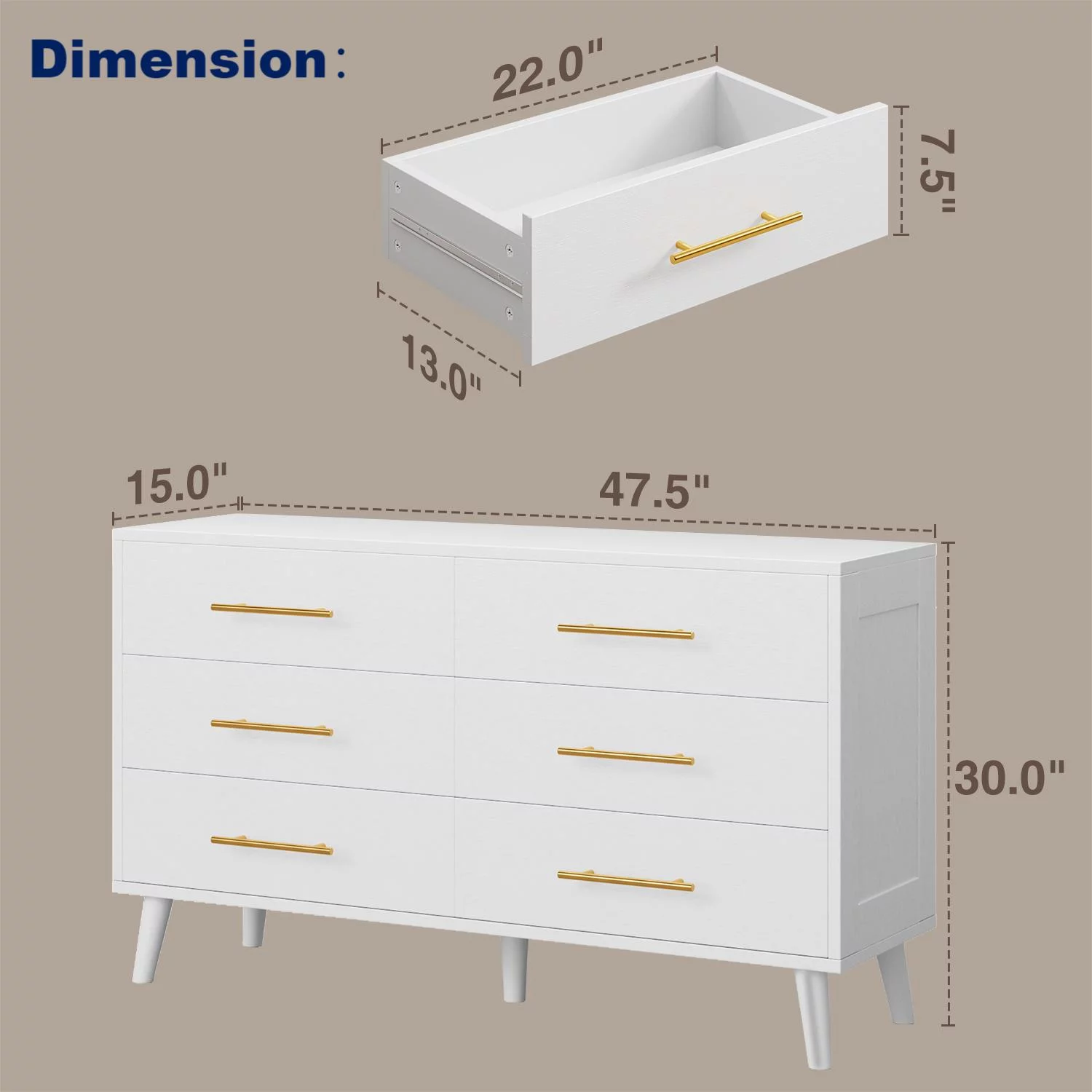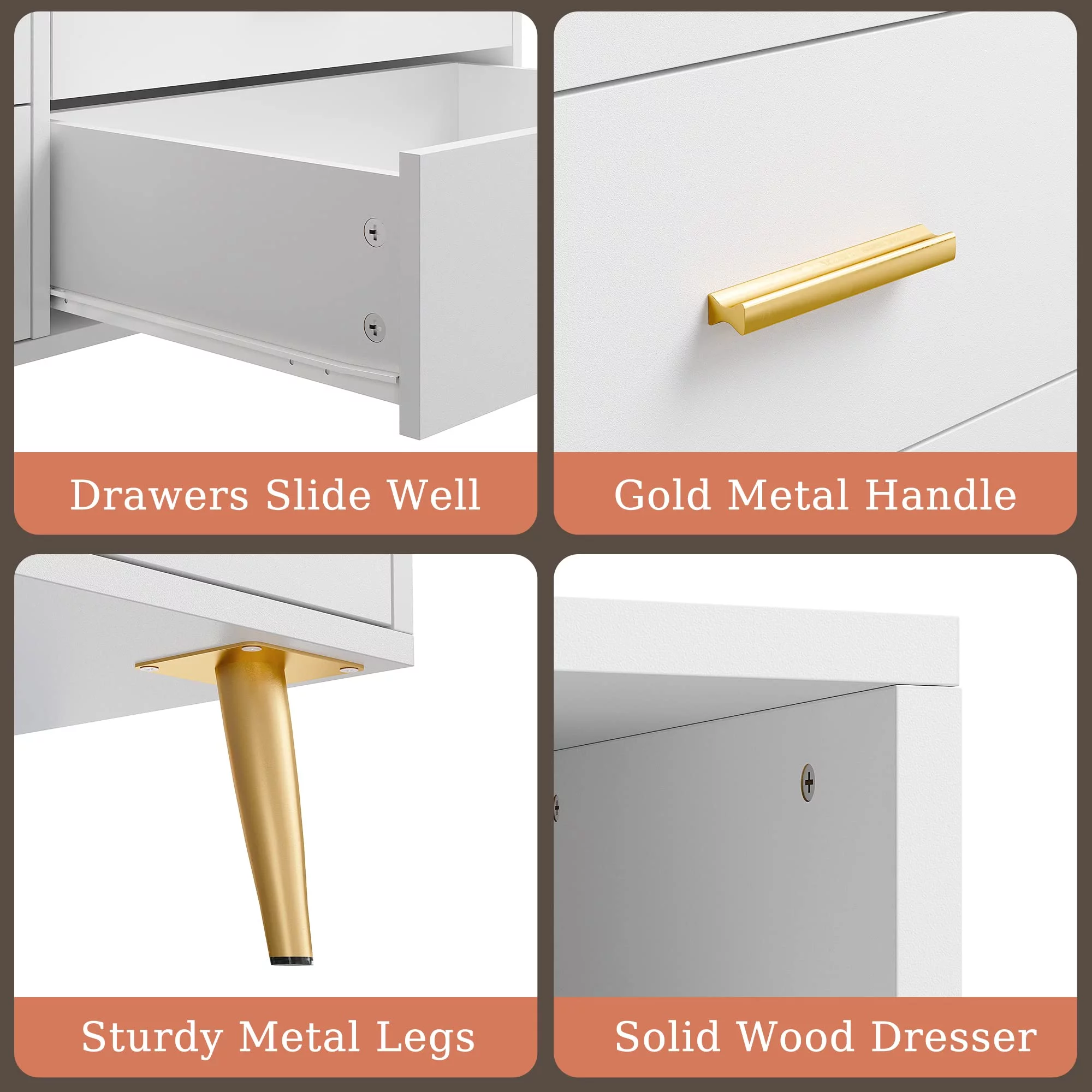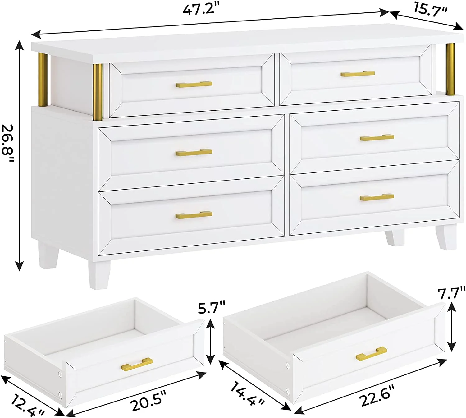 White Dresser, Dresser with 6 Drawers, Wide Chest of Drawers with Gold Handles
