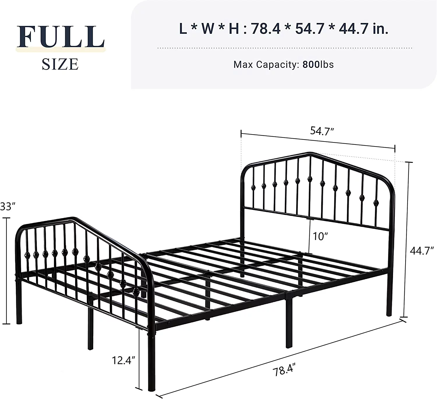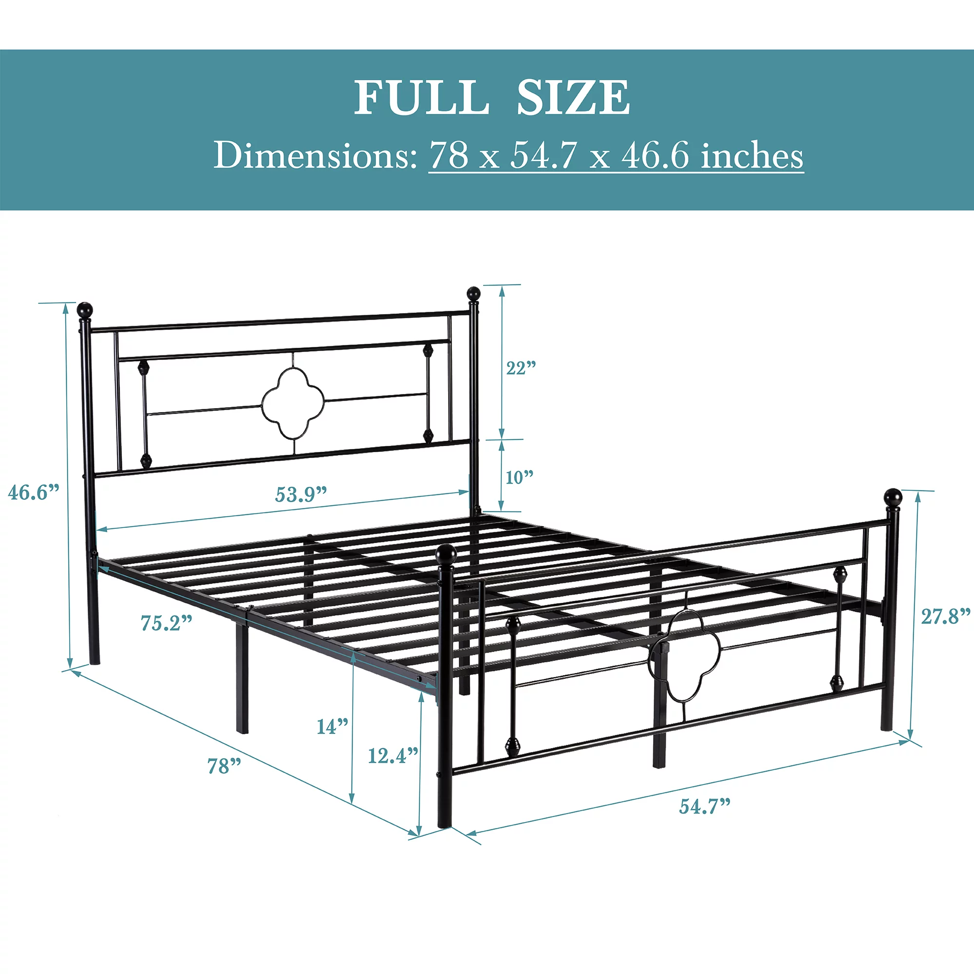Einfach Full Size Heavy Metal Bed with Vintage Headboard Pattern, Black