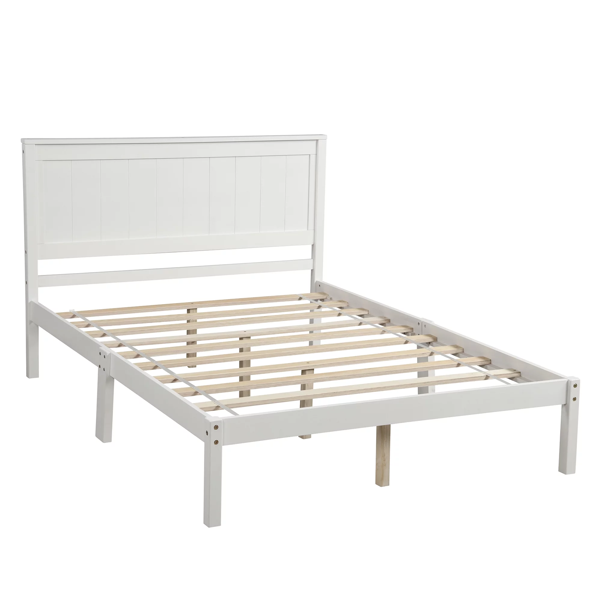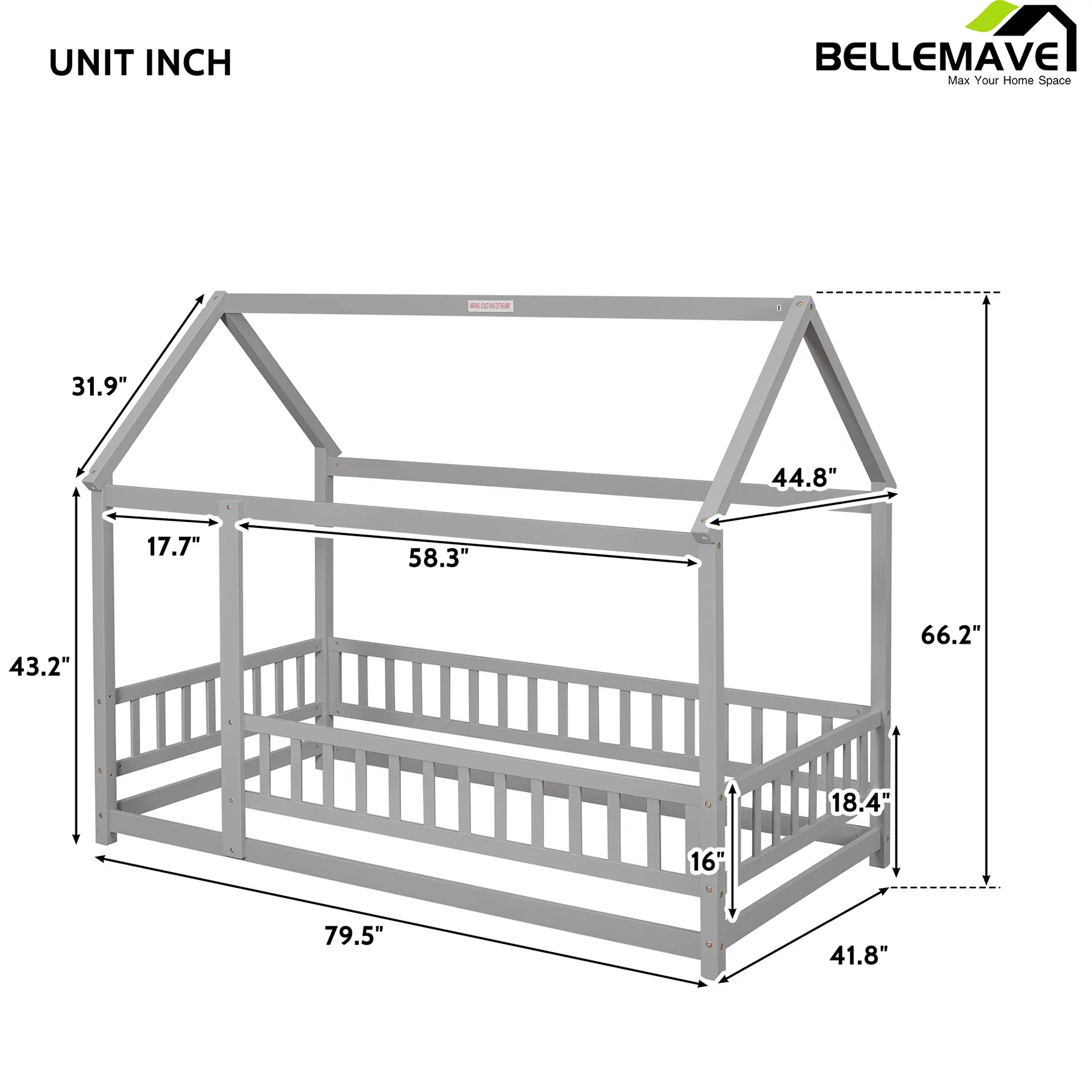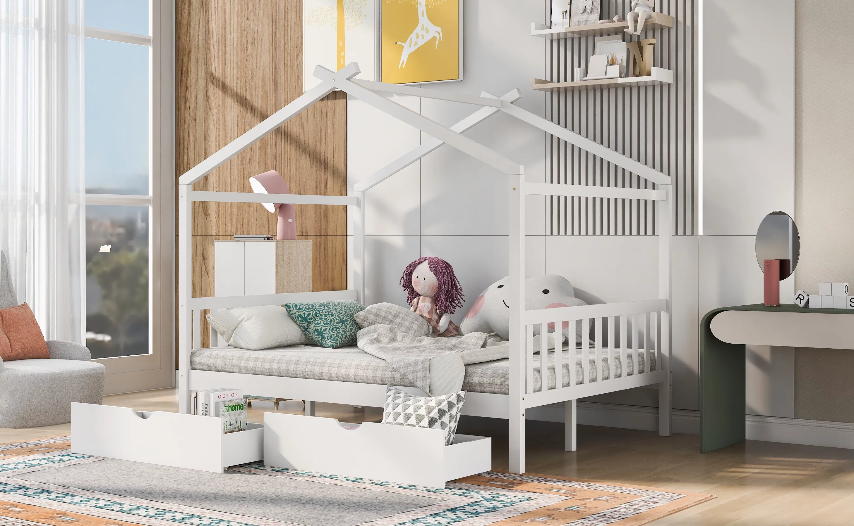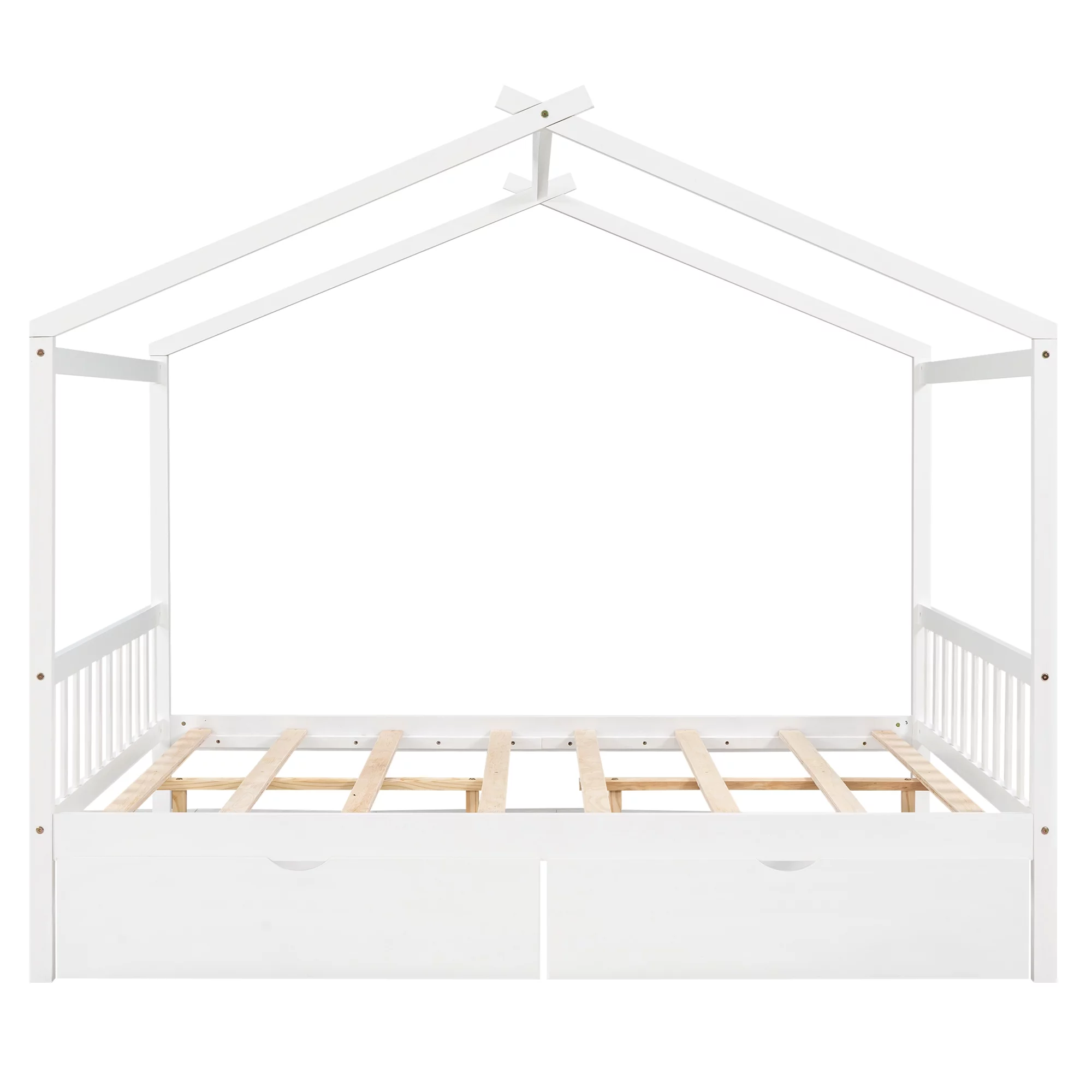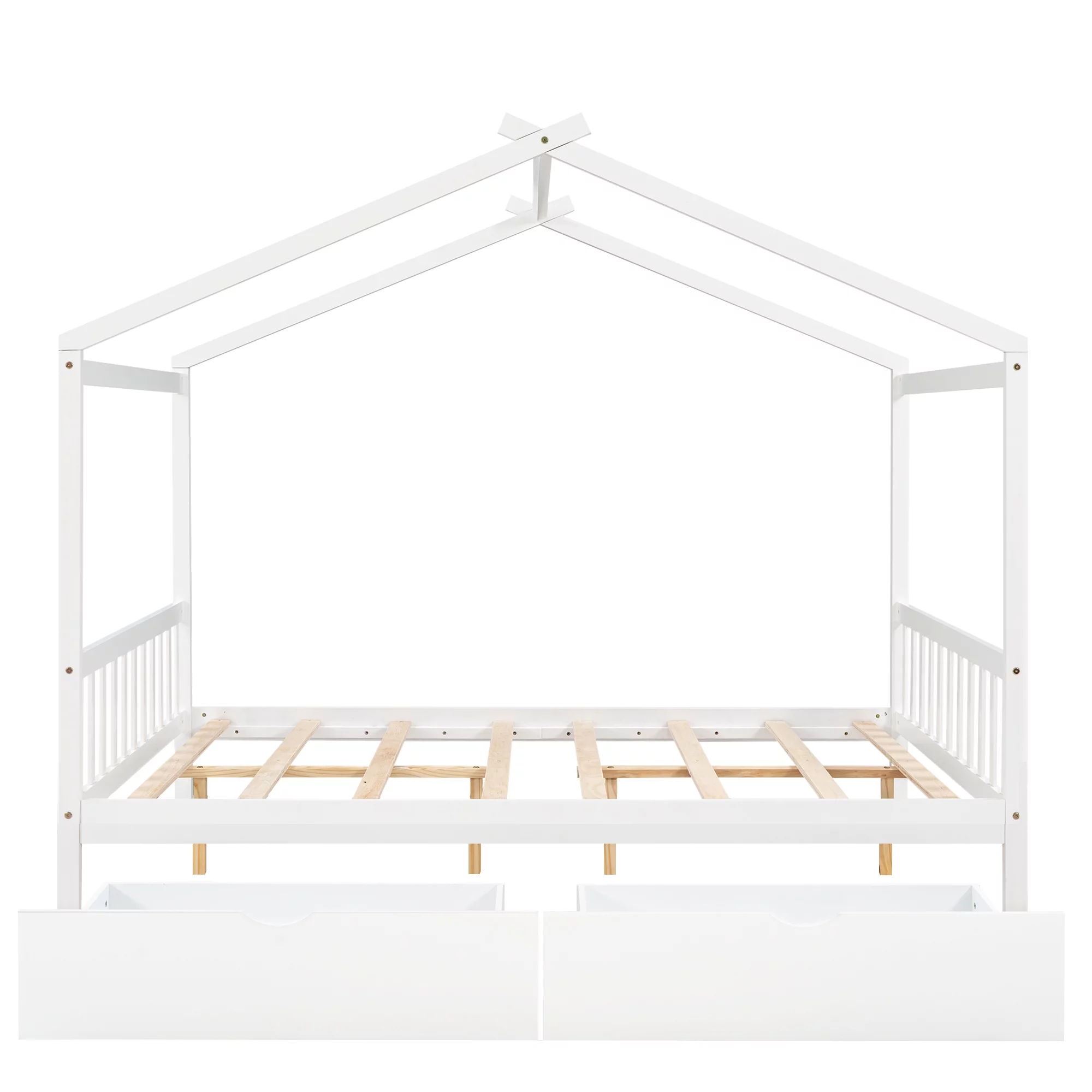 EUROCO Full Size House Bed with Two Drawers for Kids, Solid Wood Platform Bed for Living Room, White