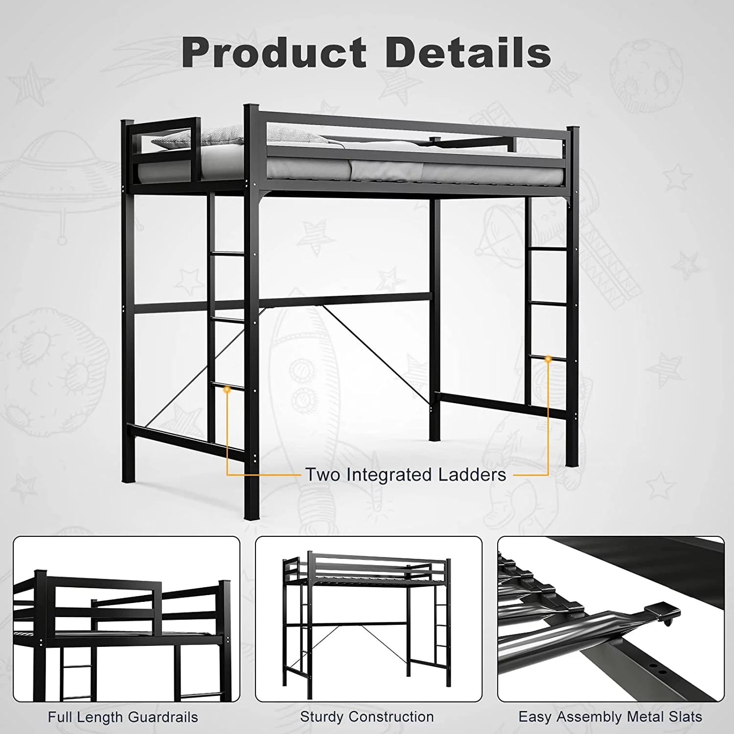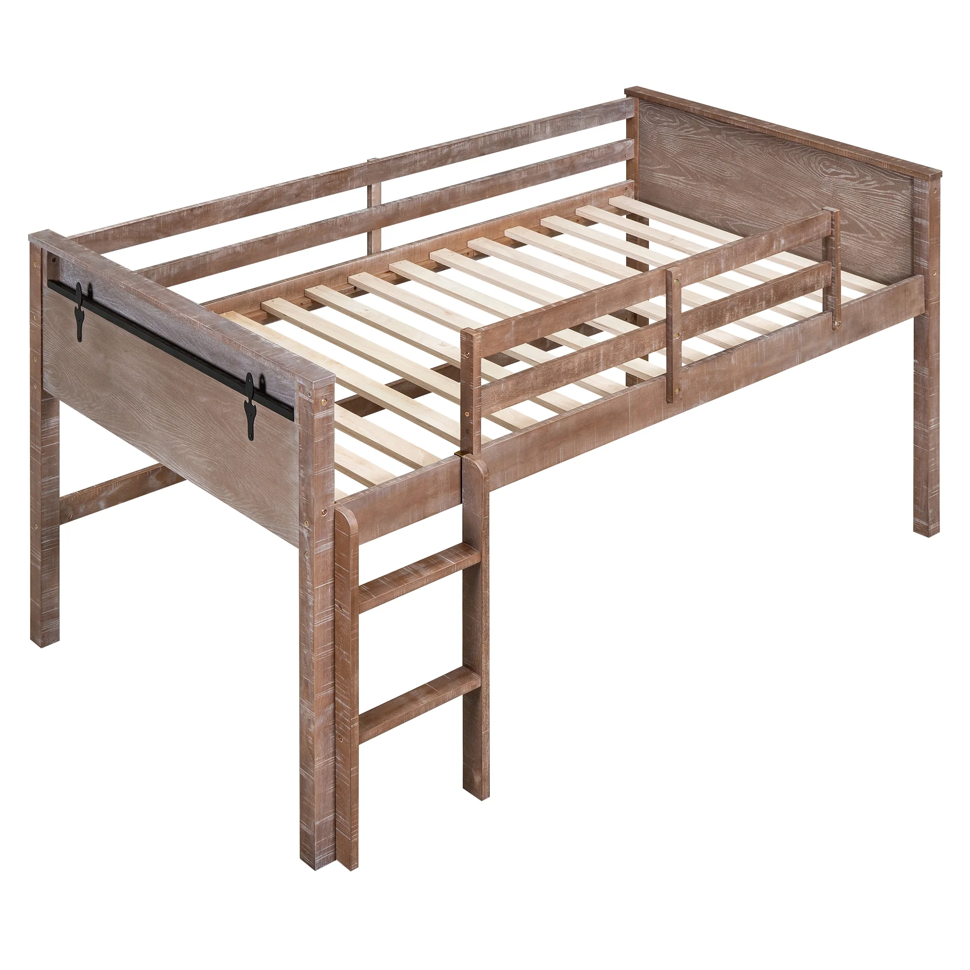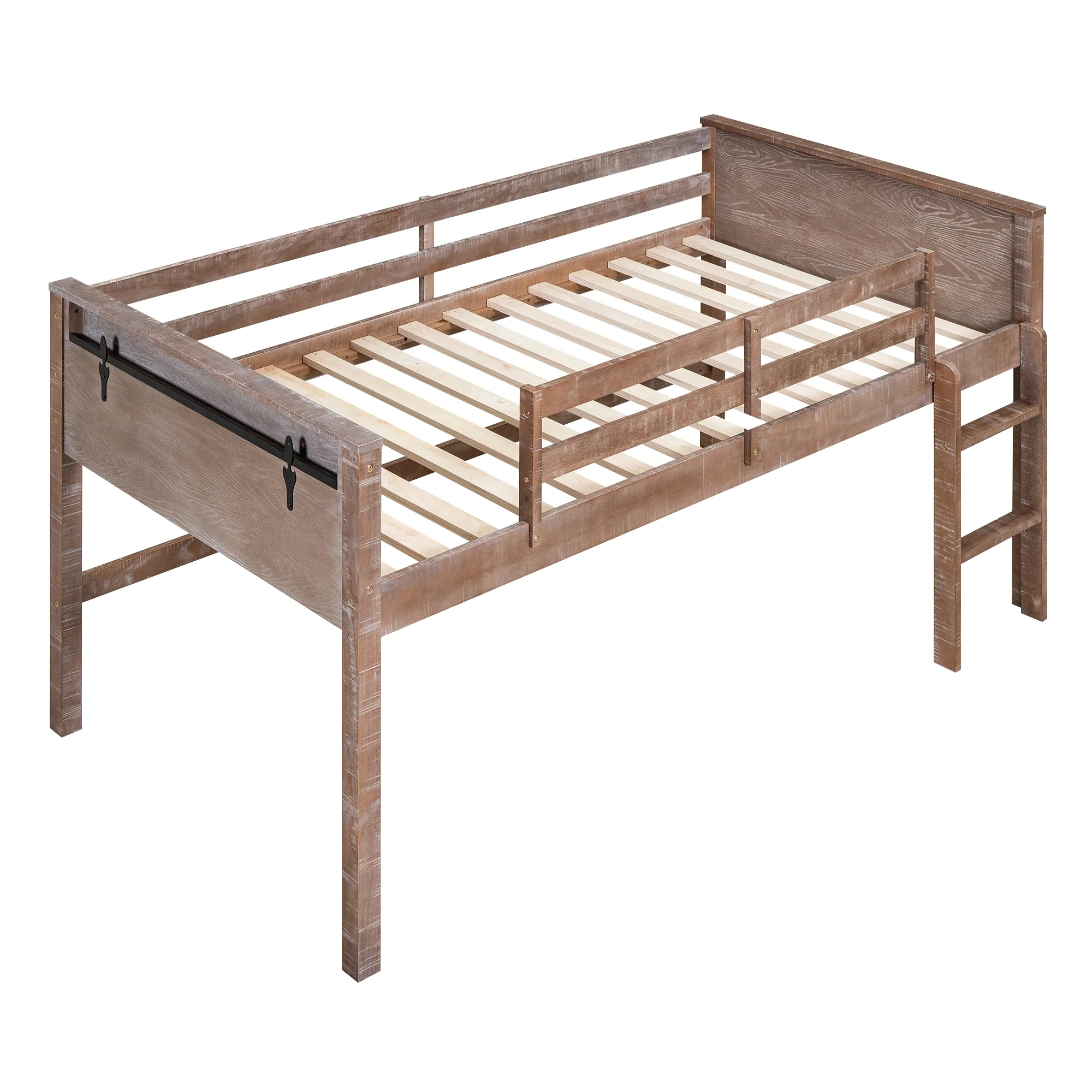 Amolife Metal Twin Size Loft Bed Frame with Stairs & Full-Length Guardrail, Rustic Wood, Black Frame (Desk not included)